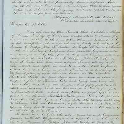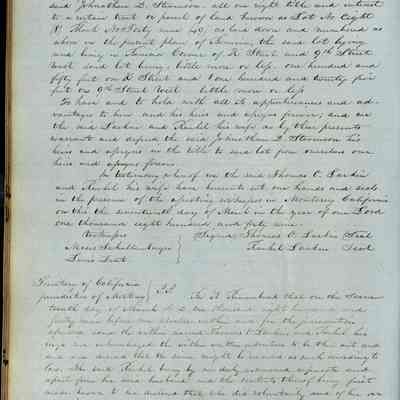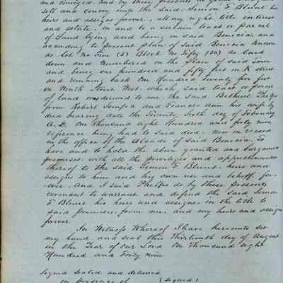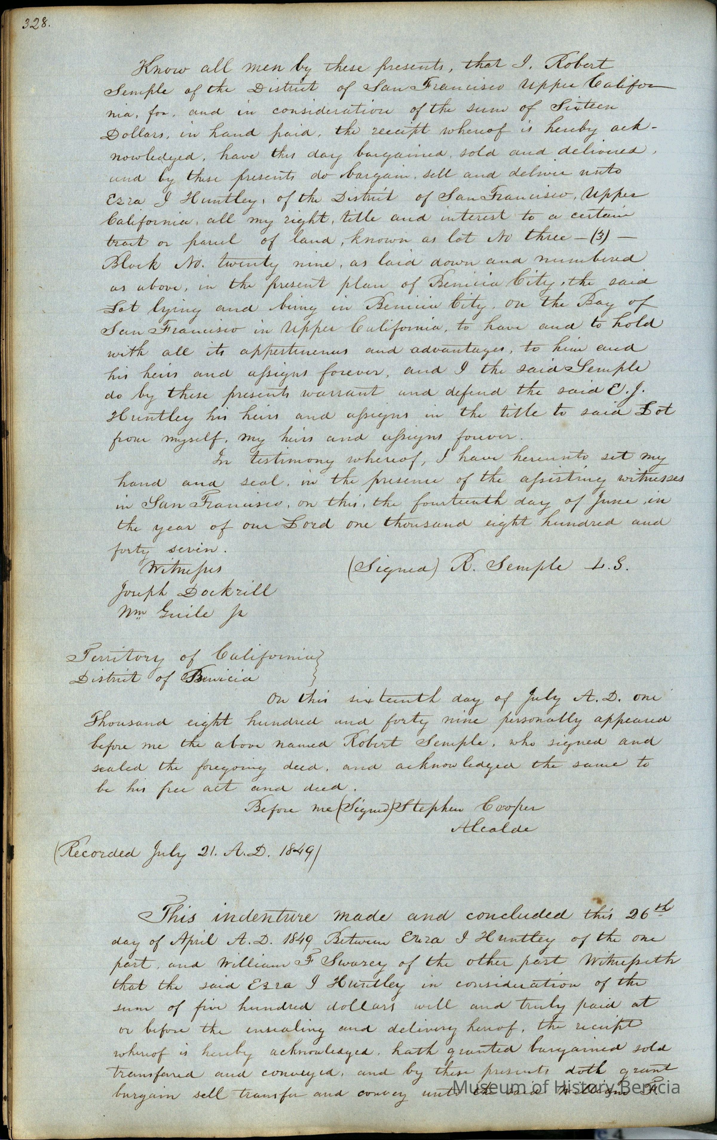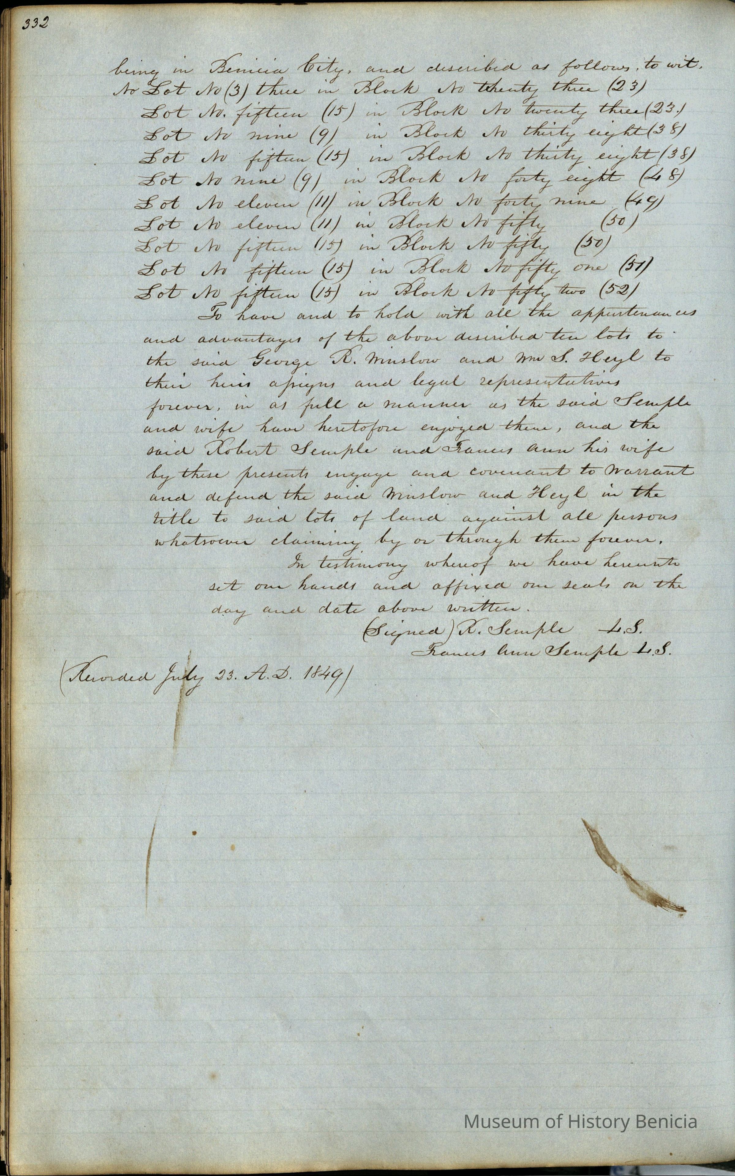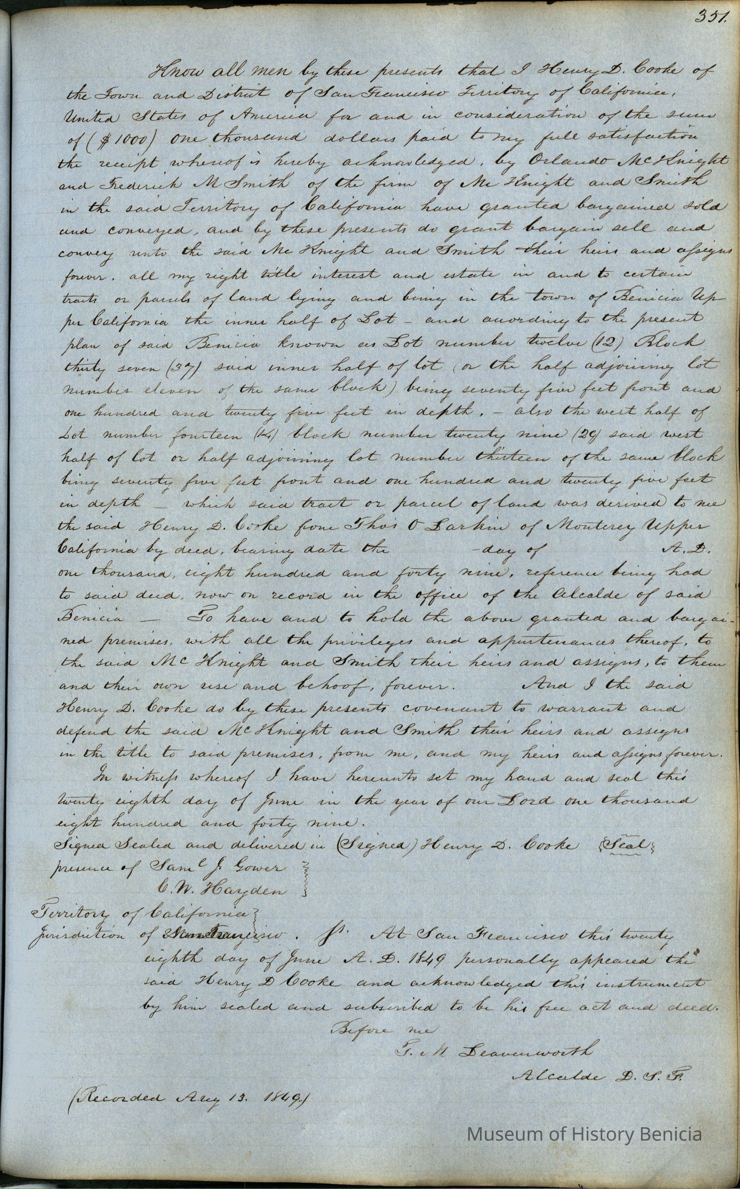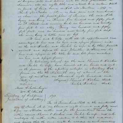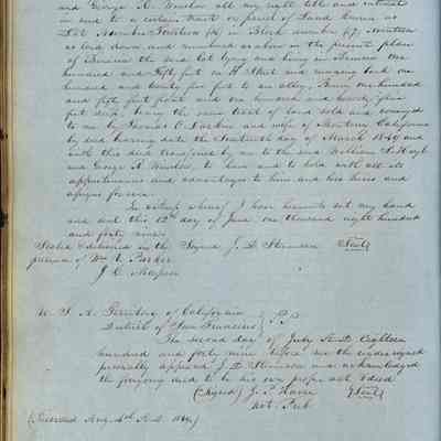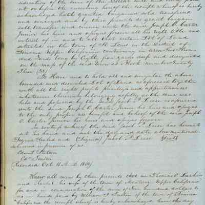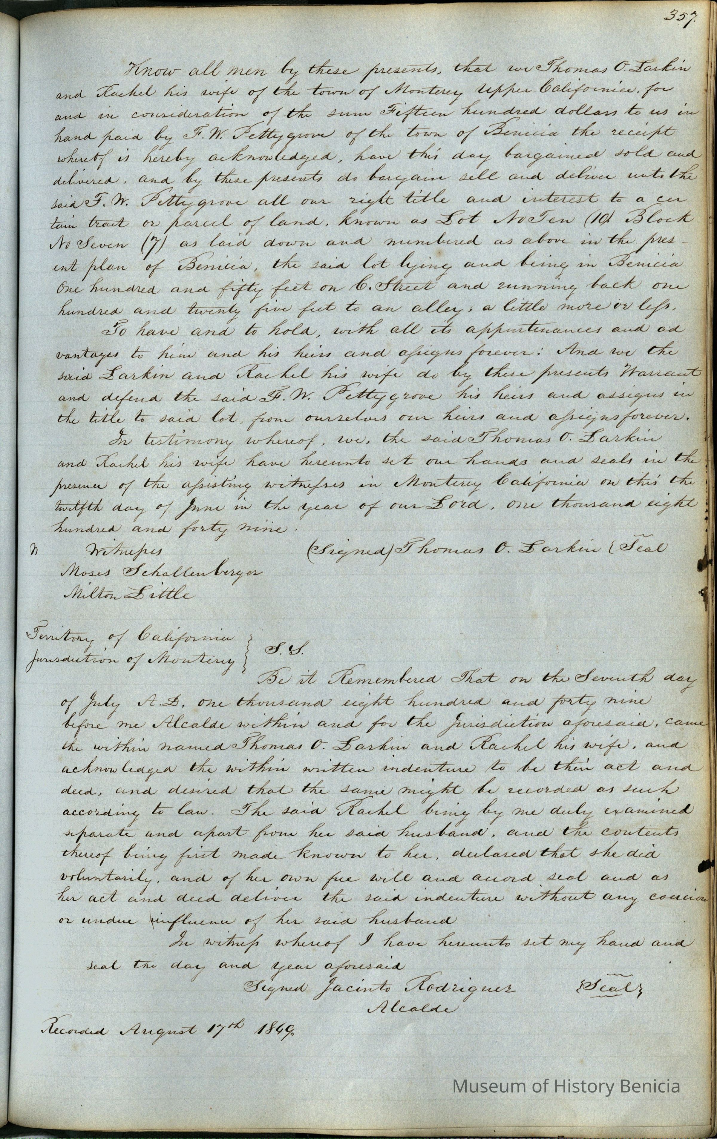 This journal/ledger contains the beginnings of Benicia including: lists and descriptions of first 12 houses in Benicia, a translation of the deed to General Vallejo by Manual Micheltorena, Governor of Calif. (1844); deed to Semple and Larkin by Vallejo (1847); deeds of properties sold by Semple and Larkin from 1847 - 1849