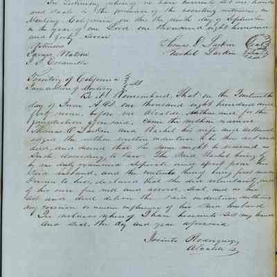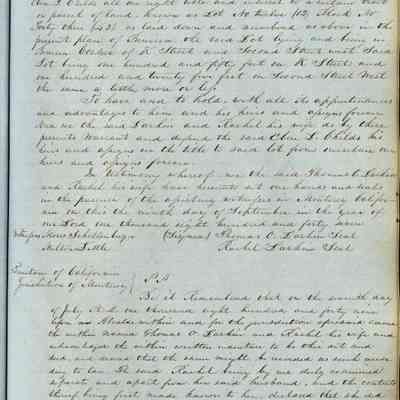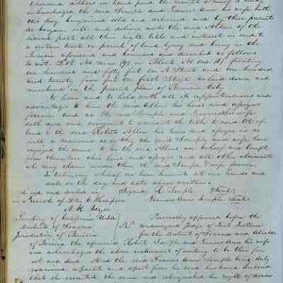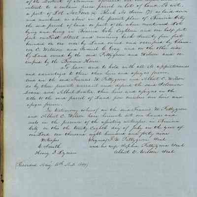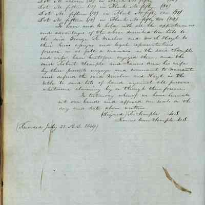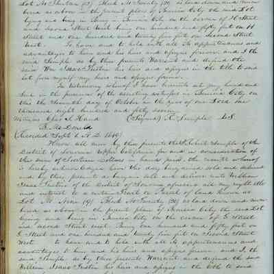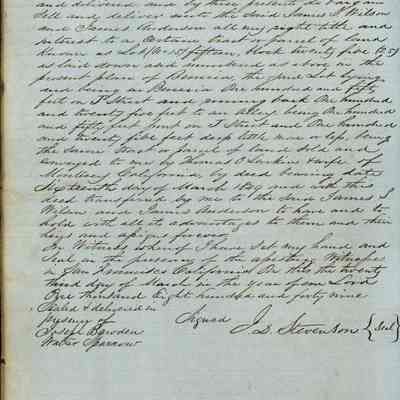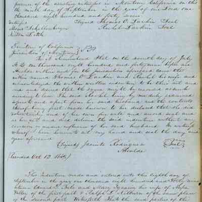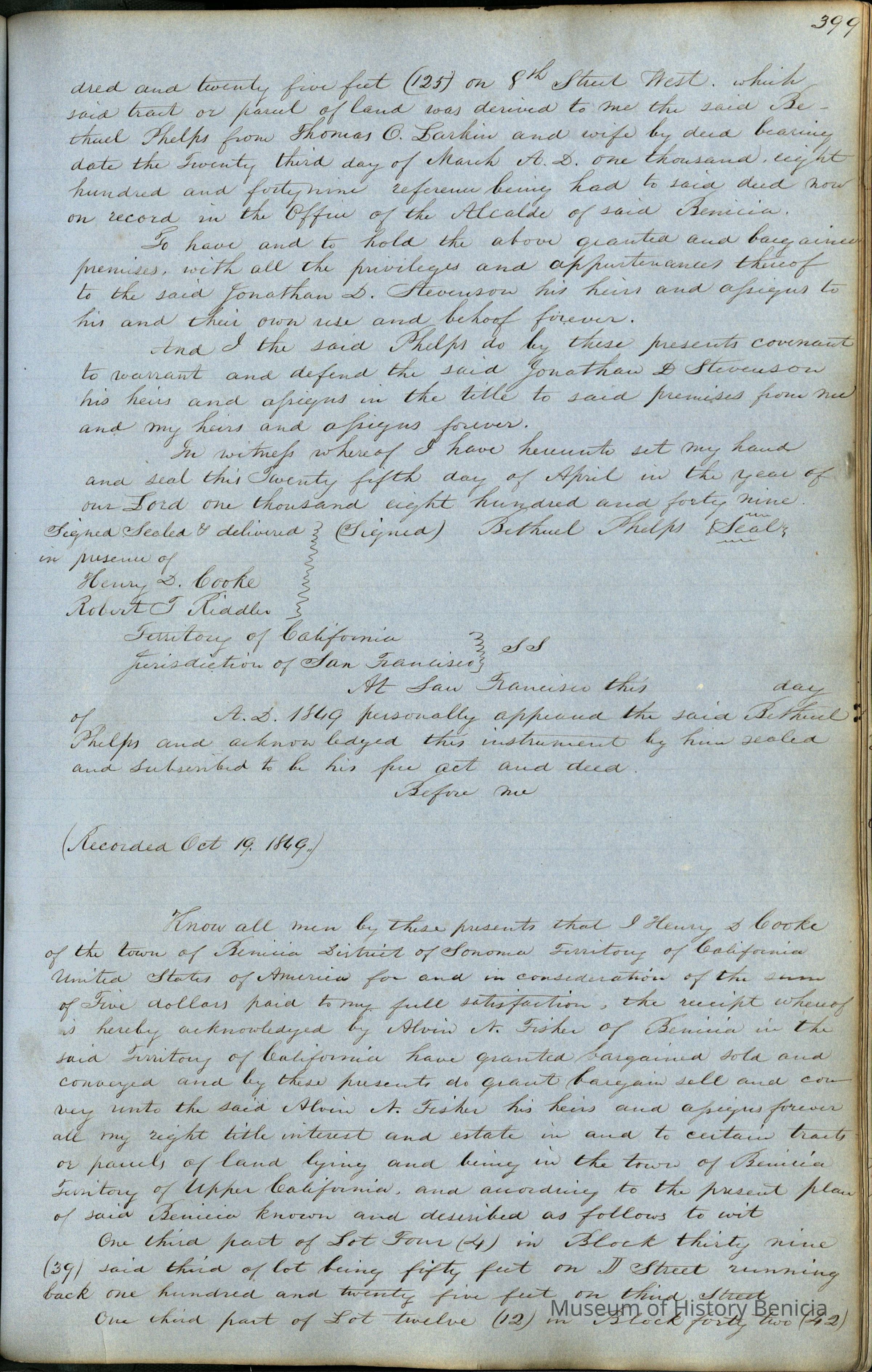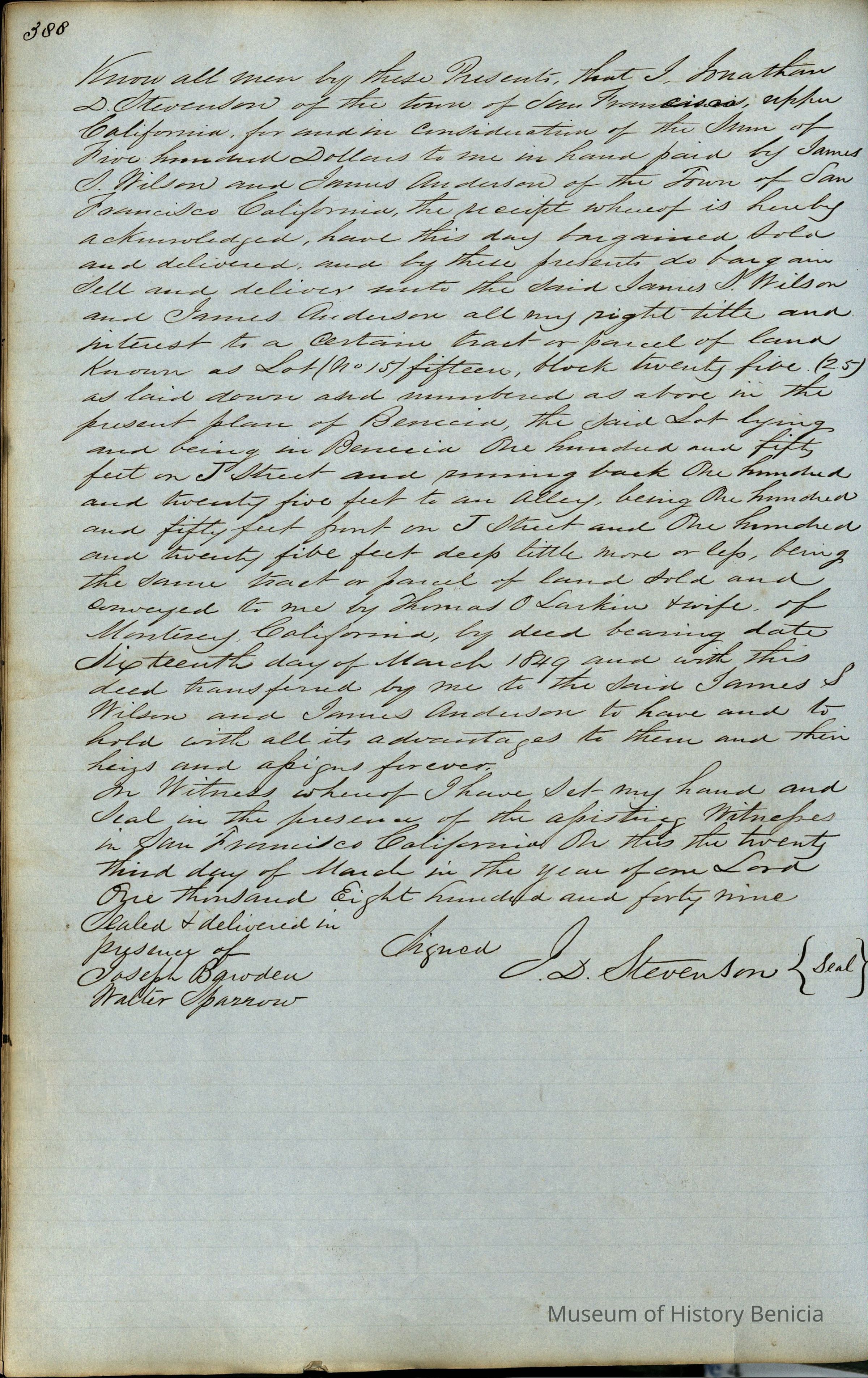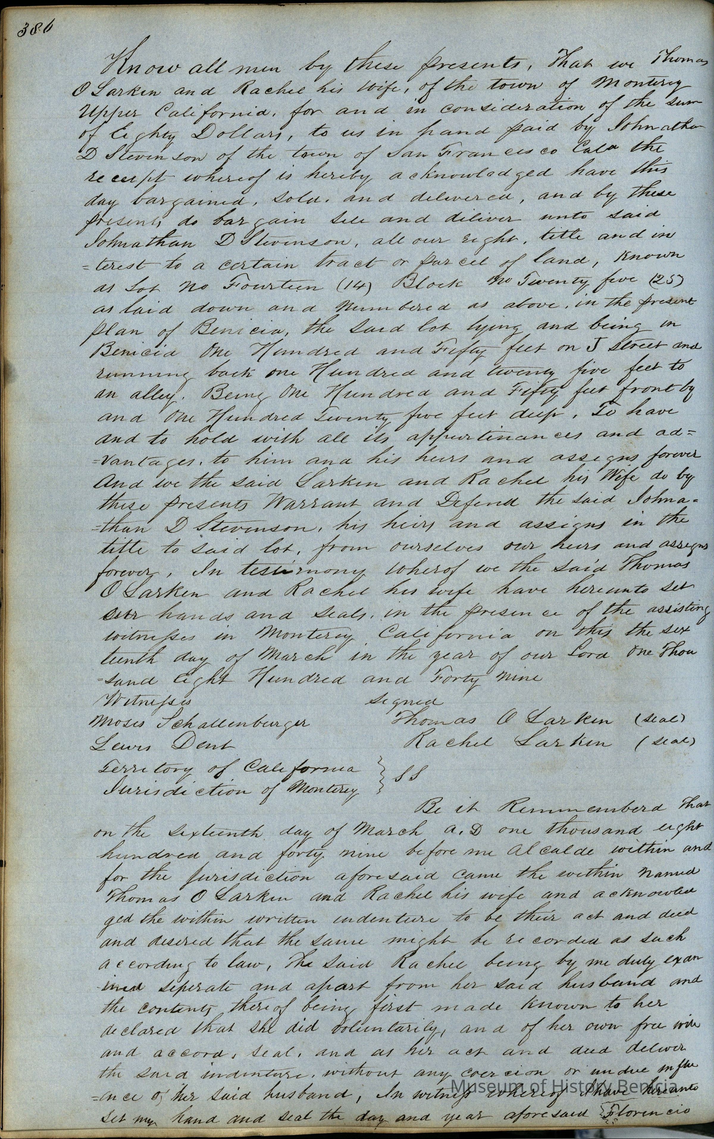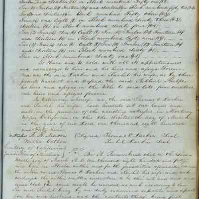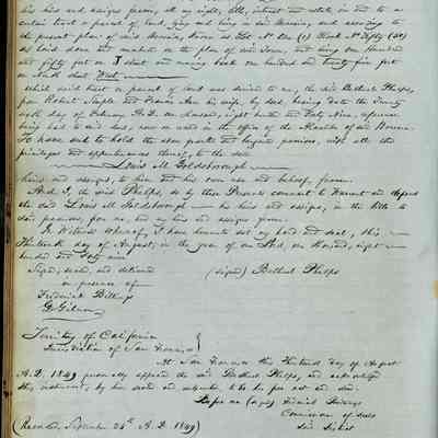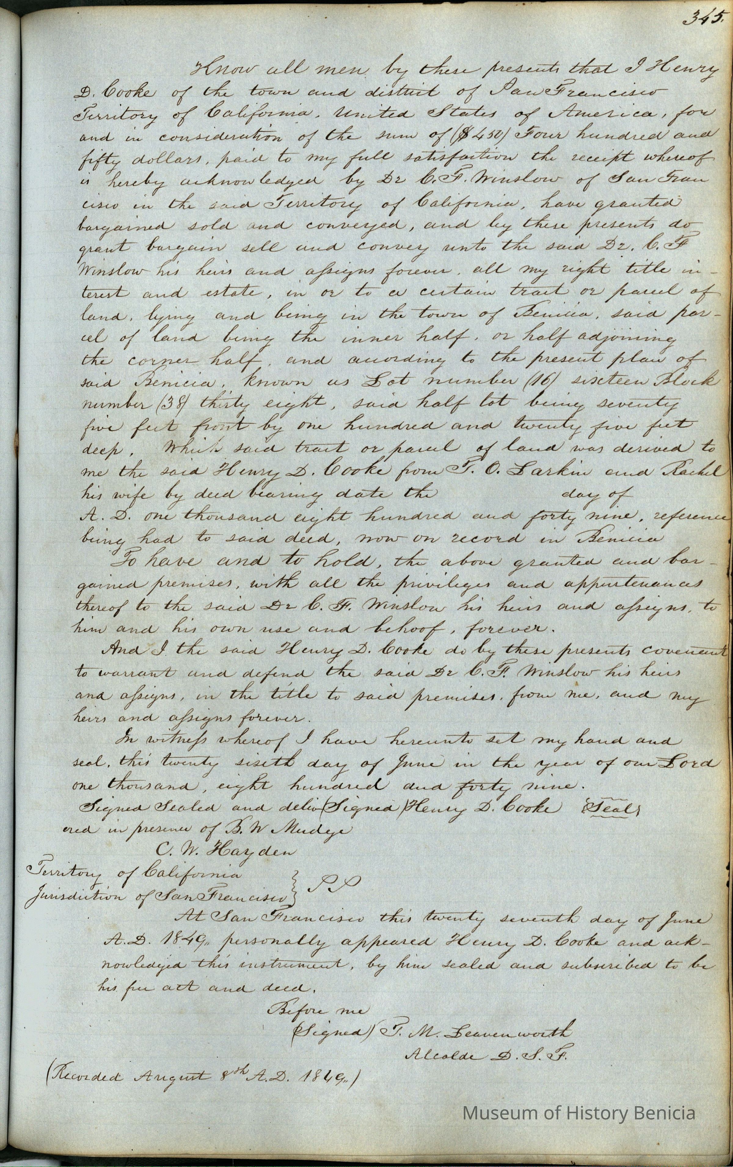 This journal/ledger contains the beginnings of Benicia including: lists and descriptions of first 12 houses in Benicia, a translation of the deed to General Vallejo by Manual Micheltorena, Governor of Calif. (1844); deed to Semple and Larkin by Vallejo (1847); deeds of properties sold by Semple and Larkin from 1847 - 1849
