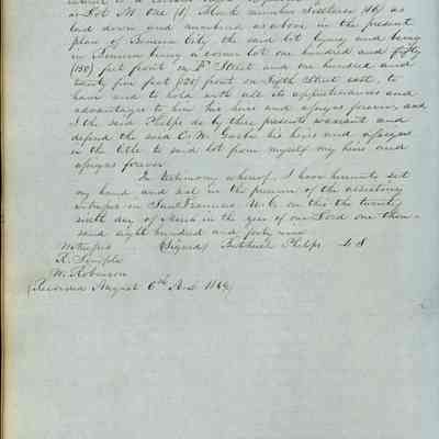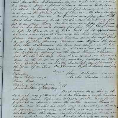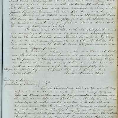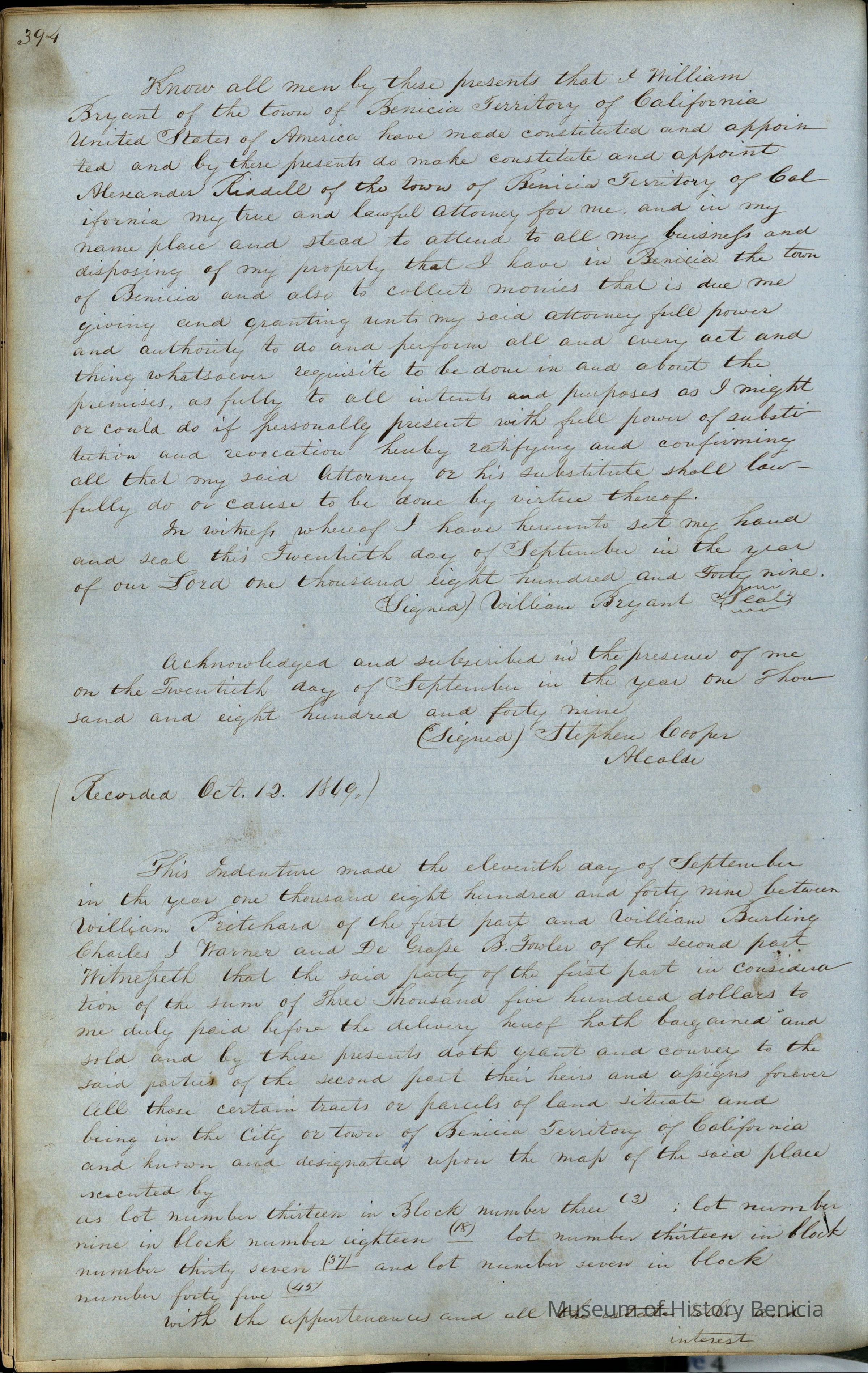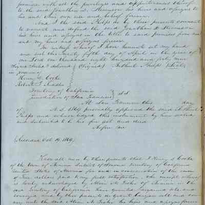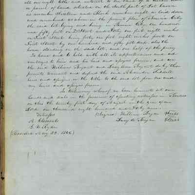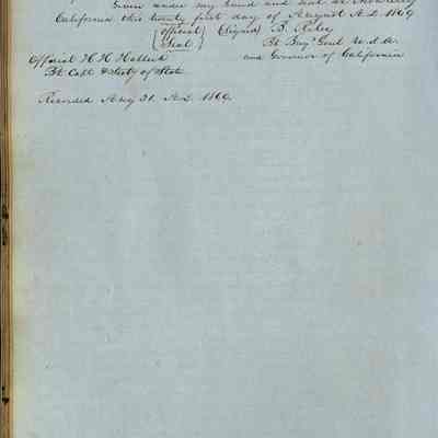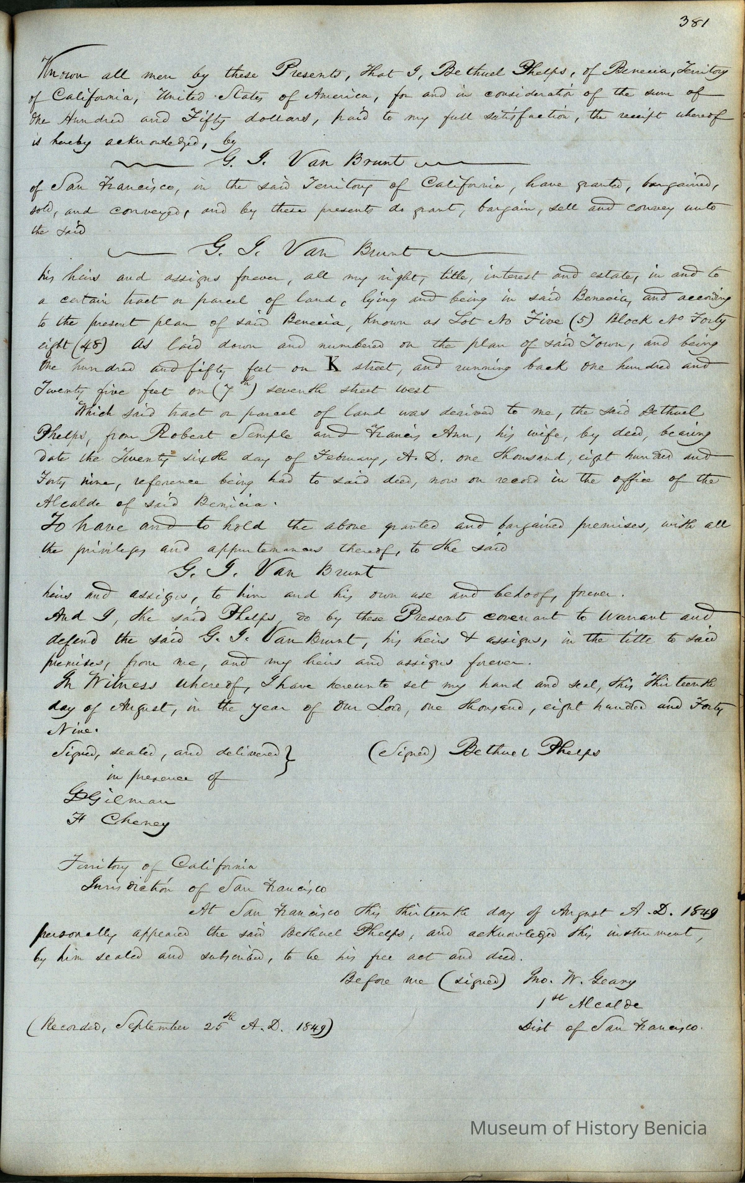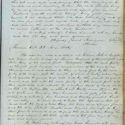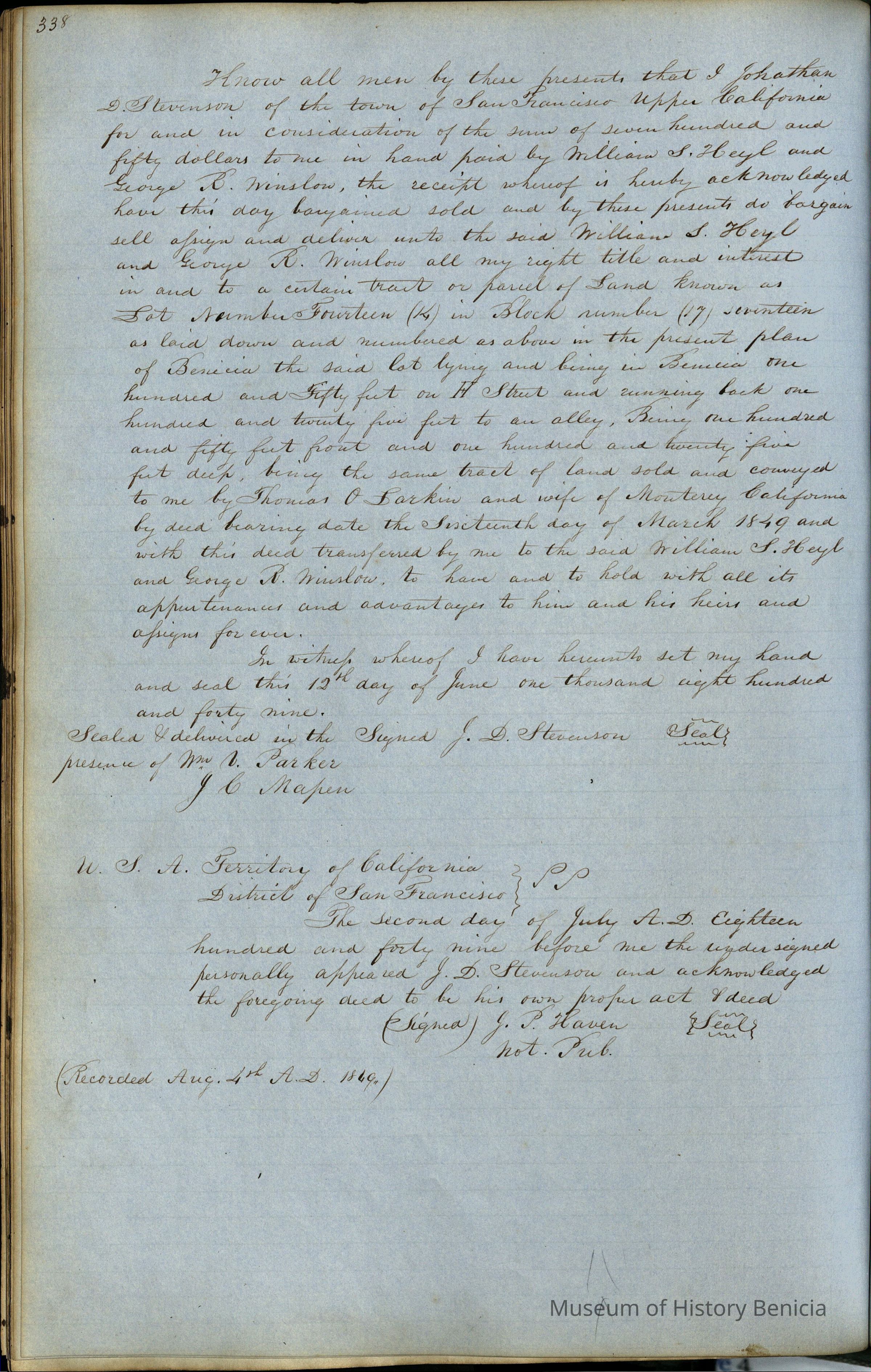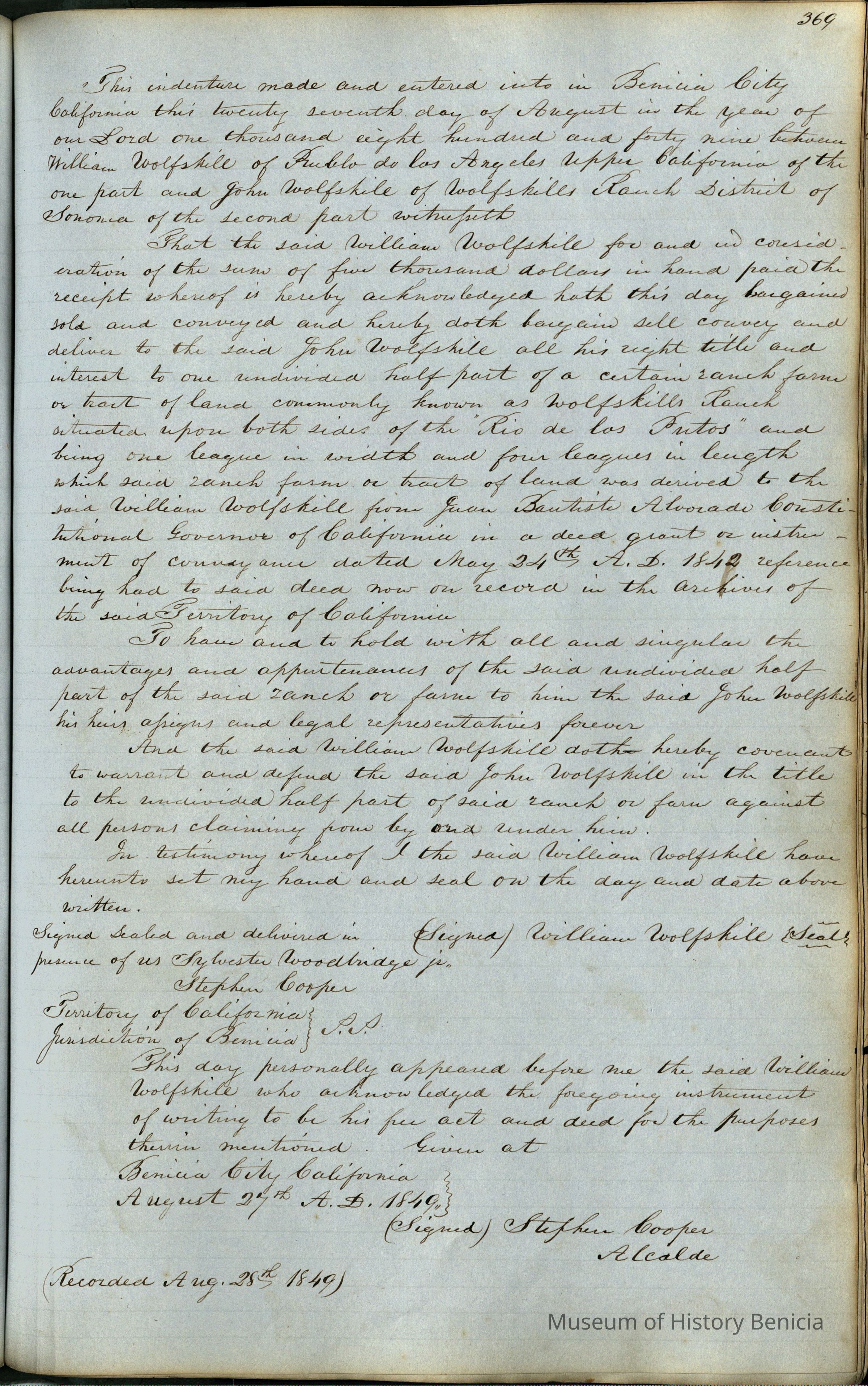 This journal/ledger contains the beginnings of Benicia including: lists and descriptions of first 12 houses in Benicia, a translation of the deed to General Vallejo by Manual Micheltorena, Governor of Calif. (1844); deed to Semple and Larkin by Vallejo (1847); deeds of properties sold by Semple and Larkin from 1847 - 1849