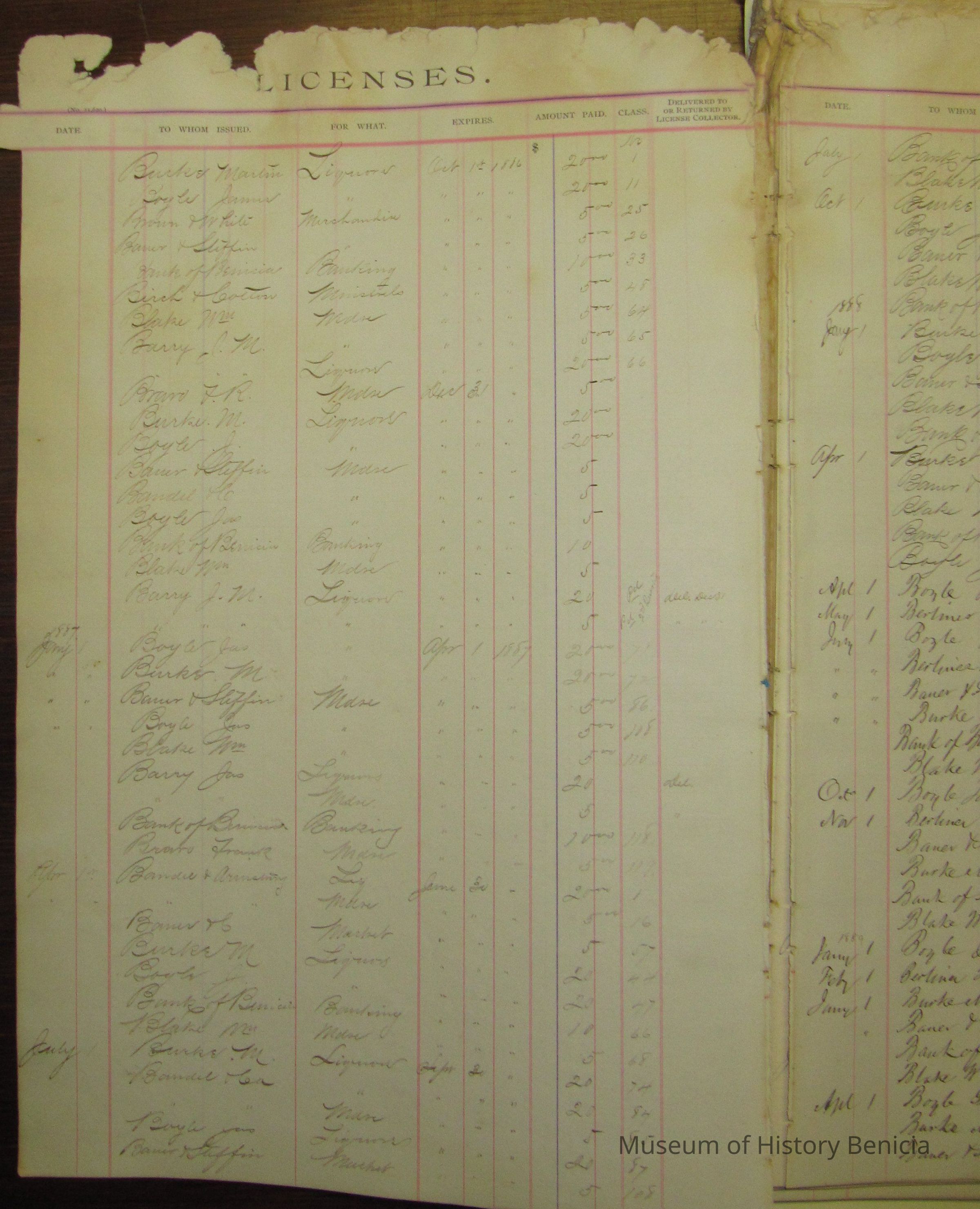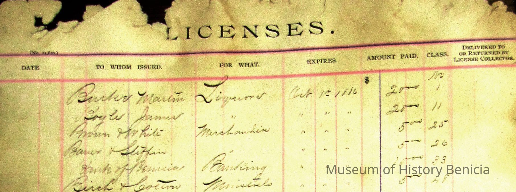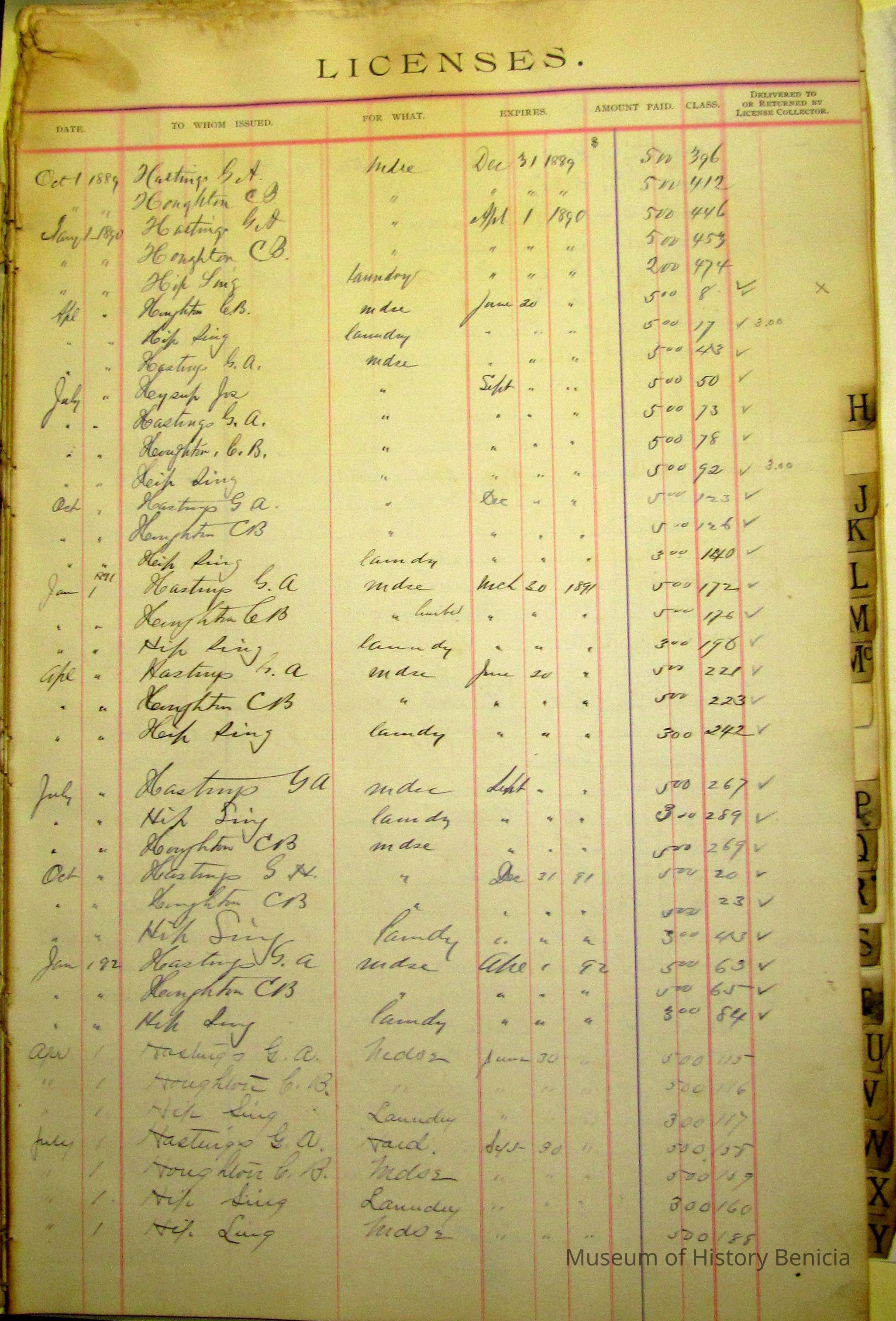 Indexed pages of a ledger listing people who paid for licenses from the city from 1886 to 1896. Descriptive card with Accession sheet says: "Benicia city book of licenses/ Those who operated a business in the city of Benicia had to regularly pay for a business license. This book kept record of these payments. The earliest date in this record book is 1886. Donated by the city of Benicia."Collection