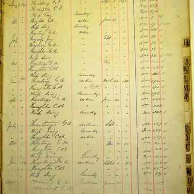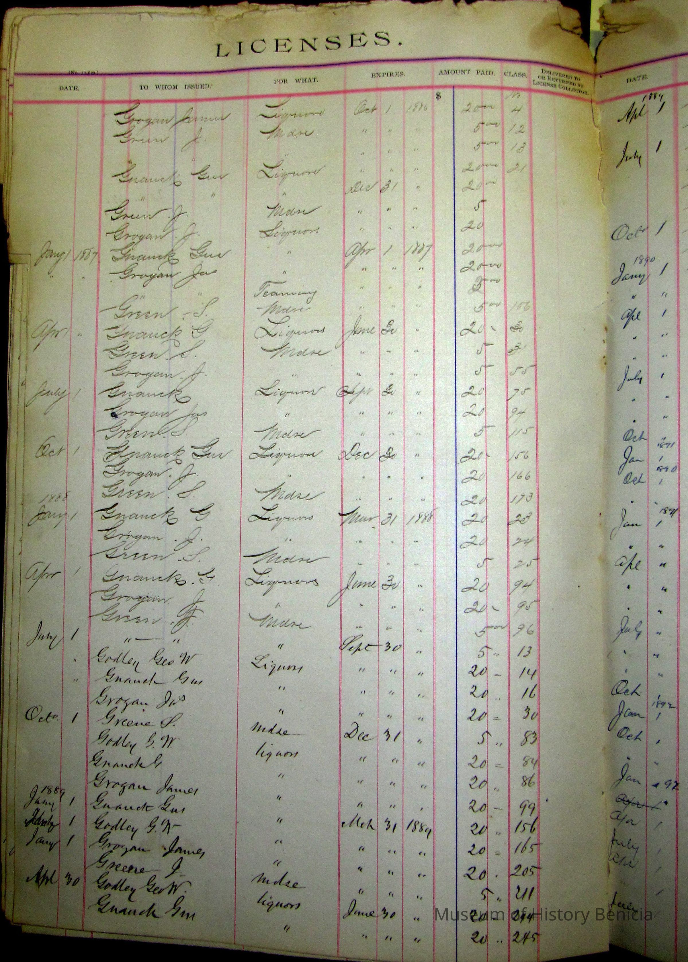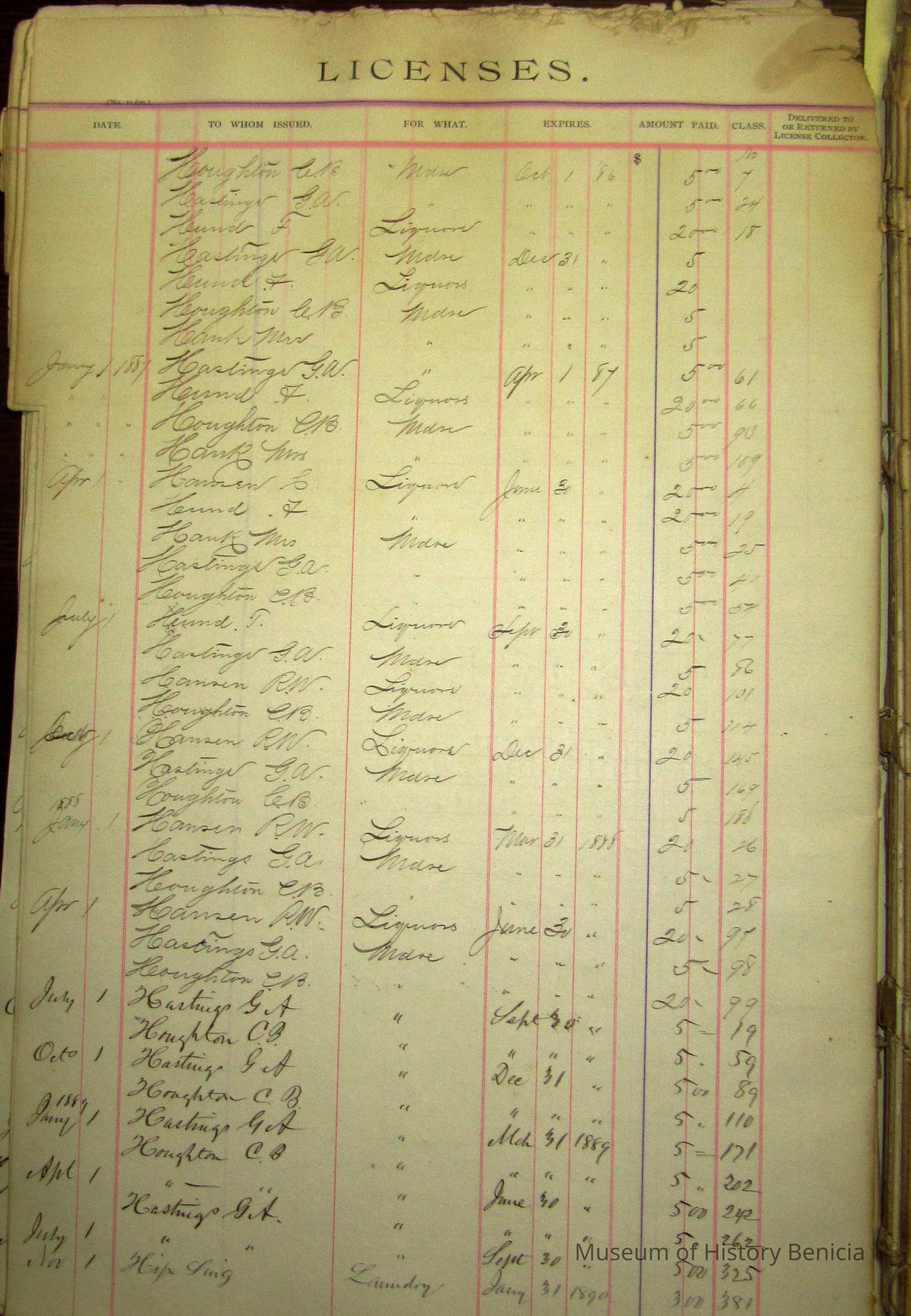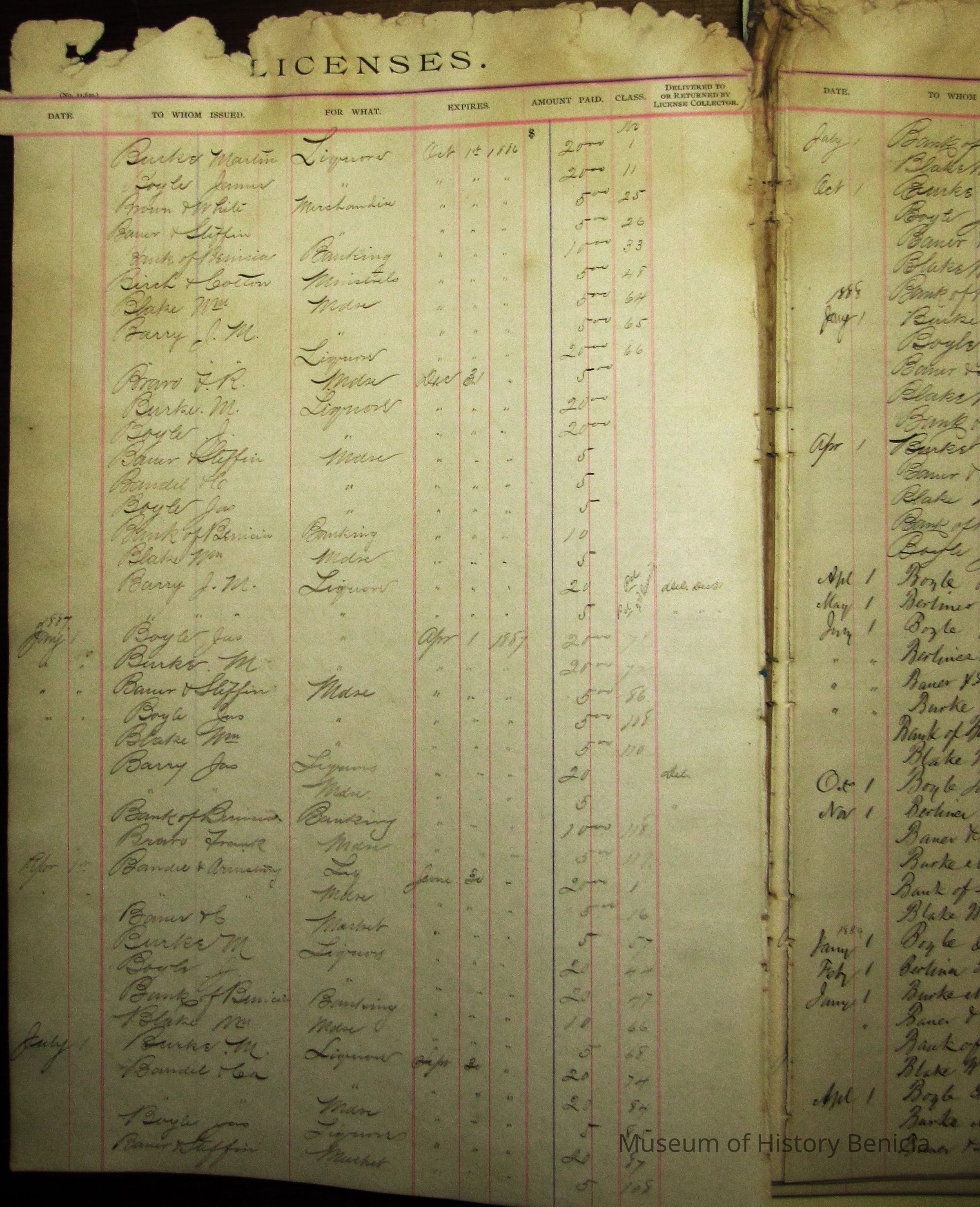 Indexed pages of a ledger listing people who paid for licenses from the city from 1886 to 1896. Descriptive card with Accession sheet says: "Benicia city book of licenses/ Those who operated a business in the city of Benicia had to regularly pay for a business license. This book kept record of these payments. The earliest date in this record book is 1886. Donated by the city of Benicia."Collection