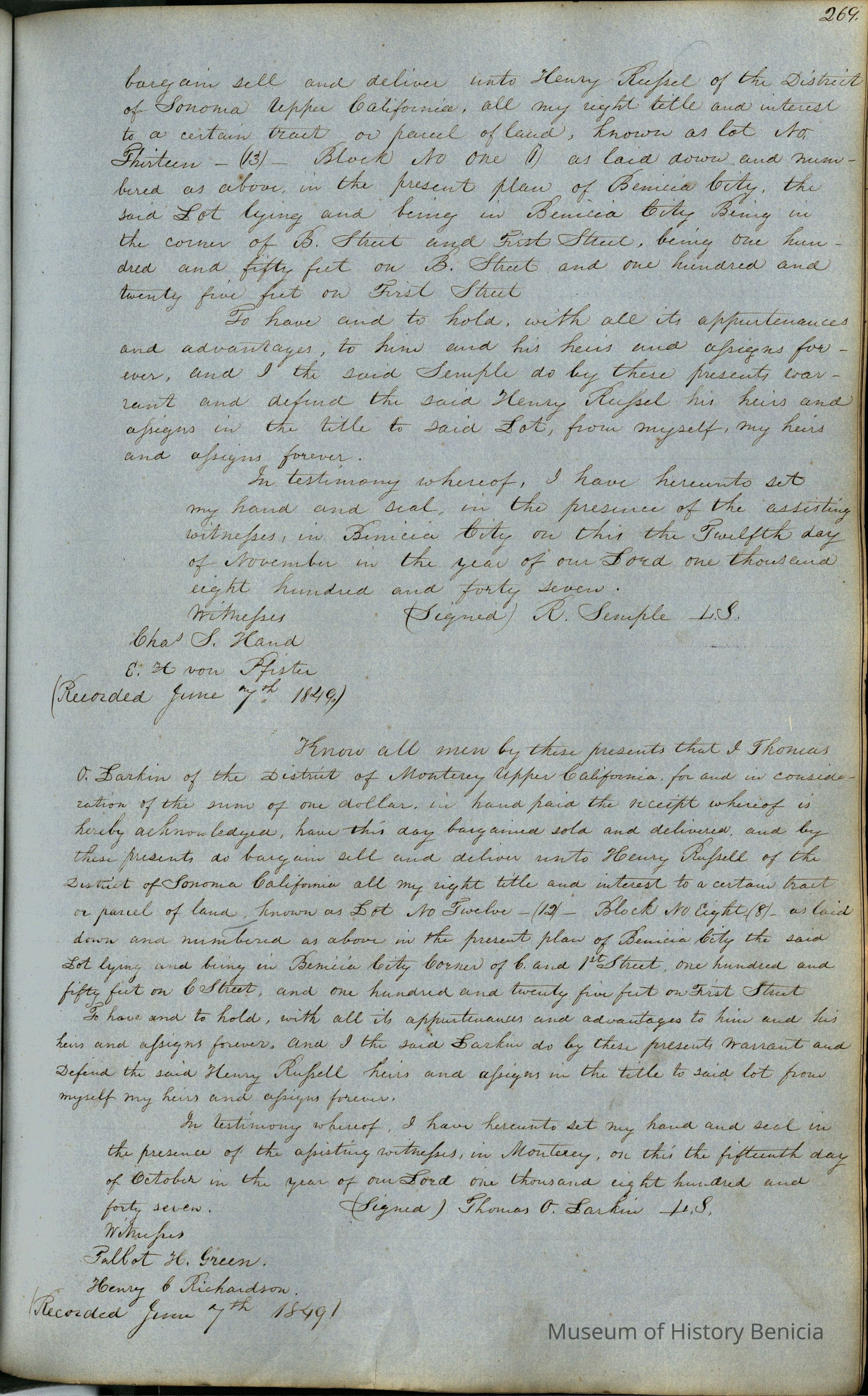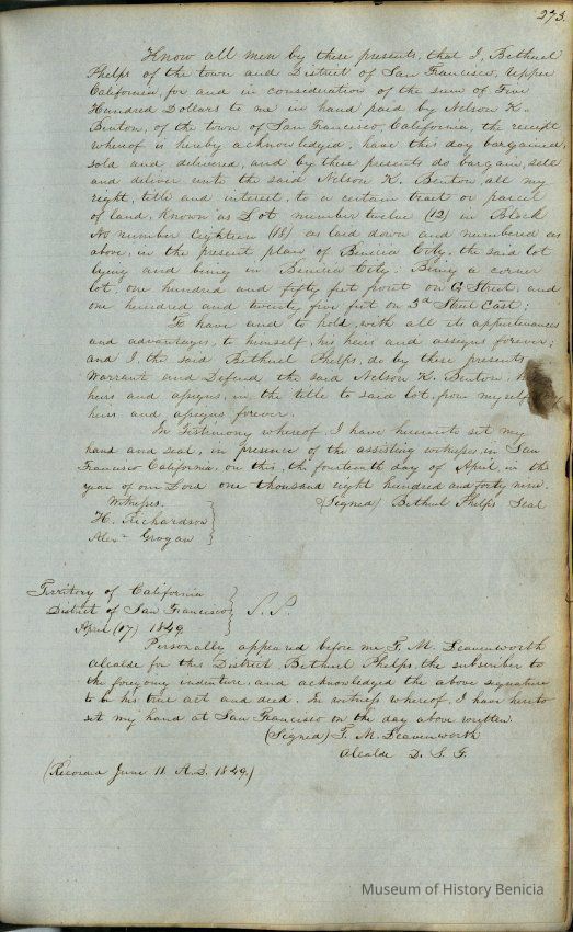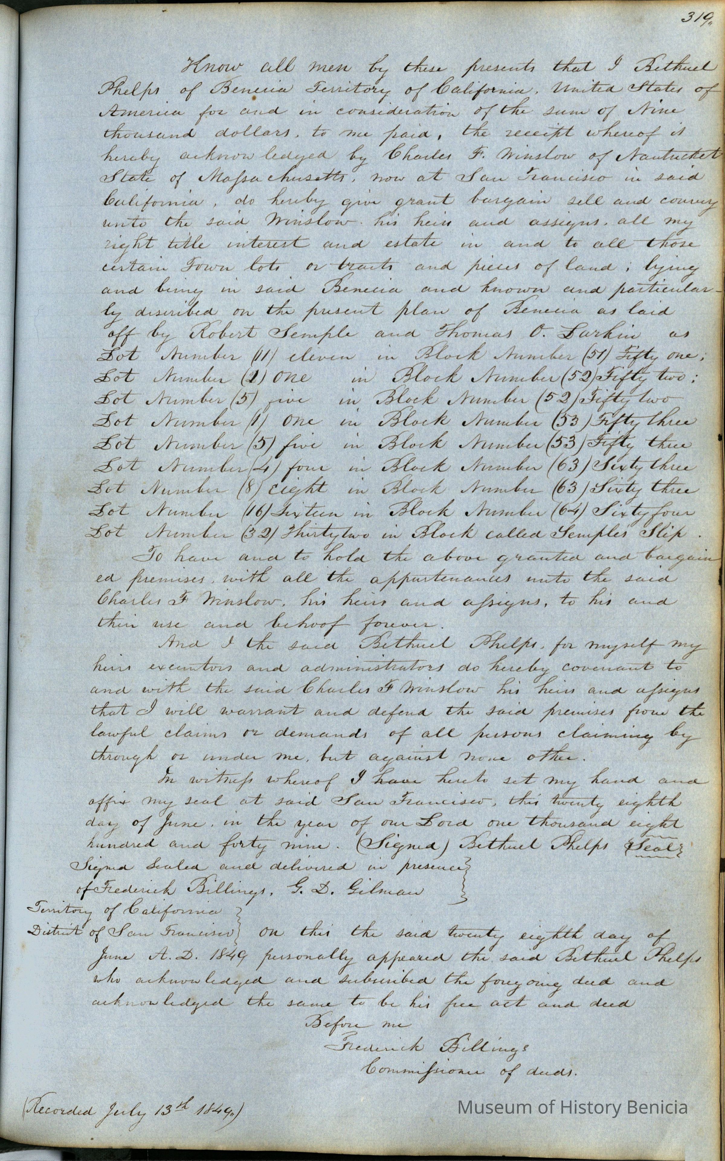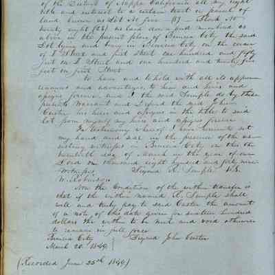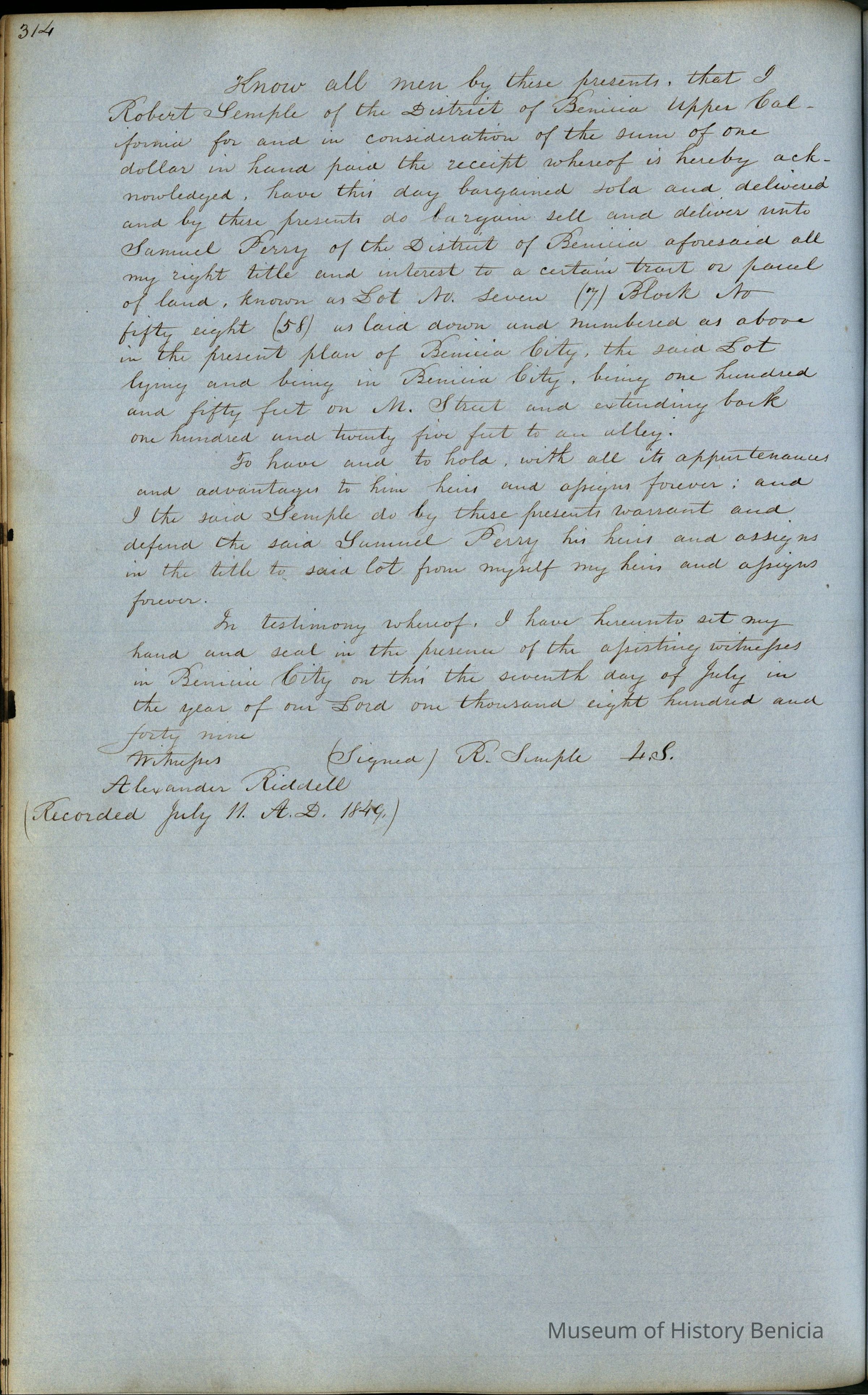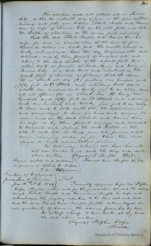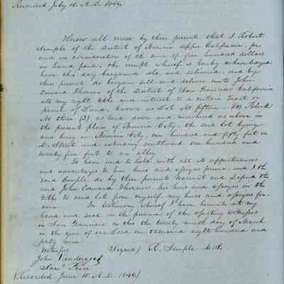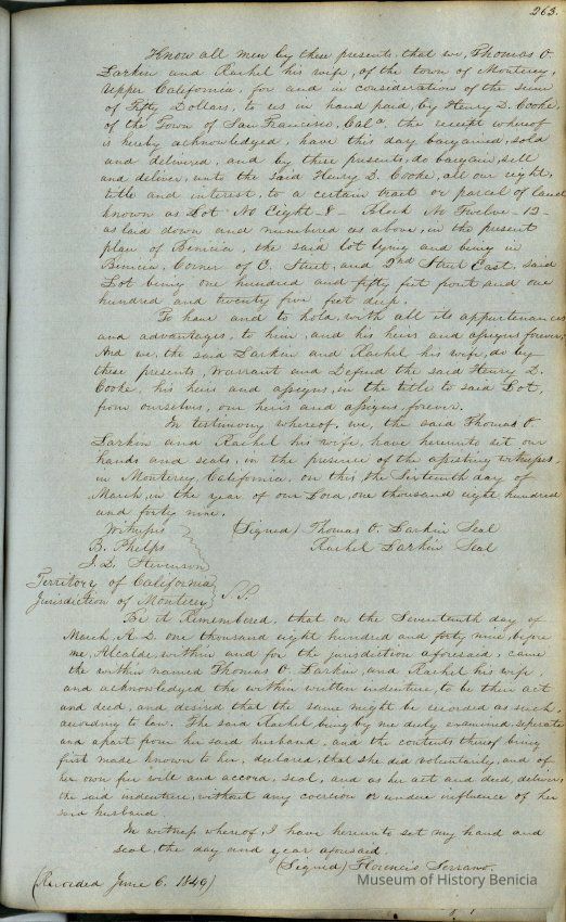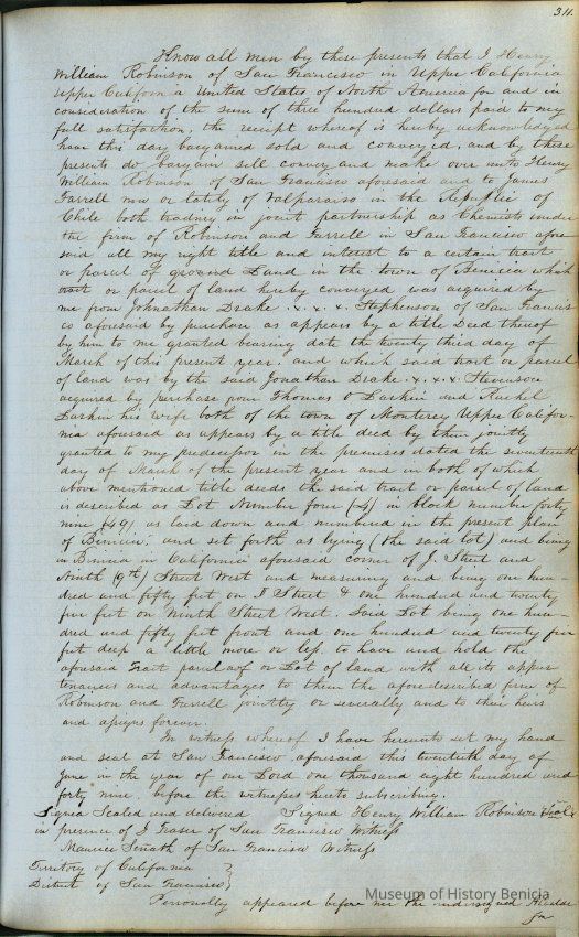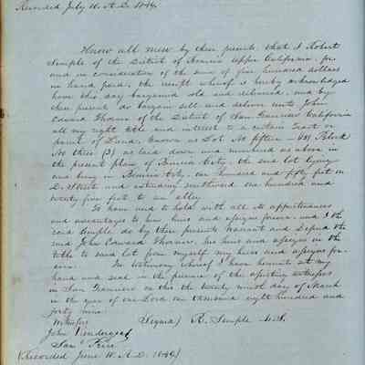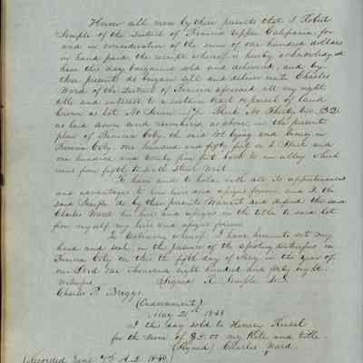 This journal/ledger contains the beginnings of Benicia including: lists and descriptions of first 12 houses in Benicia, a translation of the deed to General Vallejo by Manual Micheltorena, Governor of Calif. (1844); deed to Semple and Larkin by Vallejo (1847); deeds of properties sold by Semple and Larkin from 1847 - 1849