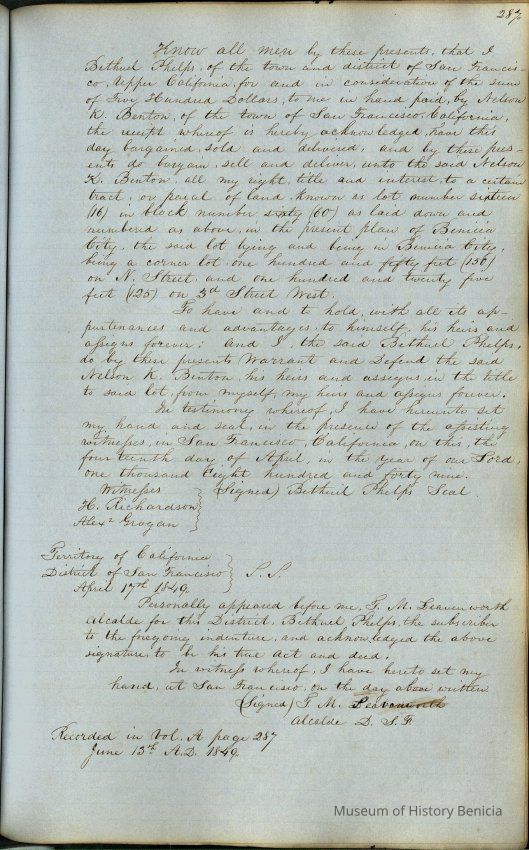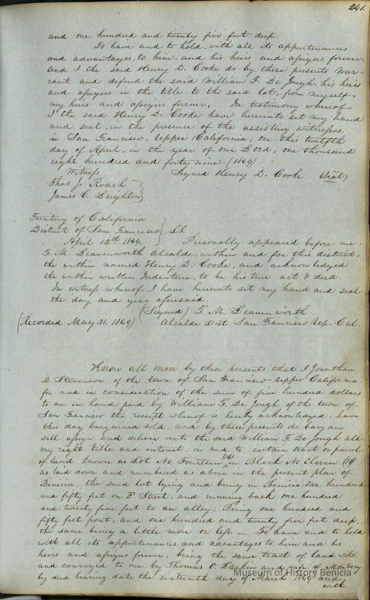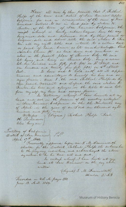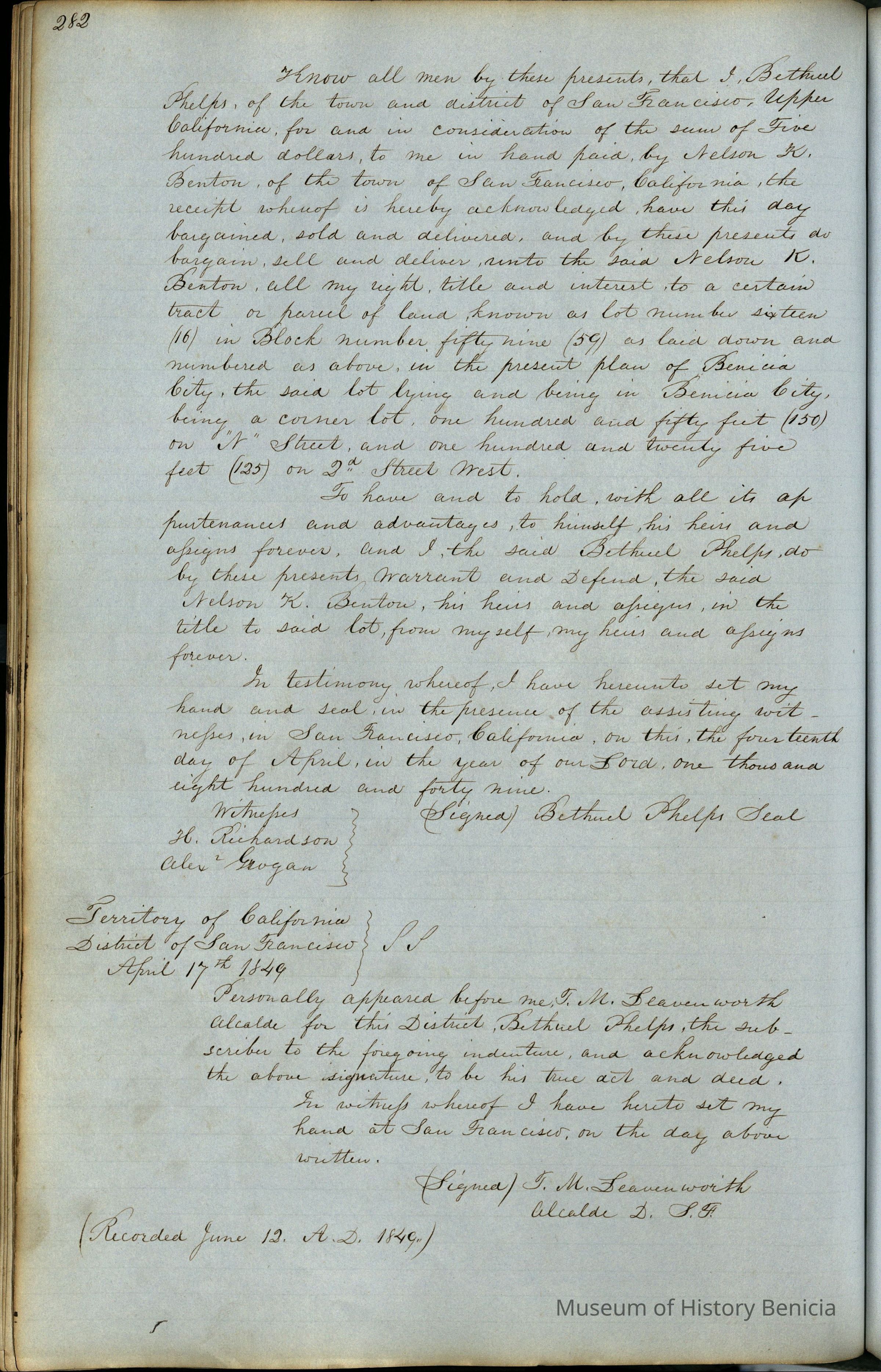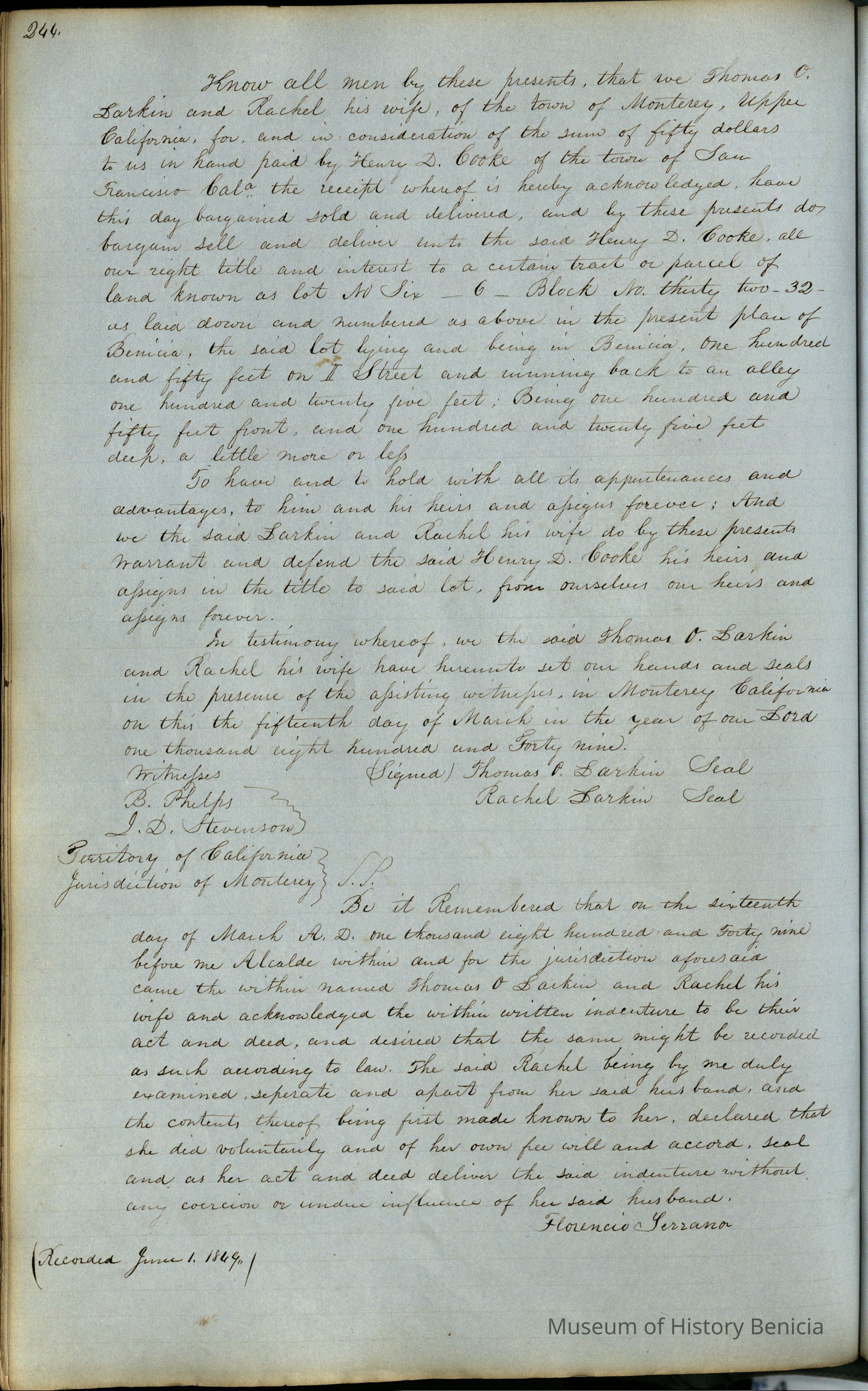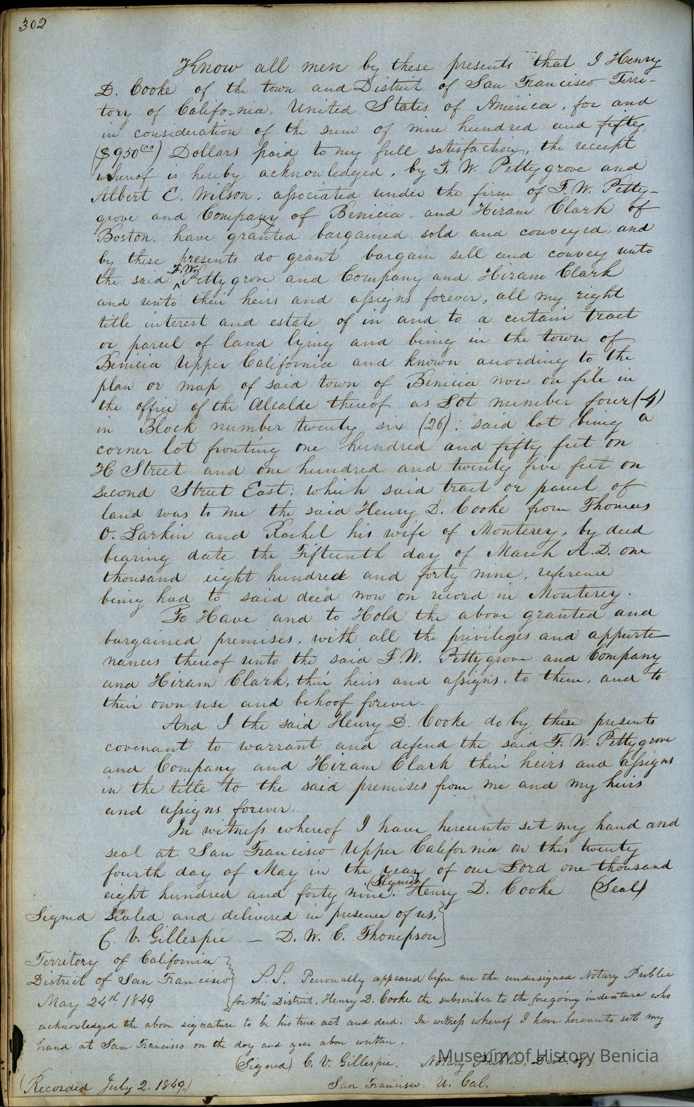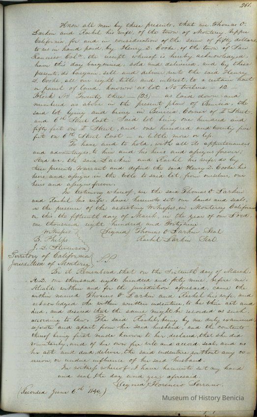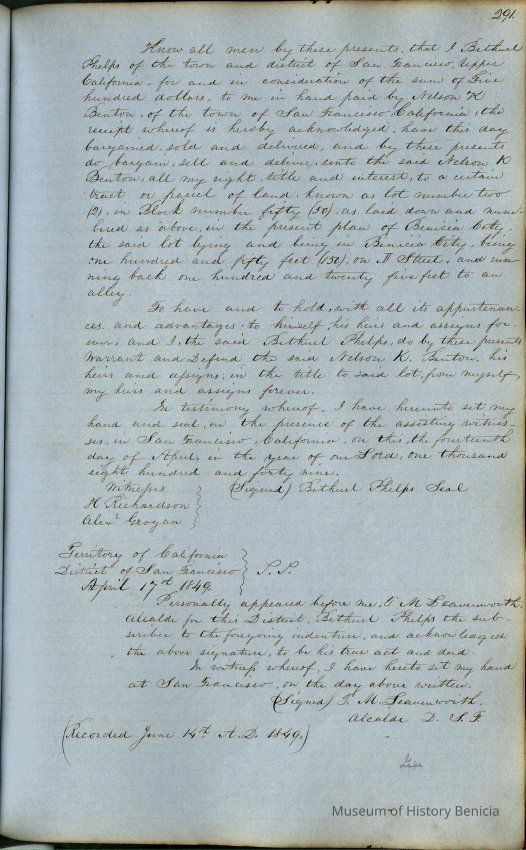 This journal/ledger contains the beginnings of Benicia including: lists and descriptions of first 12 houses in Benicia, a translation of the deed to General Vallejo by Manual Micheltorena, Governor of Calif. (1844); deed to Semple and Larkin by Vallejo (1847); deeds of properties sold by Semple and Larkin from 1847 - 1849