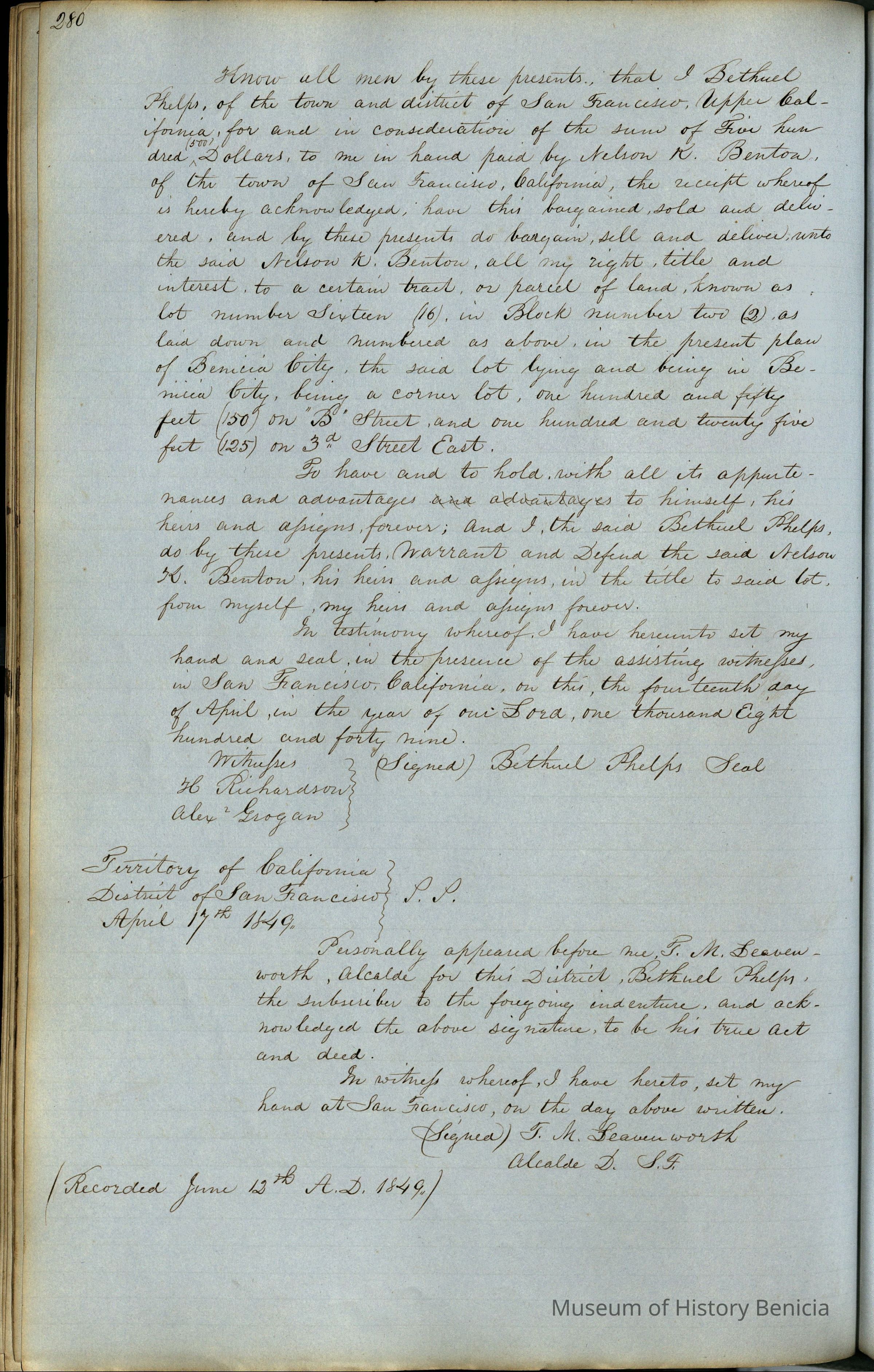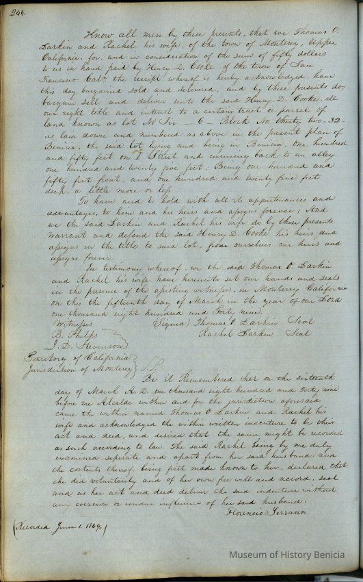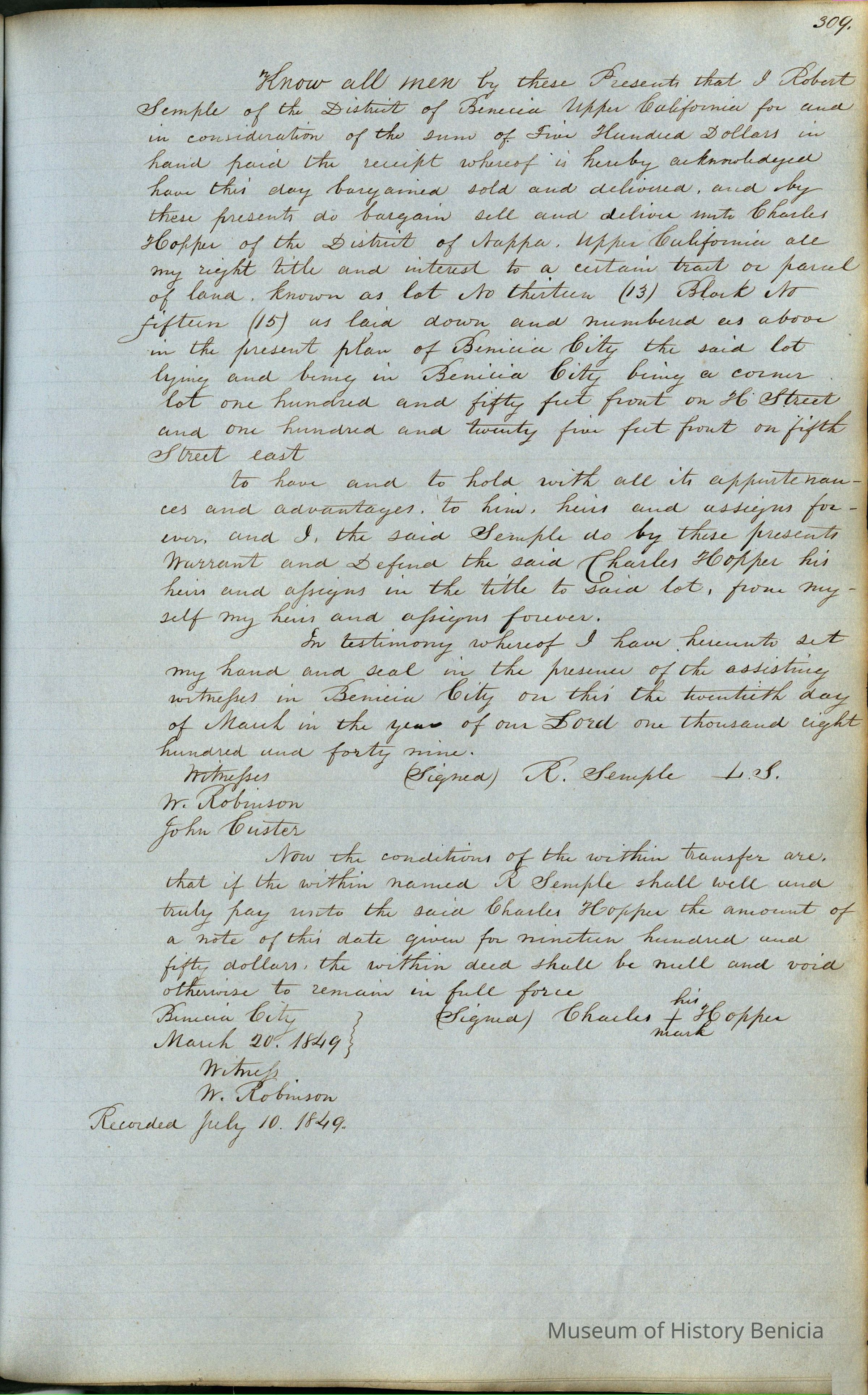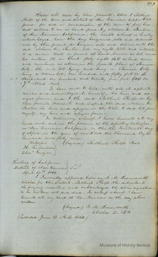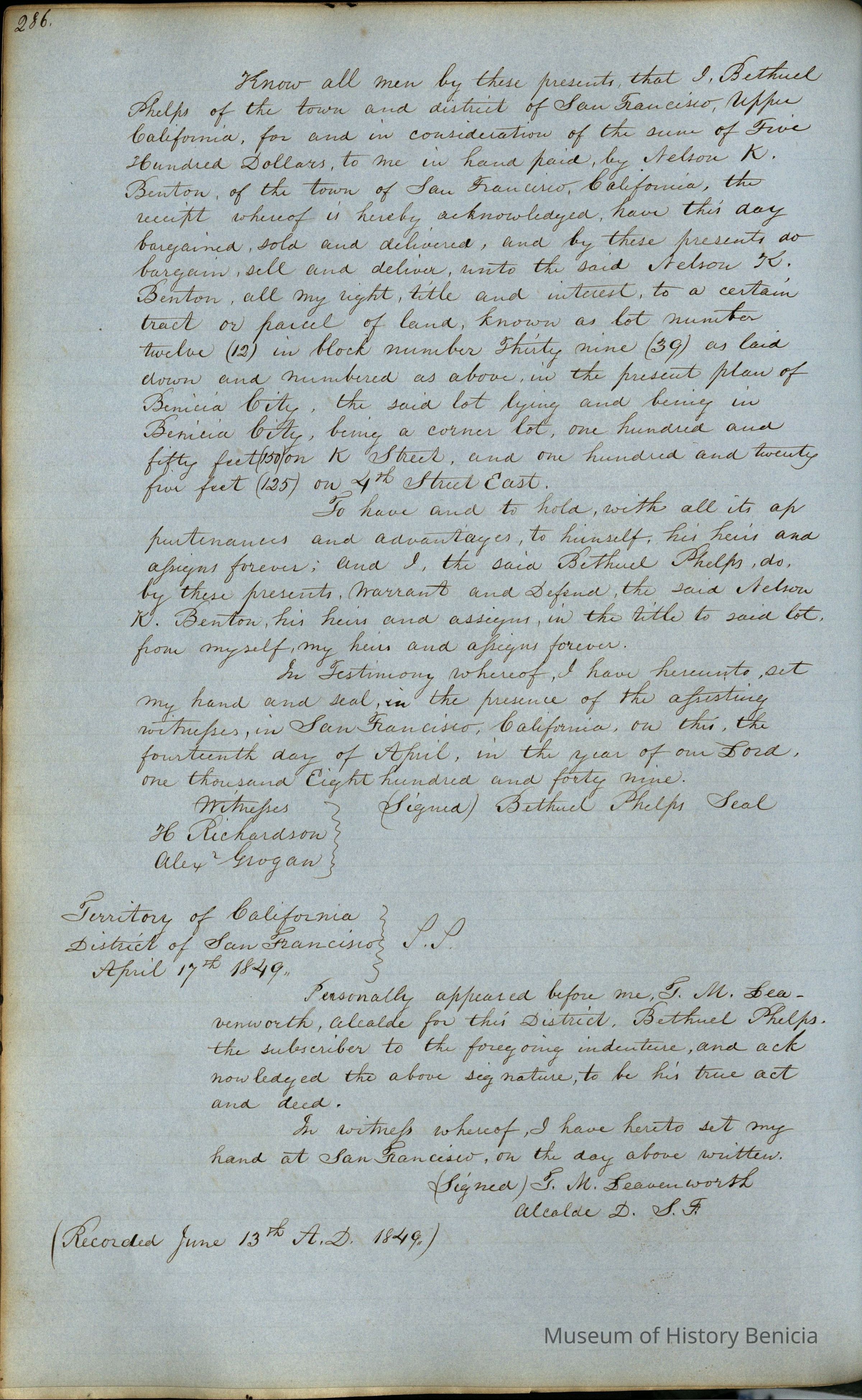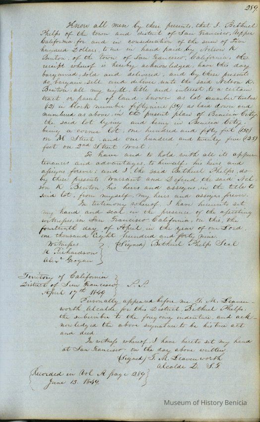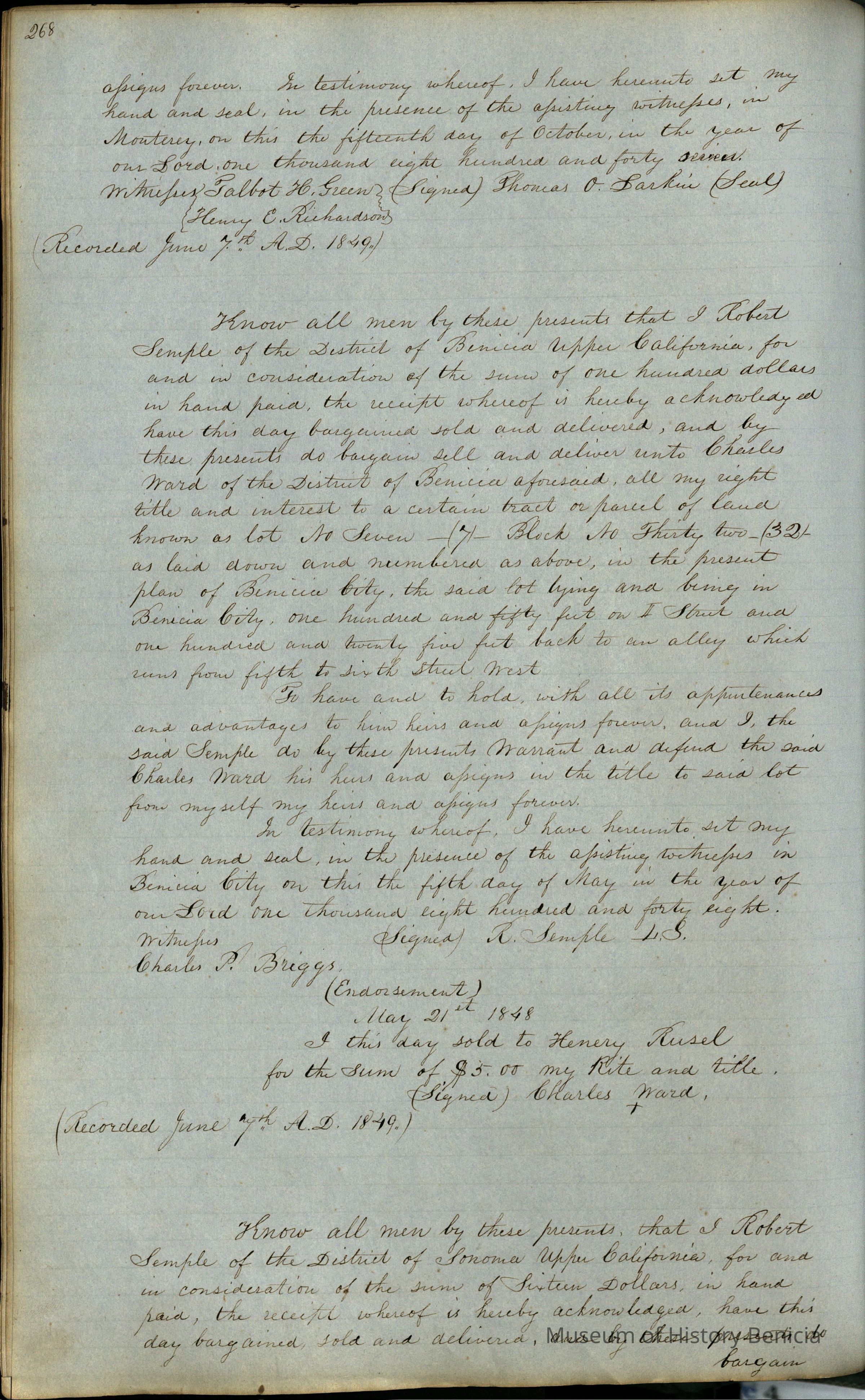 This journal/ledger contains the beginnings of Benicia including: lists and descriptions of first 12 houses in Benicia, a translation of the deed to General Vallejo by Manual Micheltorena, Governor of Calif. (1844); deed to Semple and Larkin by Vallejo (1847); deeds of properties sold by Semple and Larkin from 1847 - 1849
