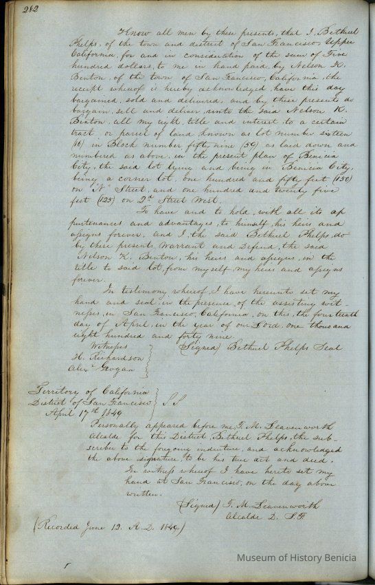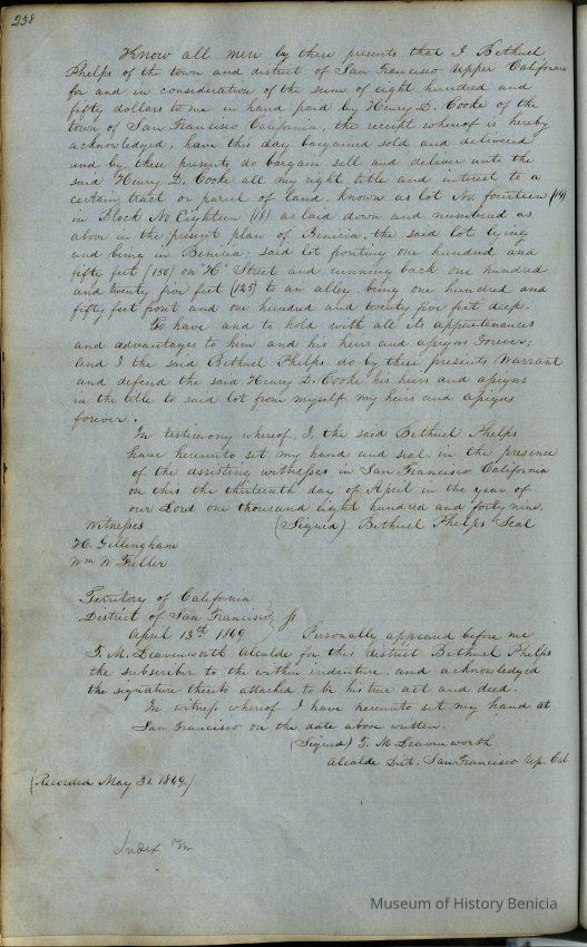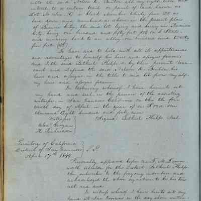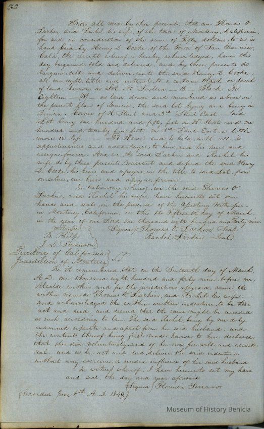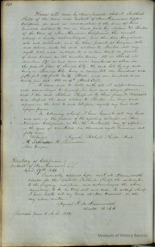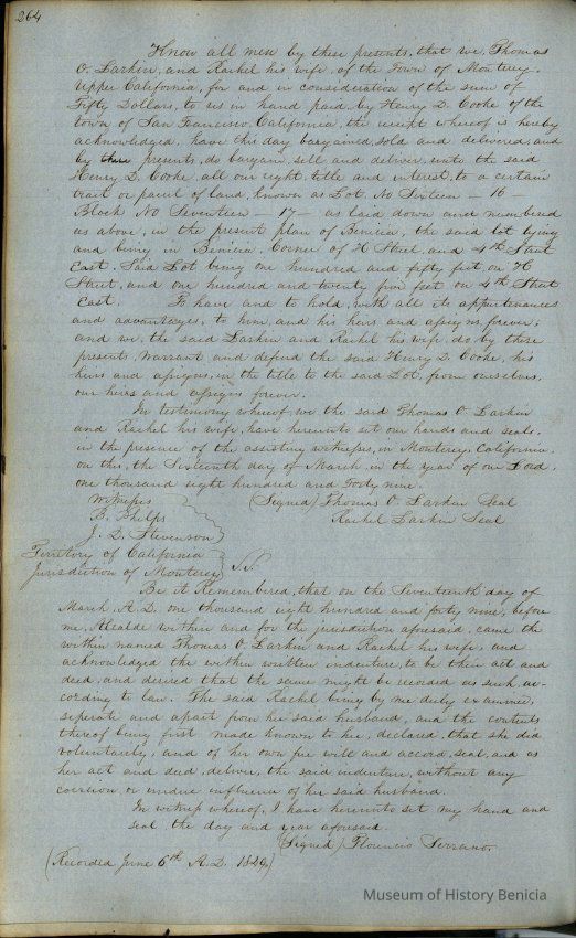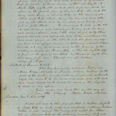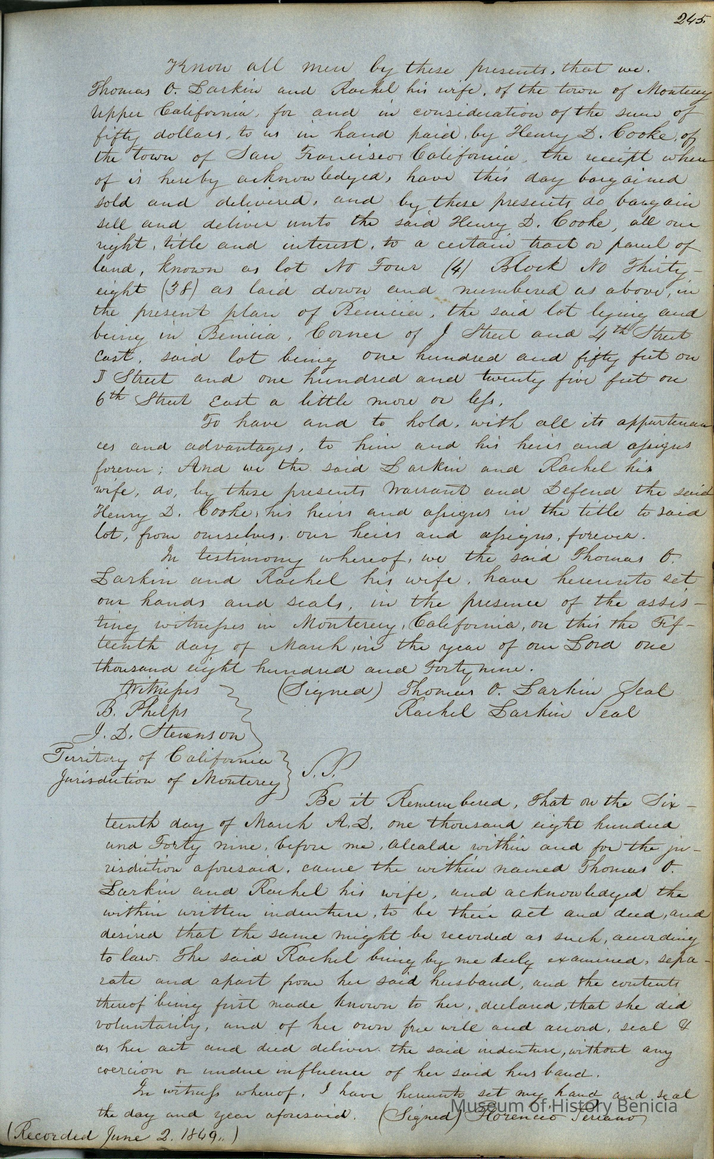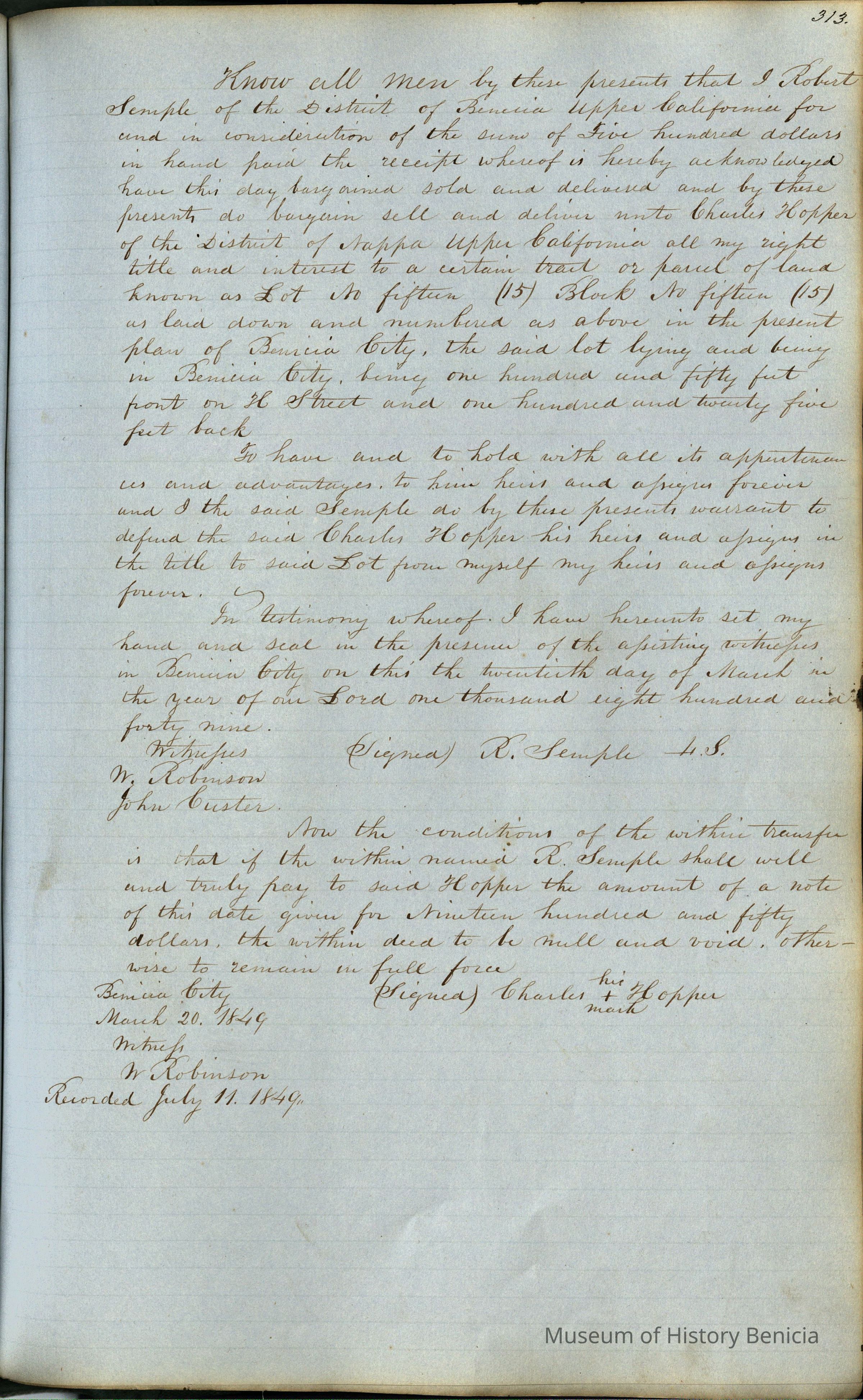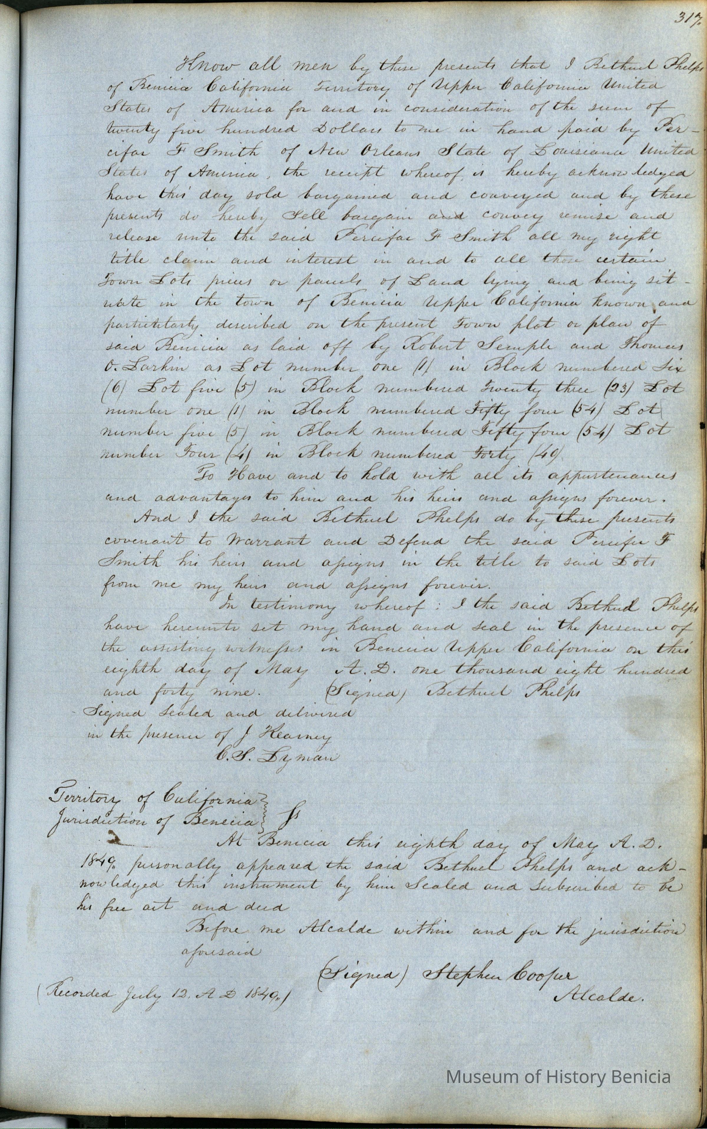 This journal/ledger contains the beginnings of Benicia including: lists and descriptions of first 12 houses in Benicia, a translation of the deed to General Vallejo by Manual Micheltorena, Governor of Calif. (1844); deed to Semple and Larkin by Vallejo (1847); deeds of properties sold by Semple and Larkin from 1847 - 1849