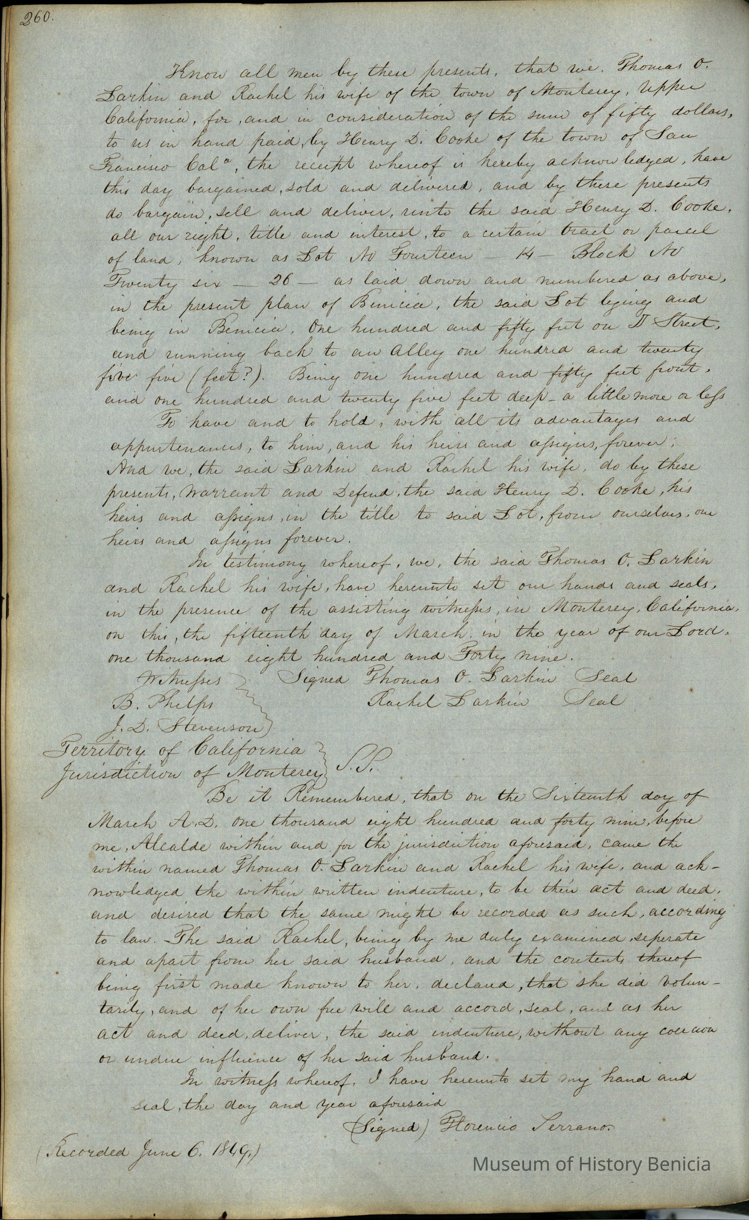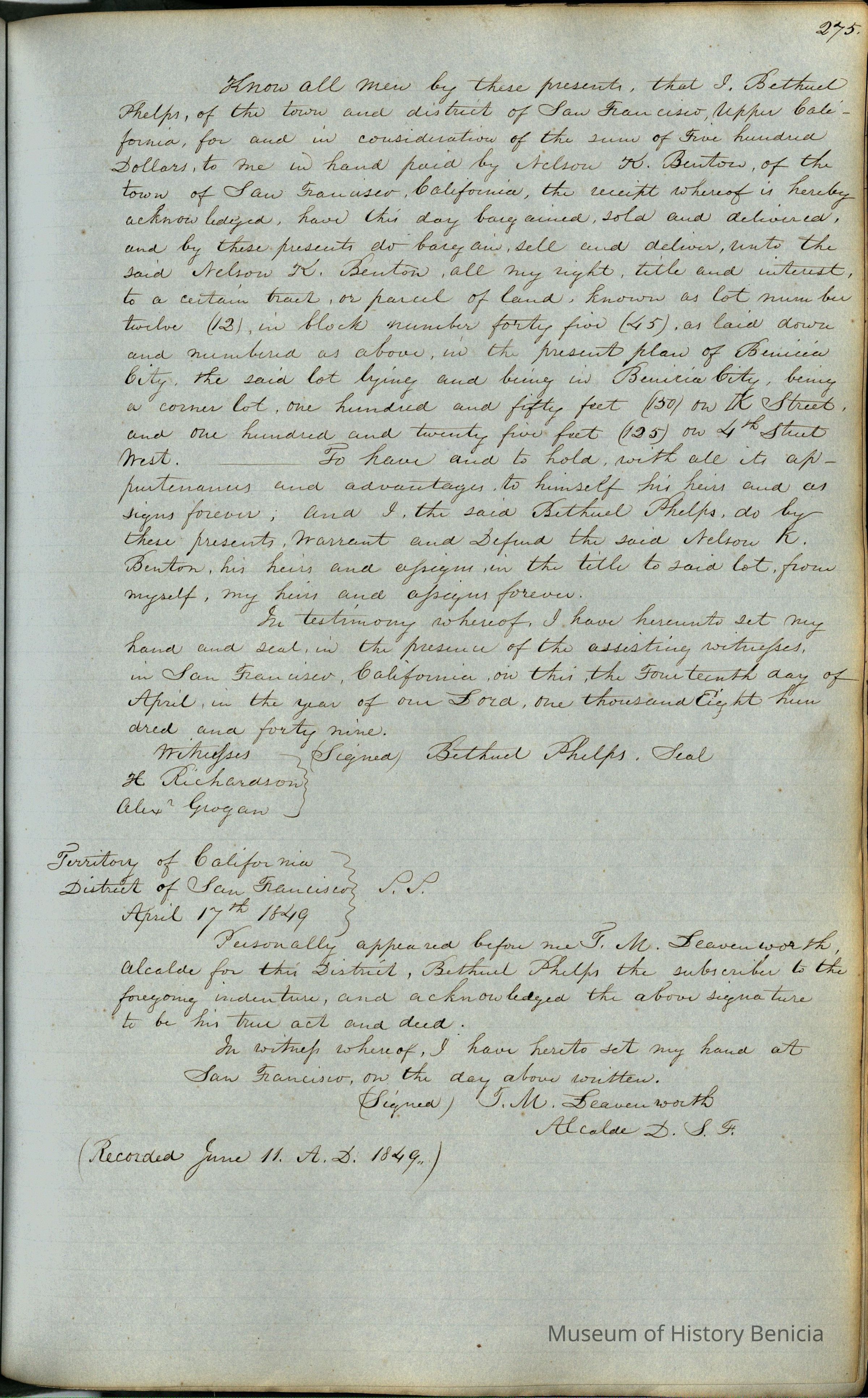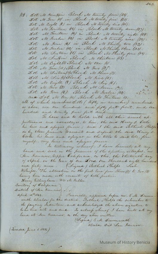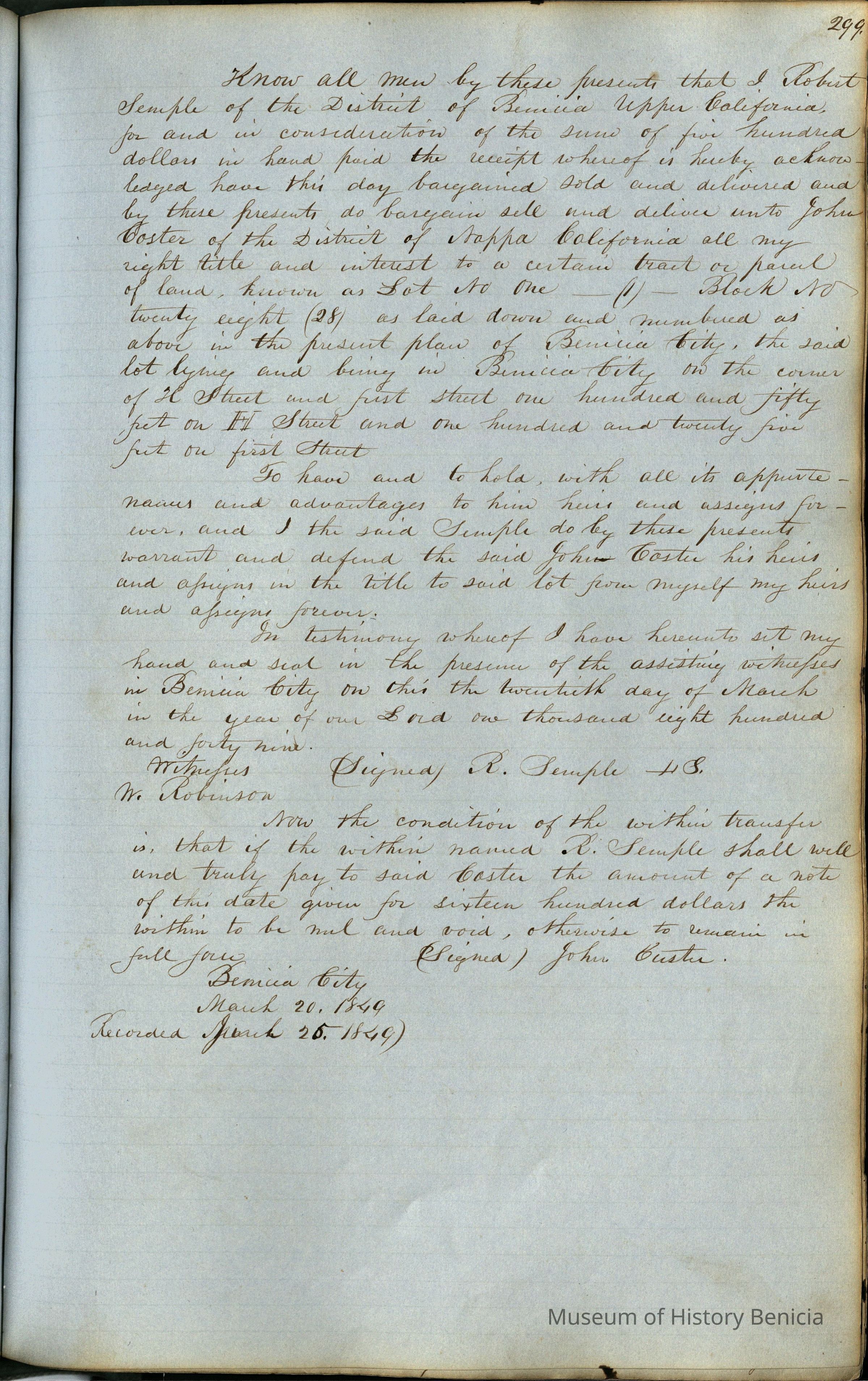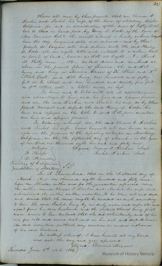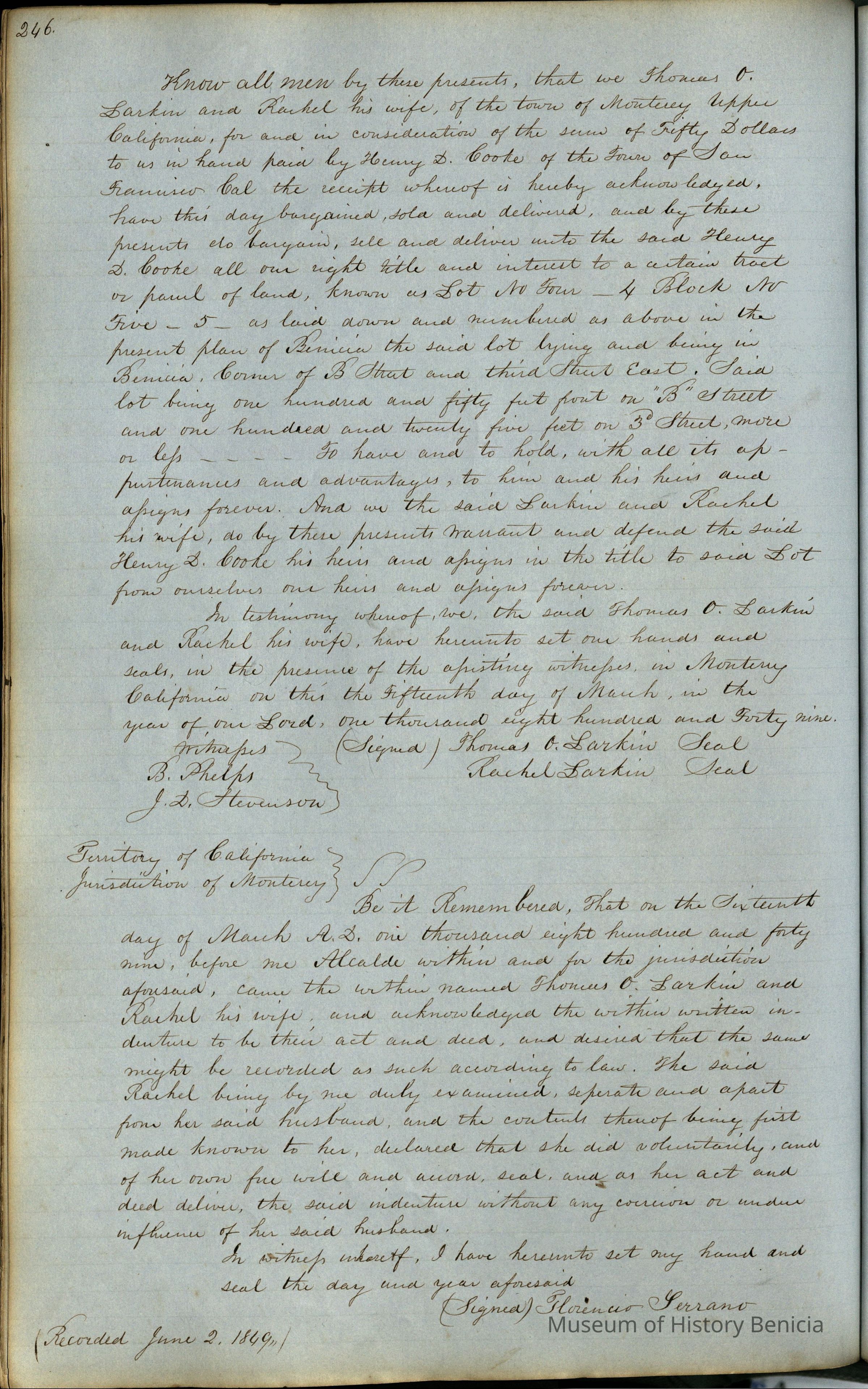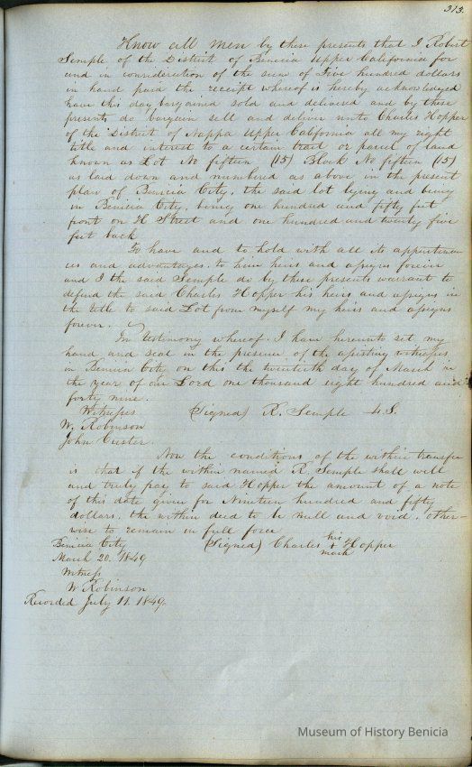 This journal/ledger contains the beginnings of Benicia including: lists and descriptions of first 12 houses in Benicia, a translation of the deed to General Vallejo by Manual Micheltorena, Governor of Calif. (1844); deed to Semple and Larkin by Vallejo (1847); deeds of properties sold by Semple and Larkin from 1847 - 1849