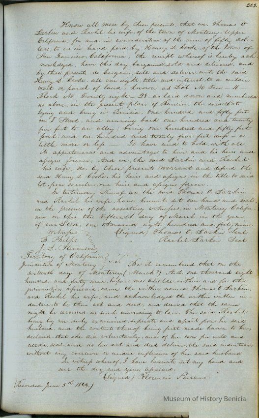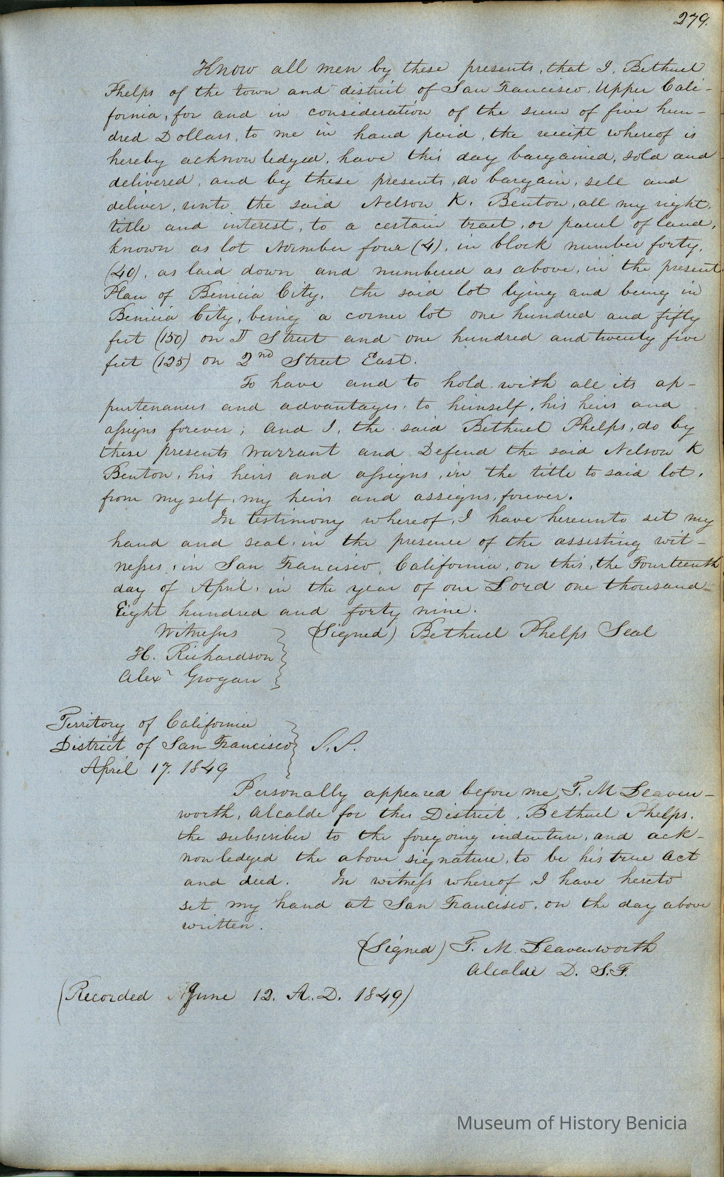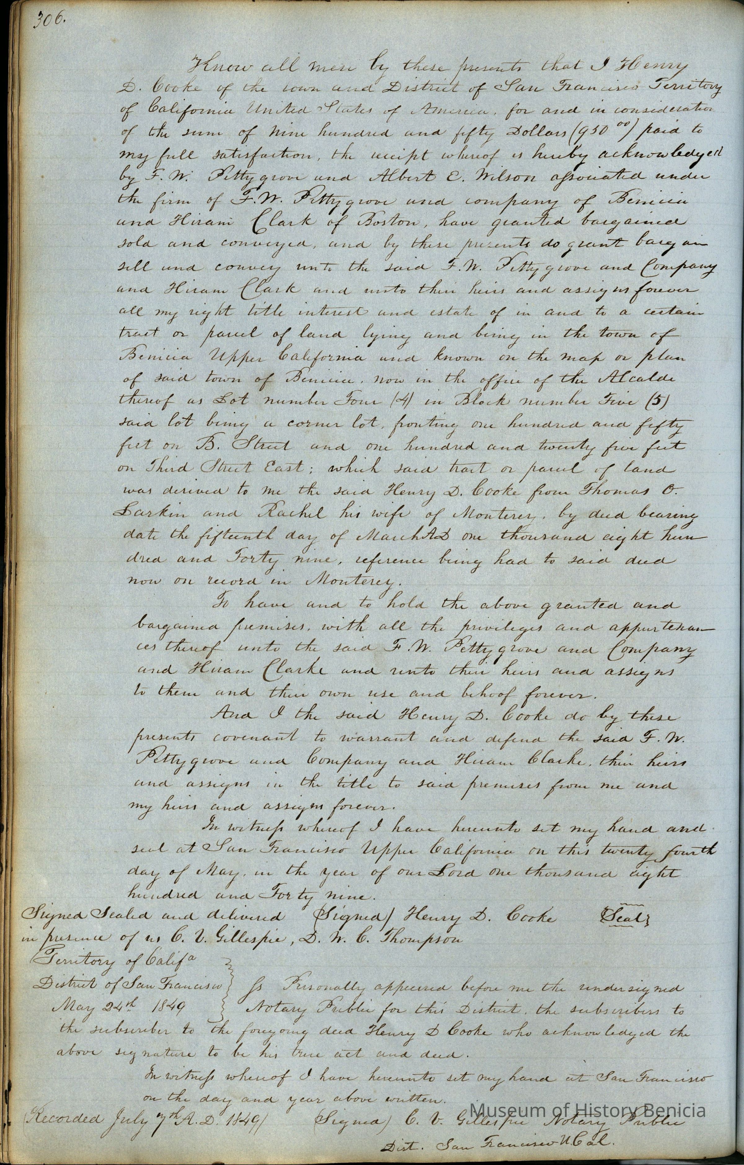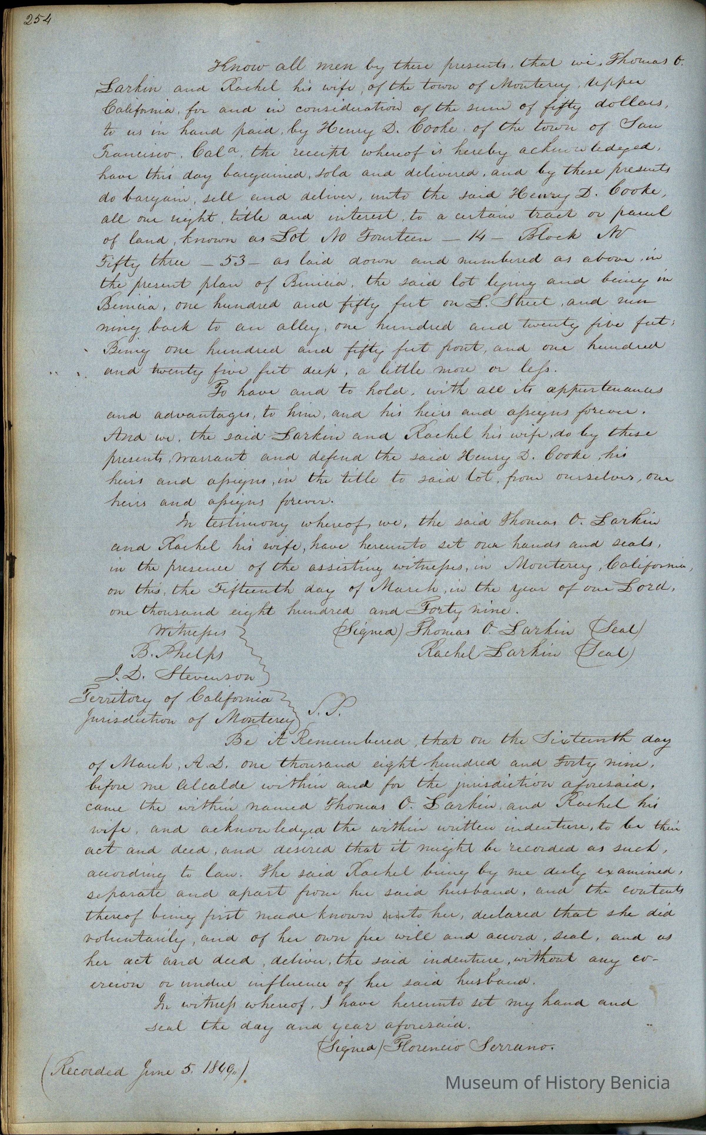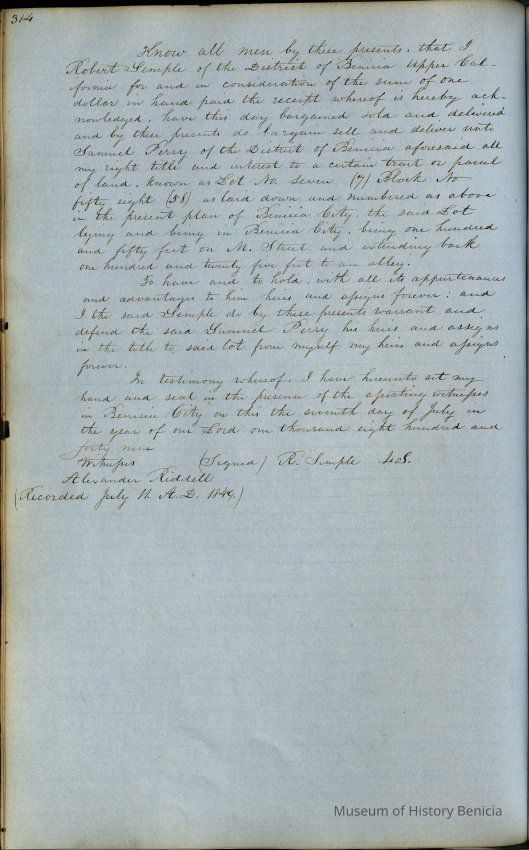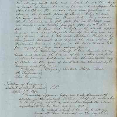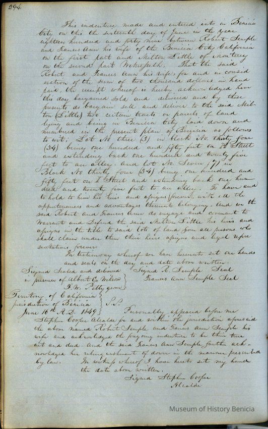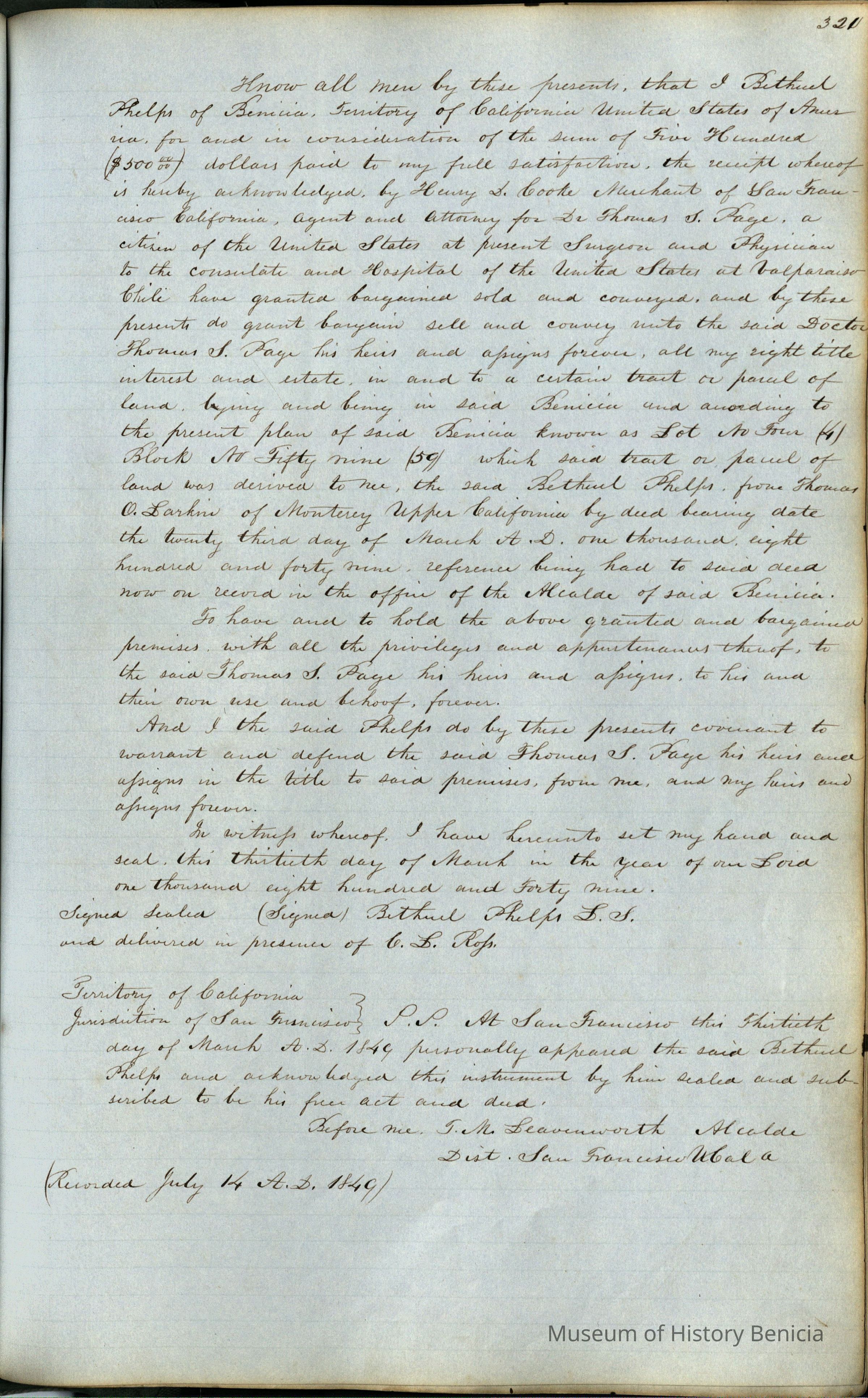 This journal/ledger contains the beginnings of Benicia including: lists and descriptions of first 12 houses in Benicia, a translation of the deed to General Vallejo by Manual Micheltorena, Governor of Calif. (1844); deed to Semple and Larkin by Vallejo (1847); deeds of properties sold by Semple and Larkin from 1847 - 1849