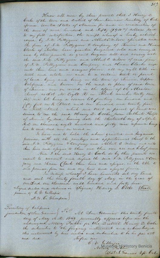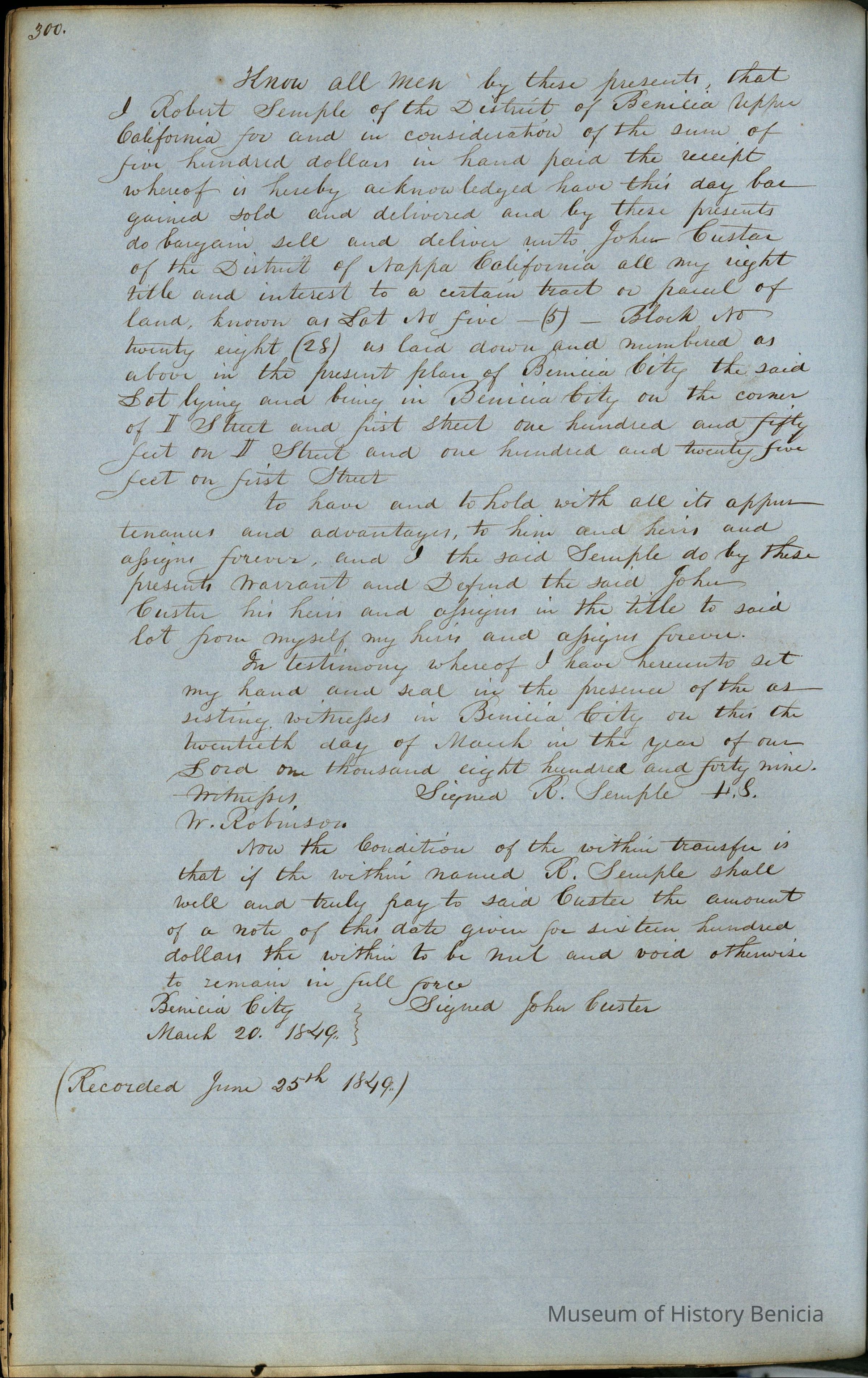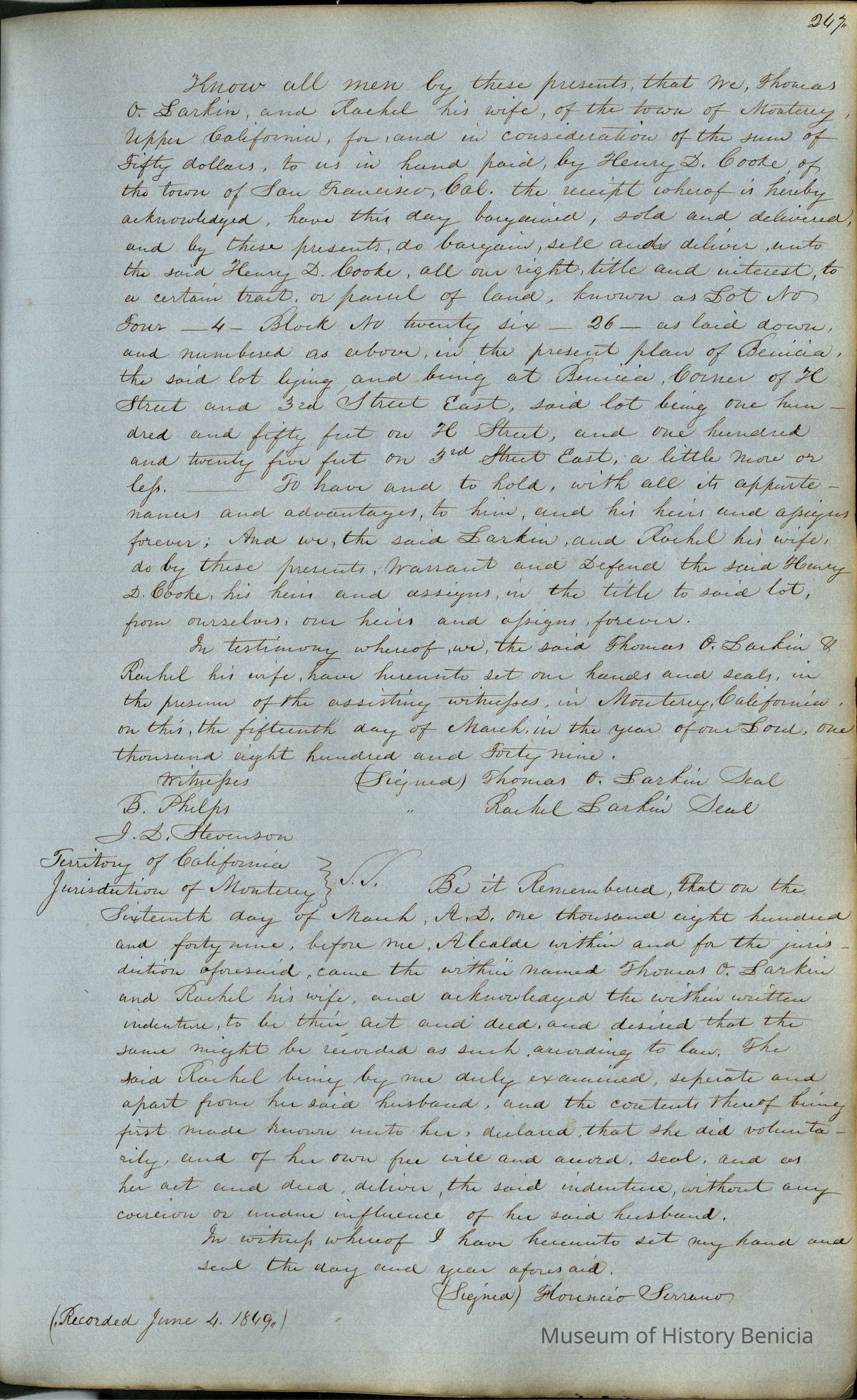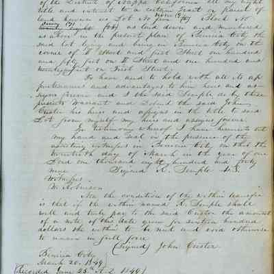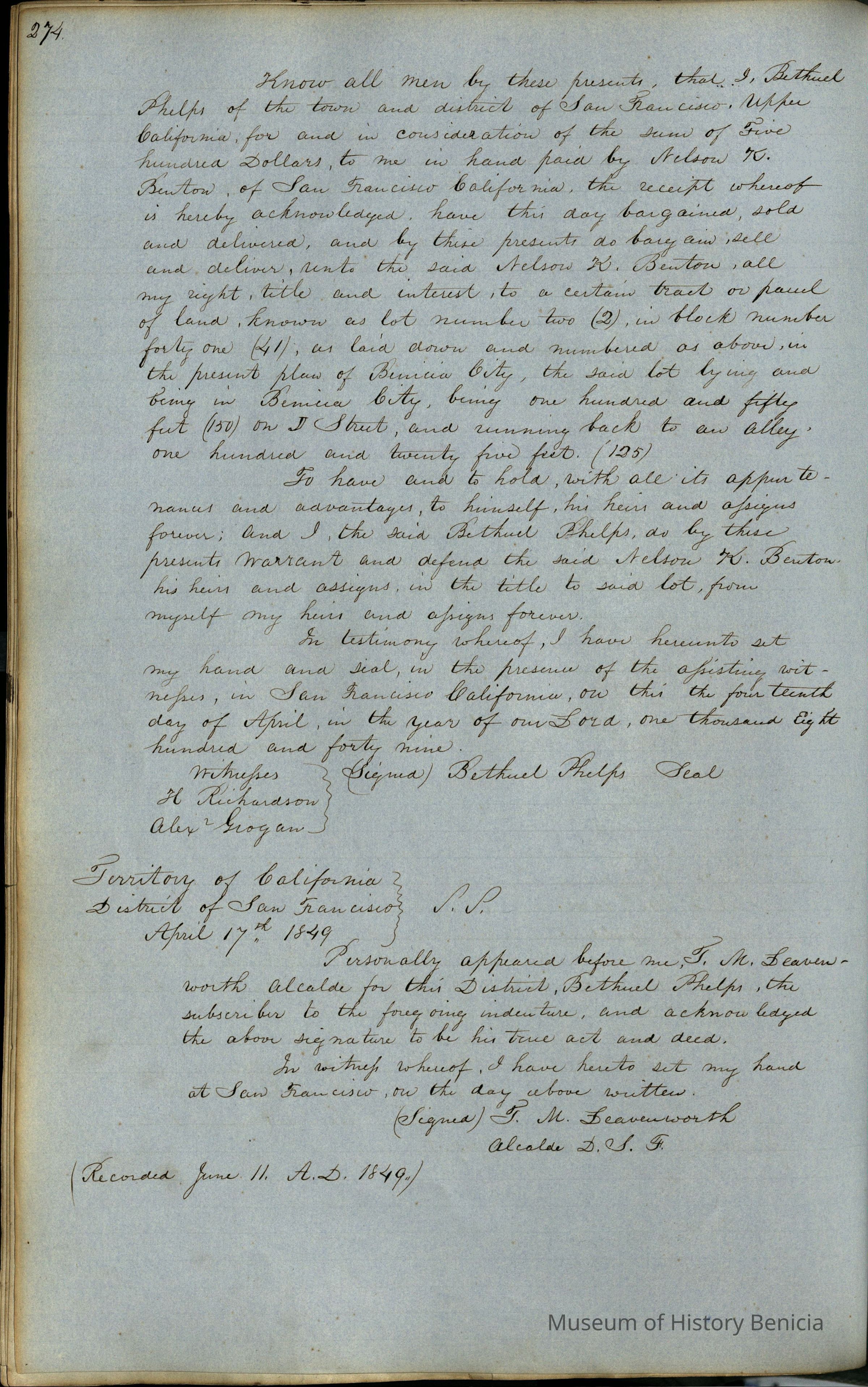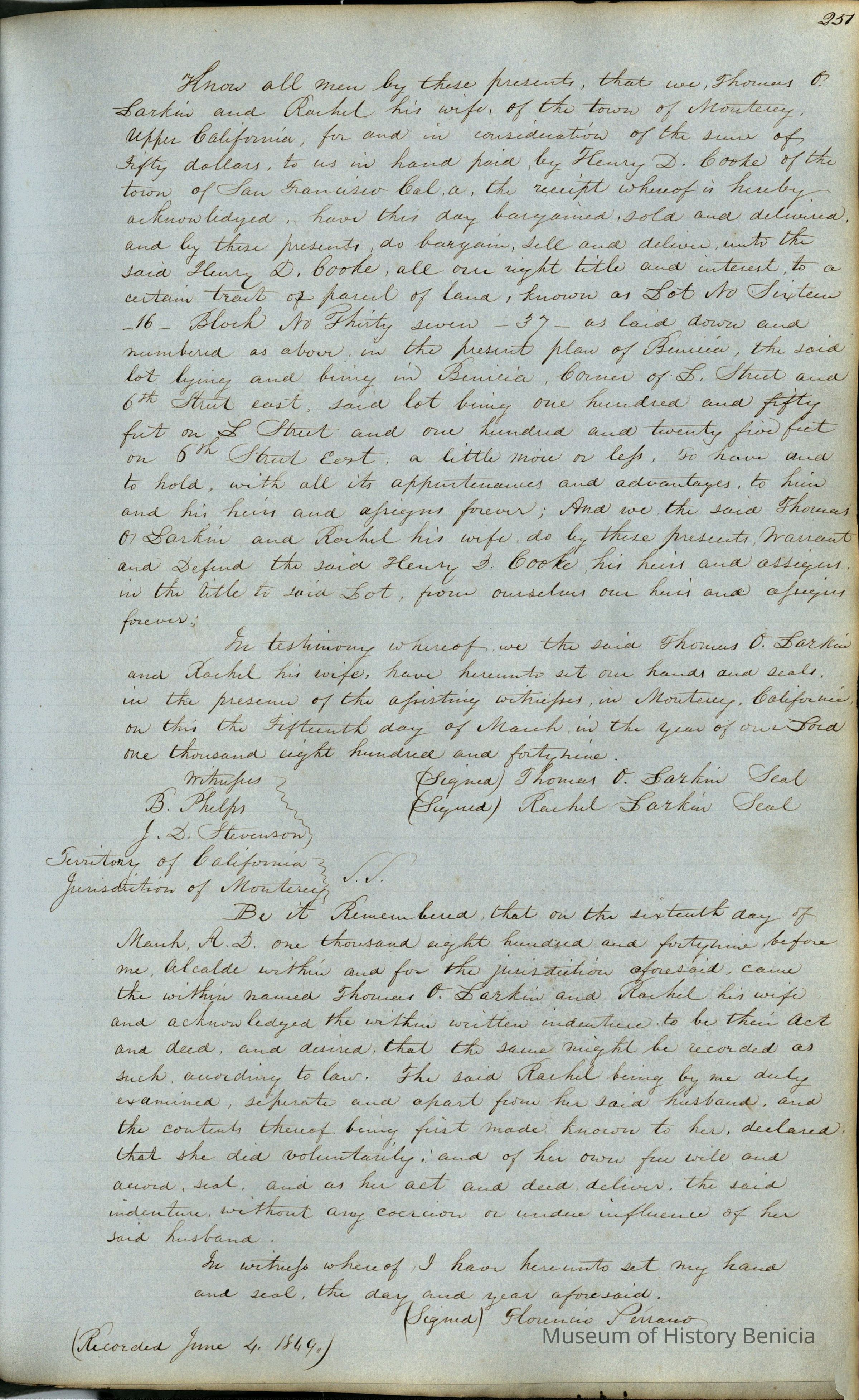 This journal/ledger contains the beginnings of Benicia including: lists and descriptions of first 12 houses in Benicia, a translation of the deed to General Vallejo by Manual Micheltorena, Governor of Calif. (1844); deed to Semple and Larkin by Vallejo (1847); deeds of properties sold by Semple and Larkin from 1847 - 1849