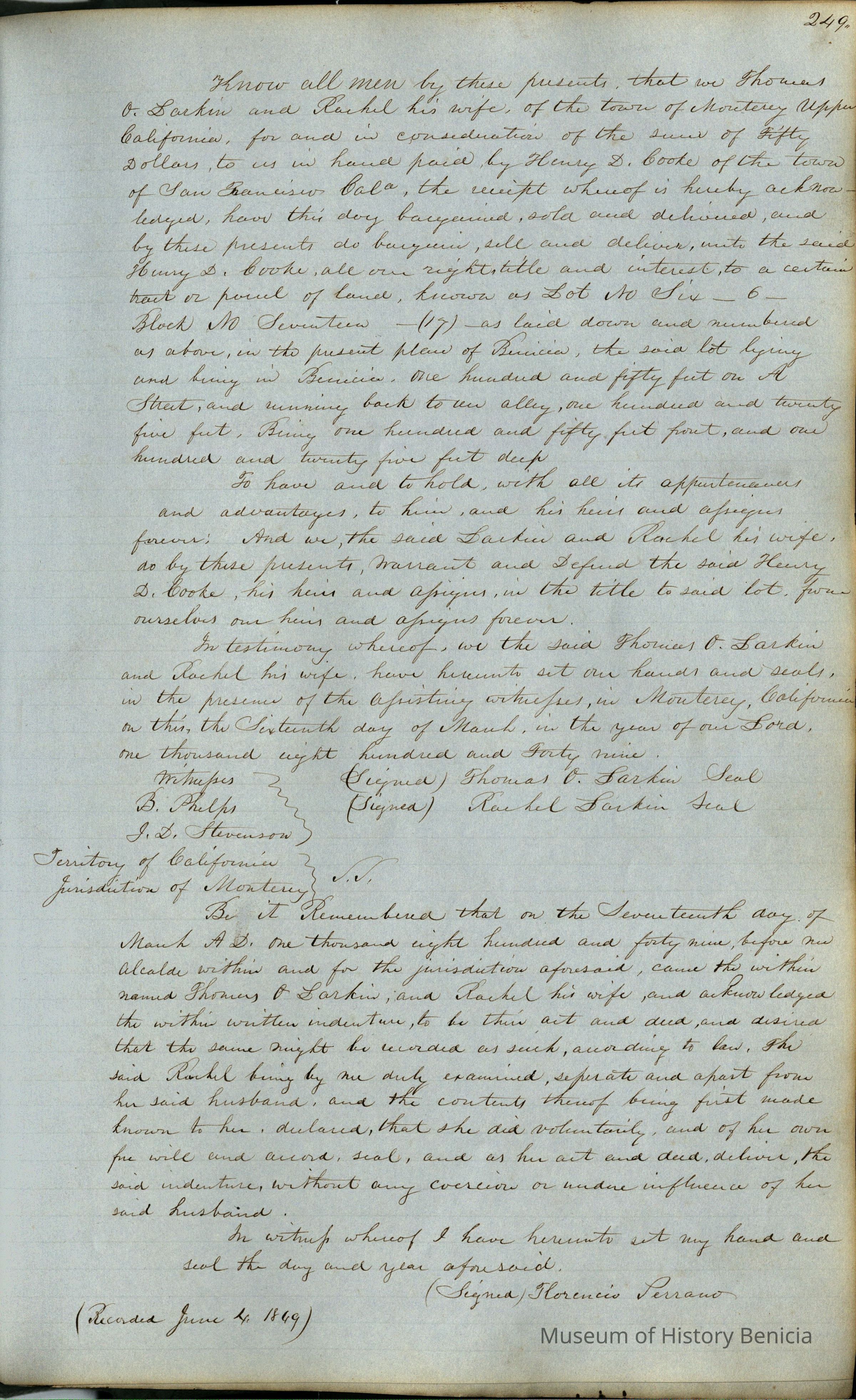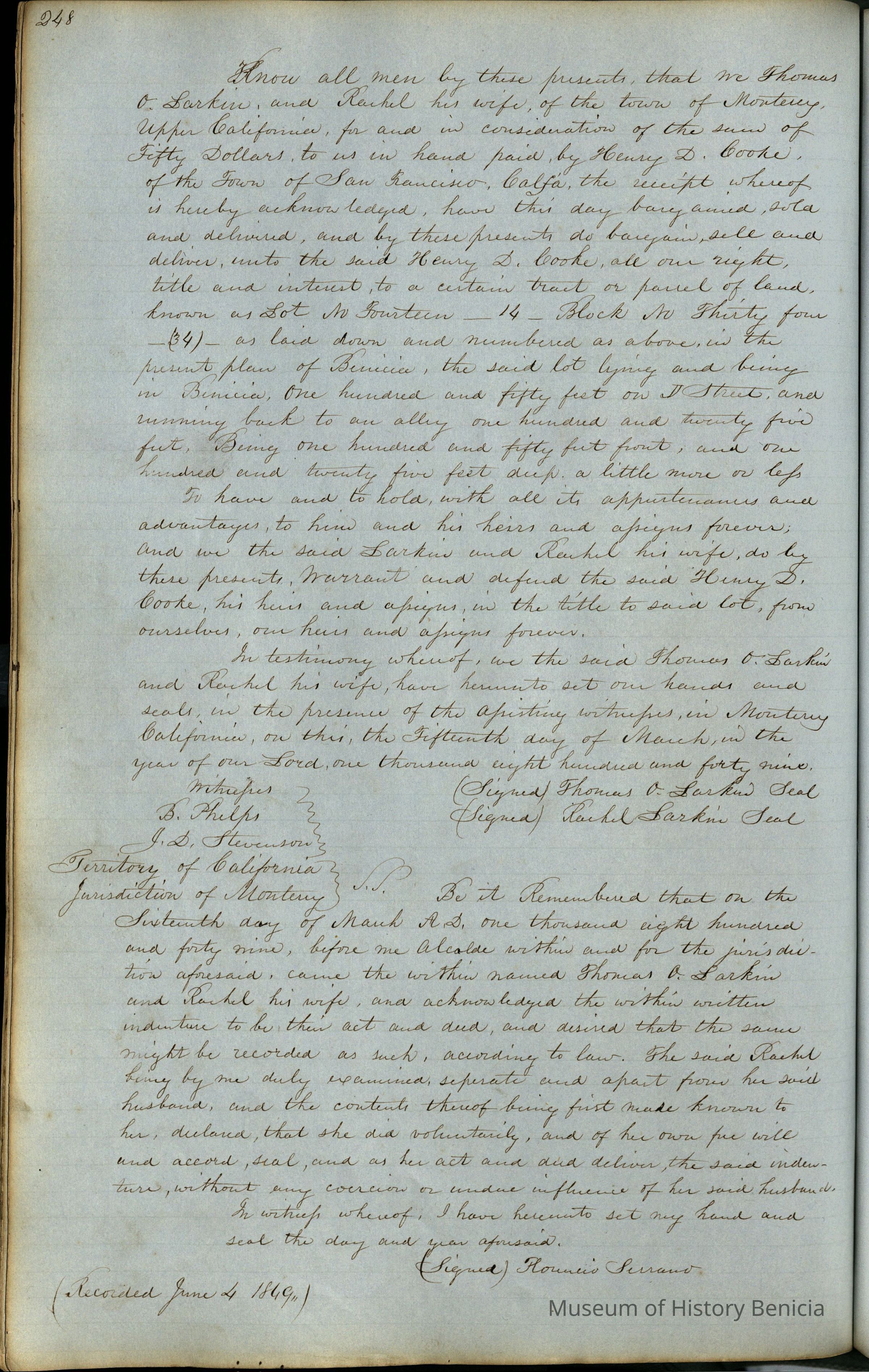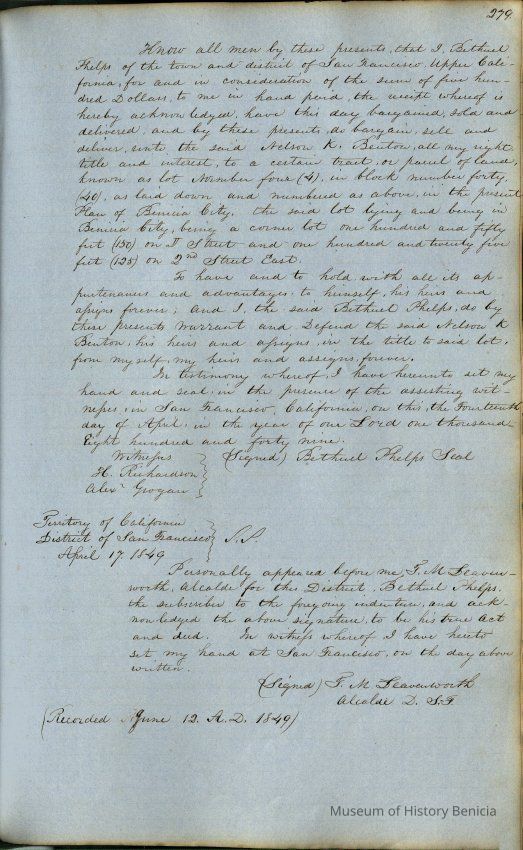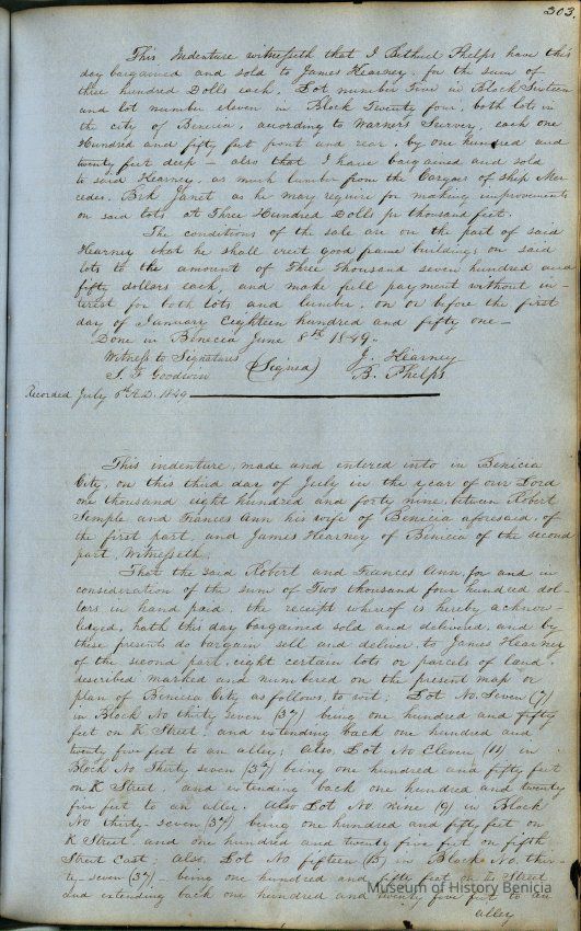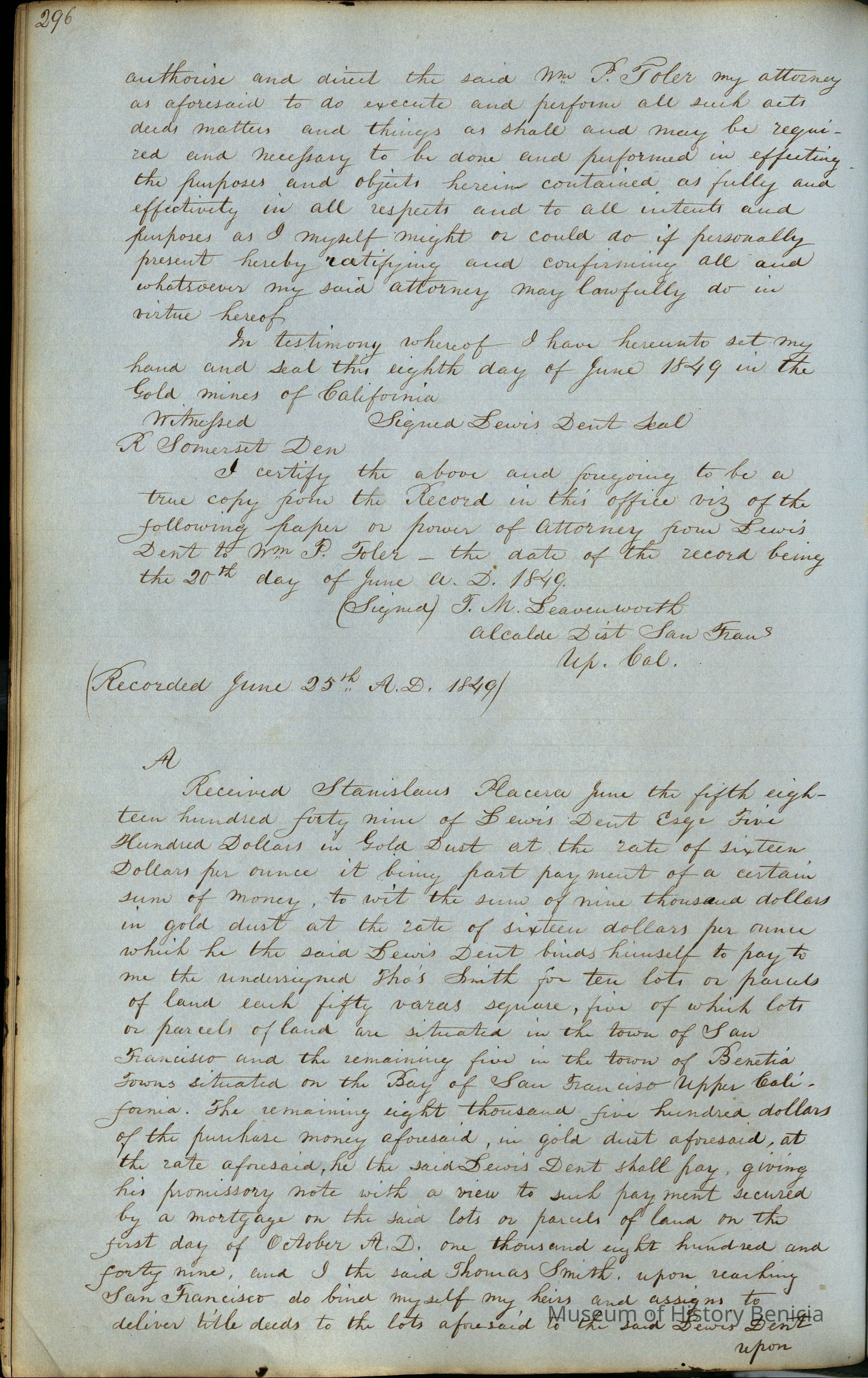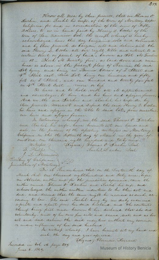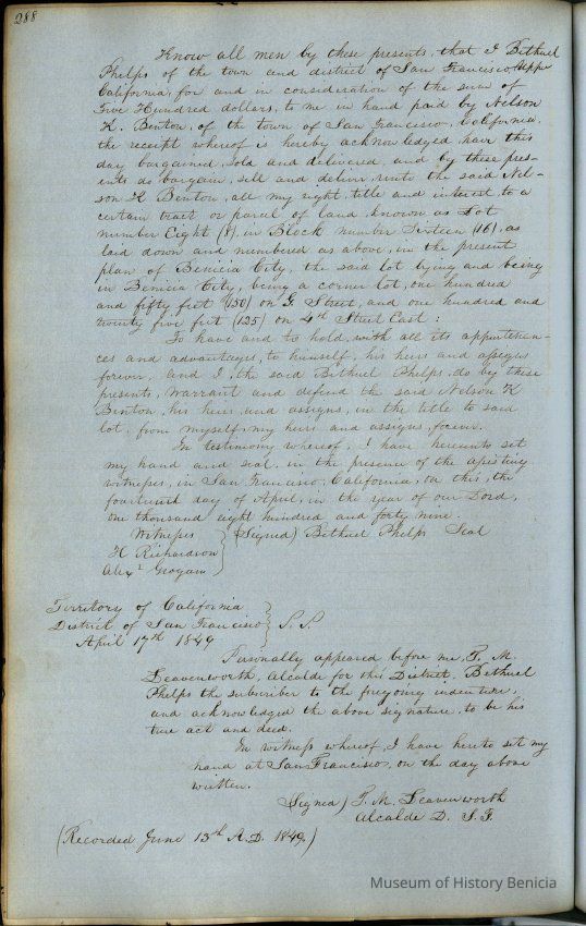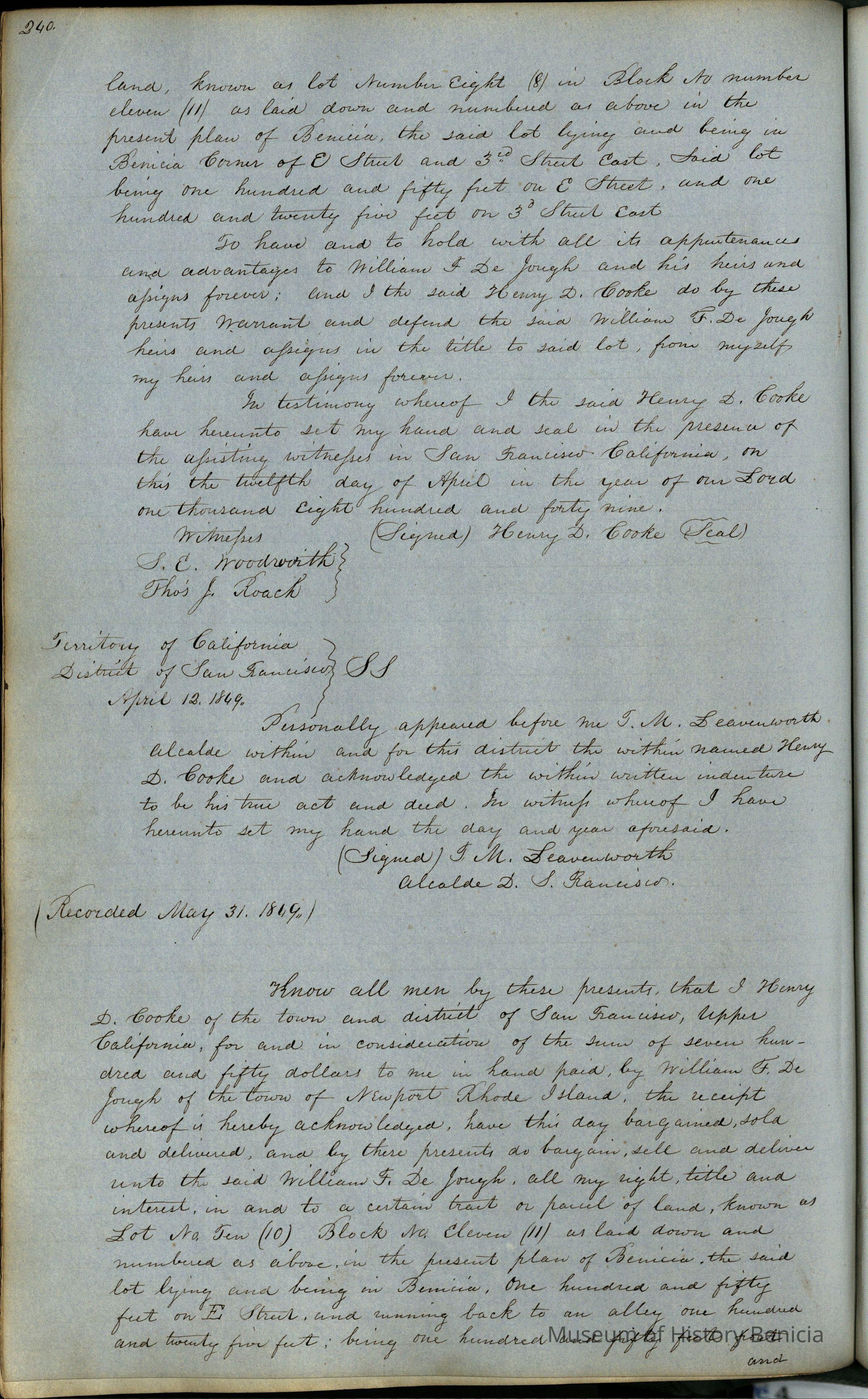 This journal/ledger contains the beginnings of Benicia including: lists and descriptions of first 12 houses in Benicia, a translation of the deed to General Vallejo by Manual Micheltorena, Governor of Calif. (1844); deed to Semple and Larkin by Vallejo (1847); deeds of properties sold by Semple and Larkin from 1847 - 1849
