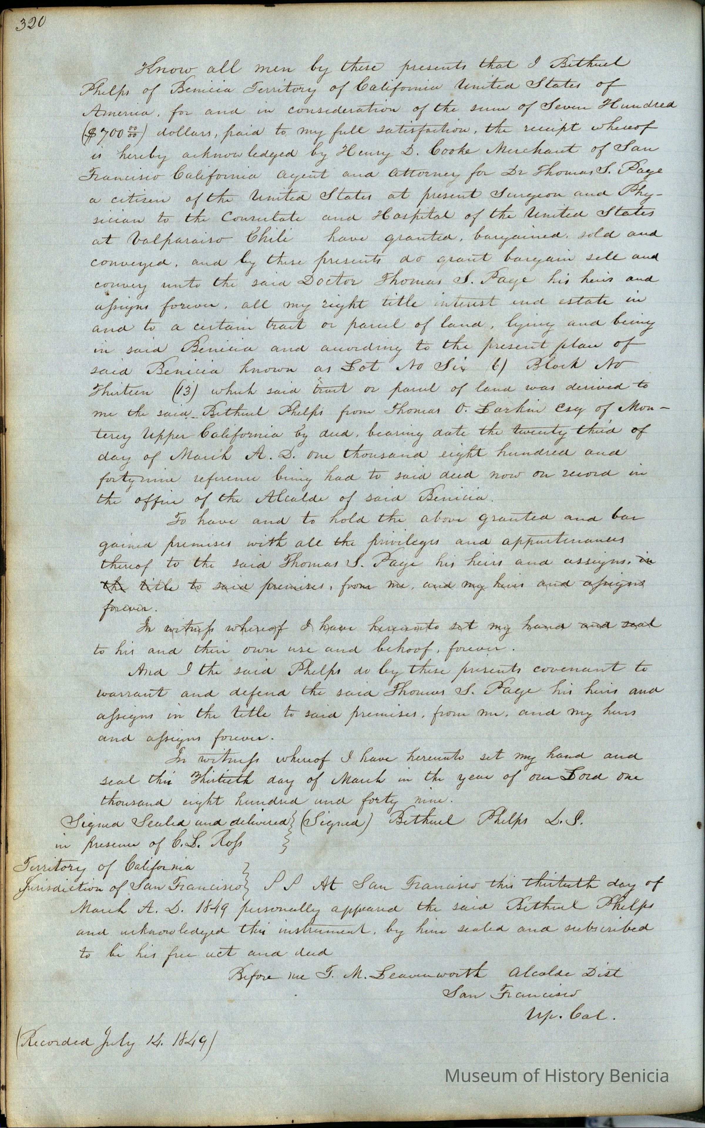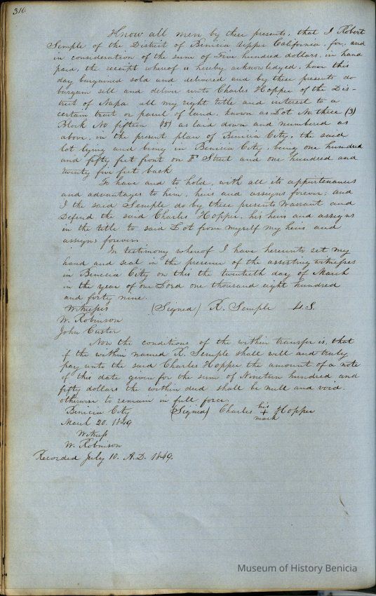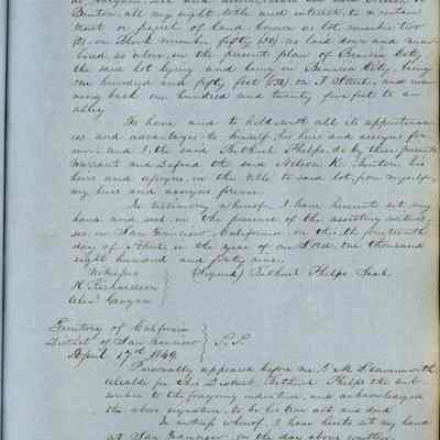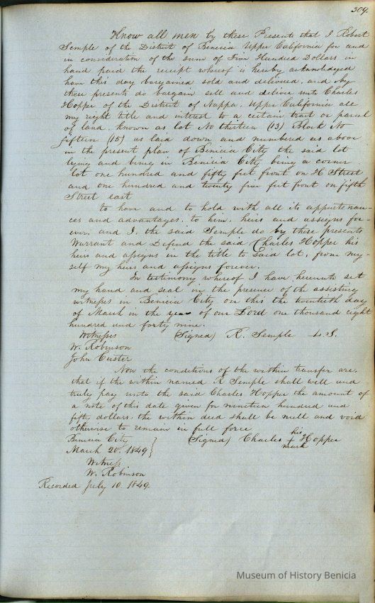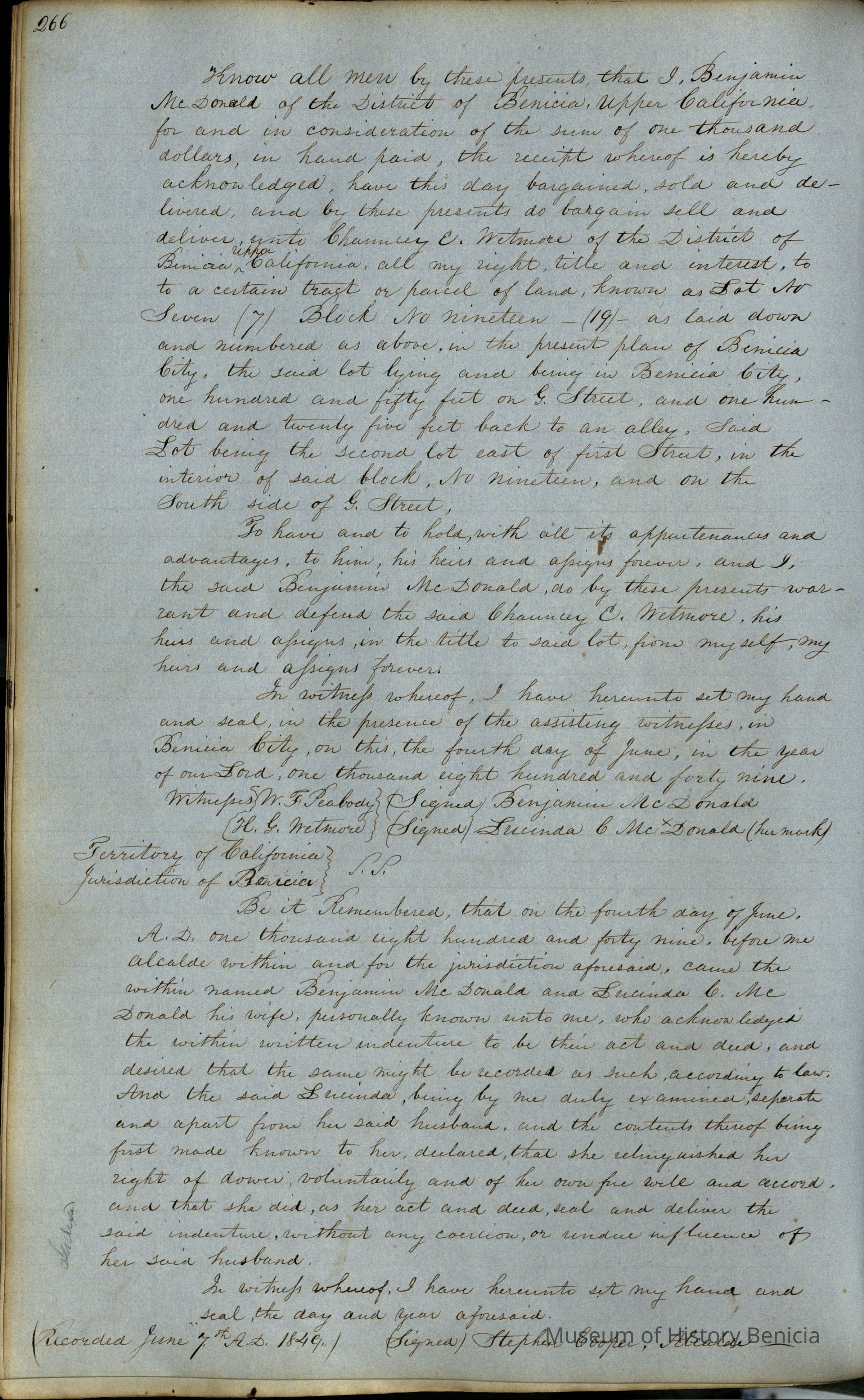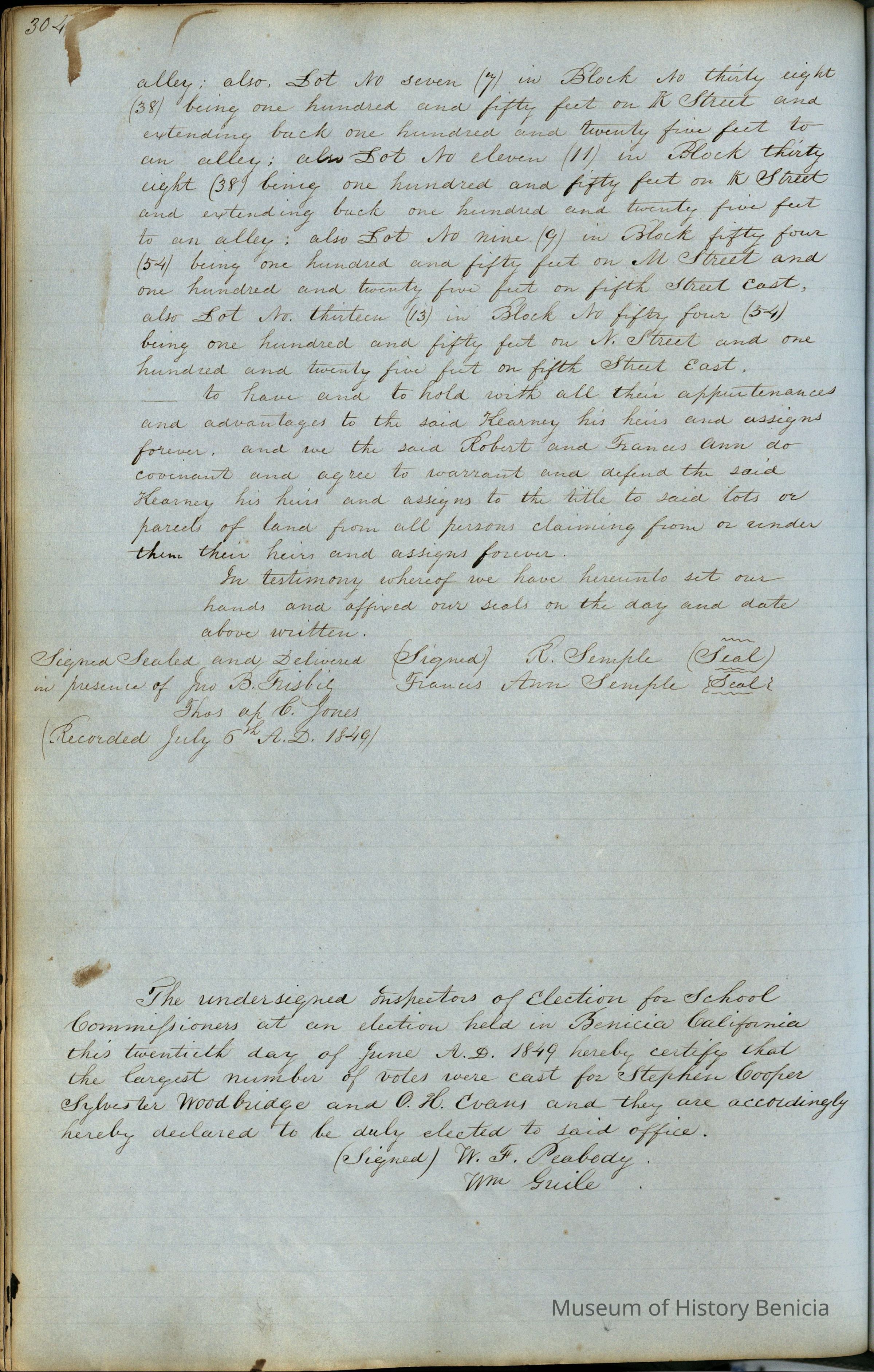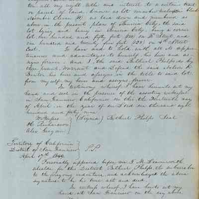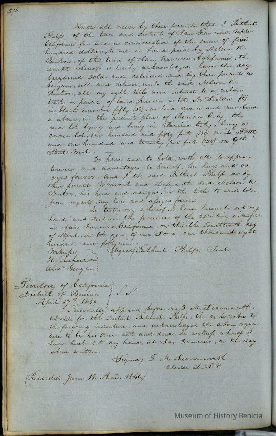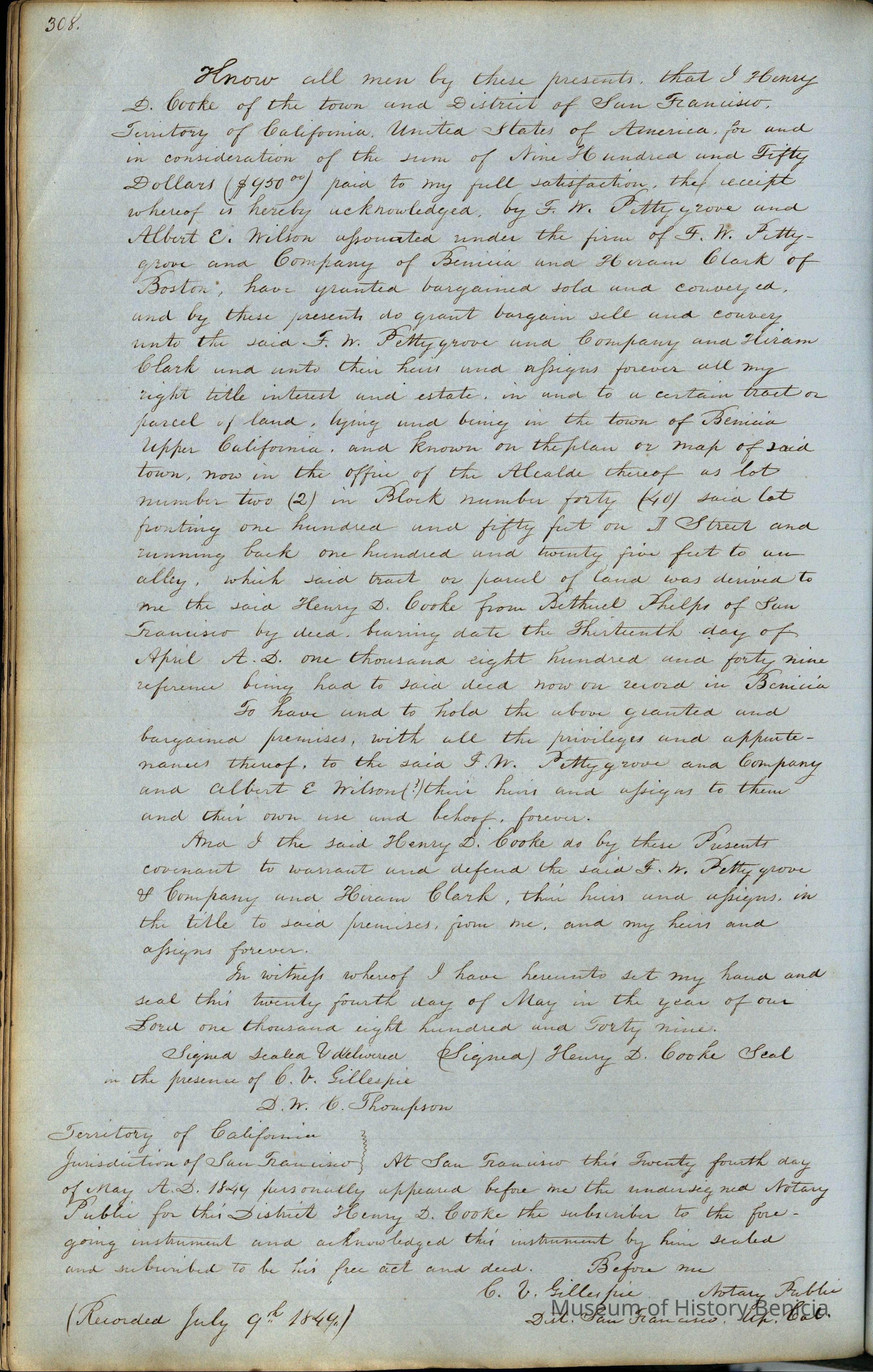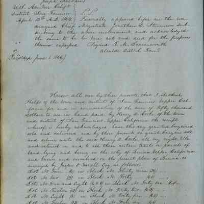 This journal/ledger contains the beginnings of Benicia including: lists and descriptions of first 12 houses in Benicia, a translation of the deed to General Vallejo by Manual Micheltorena, Governor of Calif. (1844); deed to Semple and Larkin by Vallejo (1847); deeds of properties sold by Semple and Larkin from 1847 - 1849