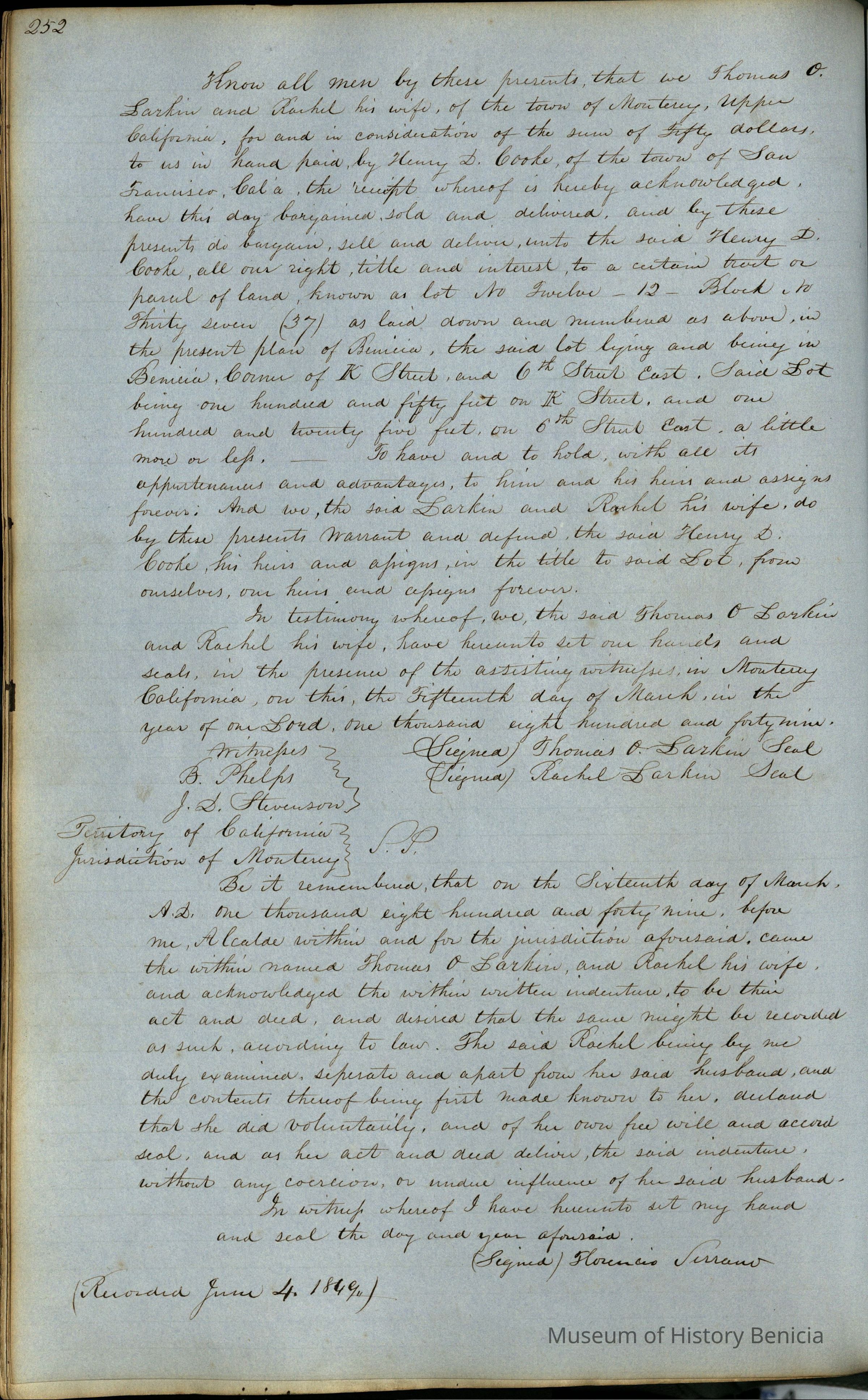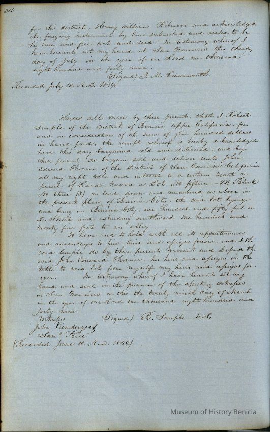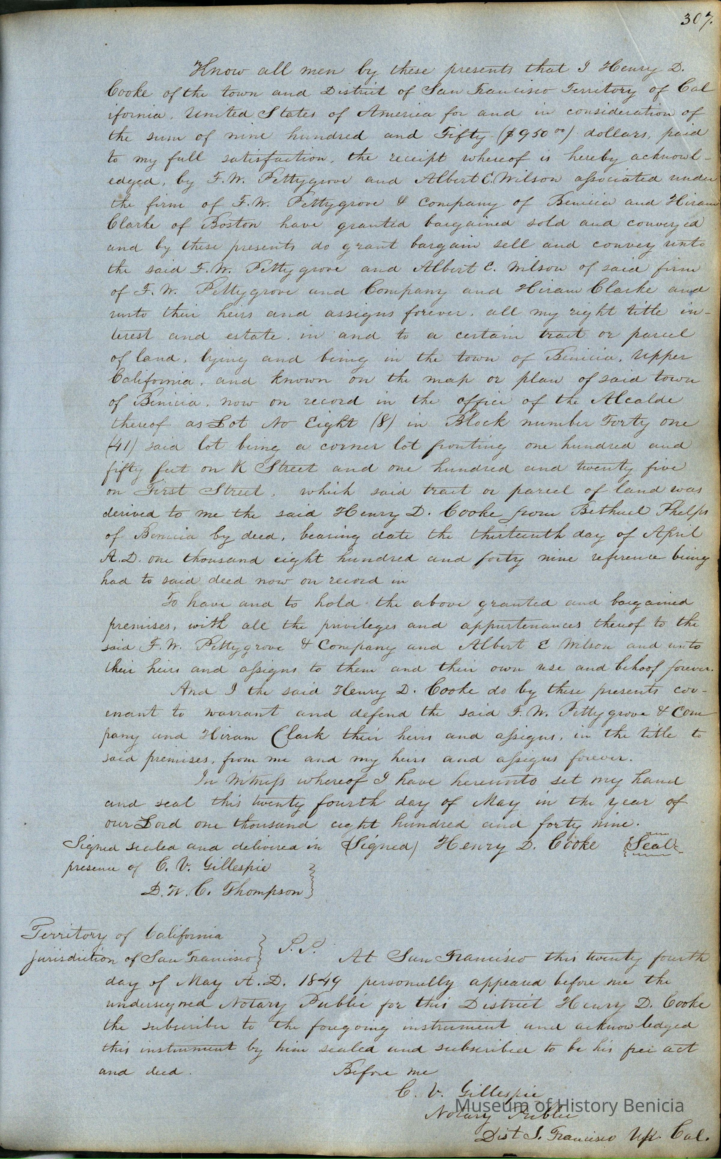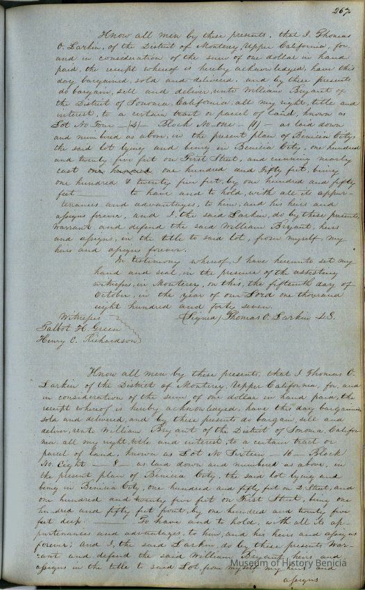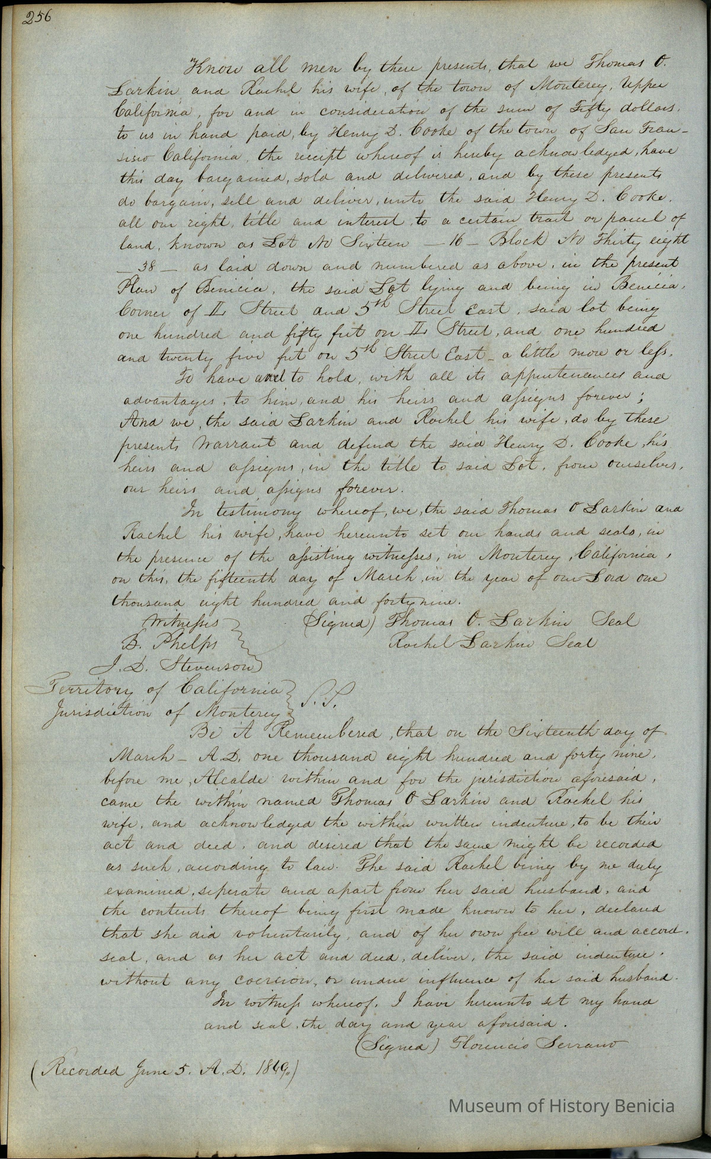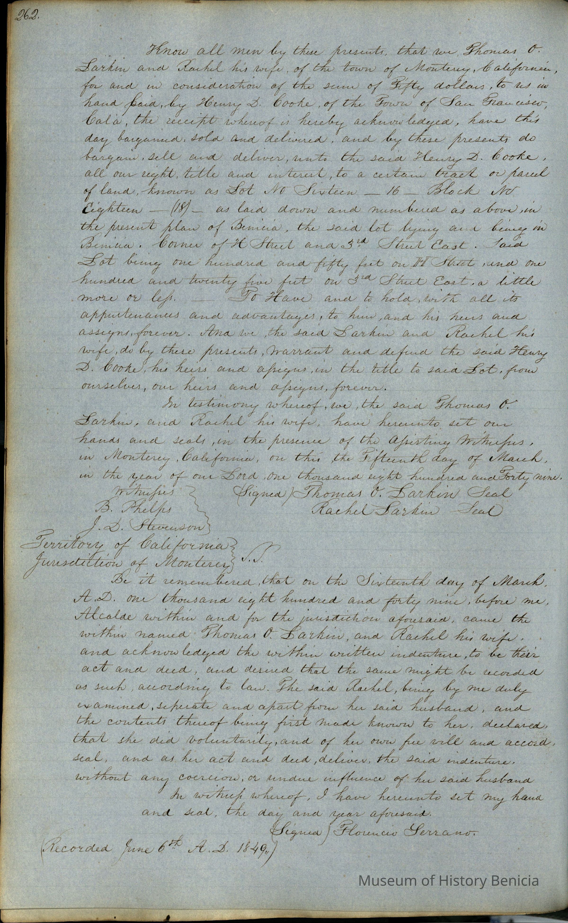 This journal/ledger contains the beginnings of Benicia including: lists and descriptions of first 12 houses in Benicia, a translation of the deed to General Vallejo by Manual Micheltorena, Governor of Calif. (1844); deed to Semple and Larkin by Vallejo (1847); deeds of properties sold by Semple and Larkin from 1847 - 1849