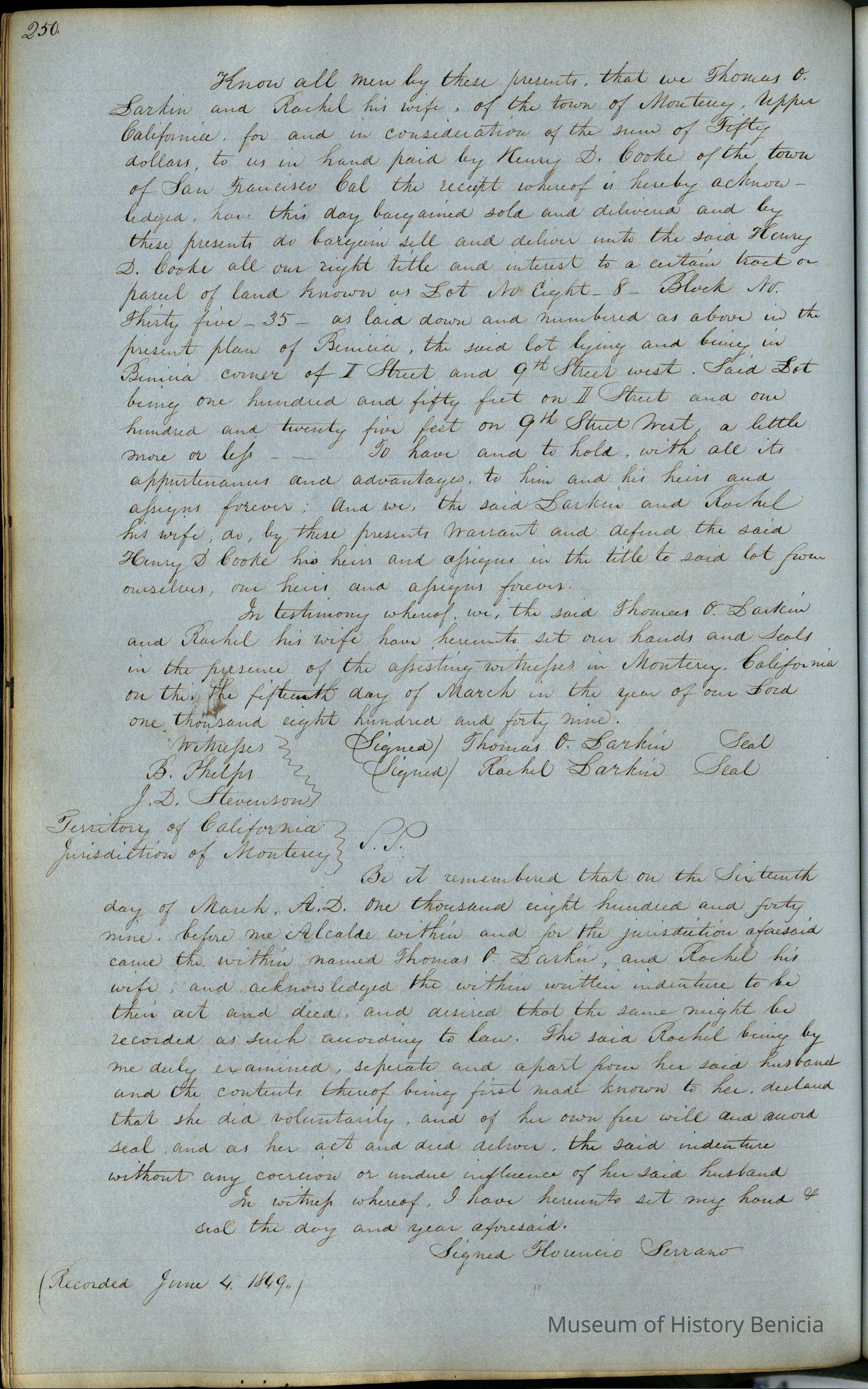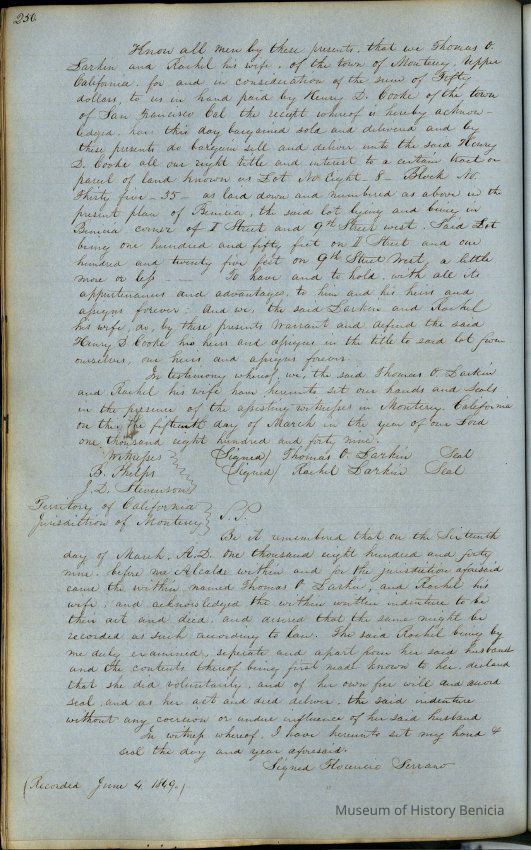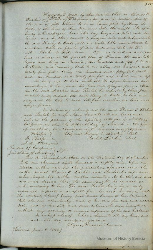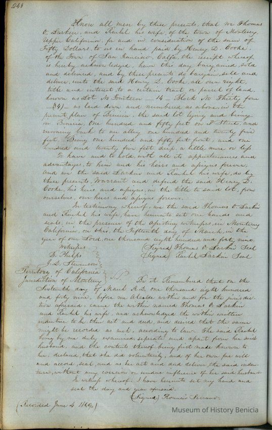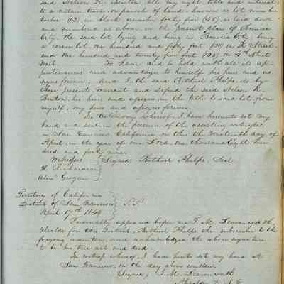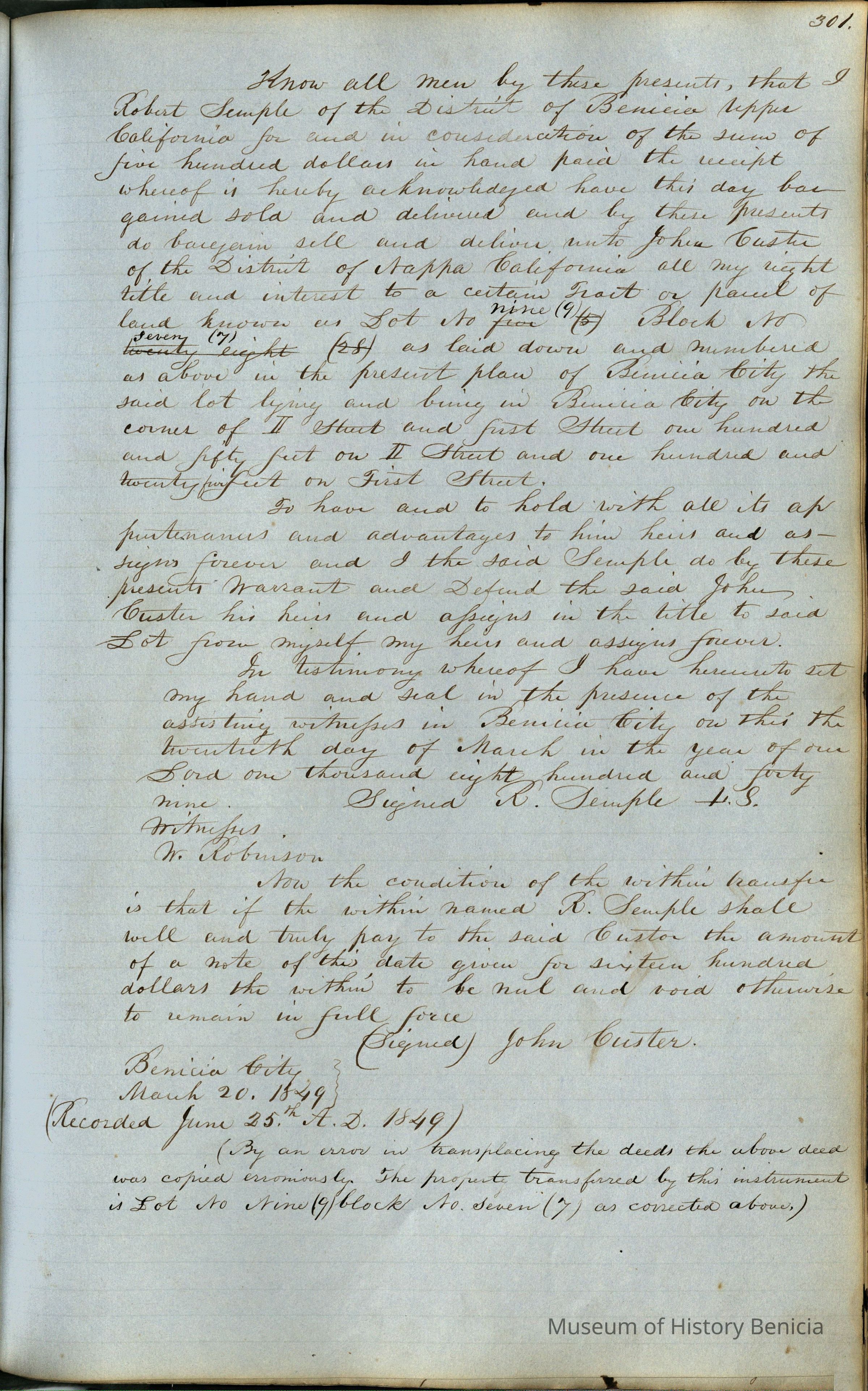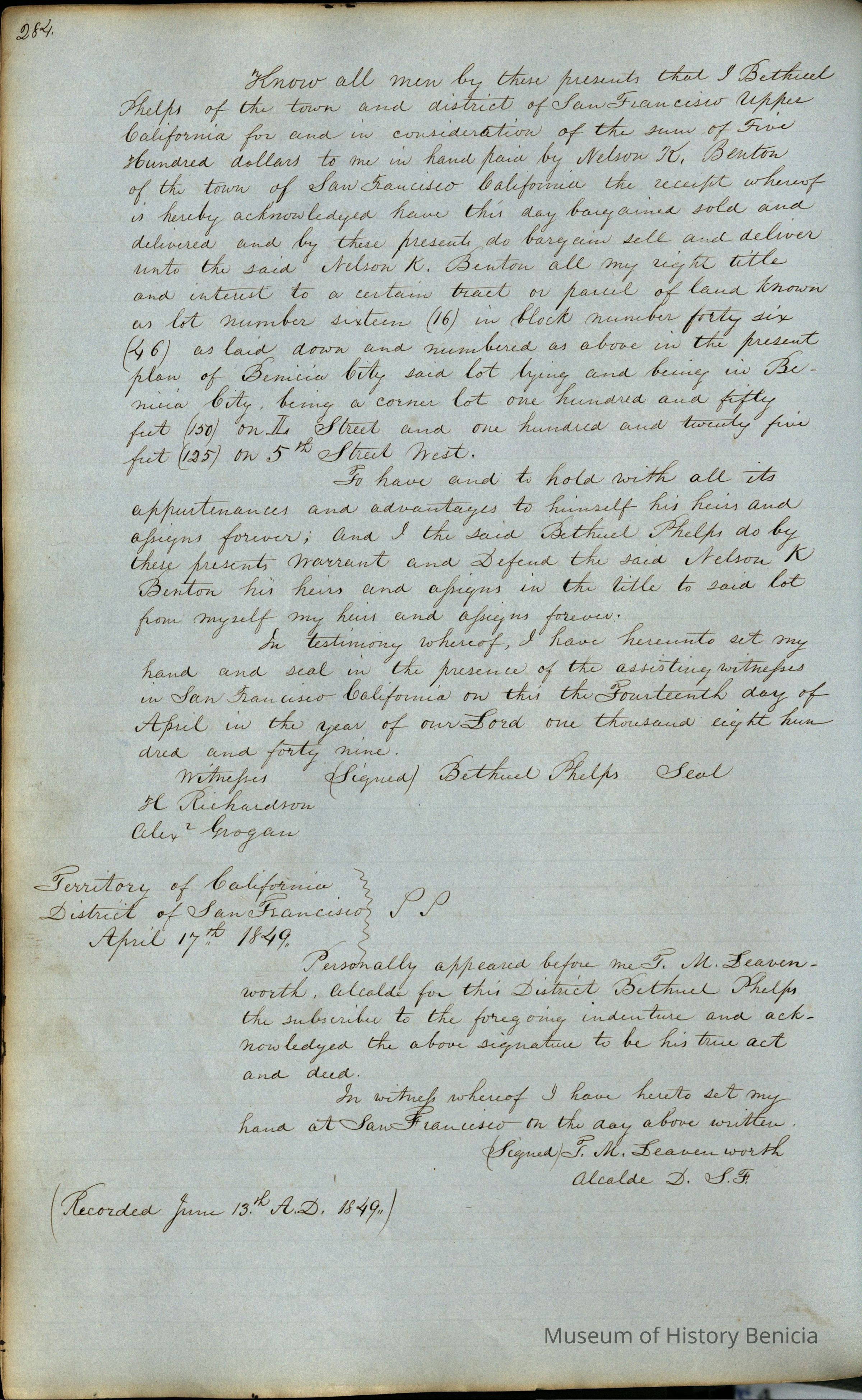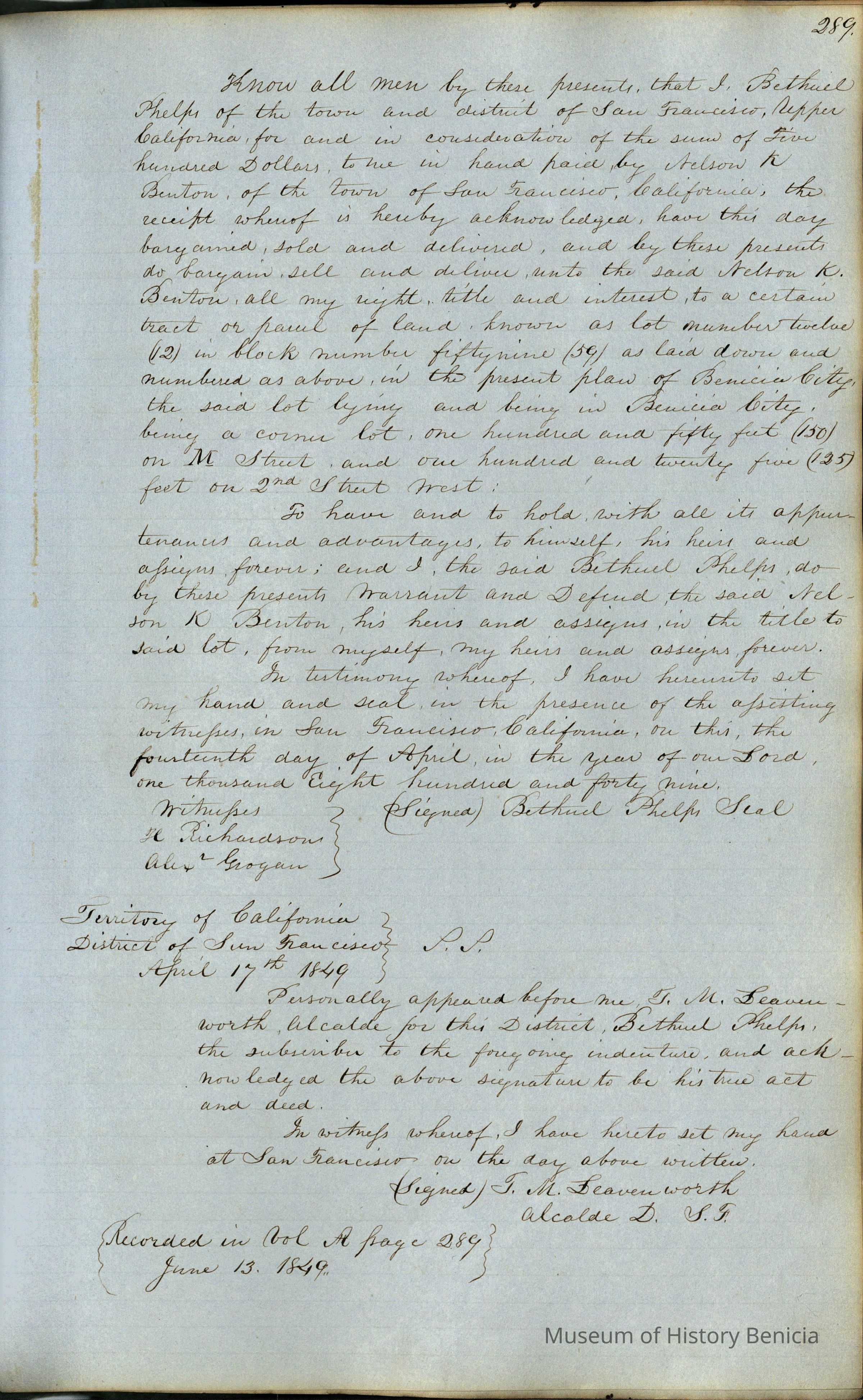 This journal/ledger contains the beginnings of Benicia including: lists and descriptions of first 12 houses in Benicia, a translation of the deed to General Vallejo by Manual Micheltorena, Governor of Calif. (1844); deed to Semple and Larkin by Vallejo (1847); deeds of properties sold by Semple and Larkin from 1847 - 1849