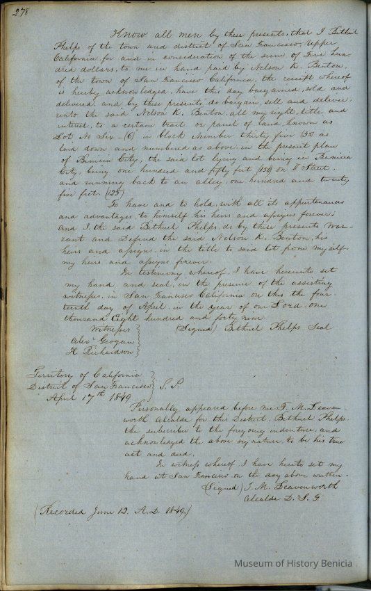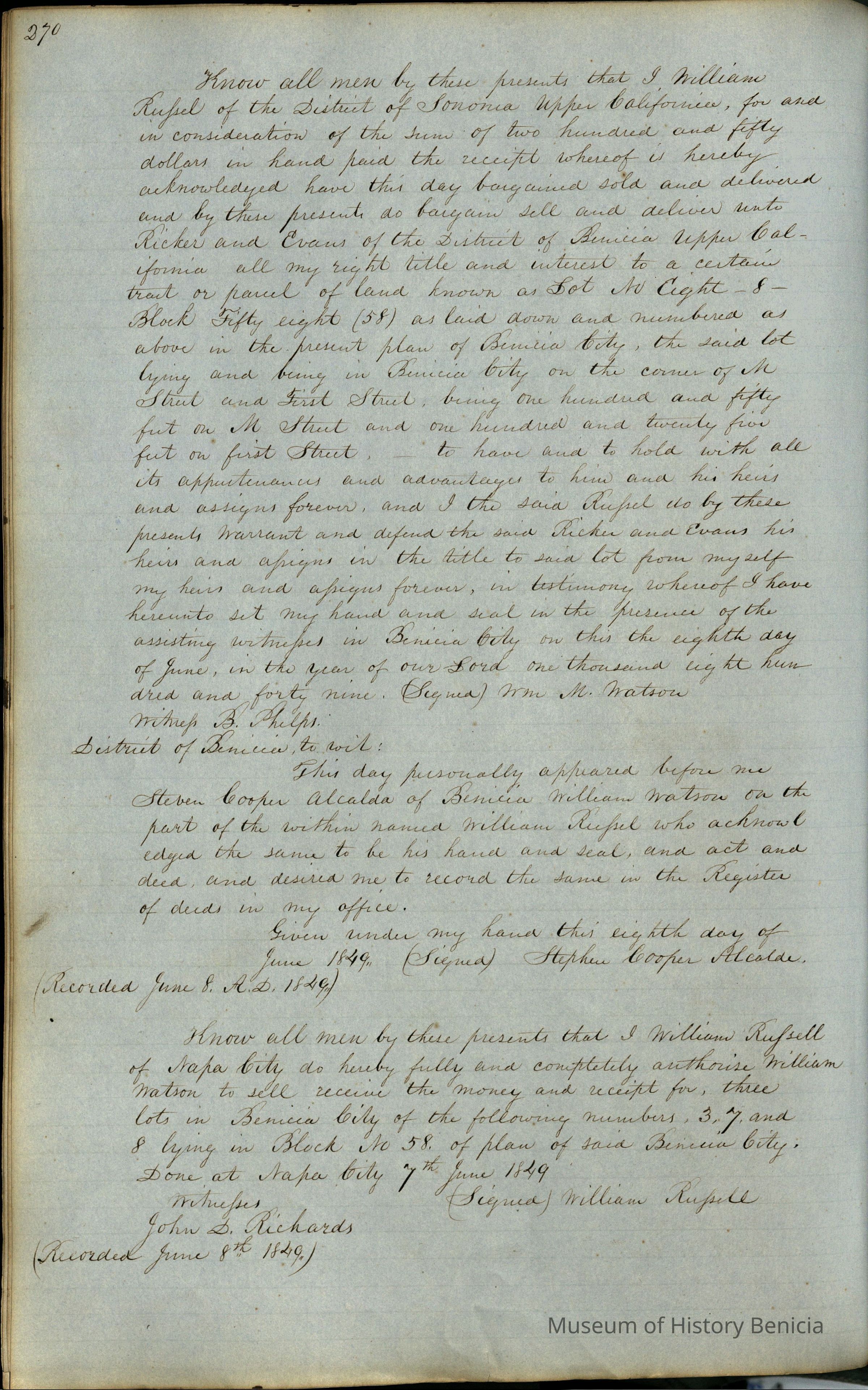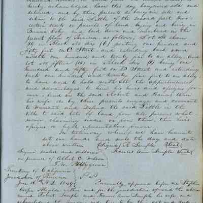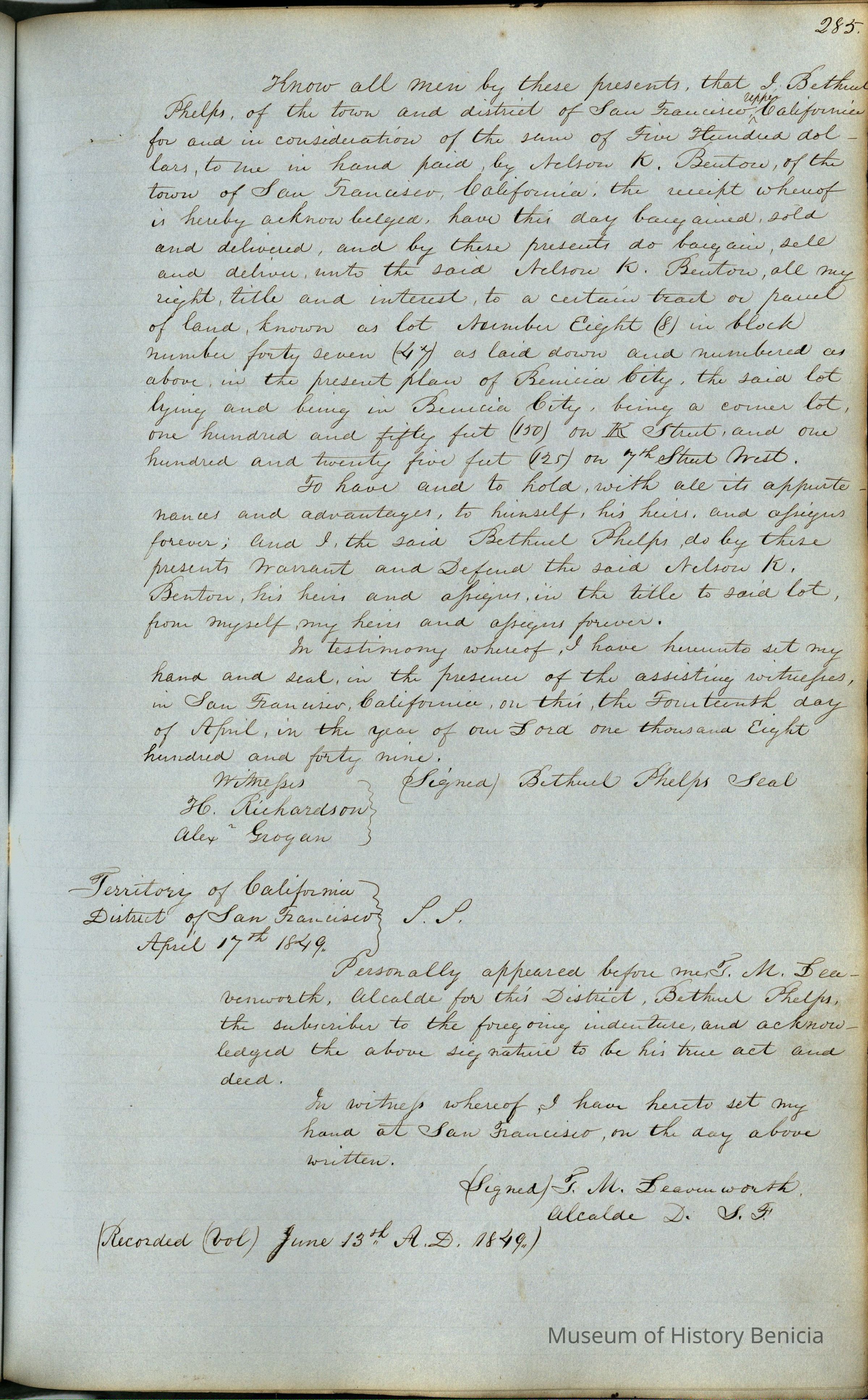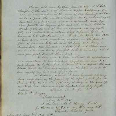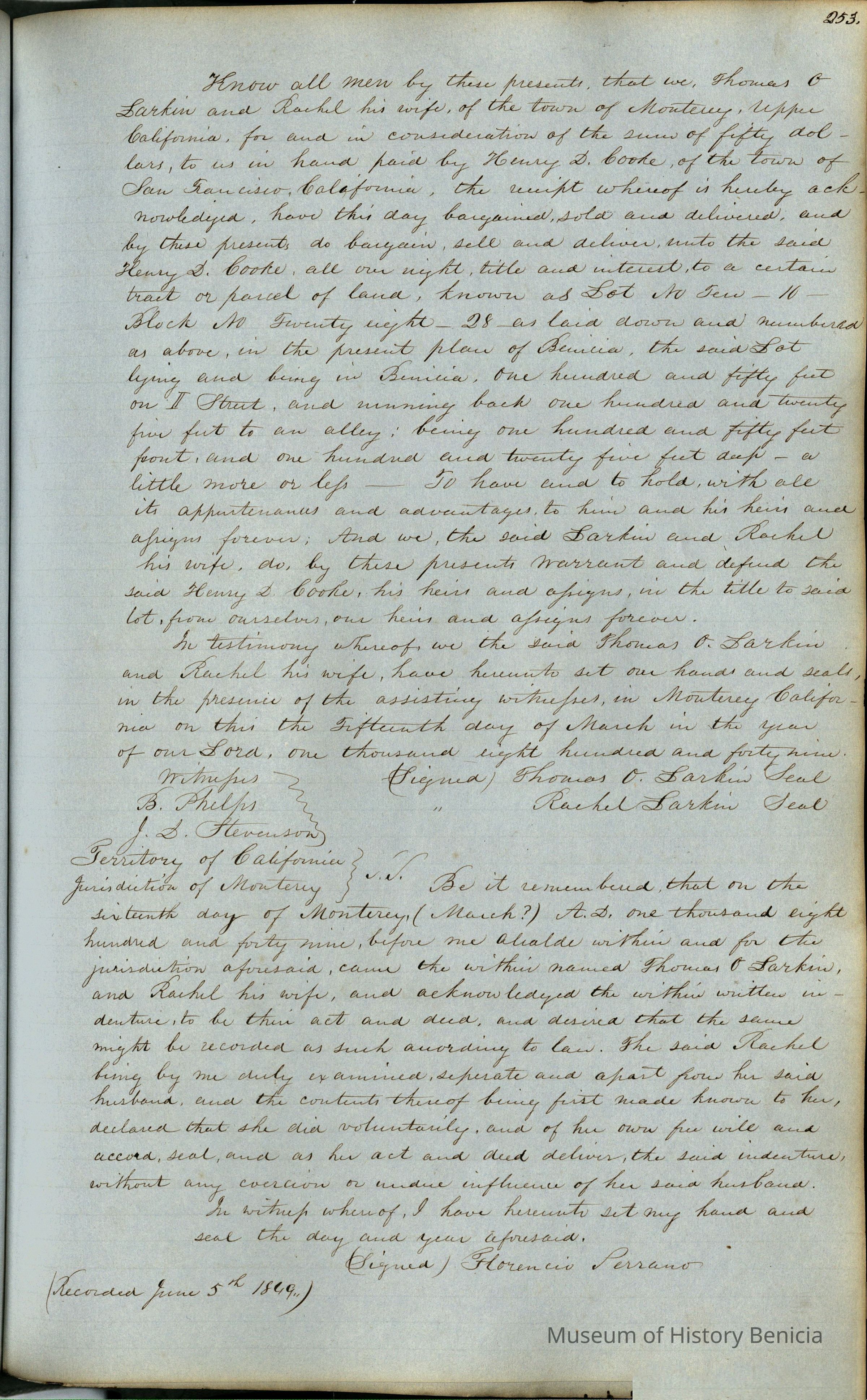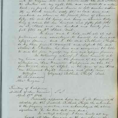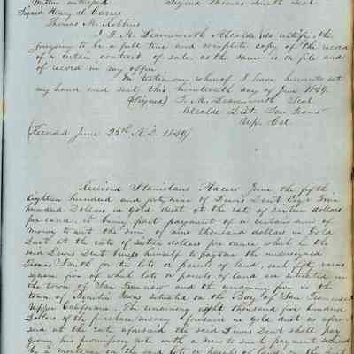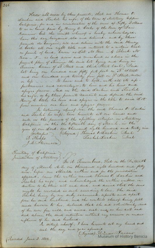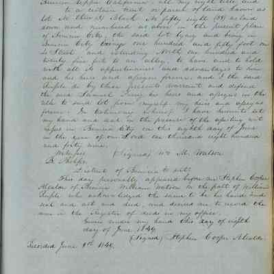 This journal/ledger contains the beginnings of Benicia including: lists and descriptions of first 12 houses in Benicia, a translation of the deed to General Vallejo by Manual Micheltorena, Governor of Calif. (1844); deed to Semple and Larkin by Vallejo (1847); deeds of properties sold by Semple and Larkin from 1847 - 1849
