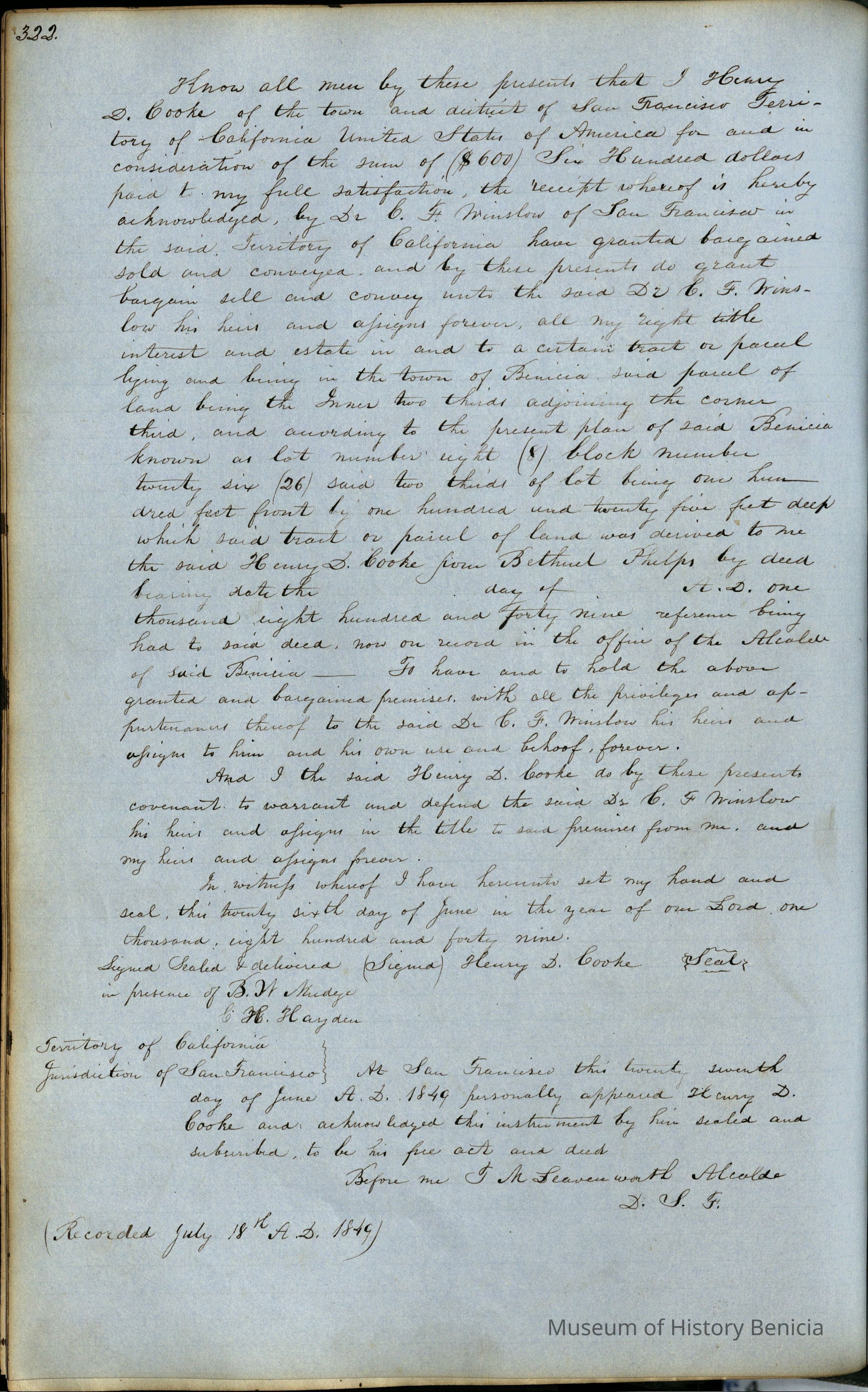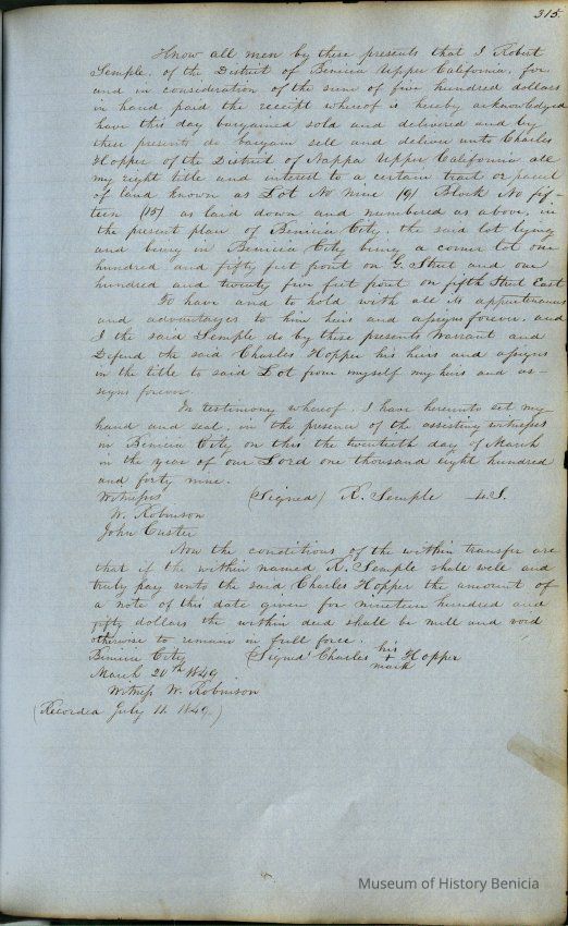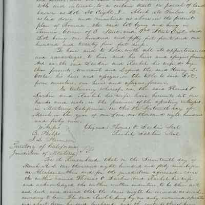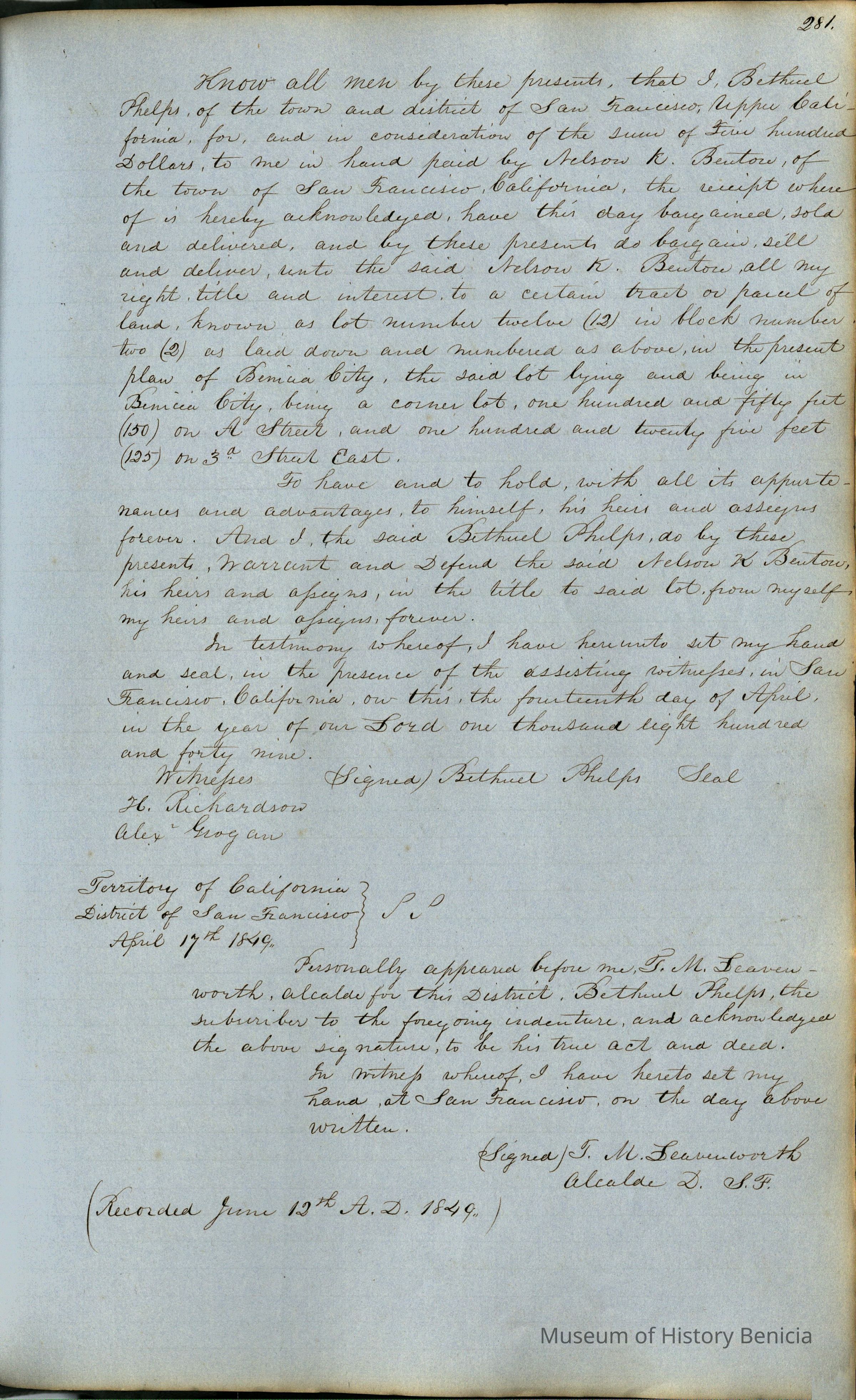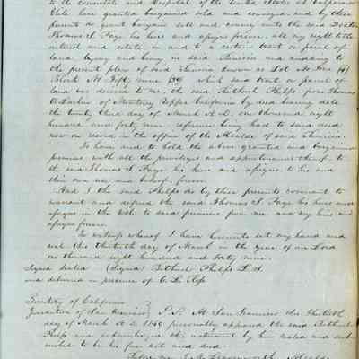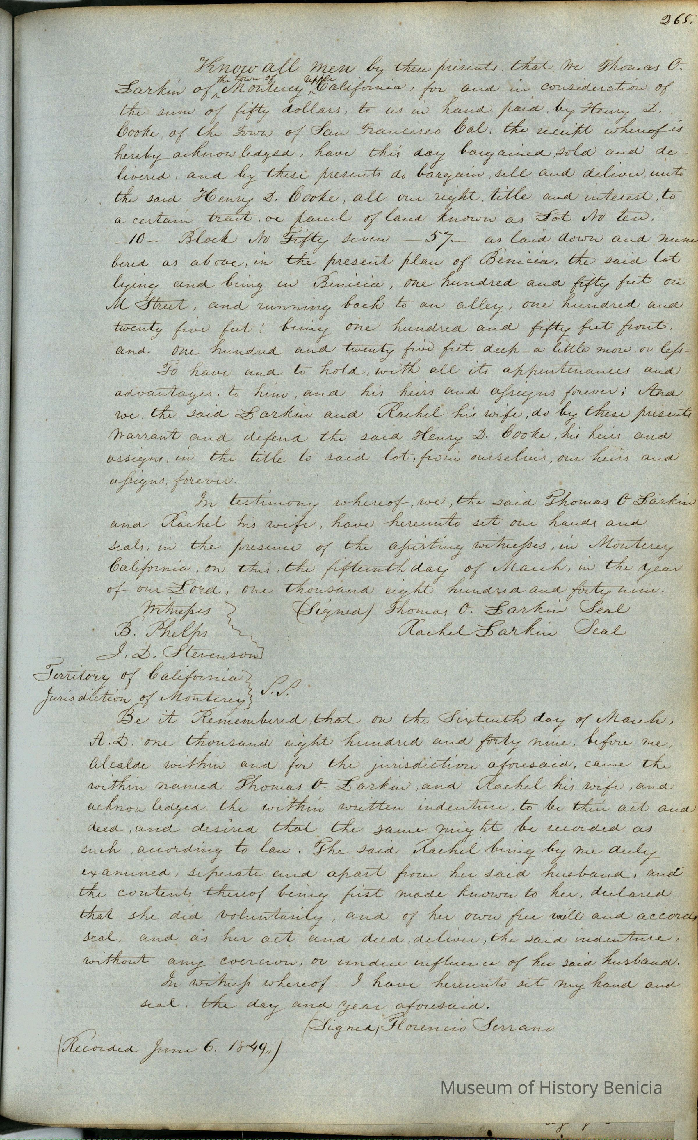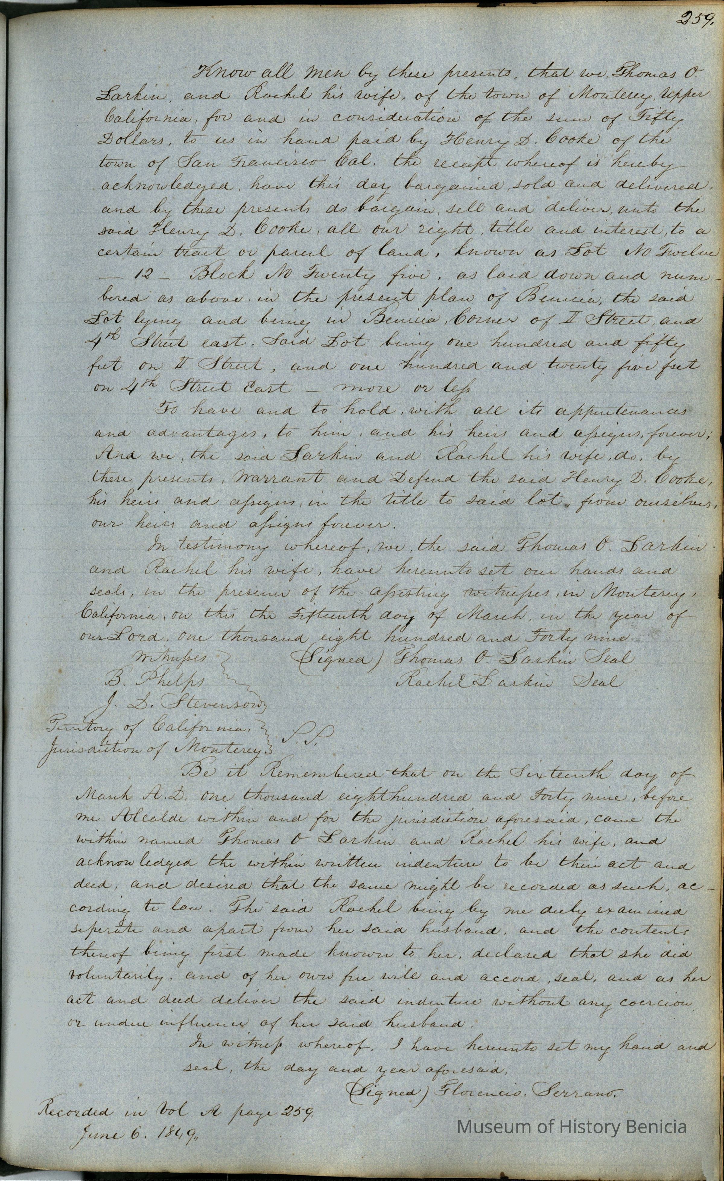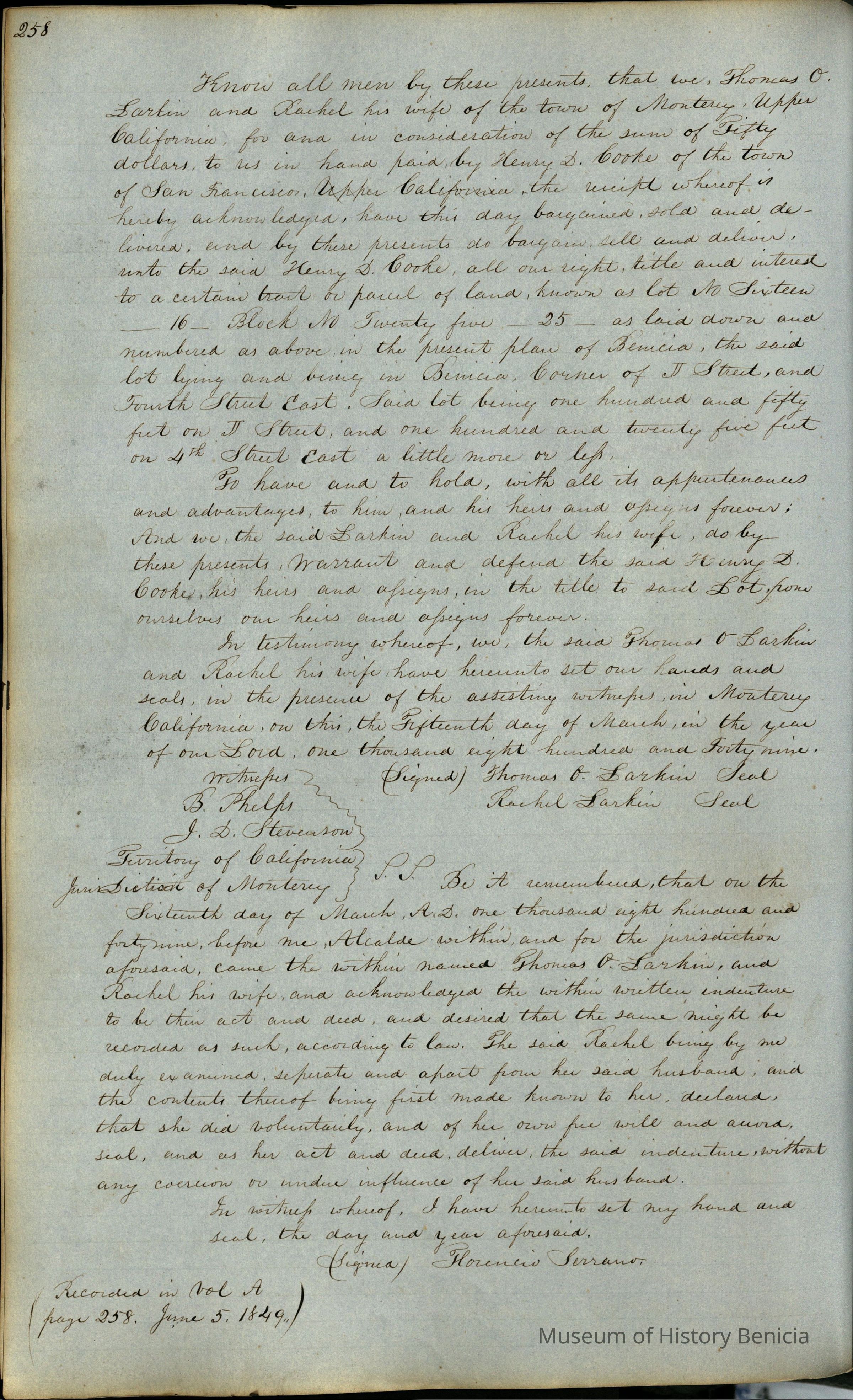 This journal/ledger contains the beginnings of Benicia including: lists and descriptions of first 12 houses in Benicia, a translation of the deed to General Vallejo by Manual Micheltorena, Governor of Calif. (1844); deed to Semple and Larkin by Vallejo (1847); deeds of properties sold by Semple and Larkin from 1847 - 1849