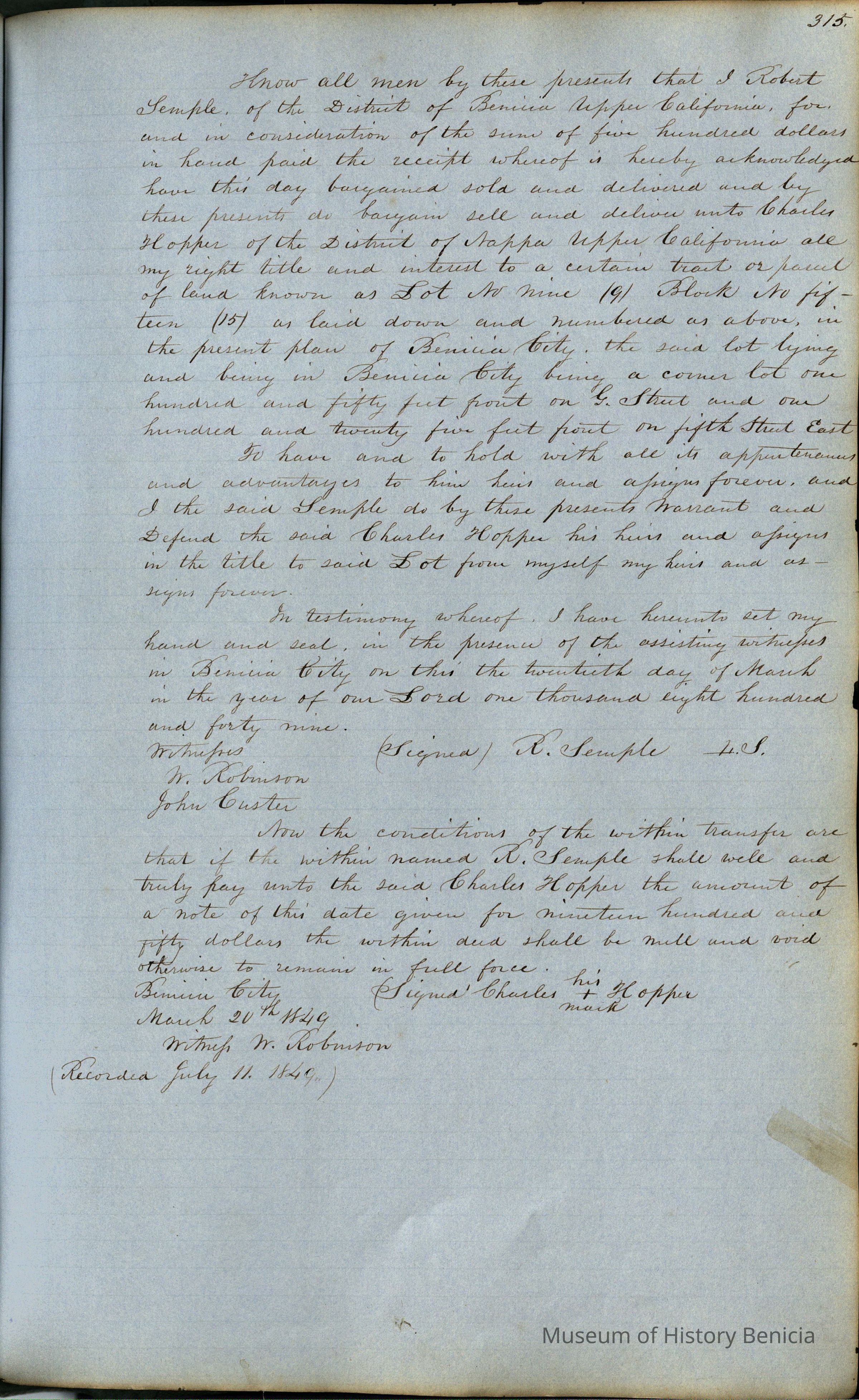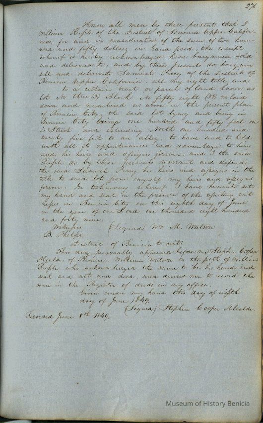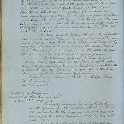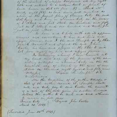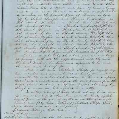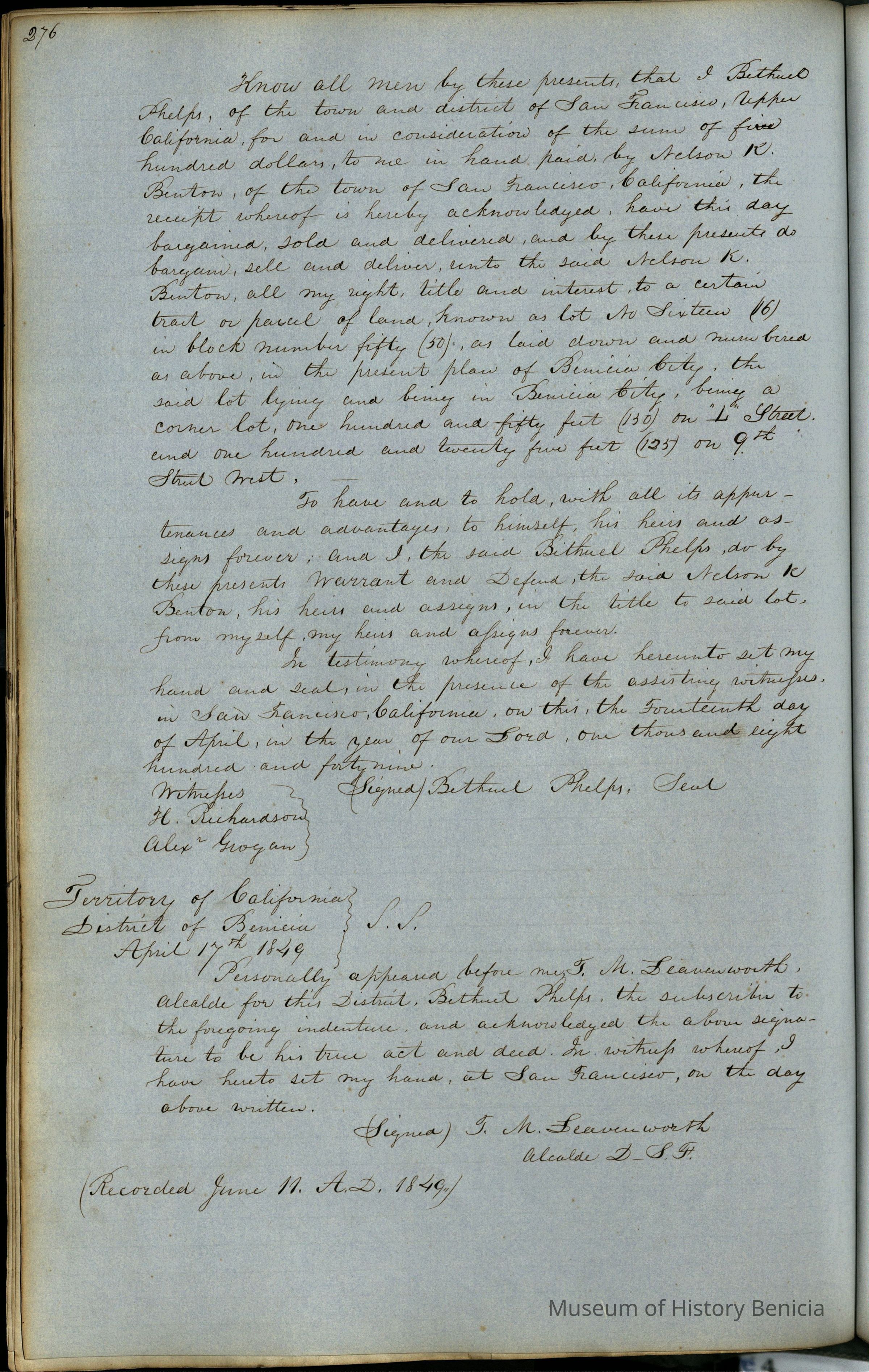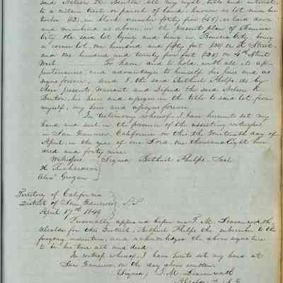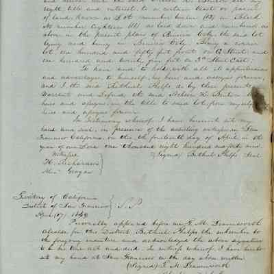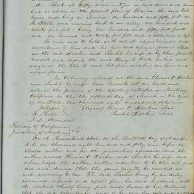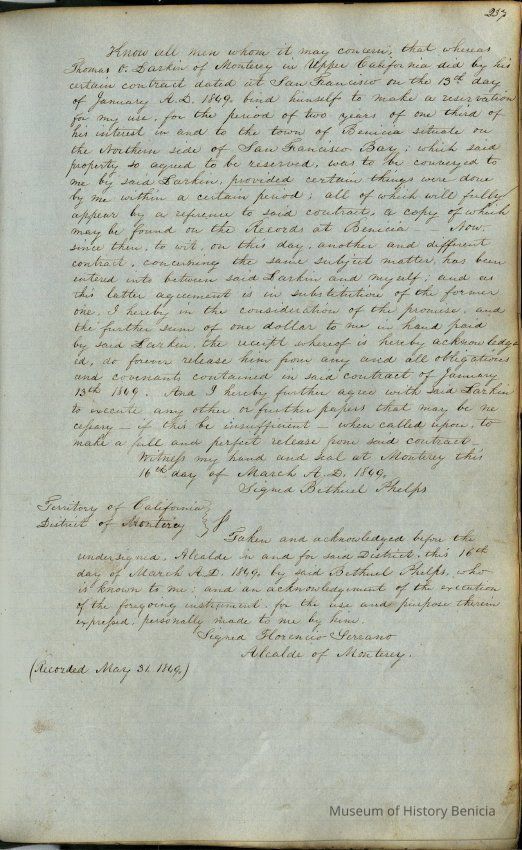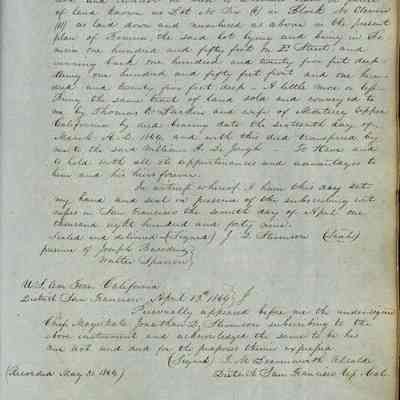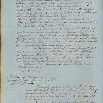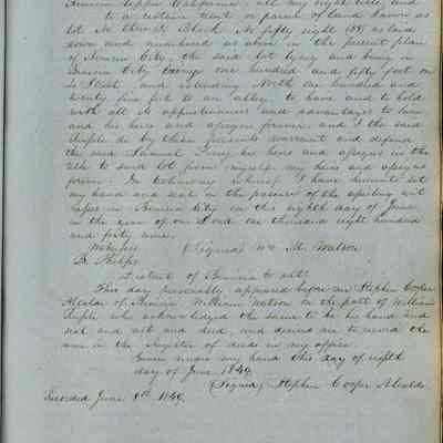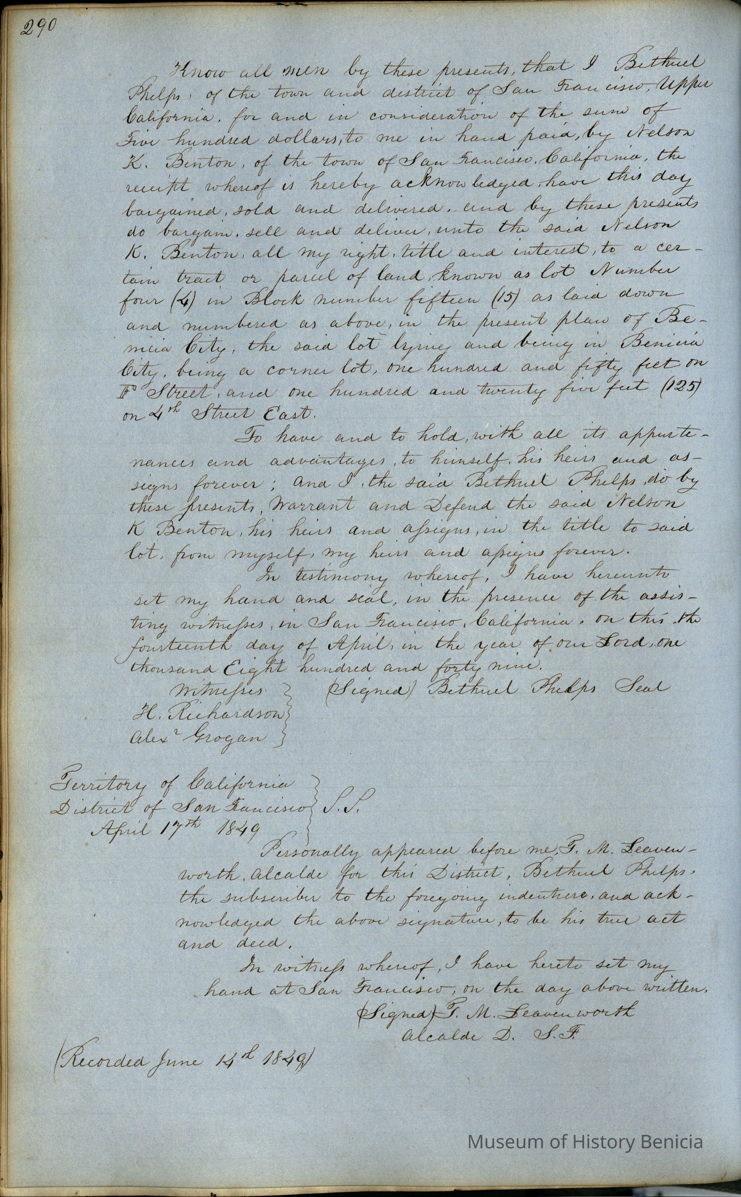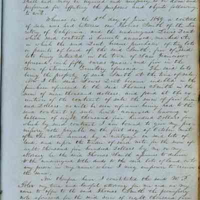 This journal/ledger contains the beginnings of Benicia including: lists and descriptions of first 12 houses in Benicia, a translation of the deed to General Vallejo by Manual Micheltorena, Governor of Calif. (1844); deed to Semple and Larkin by Vallejo (1847); deeds of properties sold by Semple and Larkin from 1847 - 1849
