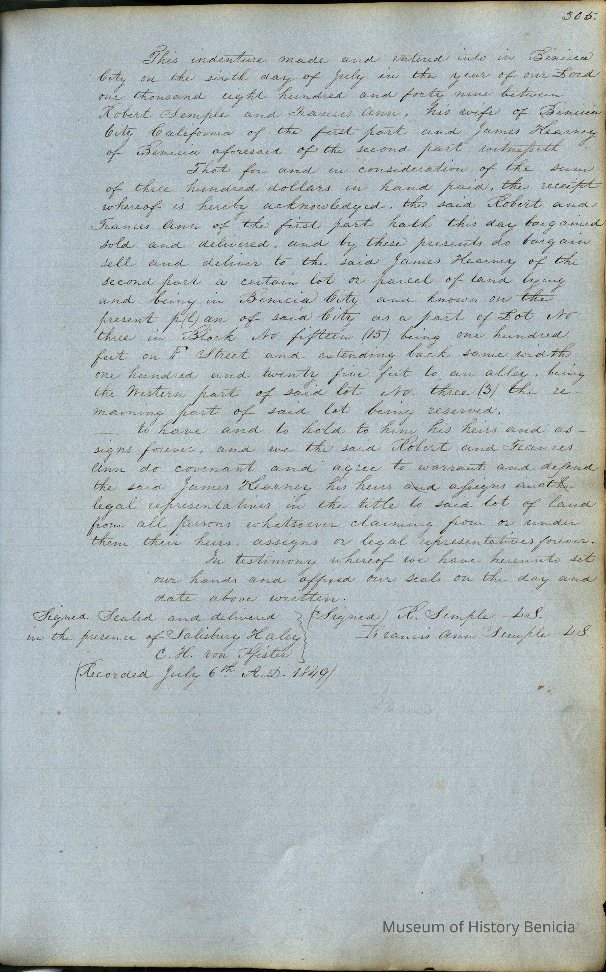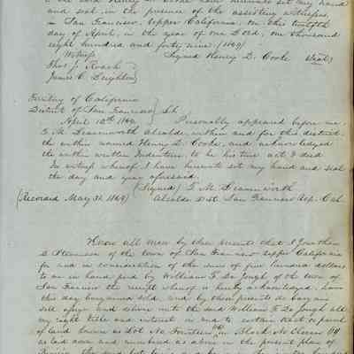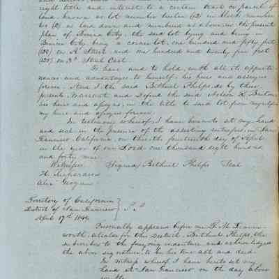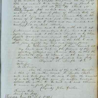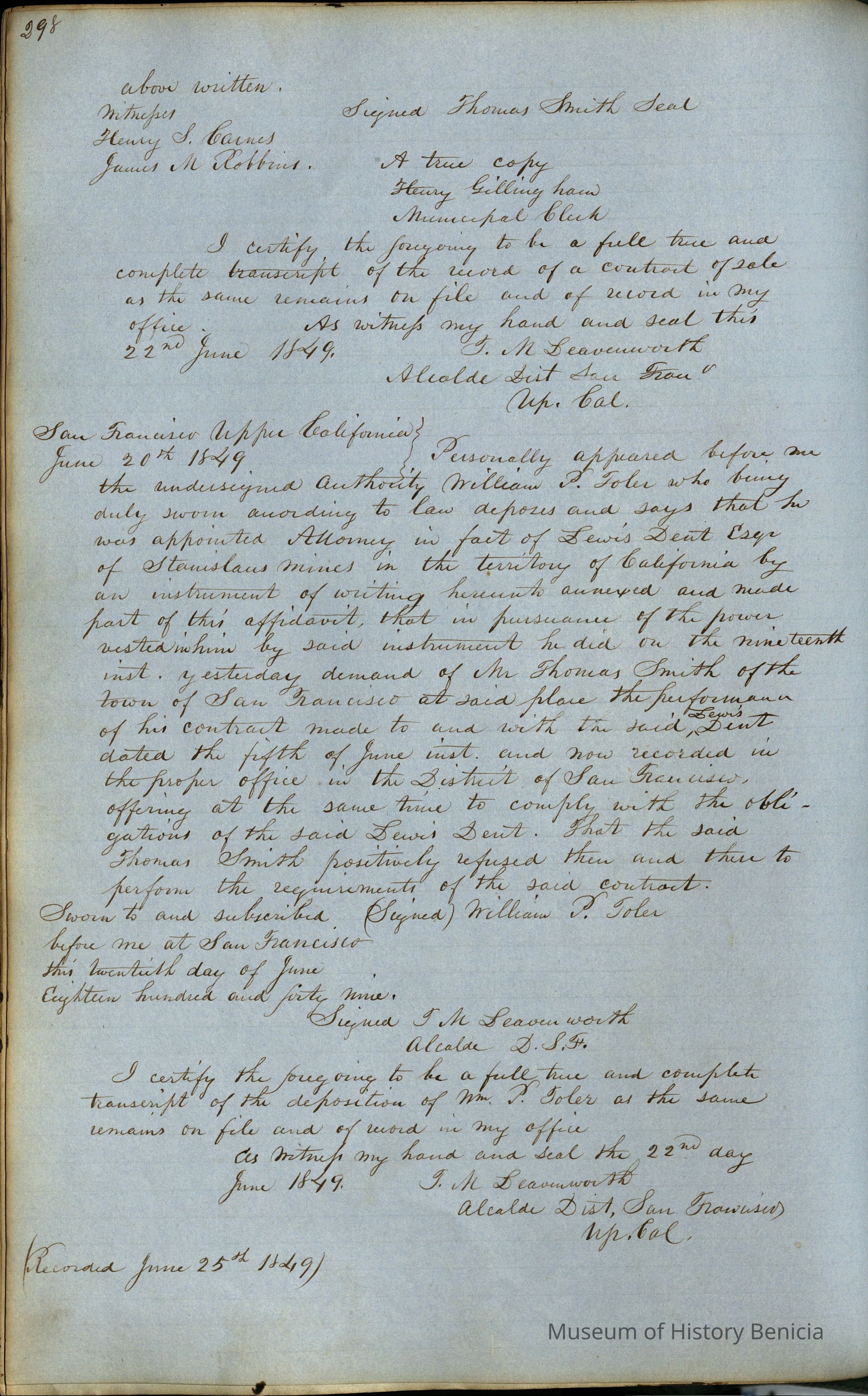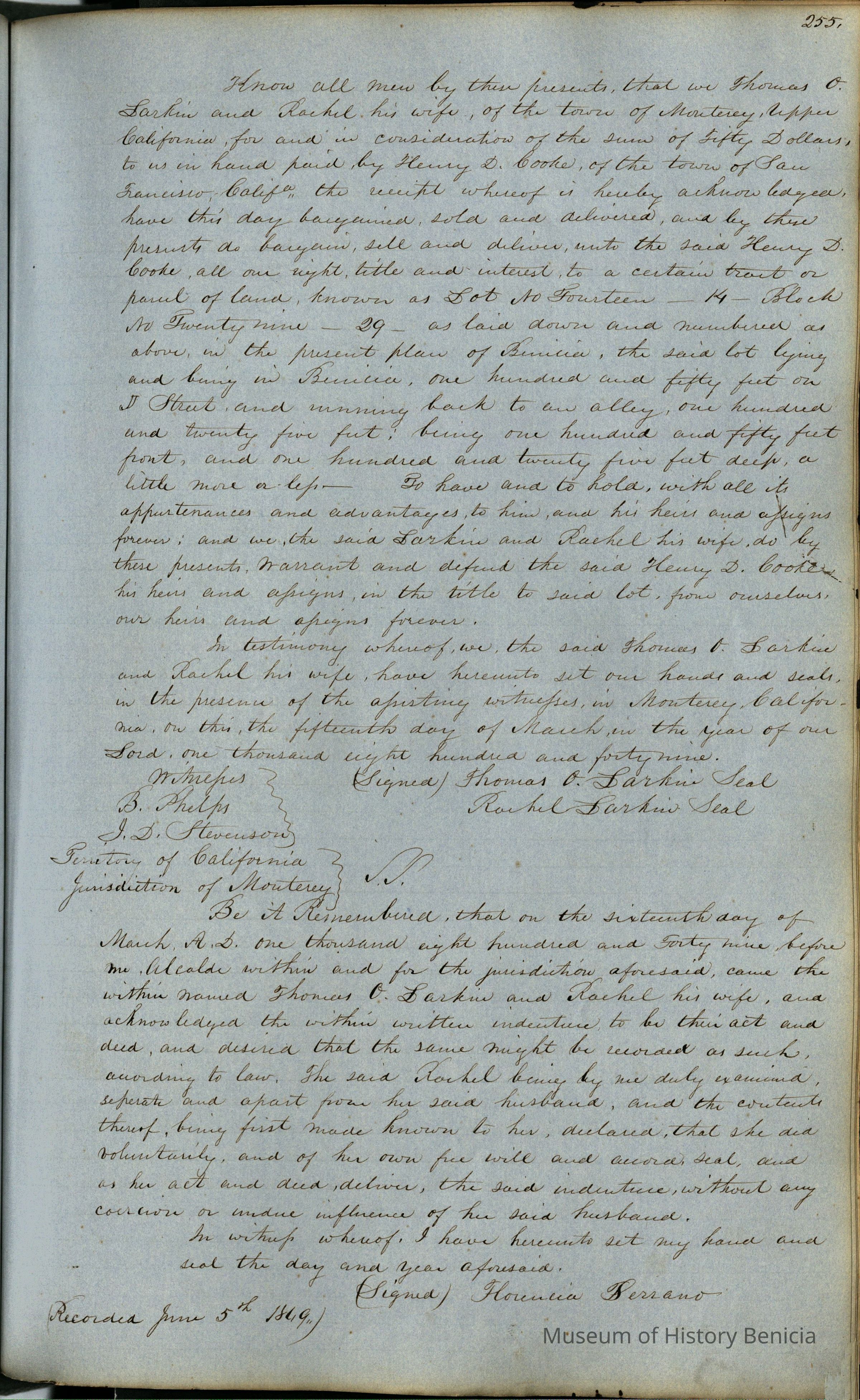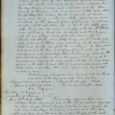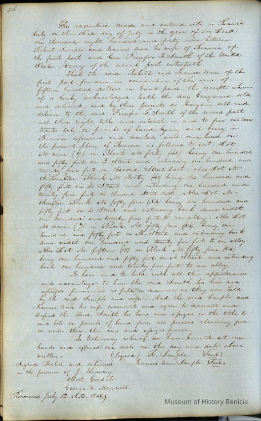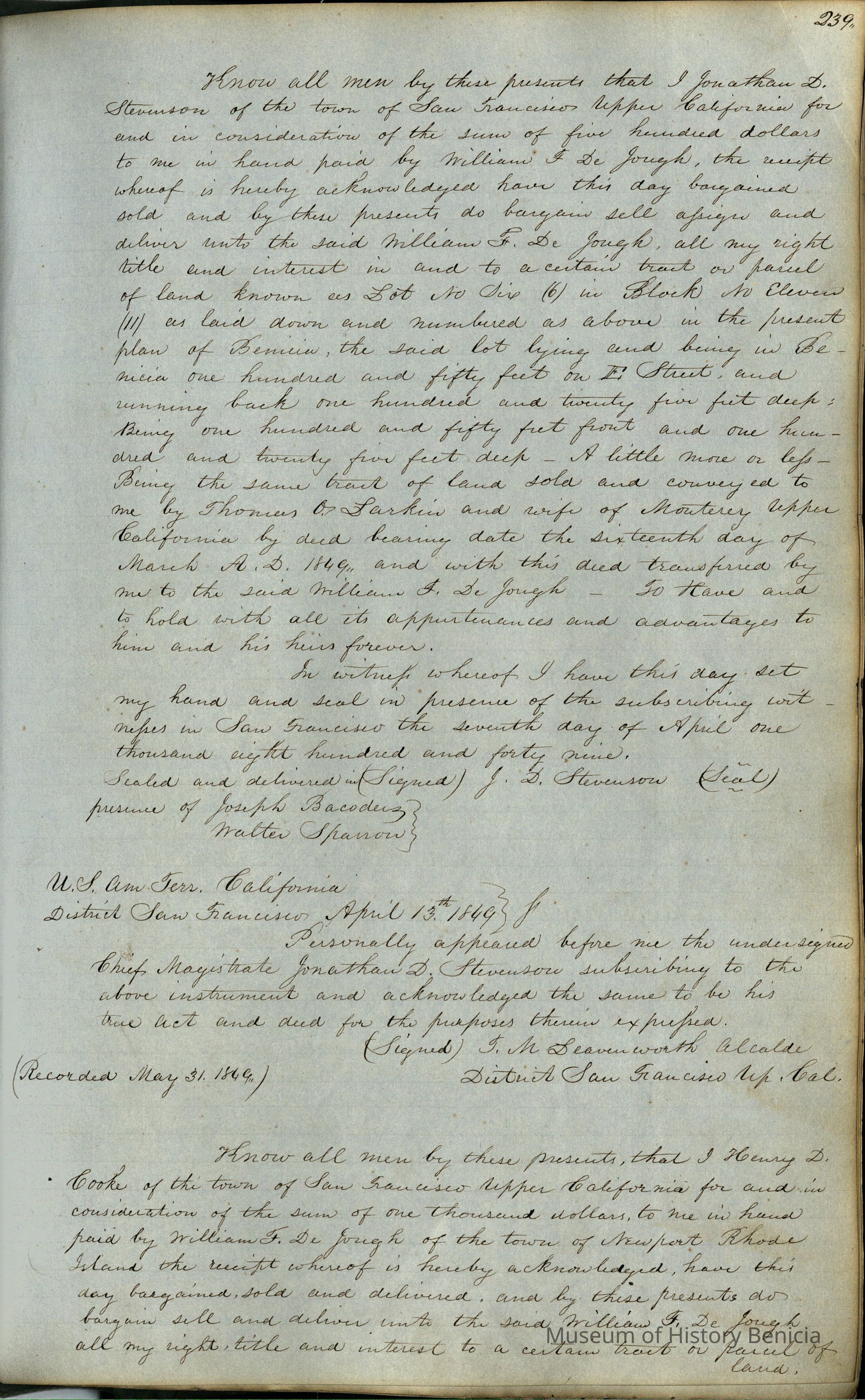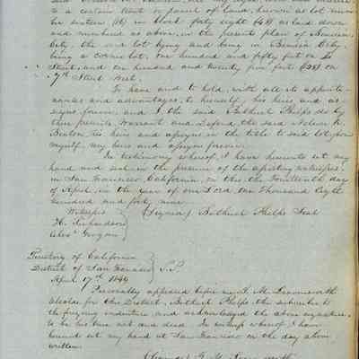 This journal/ledger contains the beginnings of Benicia including: lists and descriptions of first 12 houses in Benicia, a translation of the deed to General Vallejo by Manual Micheltorena, Governor of Calif. (1844); deed to Semple and Larkin by Vallejo (1847); deeds of properties sold by Semple and Larkin from 1847 - 1849