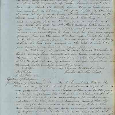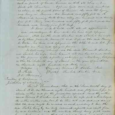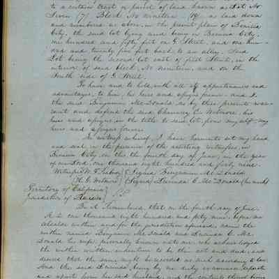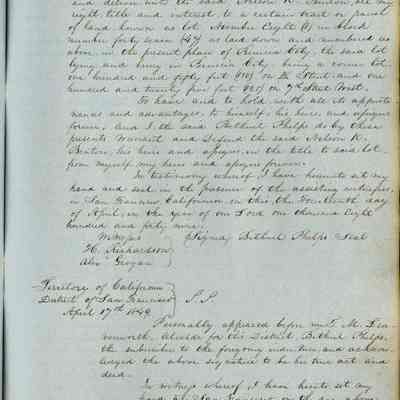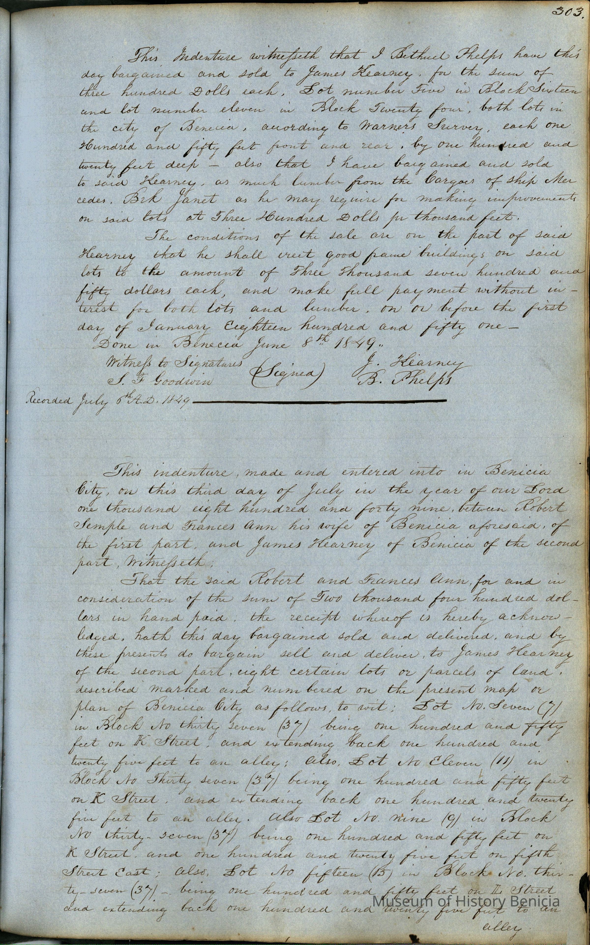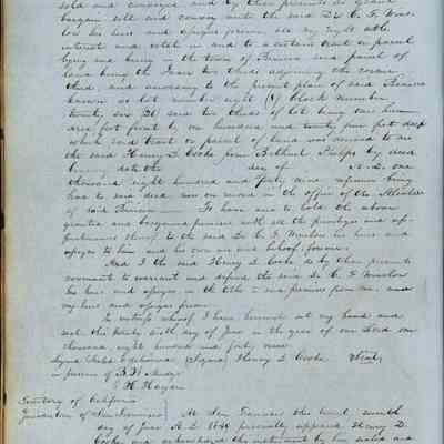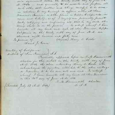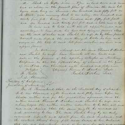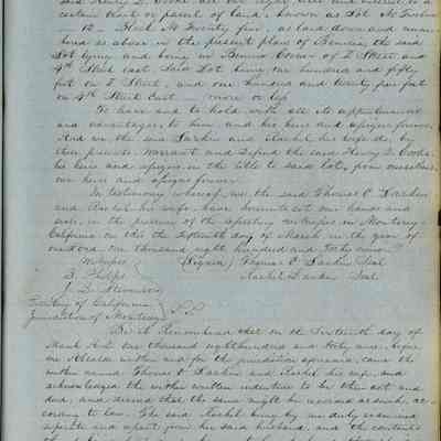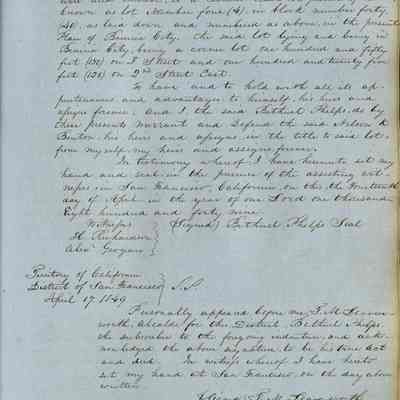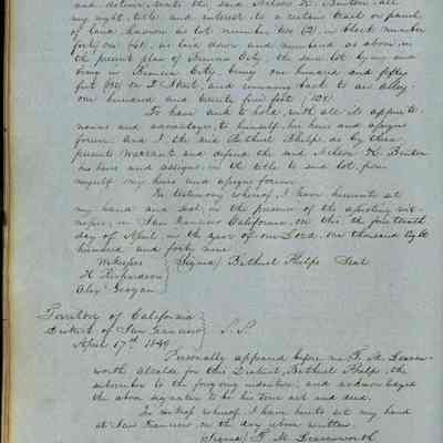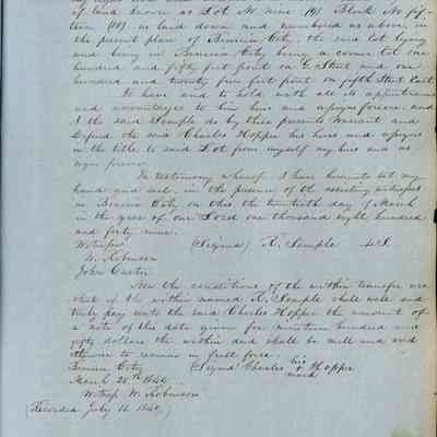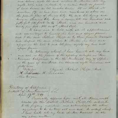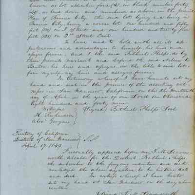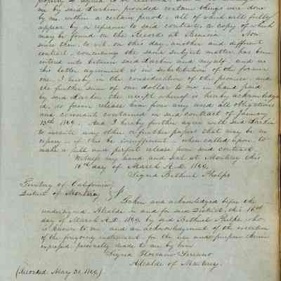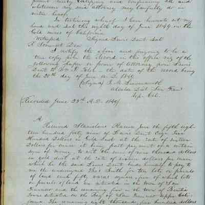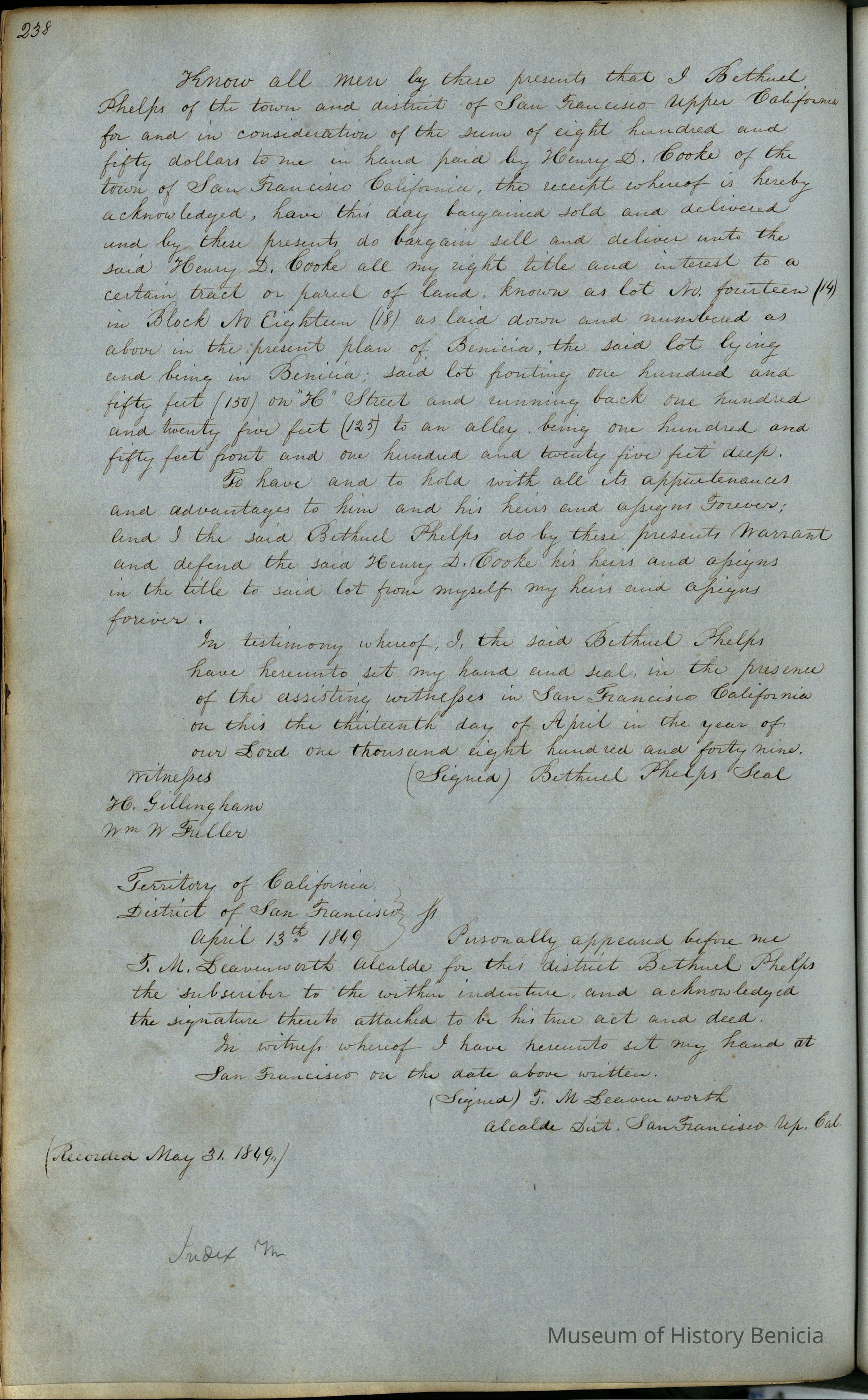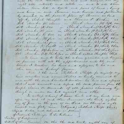 This journal/ledger contains the beginnings of Benicia including: lists and descriptions of first 12 houses in Benicia, a translation of the deed to General Vallejo by Manual Micheltorena, Governor of Calif. (1844); deed to Semple and Larkin by Vallejo (1847); deeds of properties sold by Semple and Larkin from 1847 - 1849