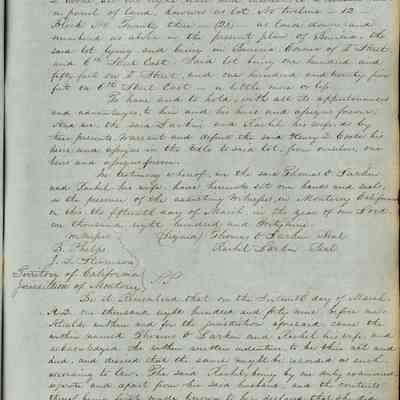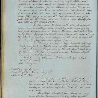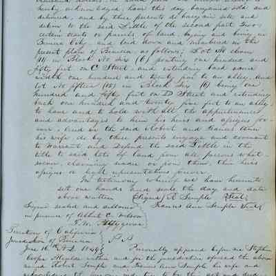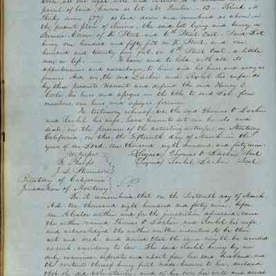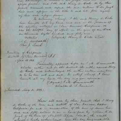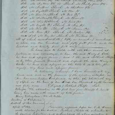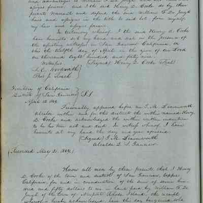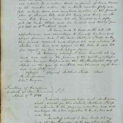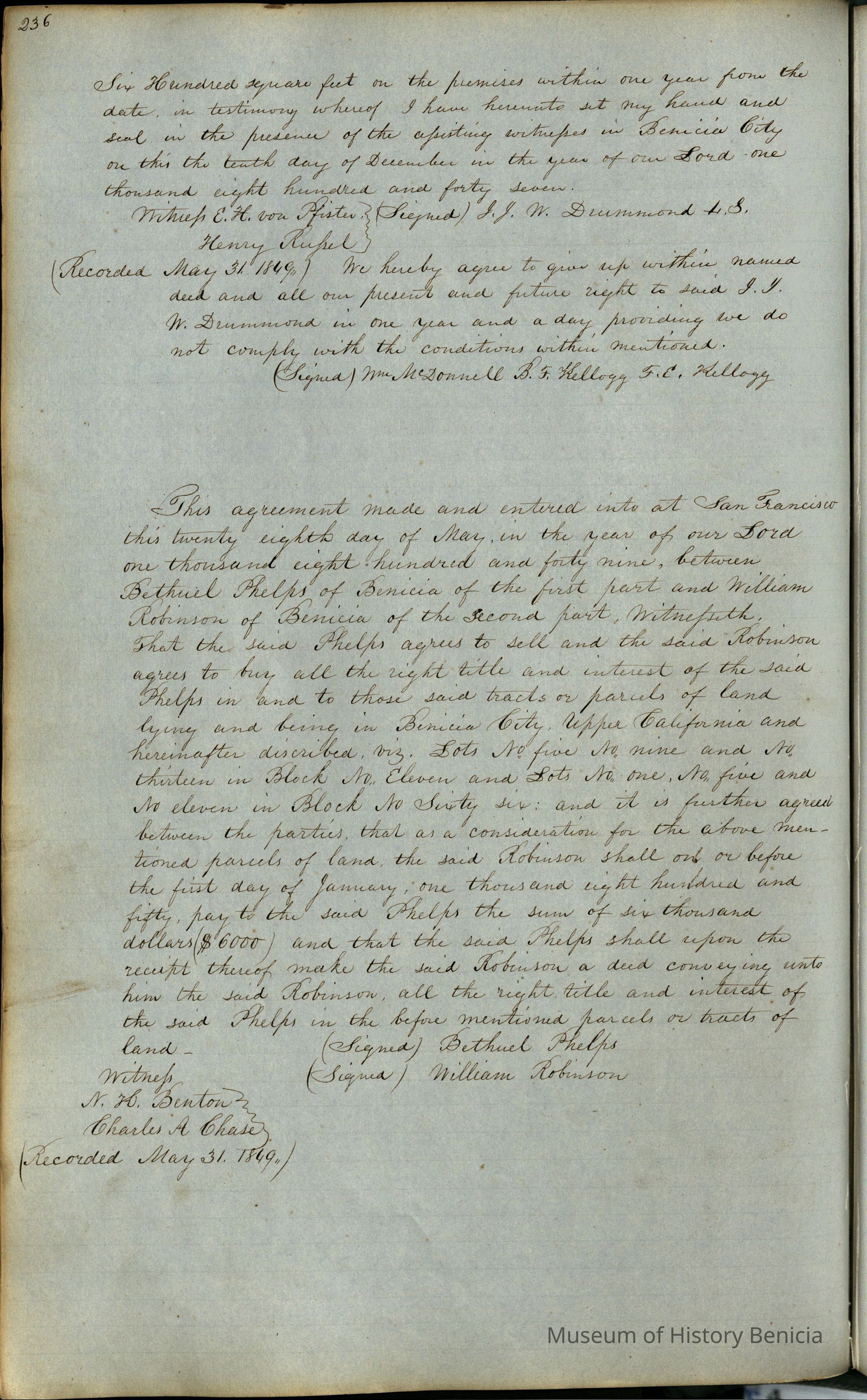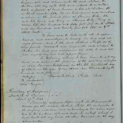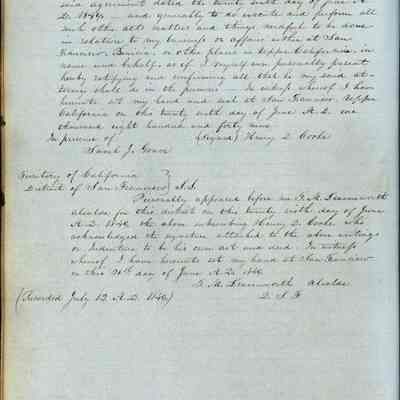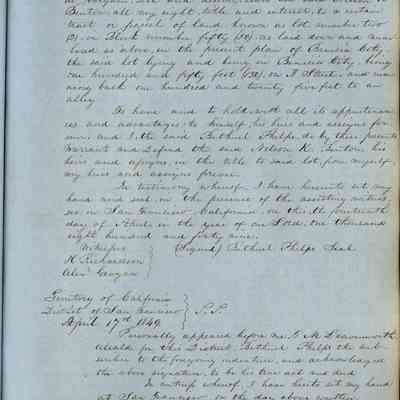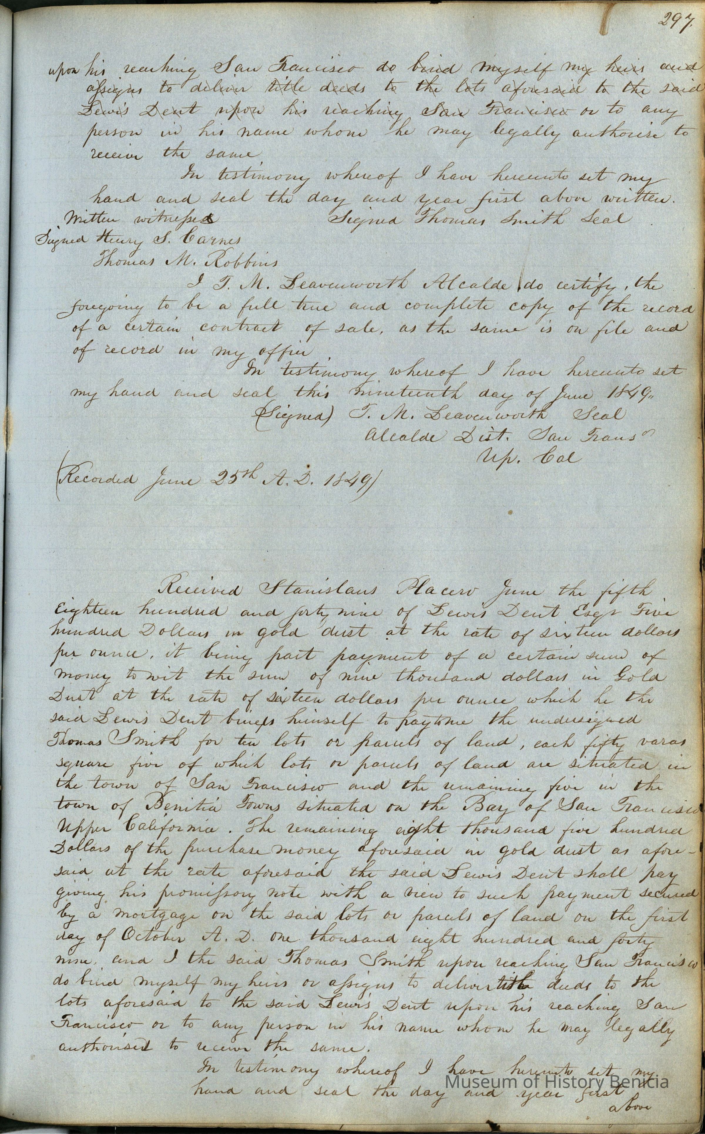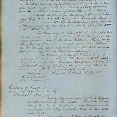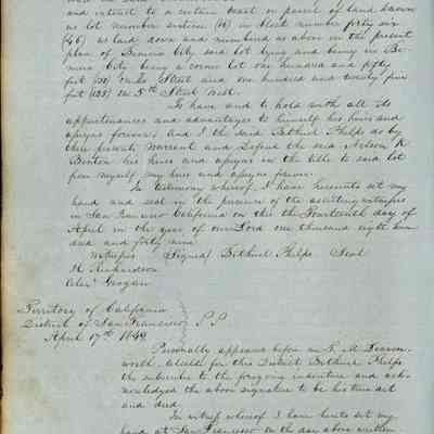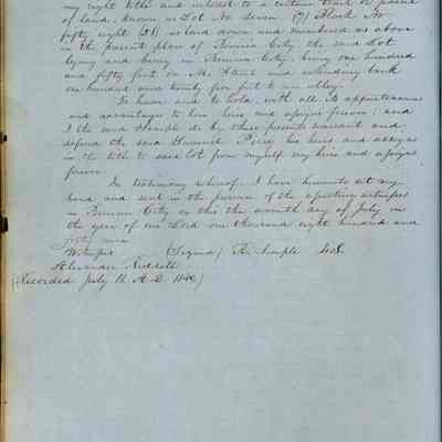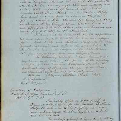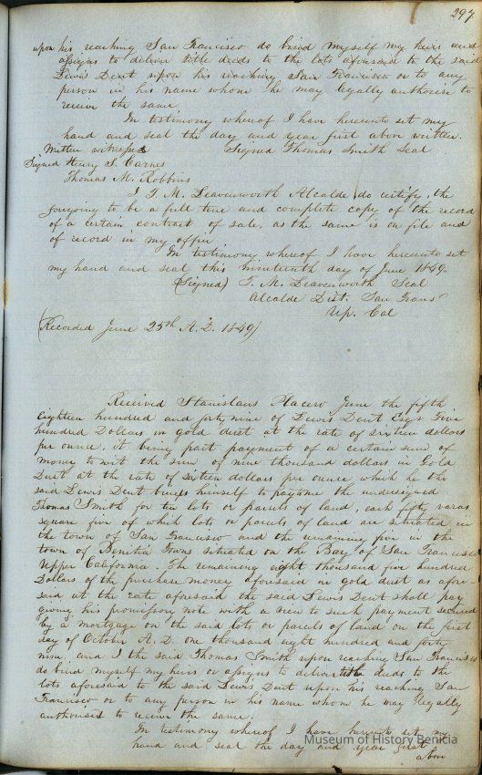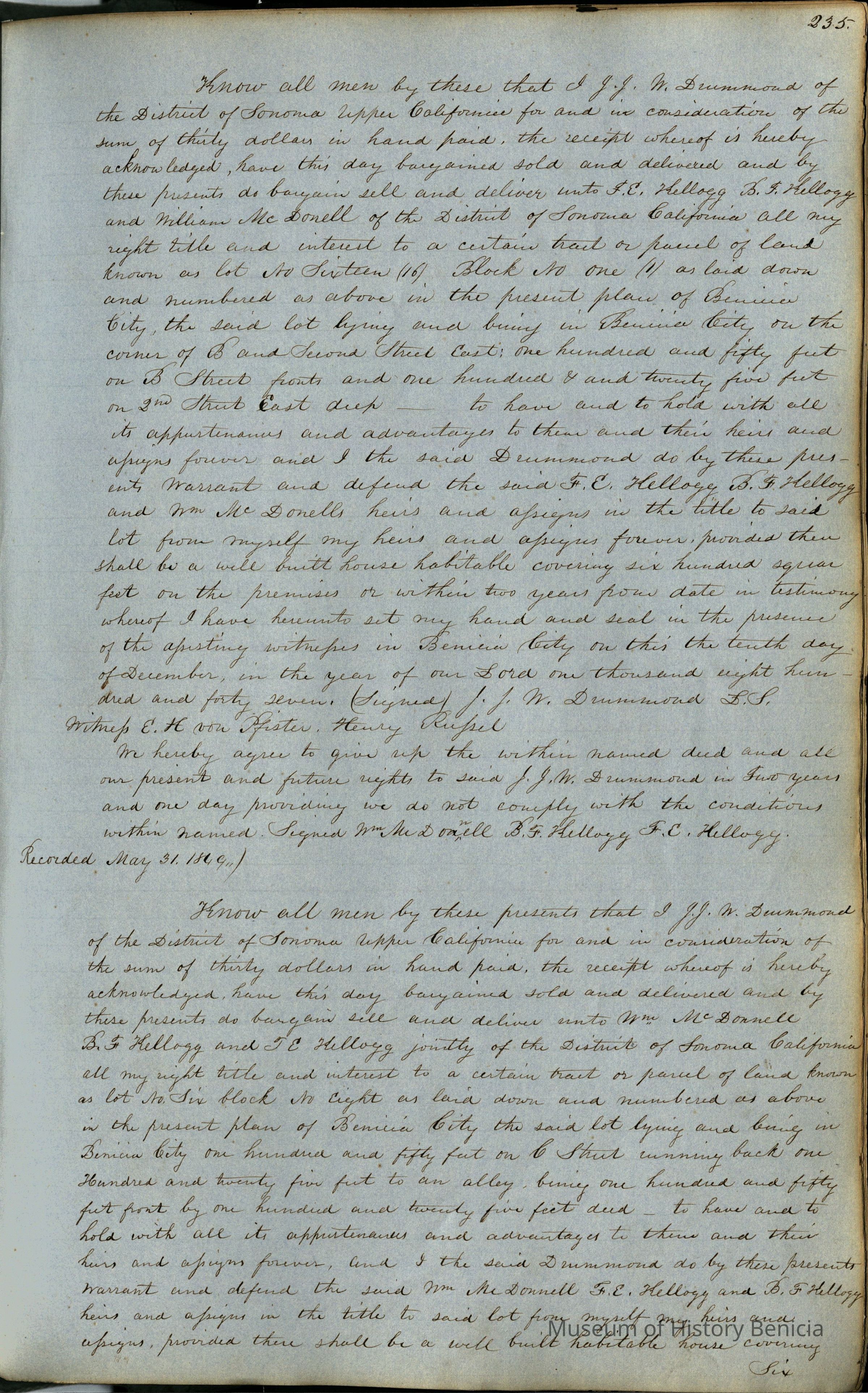 This journal/ledger contains the beginnings of Benicia including: lists and descriptions of first 12 houses in Benicia, a translation of the deed to General Vallejo by Manual Micheltorena, Governor of Calif. (1844); deed to Semple and Larkin by Vallejo (1847); deeds of properties sold by Semple and Larkin from 1847 - 1849