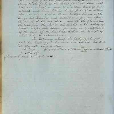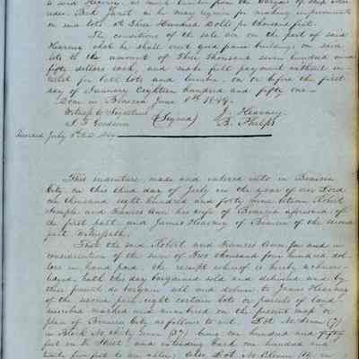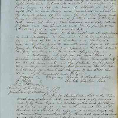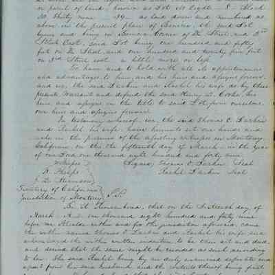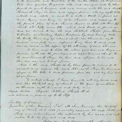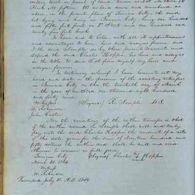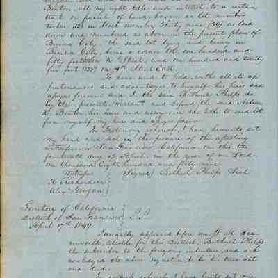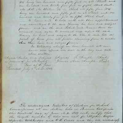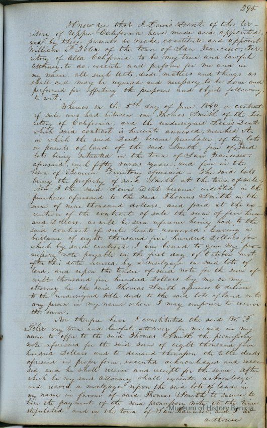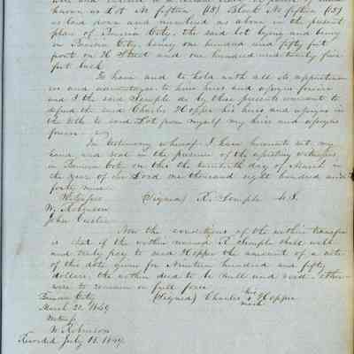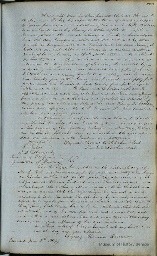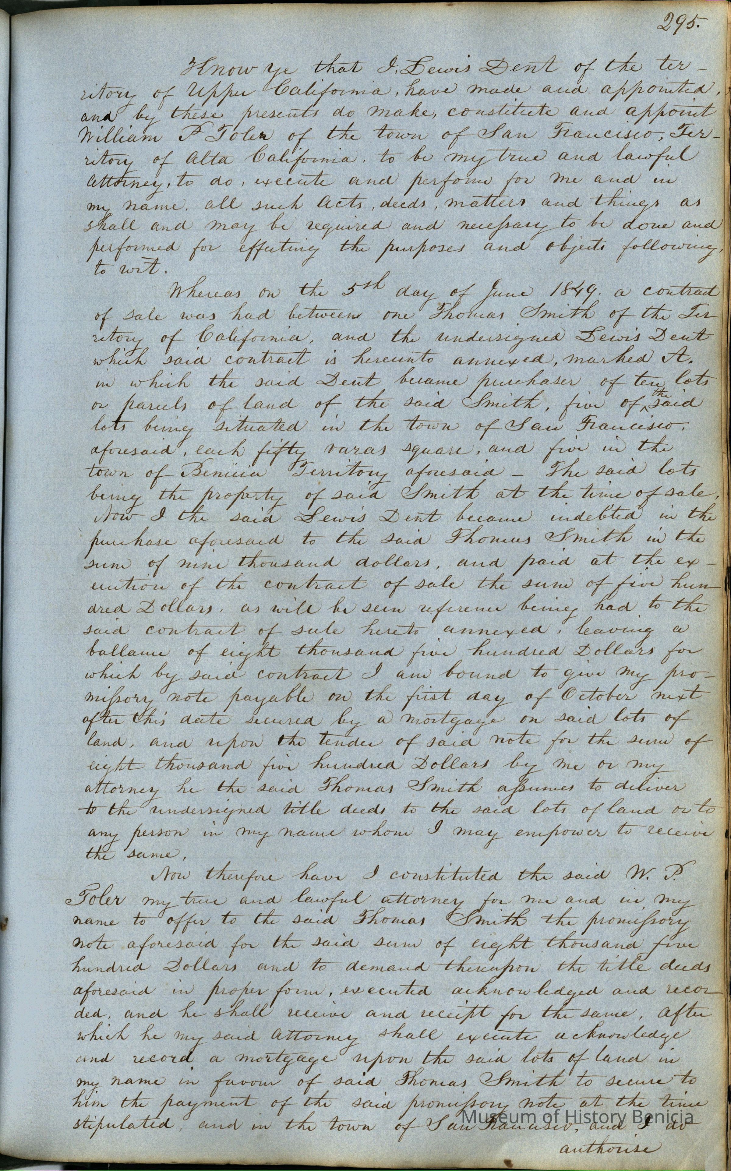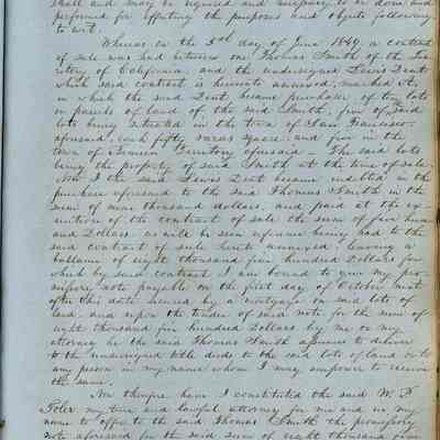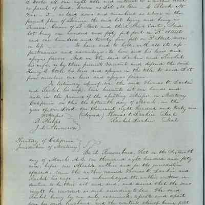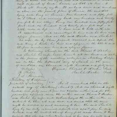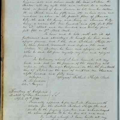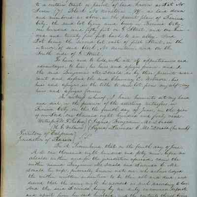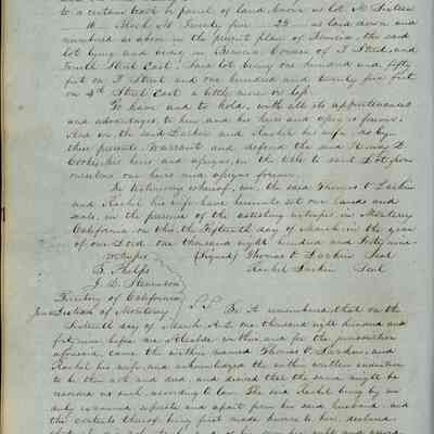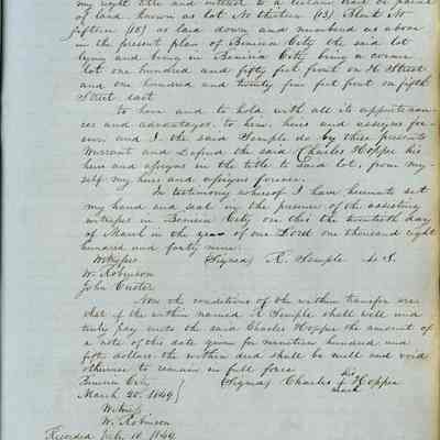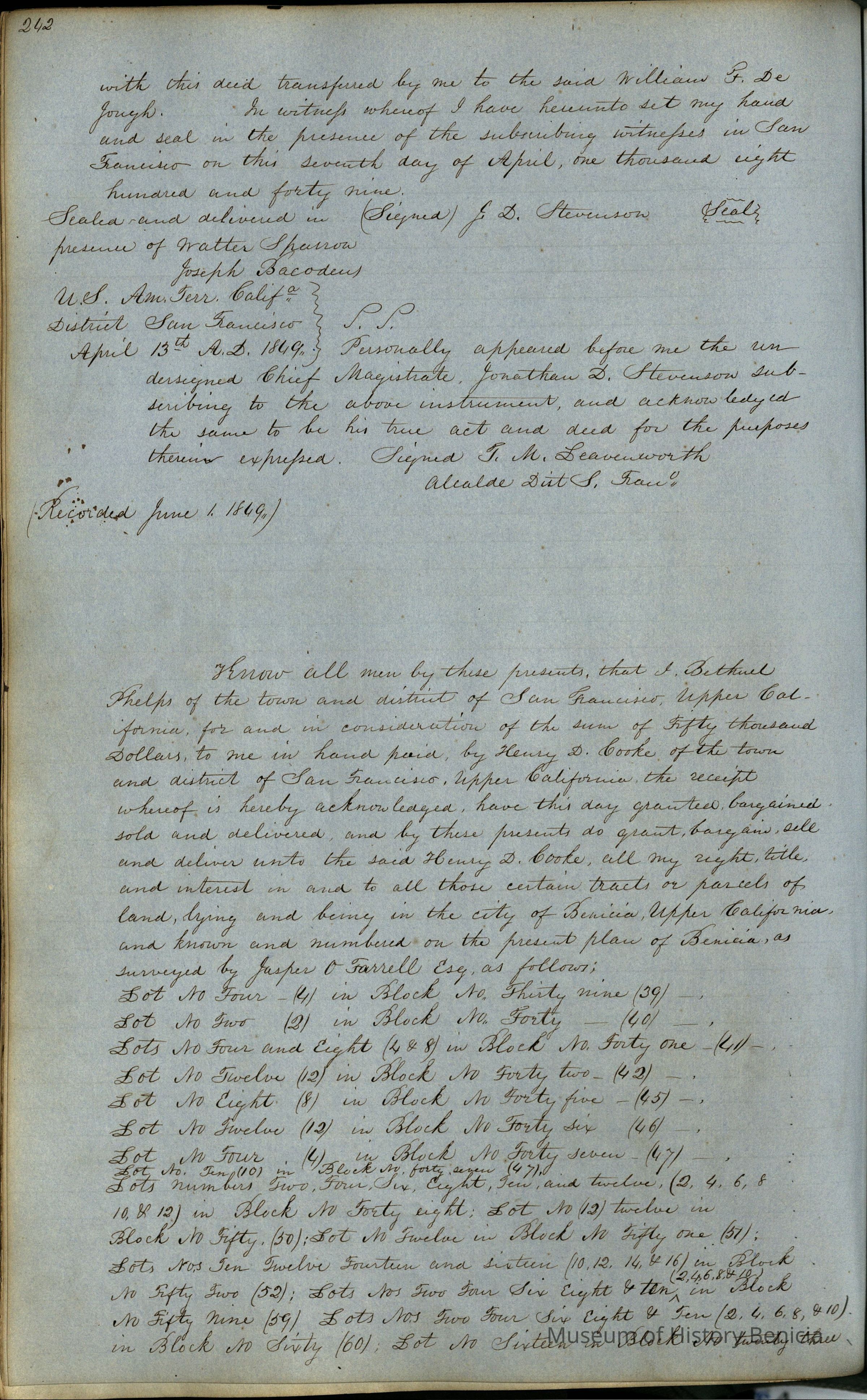 This journal/ledger contains the beginnings of Benicia including: lists and descriptions of first 12 houses in Benicia, a translation of the deed to General Vallejo by Manual Micheltorena, Governor of Calif. (1844); deed to Semple and Larkin by Vallejo (1847); deeds of properties sold by Semple and Larkin from 1847 - 1849
