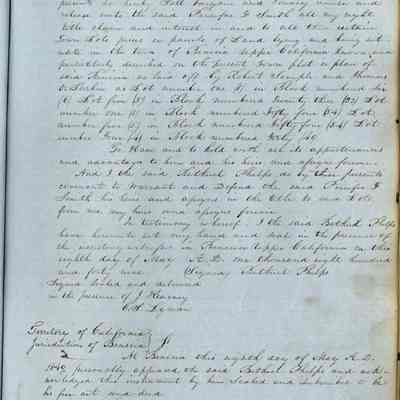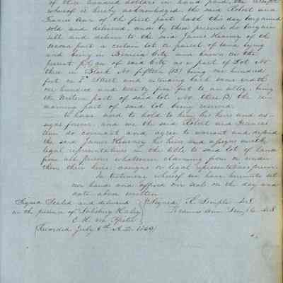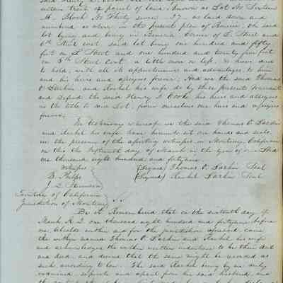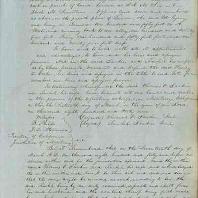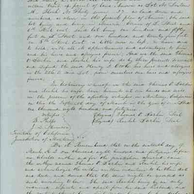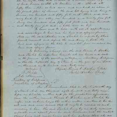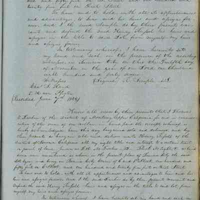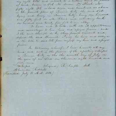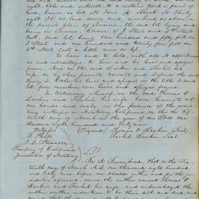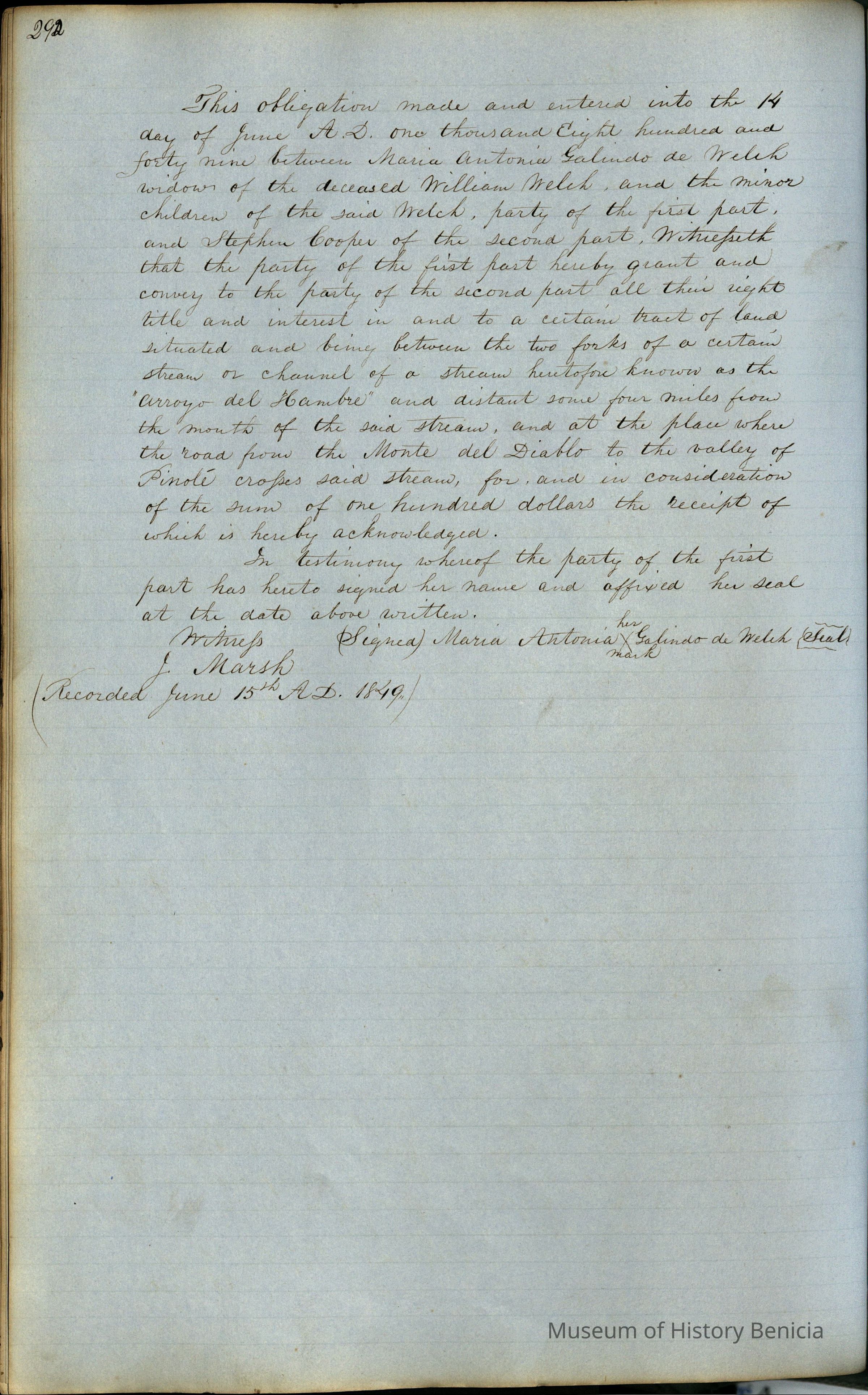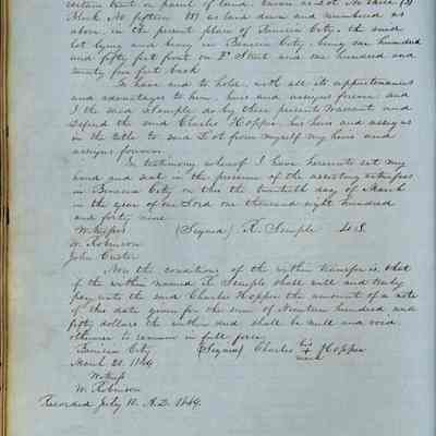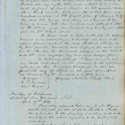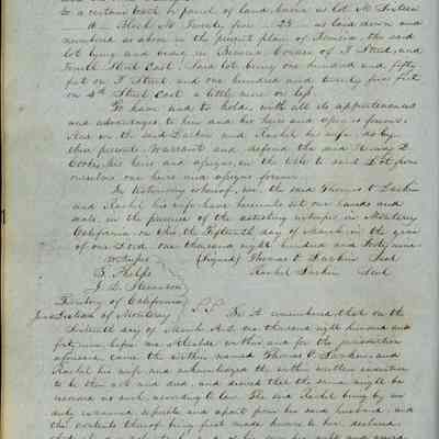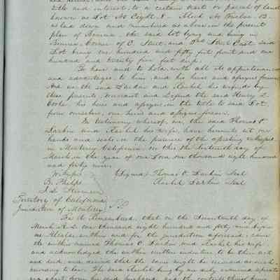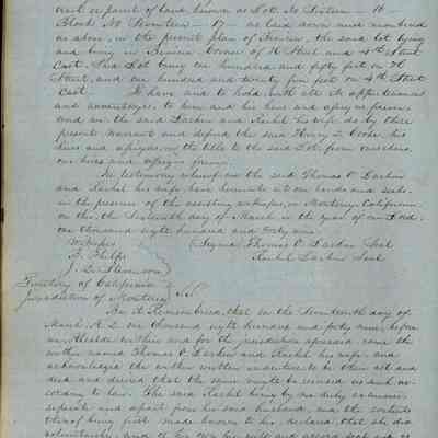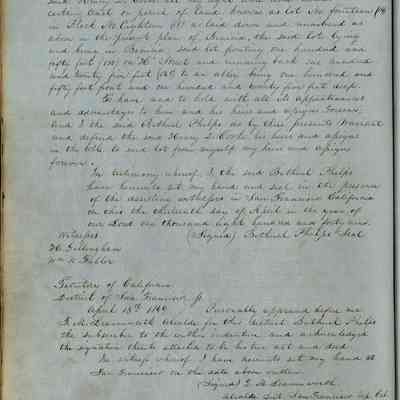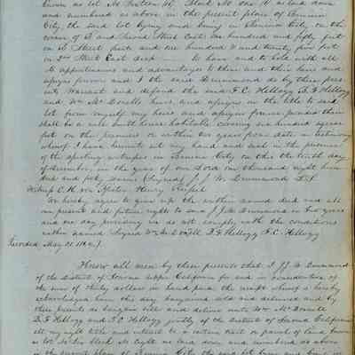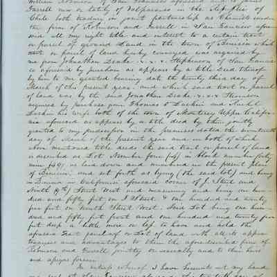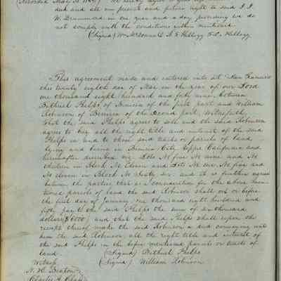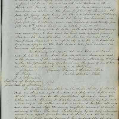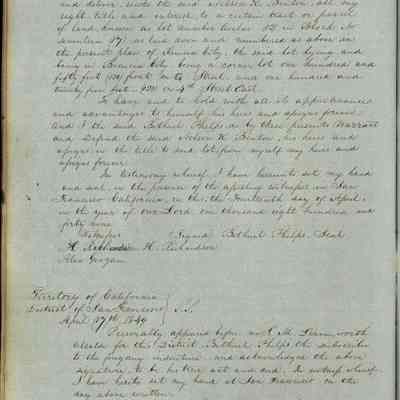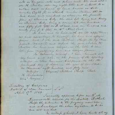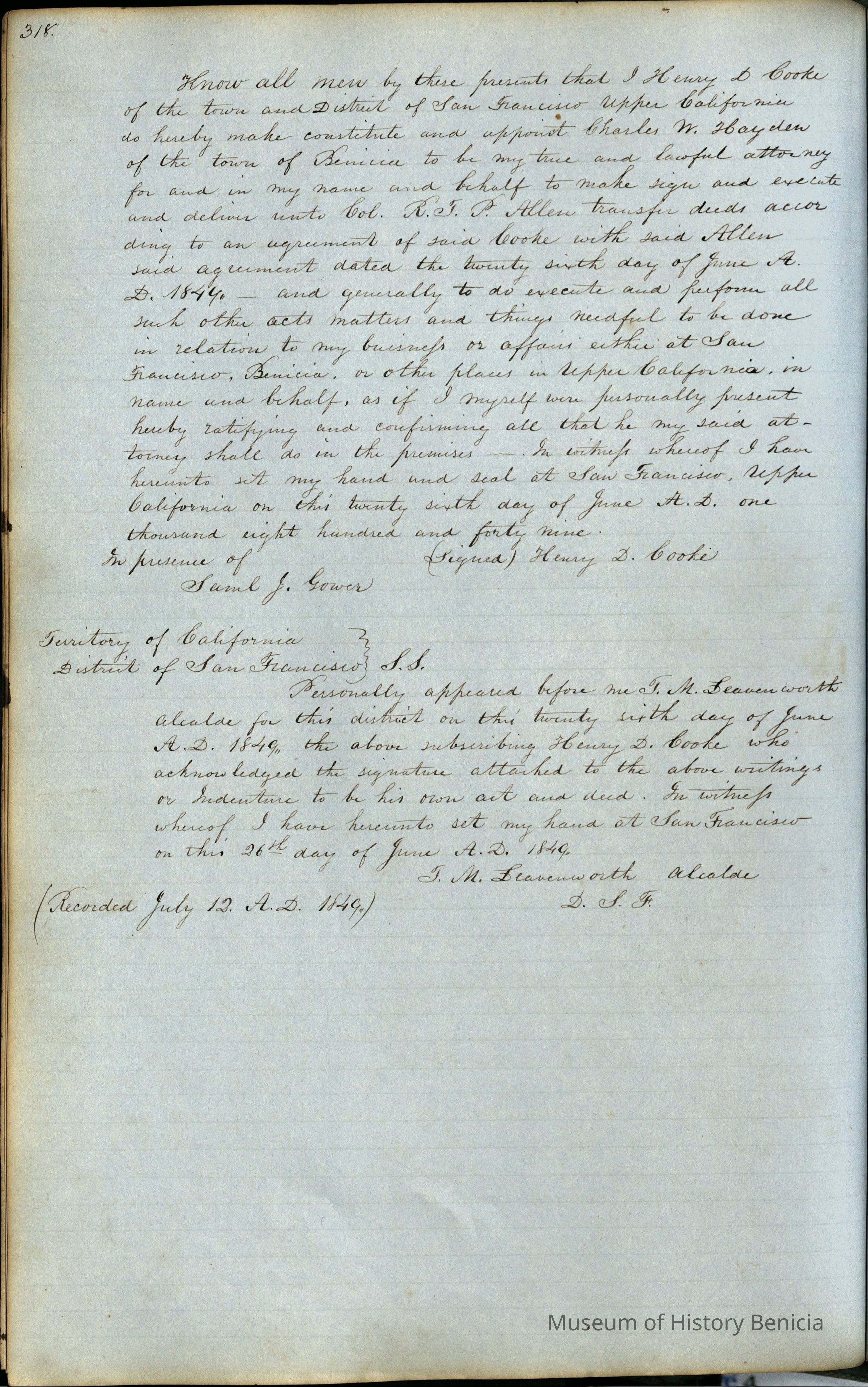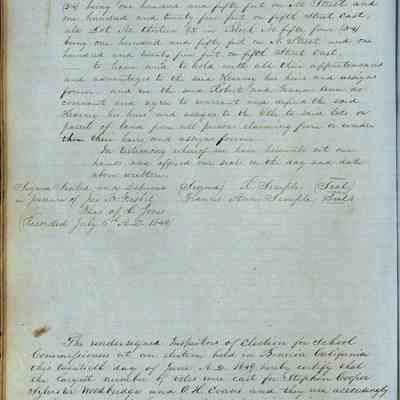 This journal/ledger contains the beginnings of Benicia including: lists and descriptions of first 12 houses in Benicia, a translation of the deed to General Vallejo by Manual Micheltorena, Governor of Calif. (1844); deed to Semple and Larkin by Vallejo (1847); deeds of properties sold by Semple and Larkin from 1847 - 1849