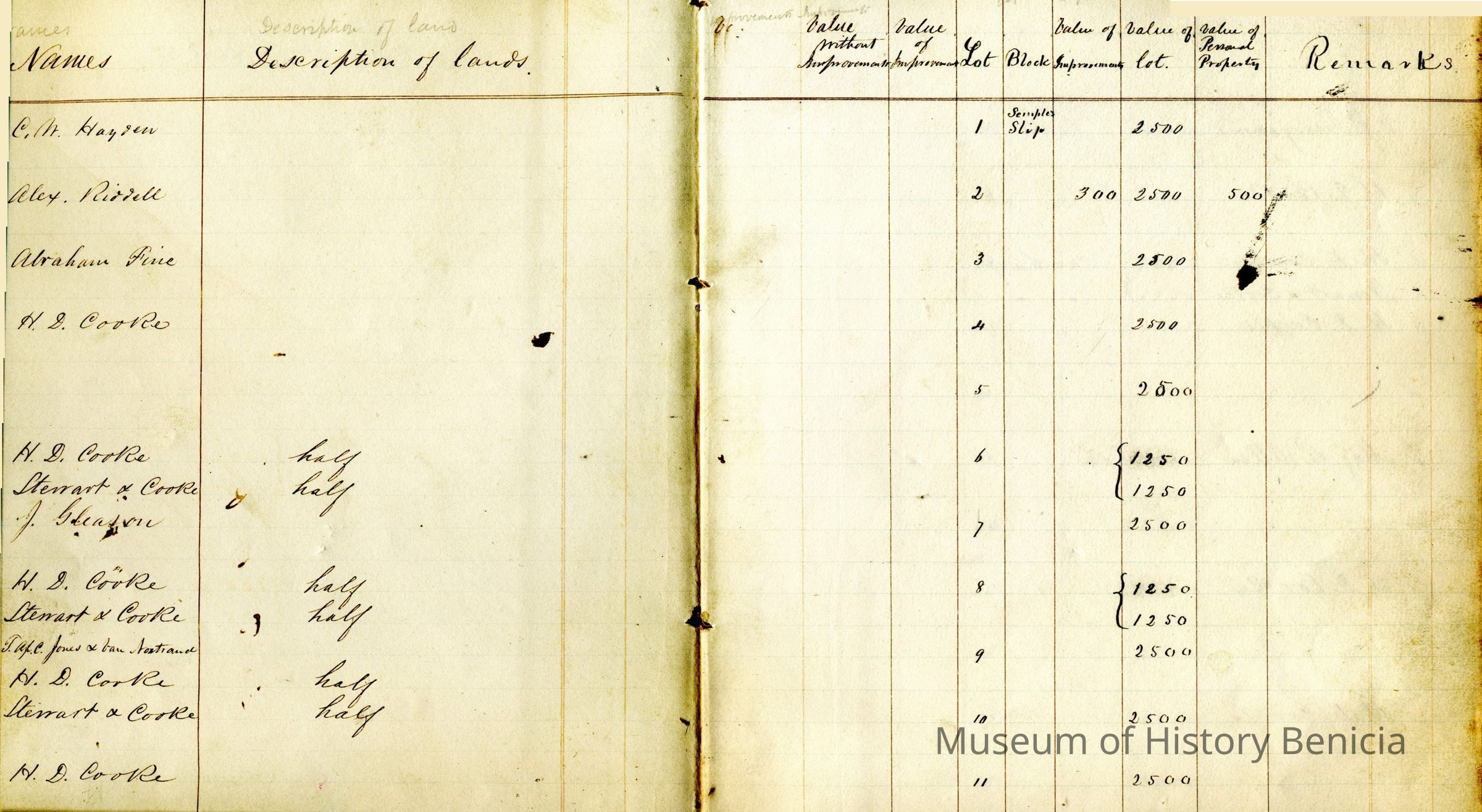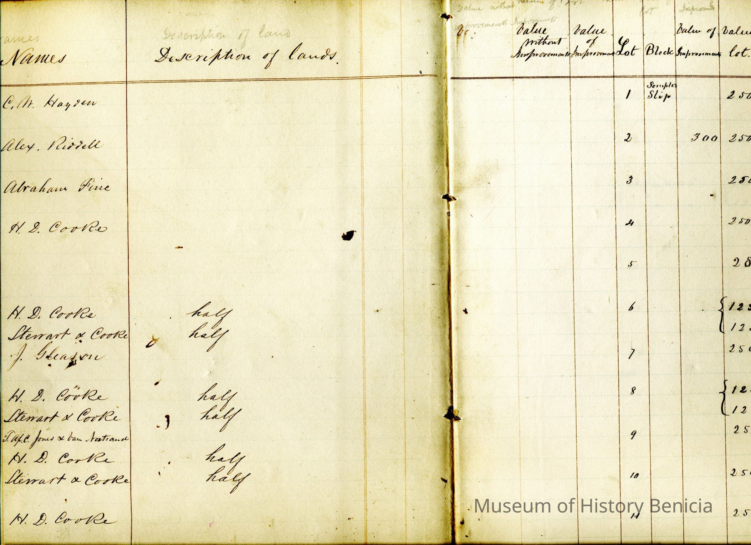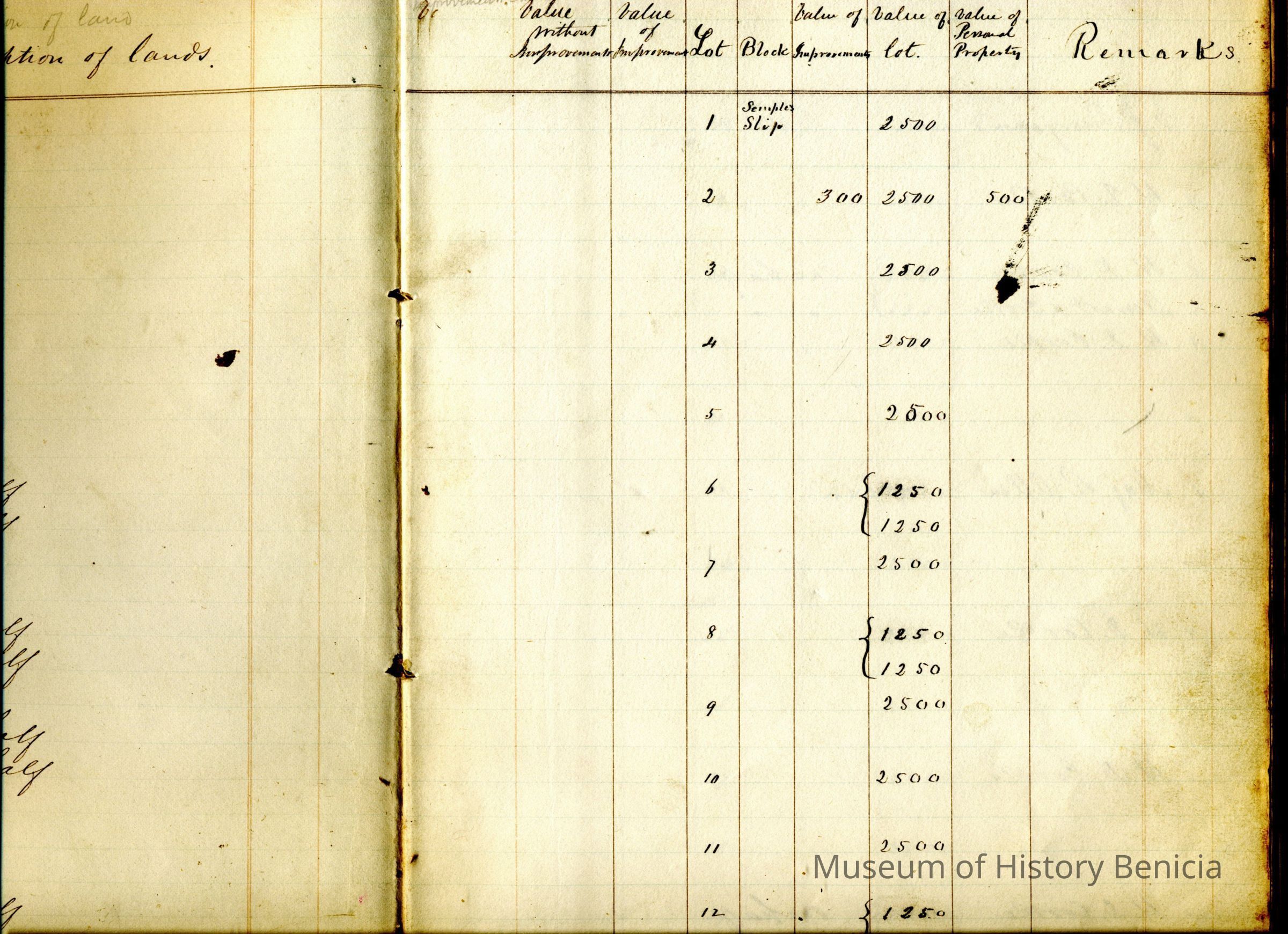 1850 Tax Assessor's book for City of Benicia (per 1992 nventory sheet).The book has columns for each person's description of lands / value without improvement / value with improvements / lot number / block number / value of improvements / value of lot / value of personal property / remarks. Most people just show the value of their land. There are notes showing if it is a partial lot or if a dwelling has been constructed on the property. The book is organized by block and then lot number. It goes from Semple Slip thru block number 68.Collection