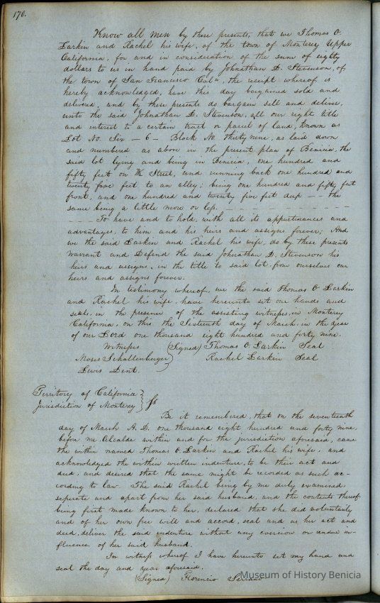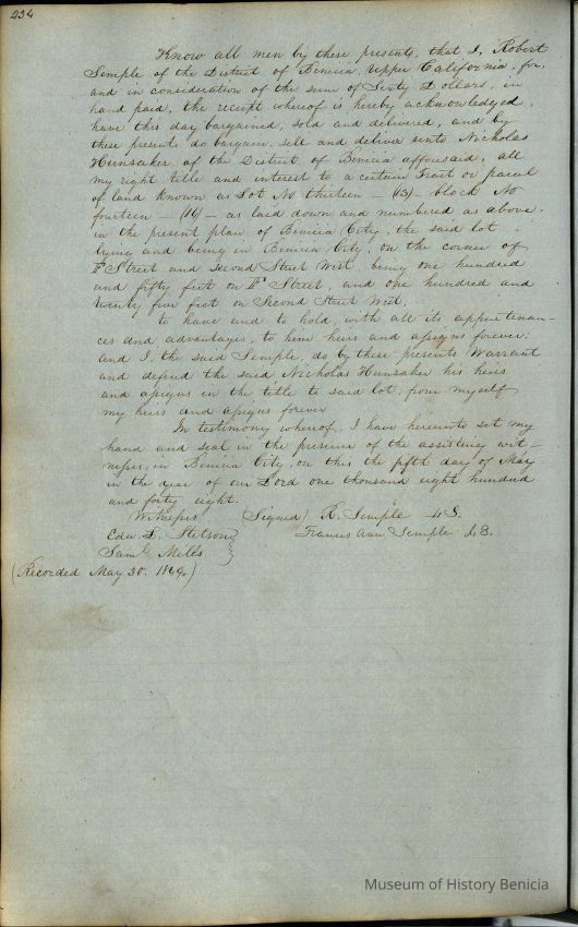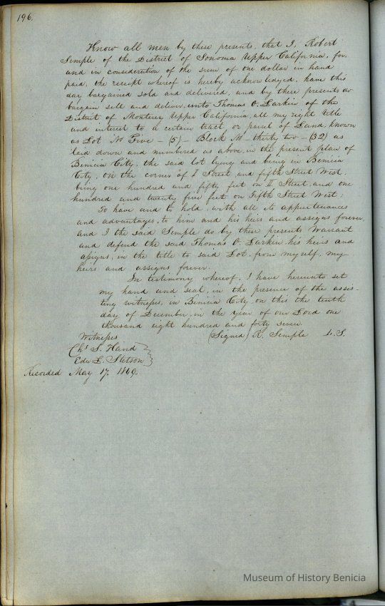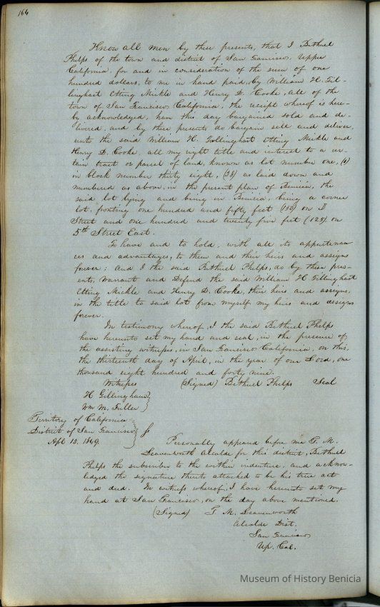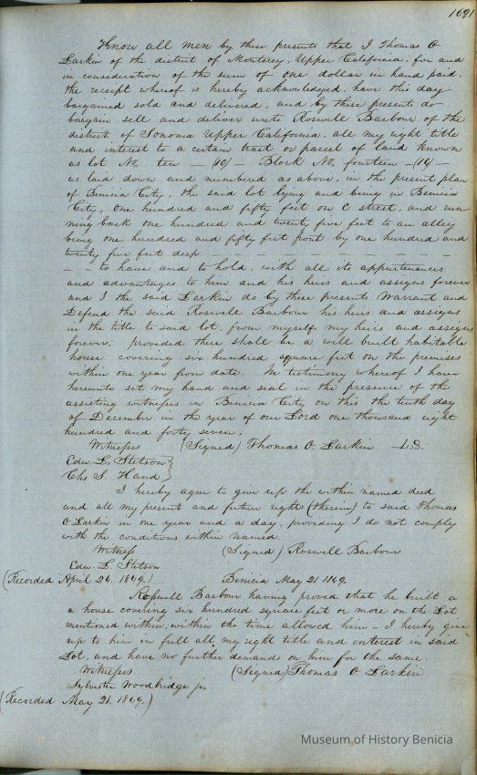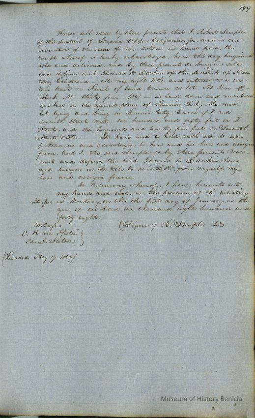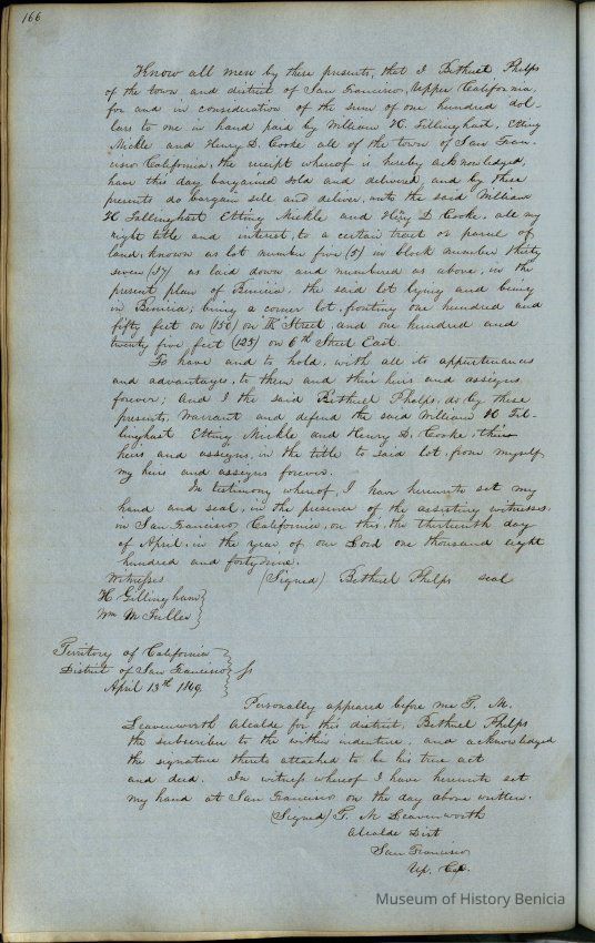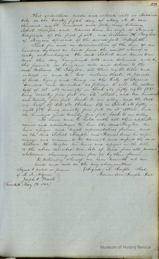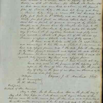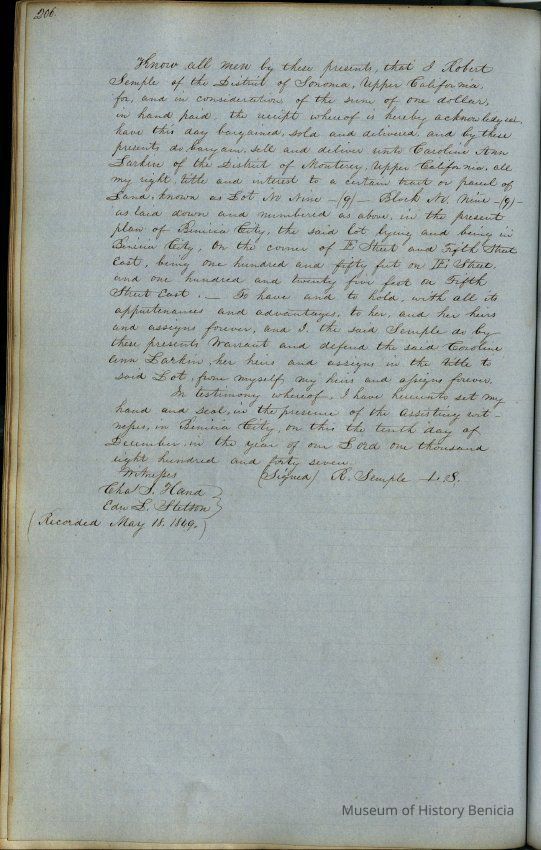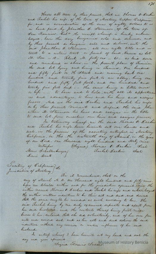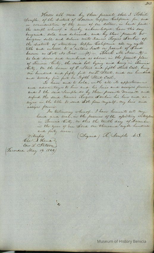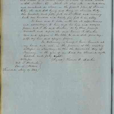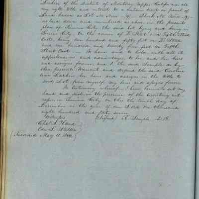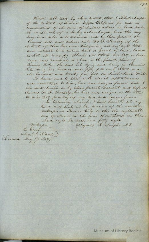 This journal/ledger contains the beginnings of Benicia including: lists and descriptions of first 12 houses in Benicia, a translation of the deed to General Vallejo by Manual Micheltorena, Governor of Calif. (1844); deed to Semple and Larkin by Vallejo (1847); deeds of properties sold by Semple and Larkin from 1847 - 1849