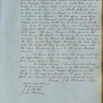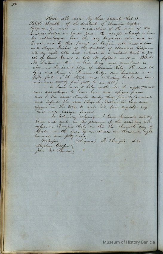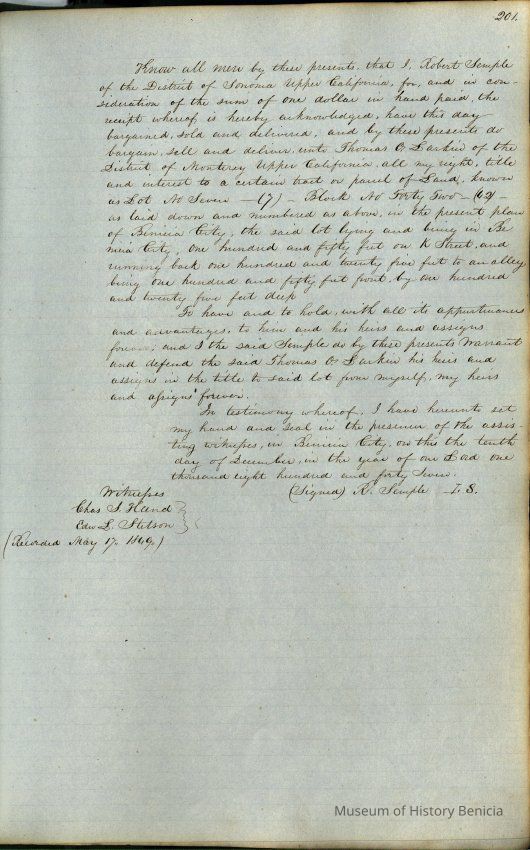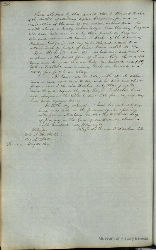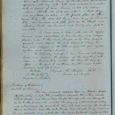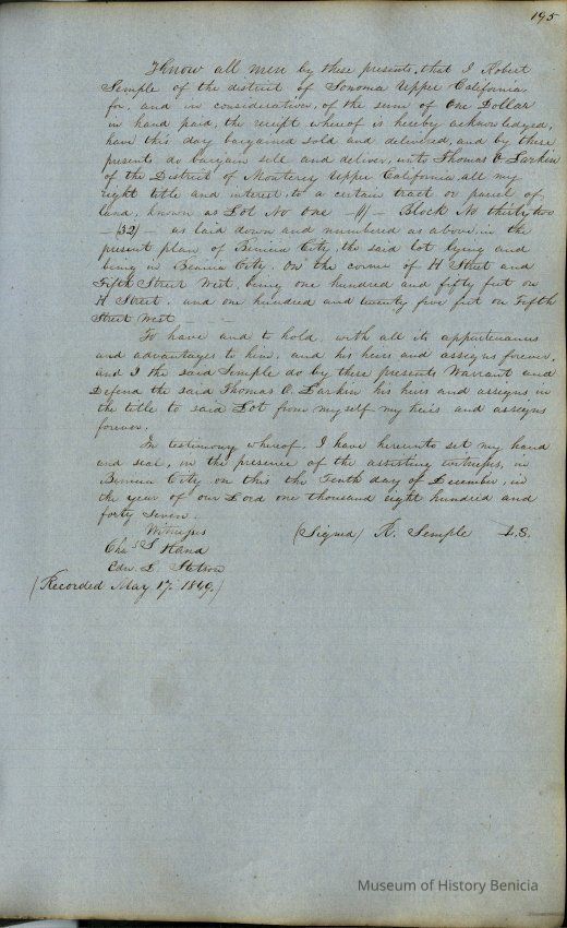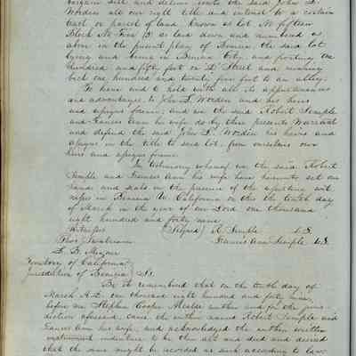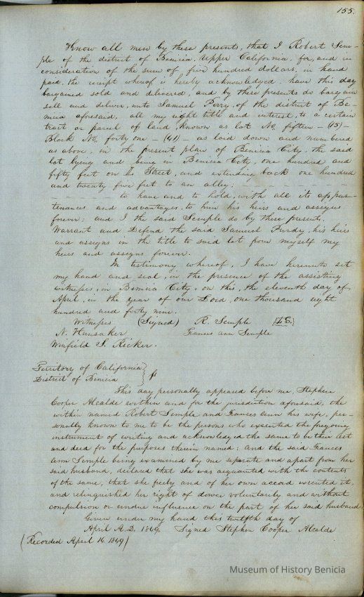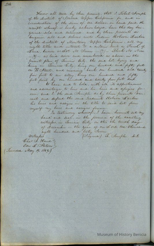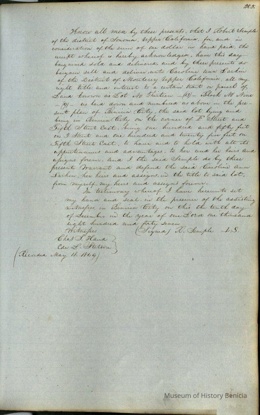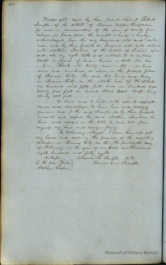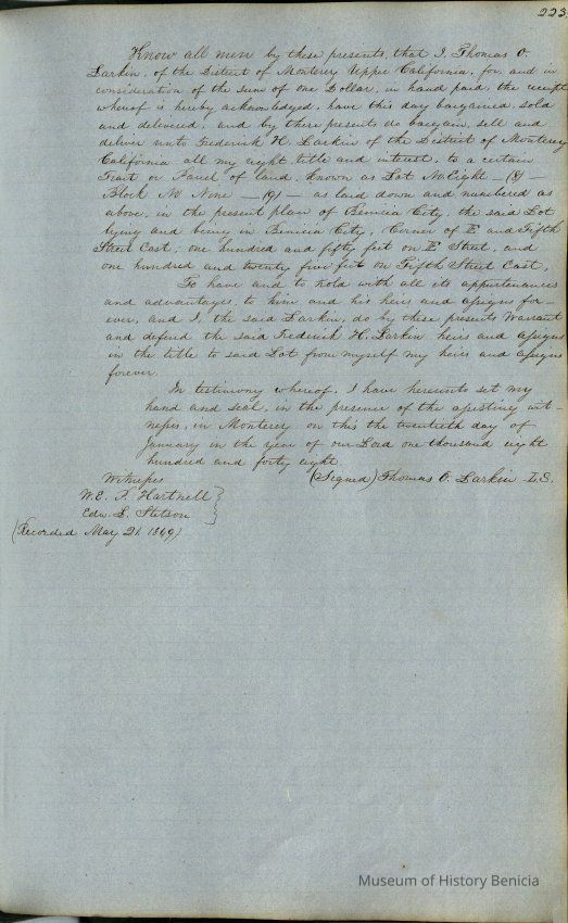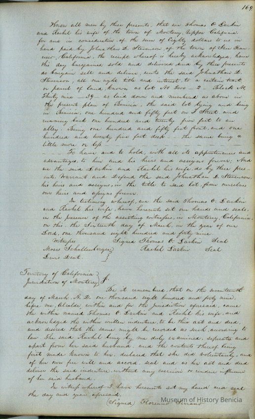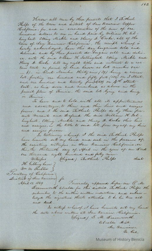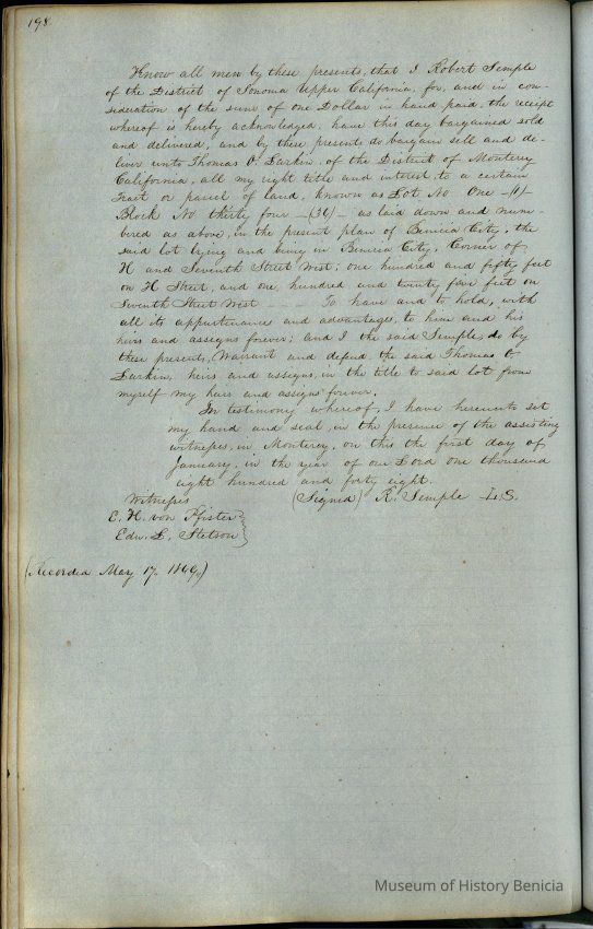 This journal/ledger contains the beginnings of Benicia including: lists and descriptions of first 12 houses in Benicia, a translation of the deed to General Vallejo by Manual Micheltorena, Governor of Calif. (1844); deed to Semple and Larkin by Vallejo (1847); deeds of properties sold by Semple and Larkin from 1847 - 1849