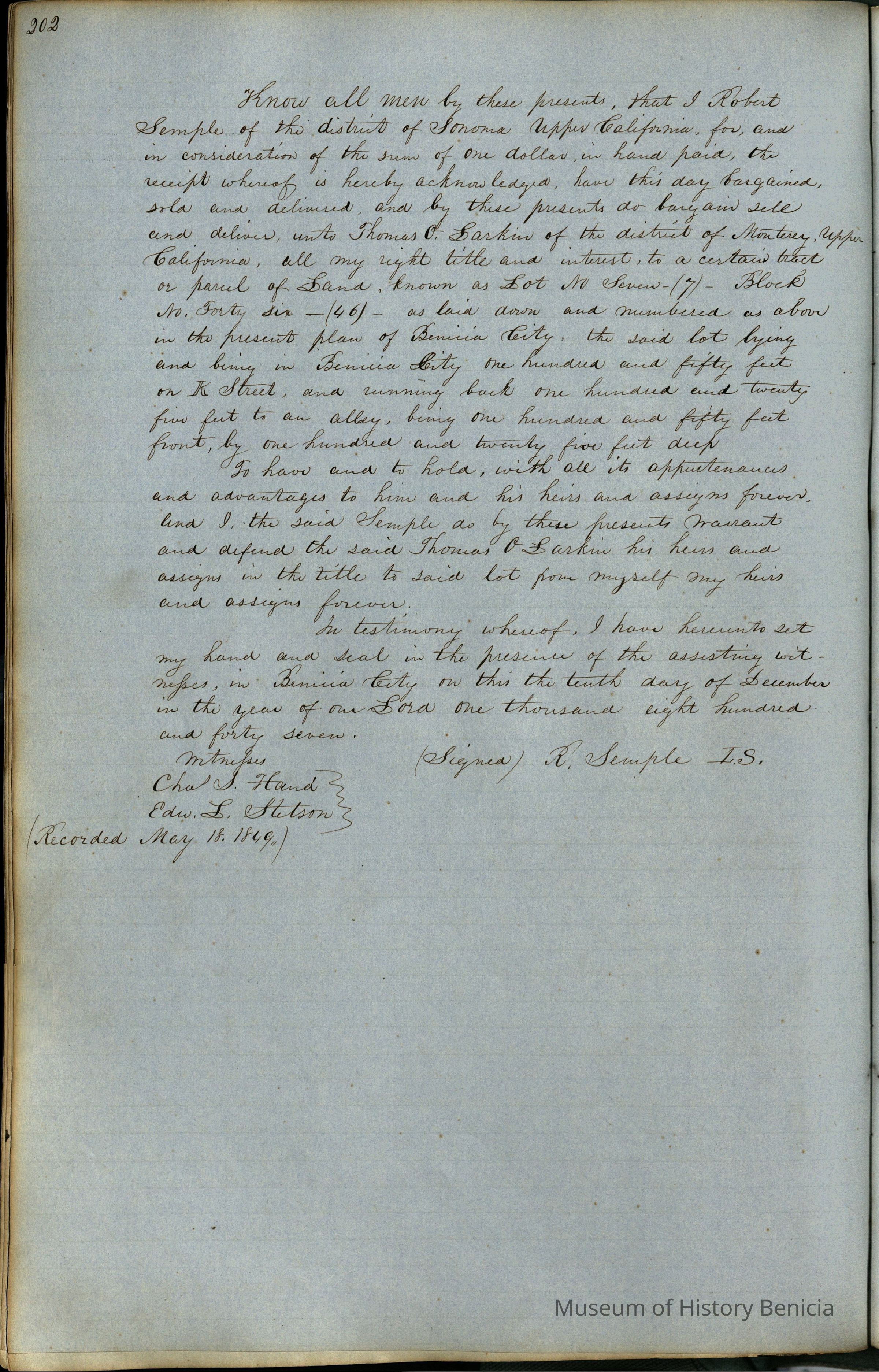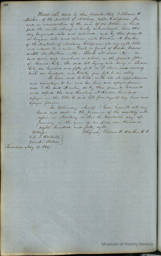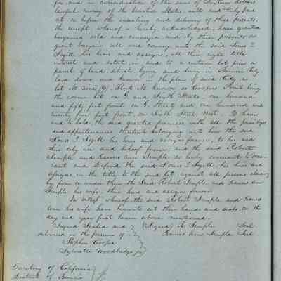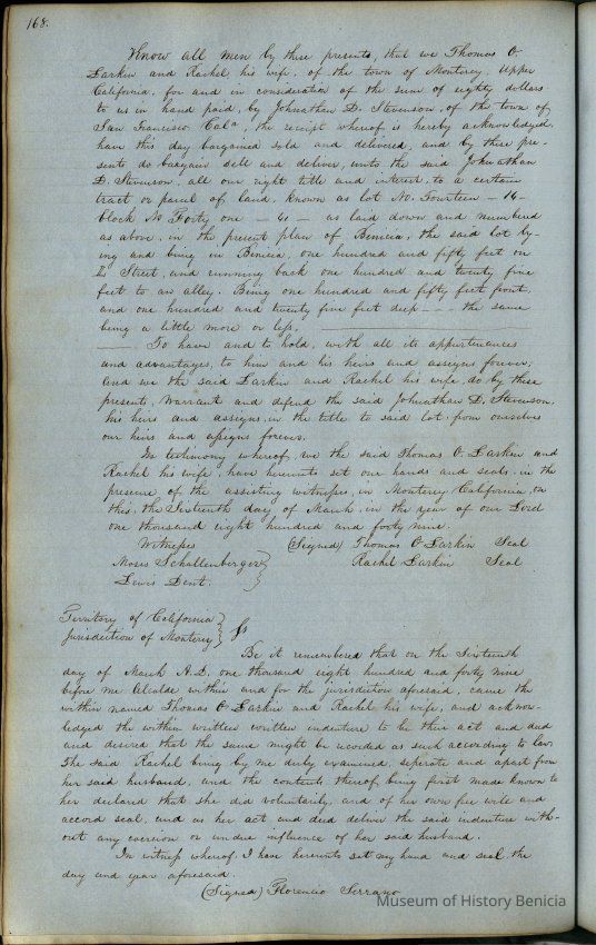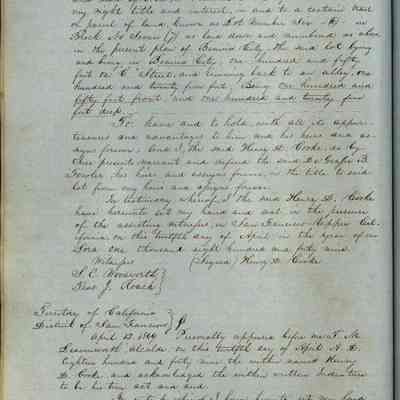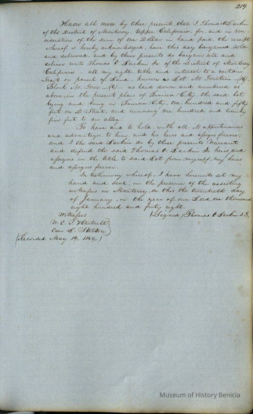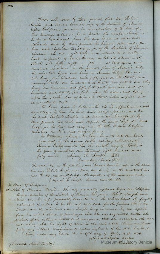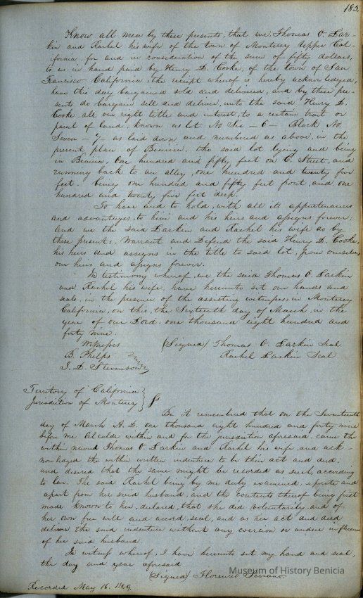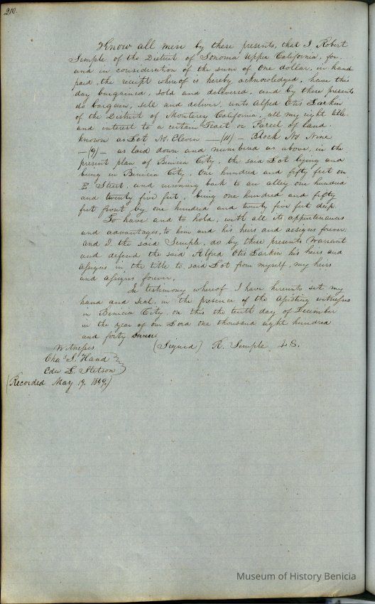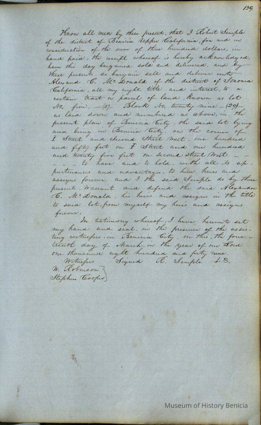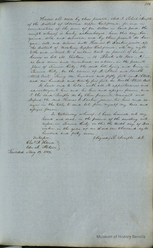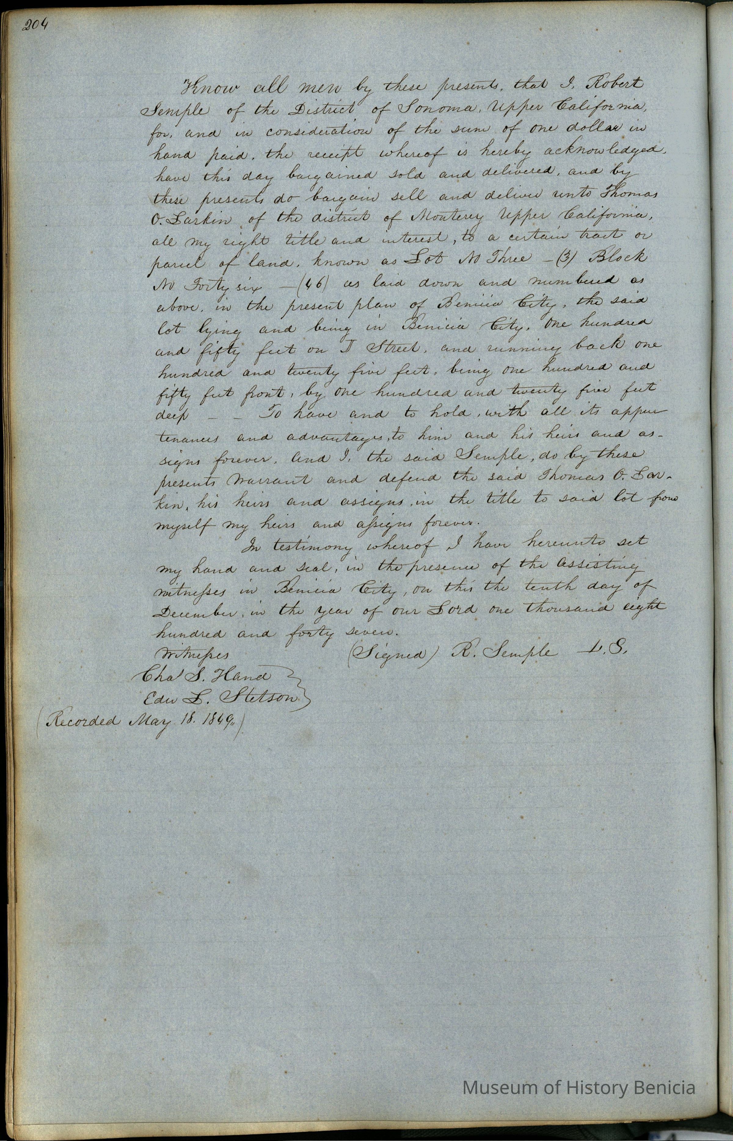 This journal/ledger contains the beginnings of Benicia including: lists and descriptions of first 12 houses in Benicia, a translation of the deed to General Vallejo by Manual Micheltorena, Governor of Calif. (1844); deed to Semple and Larkin by Vallejo (1847); deeds of properties sold by Semple and Larkin from 1847 - 1849