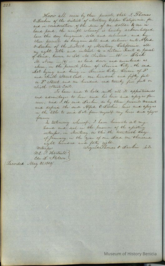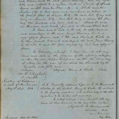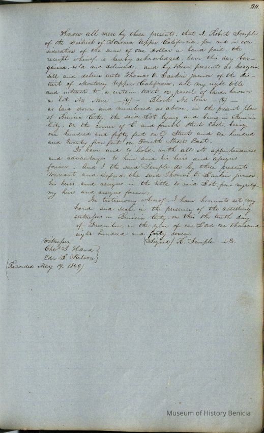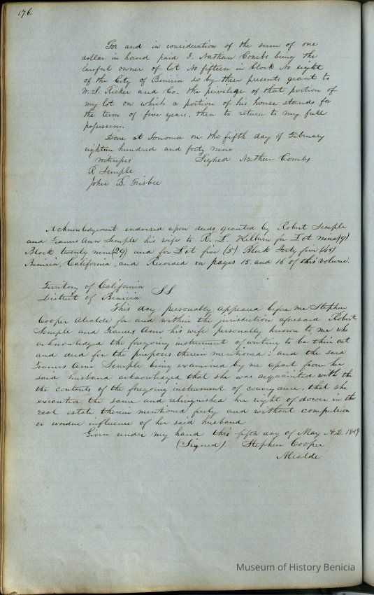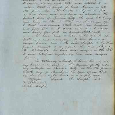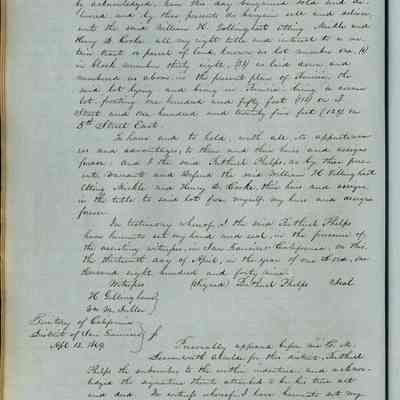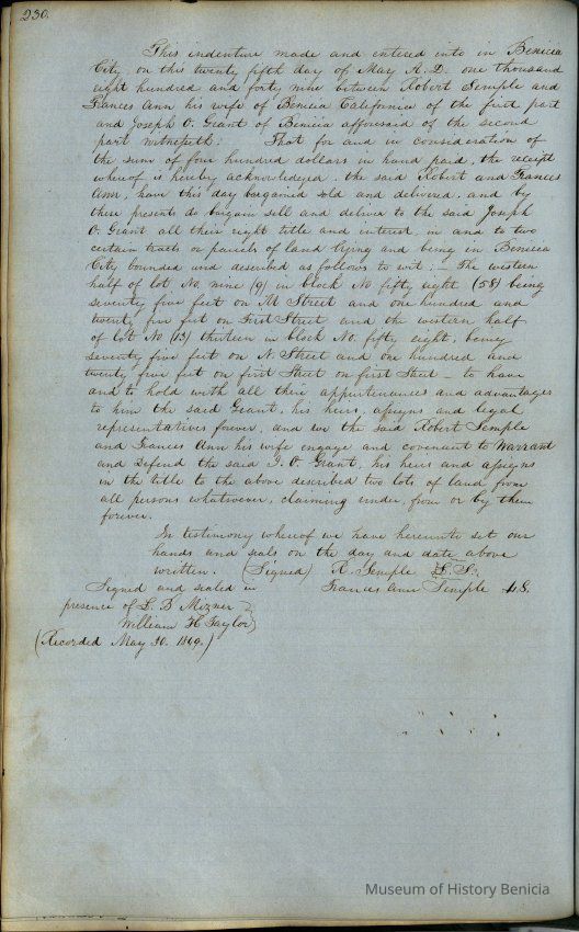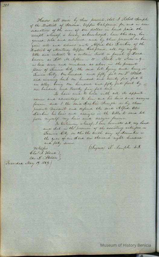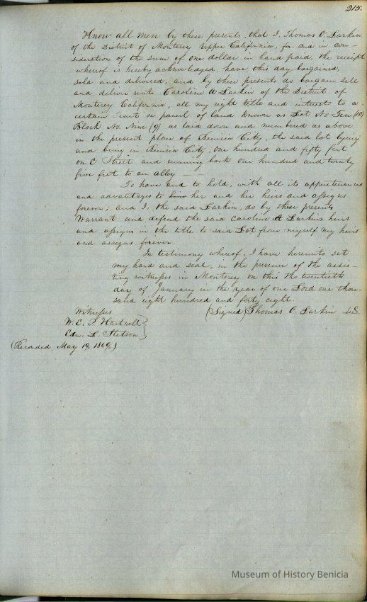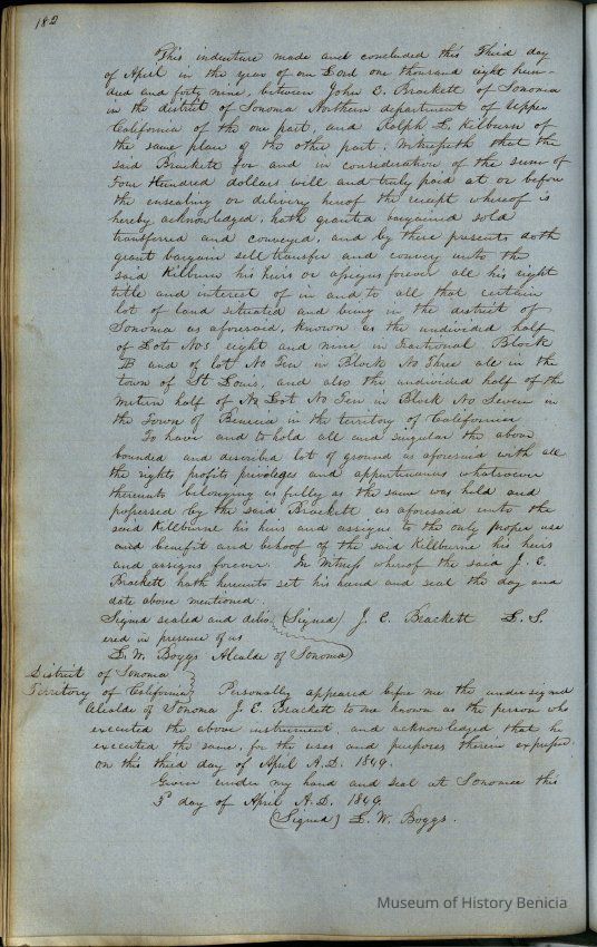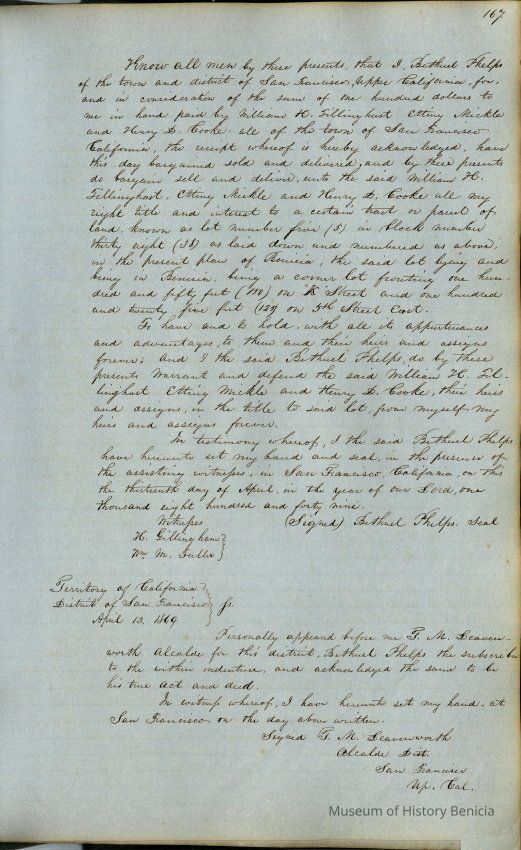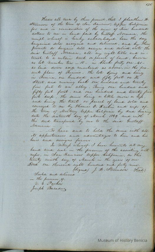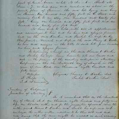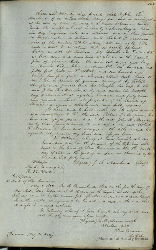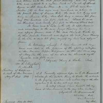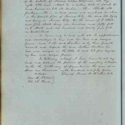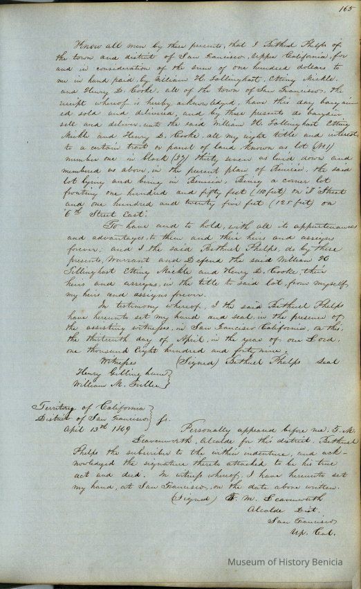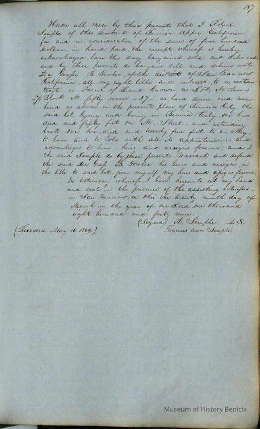 This journal/ledger contains the beginnings of Benicia including: lists and descriptions of first 12 houses in Benicia, a translation of the deed to General Vallejo by Manual Micheltorena, Governor of Calif. (1844); deed to Semple and Larkin by Vallejo (1847); deeds of properties sold by Semple and Larkin from 1847 - 1849