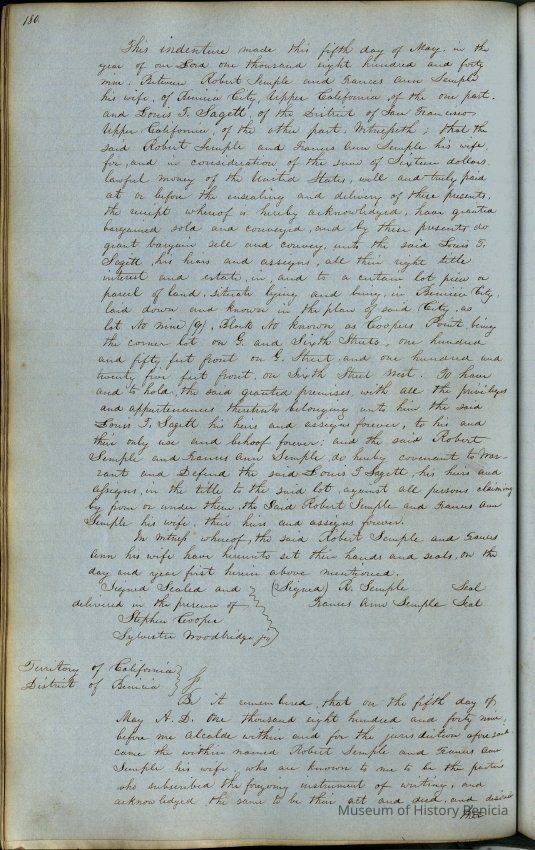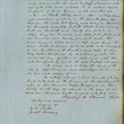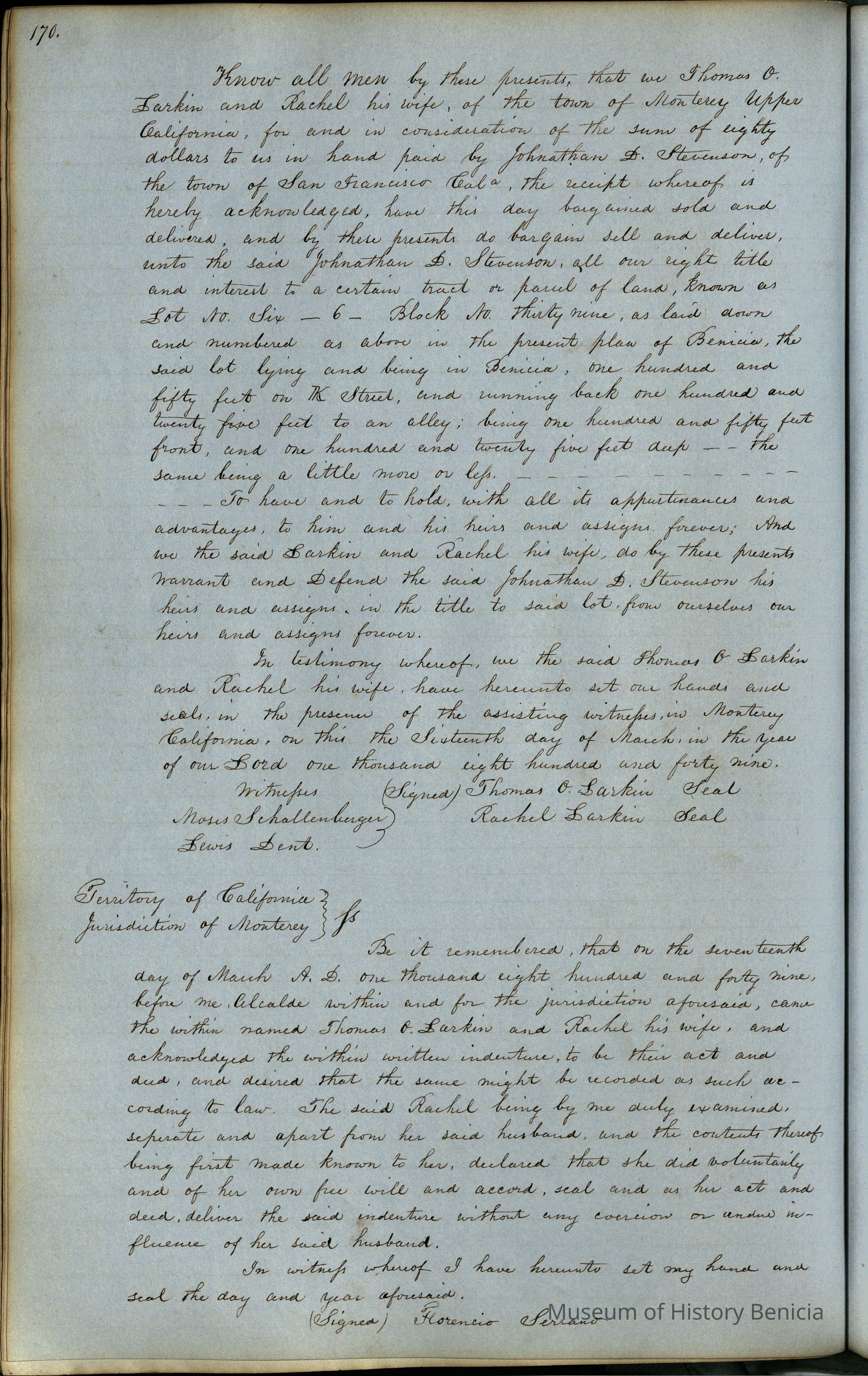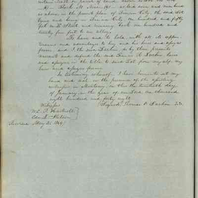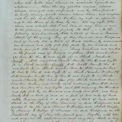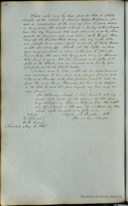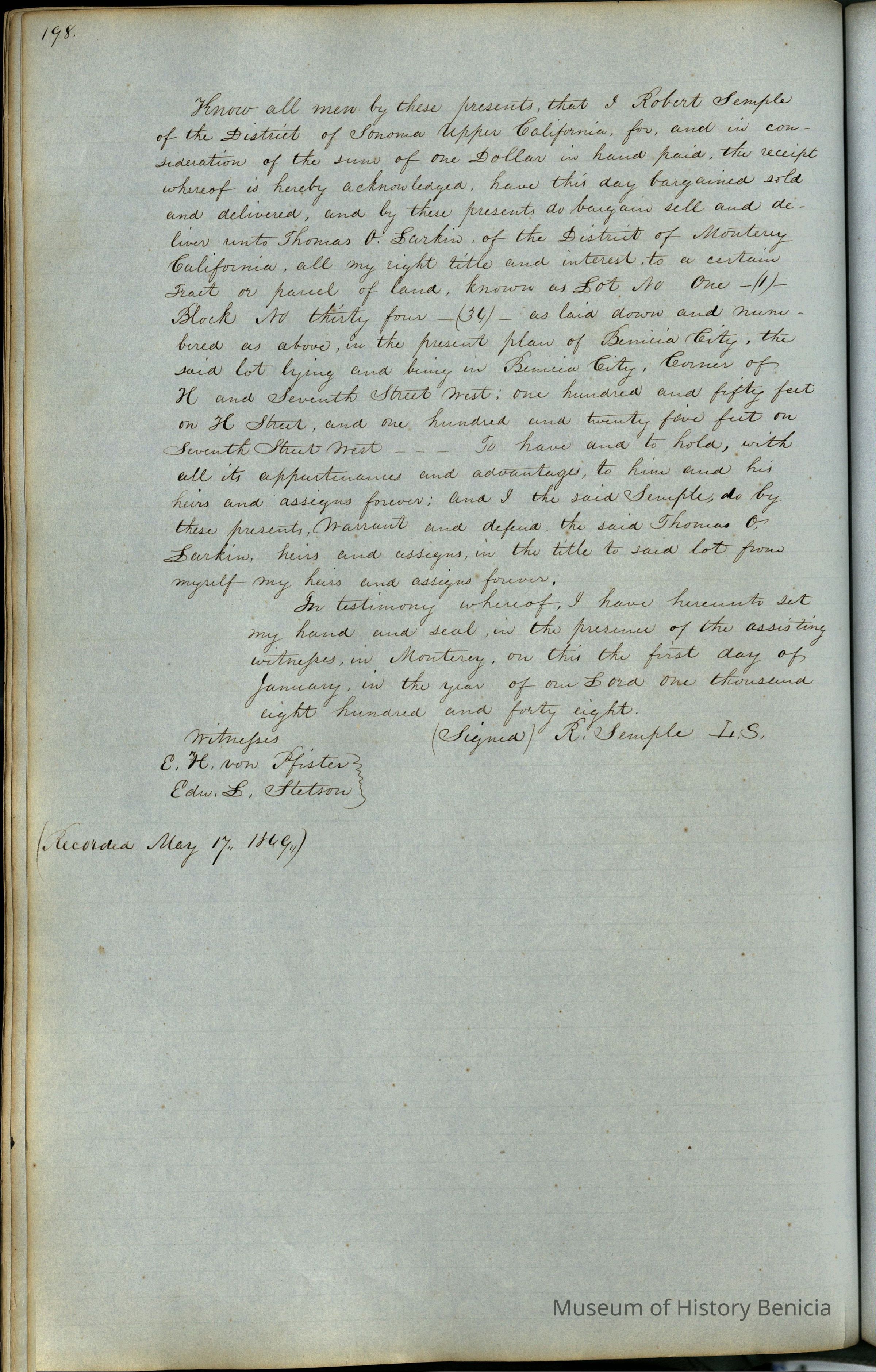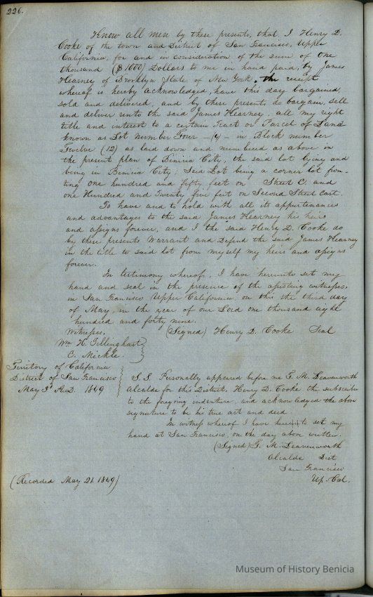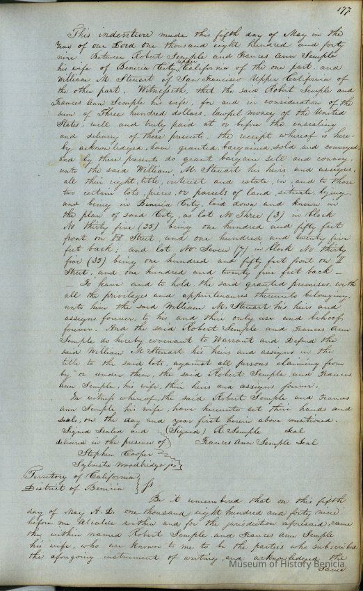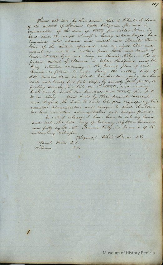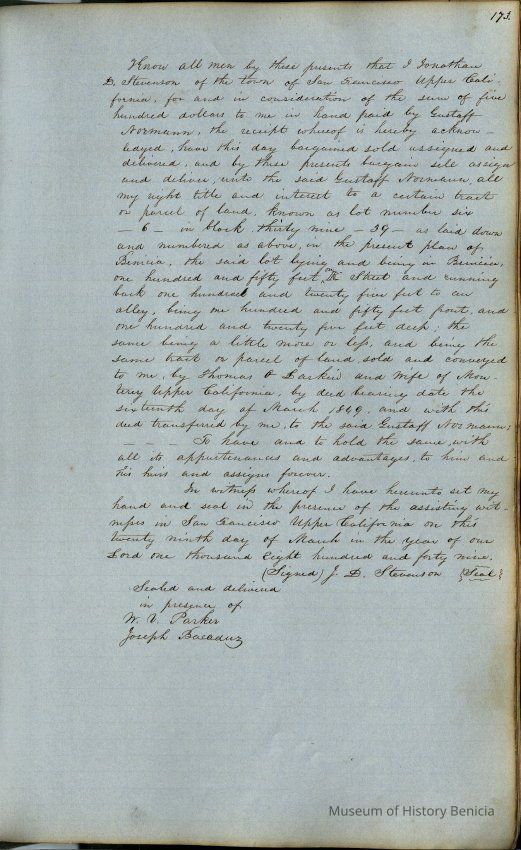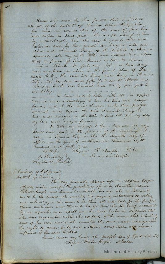 This journal/ledger contains the beginnings of Benicia including: lists and descriptions of first 12 houses in Benicia, a translation of the deed to General Vallejo by Manual Micheltorena, Governor of Calif. (1844); deed to Semple and Larkin by Vallejo (1847); deeds of properties sold by Semple and Larkin from 1847 - 1849