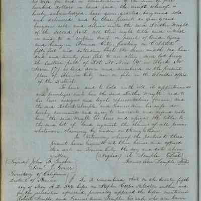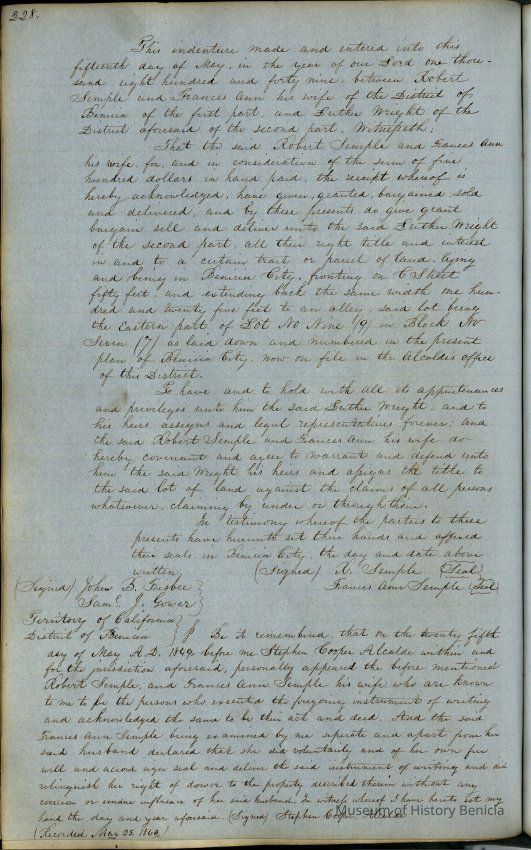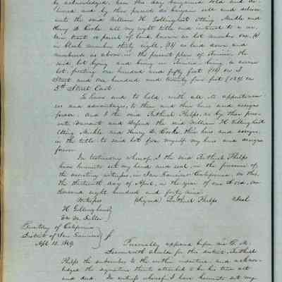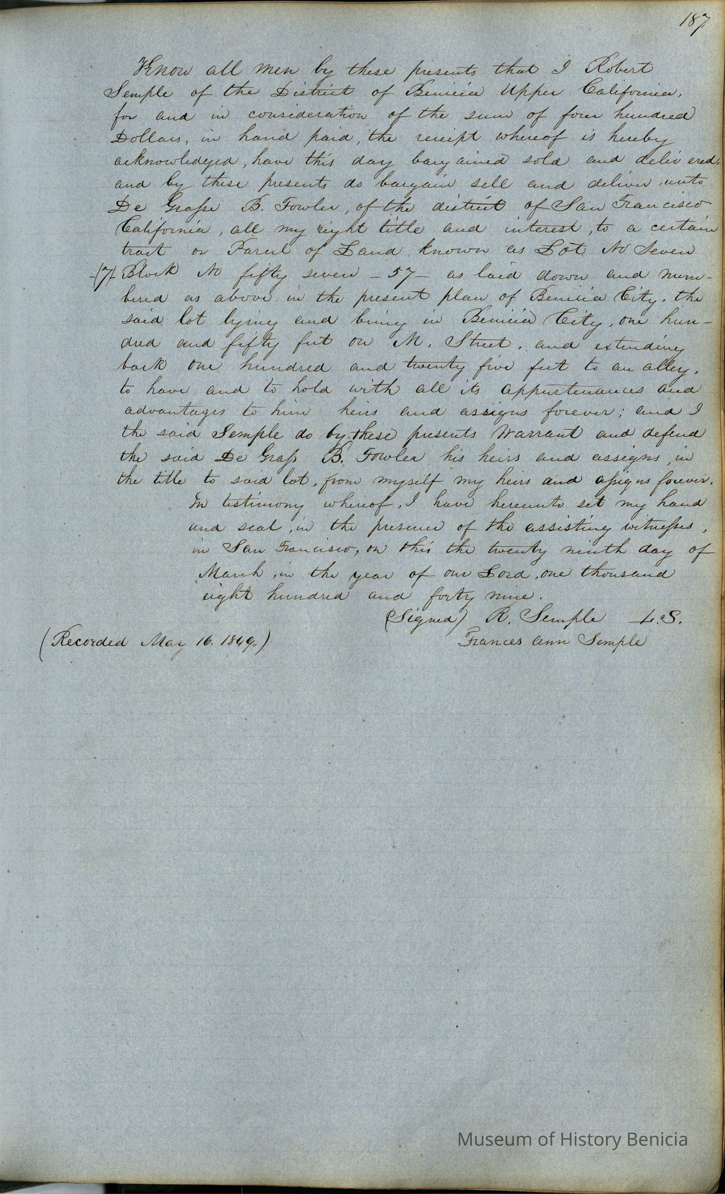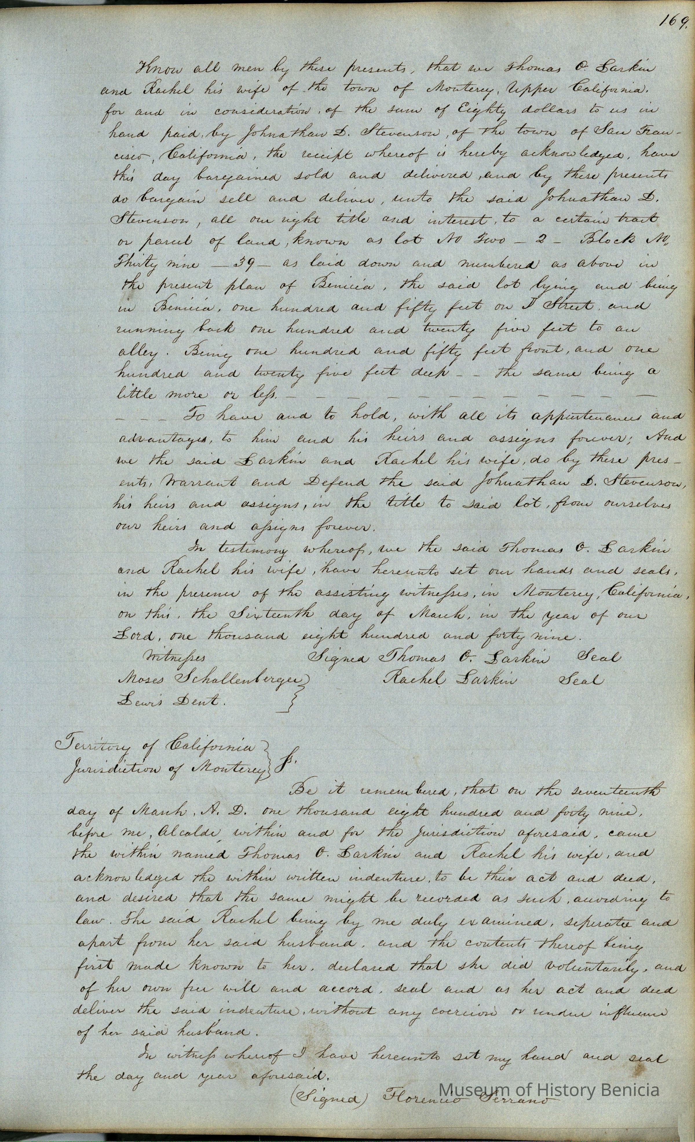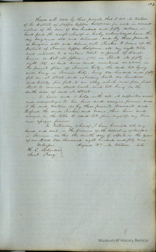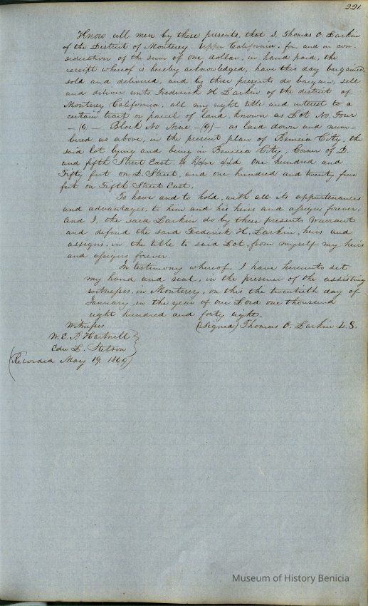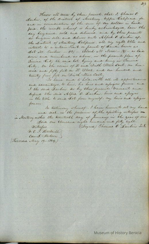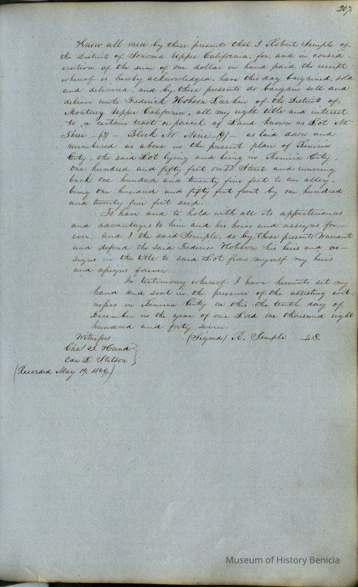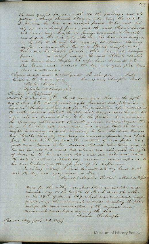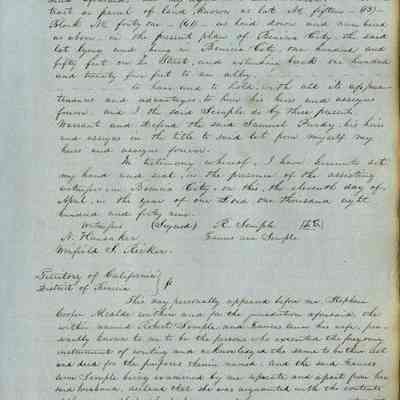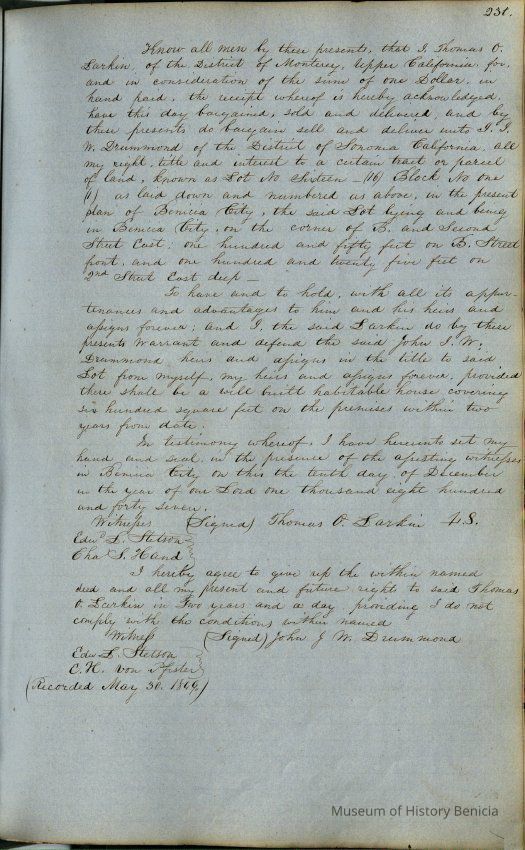 This journal/ledger contains the beginnings of Benicia including: lists and descriptions of first 12 houses in Benicia, a translation of the deed to General Vallejo by Manual Micheltorena, Governor of Calif. (1844); deed to Semple and Larkin by Vallejo (1847); deeds of properties sold by Semple and Larkin from 1847 - 1849