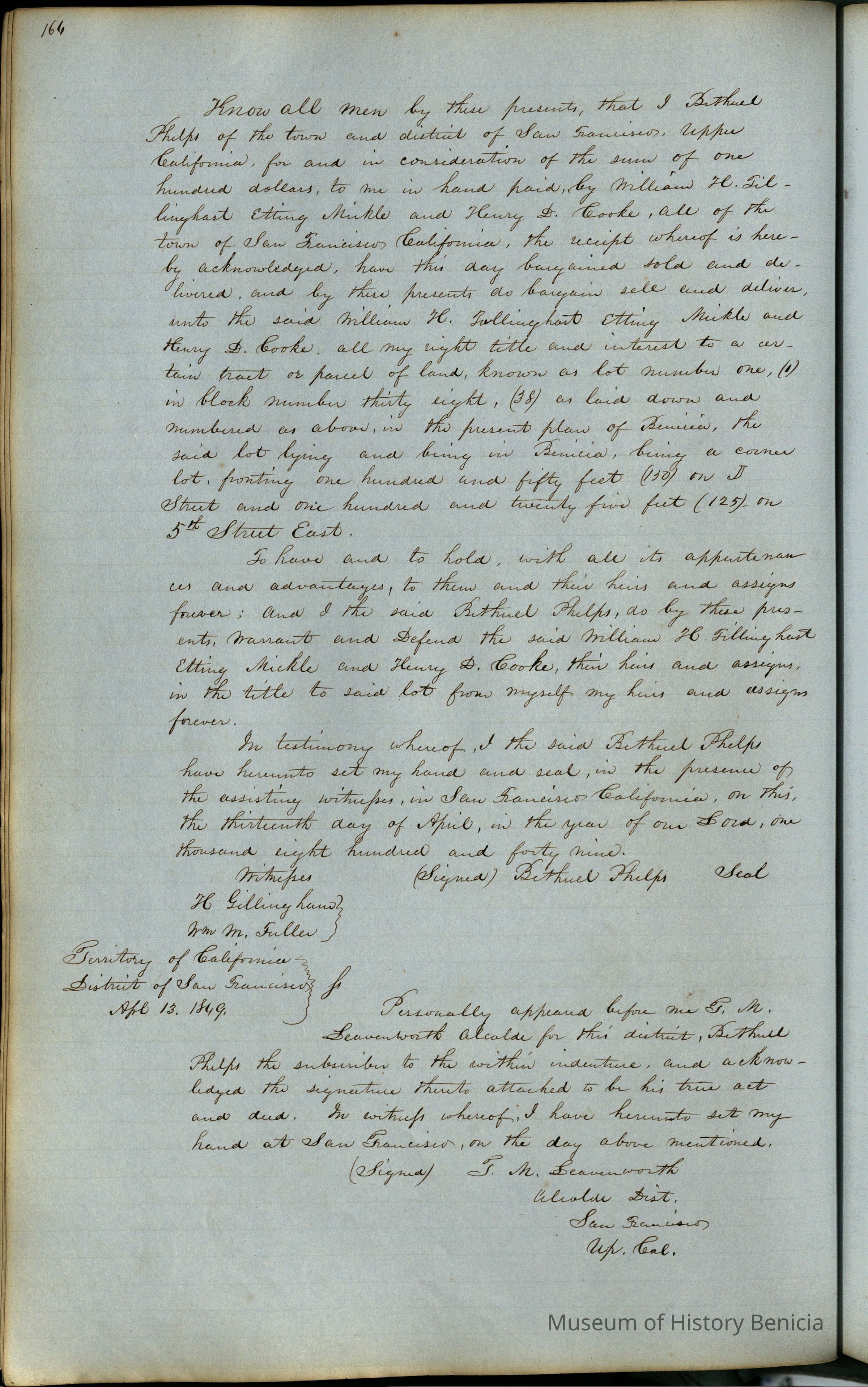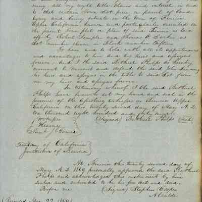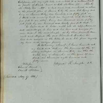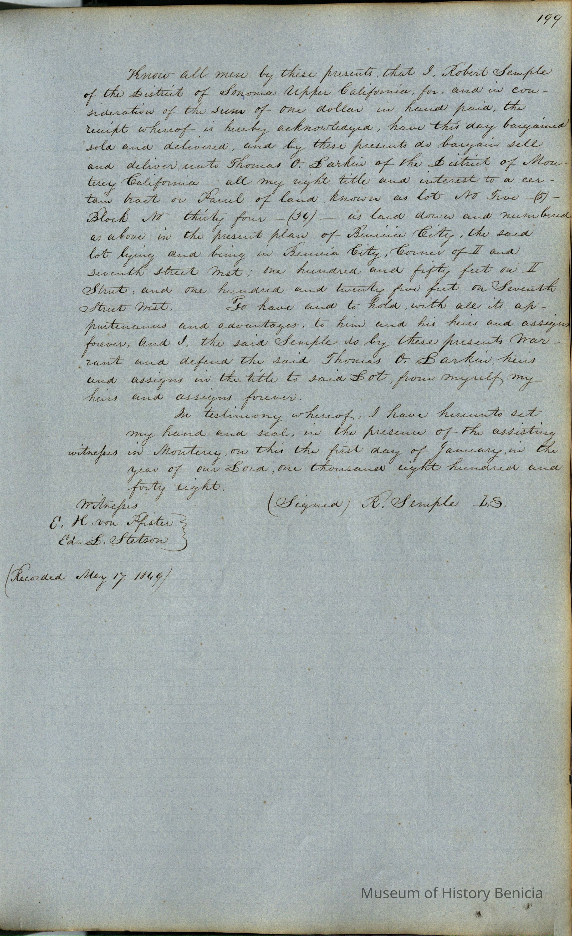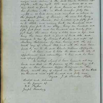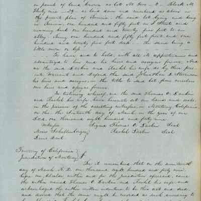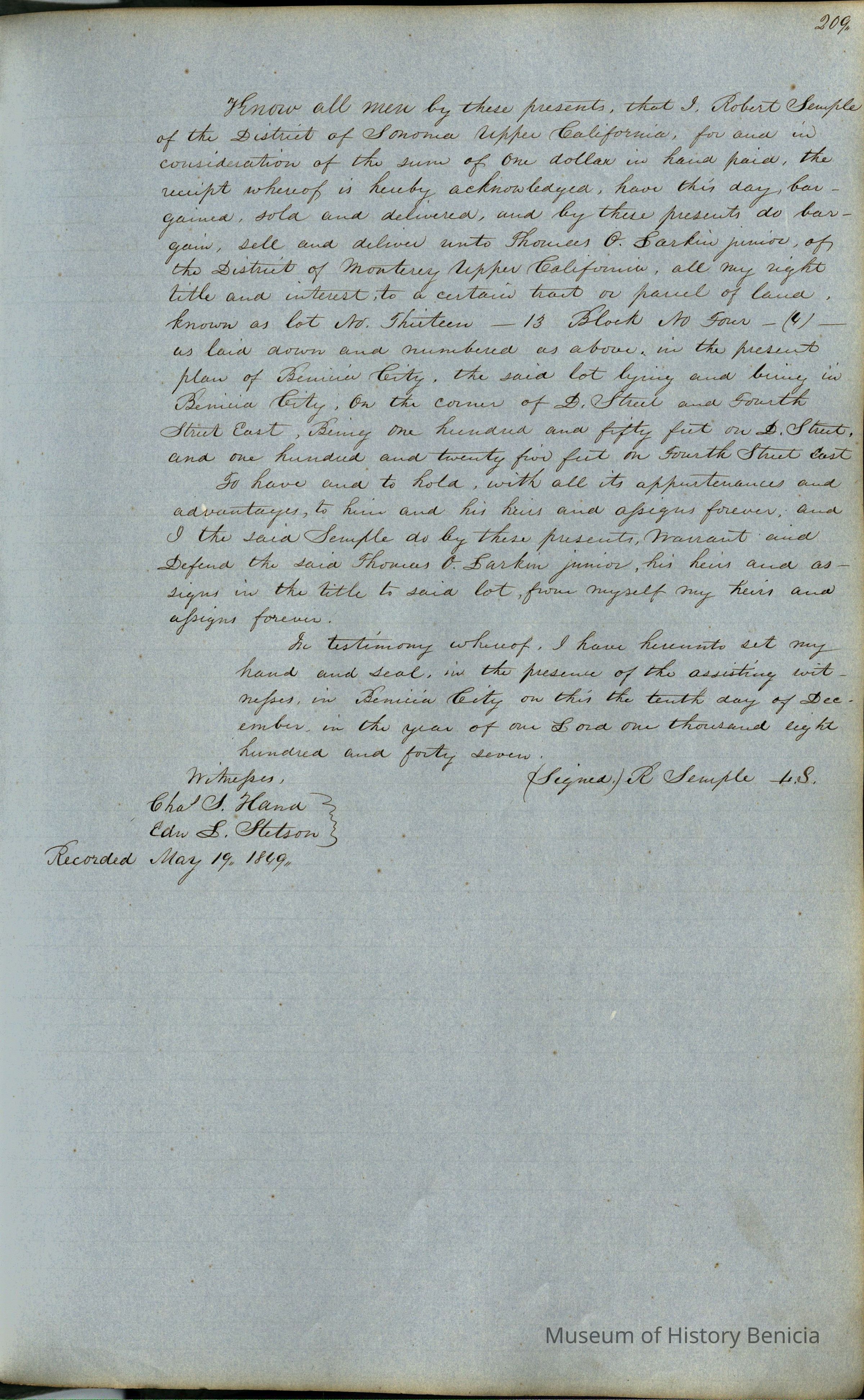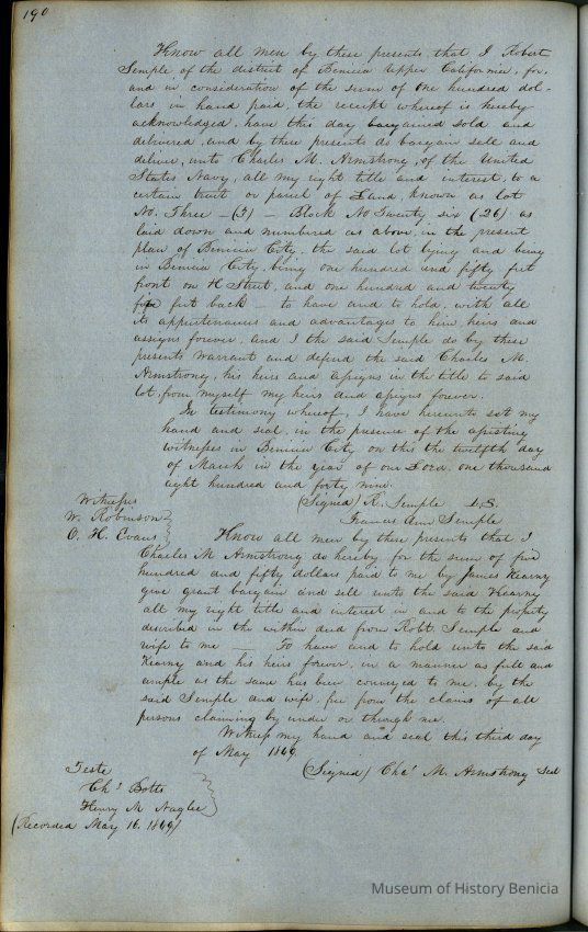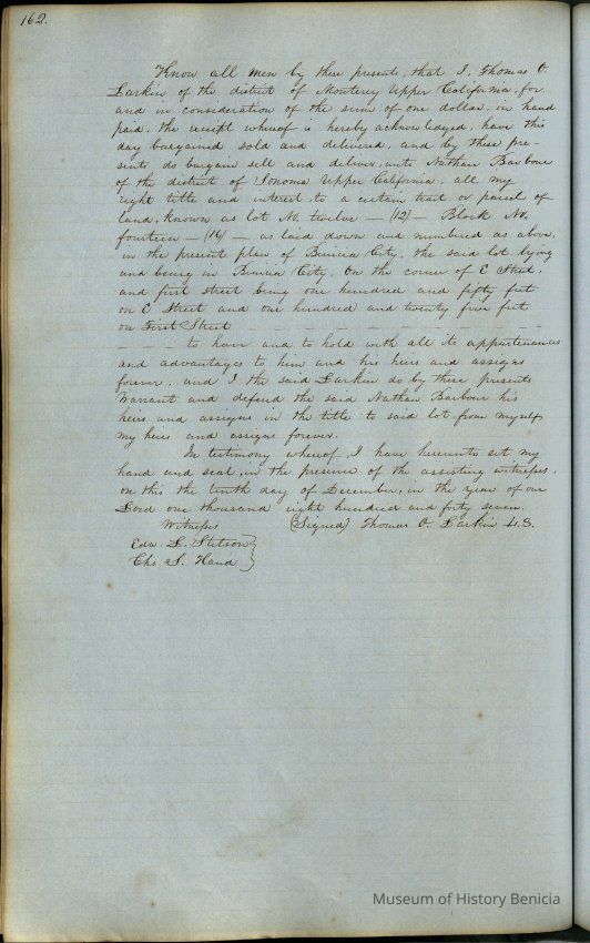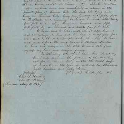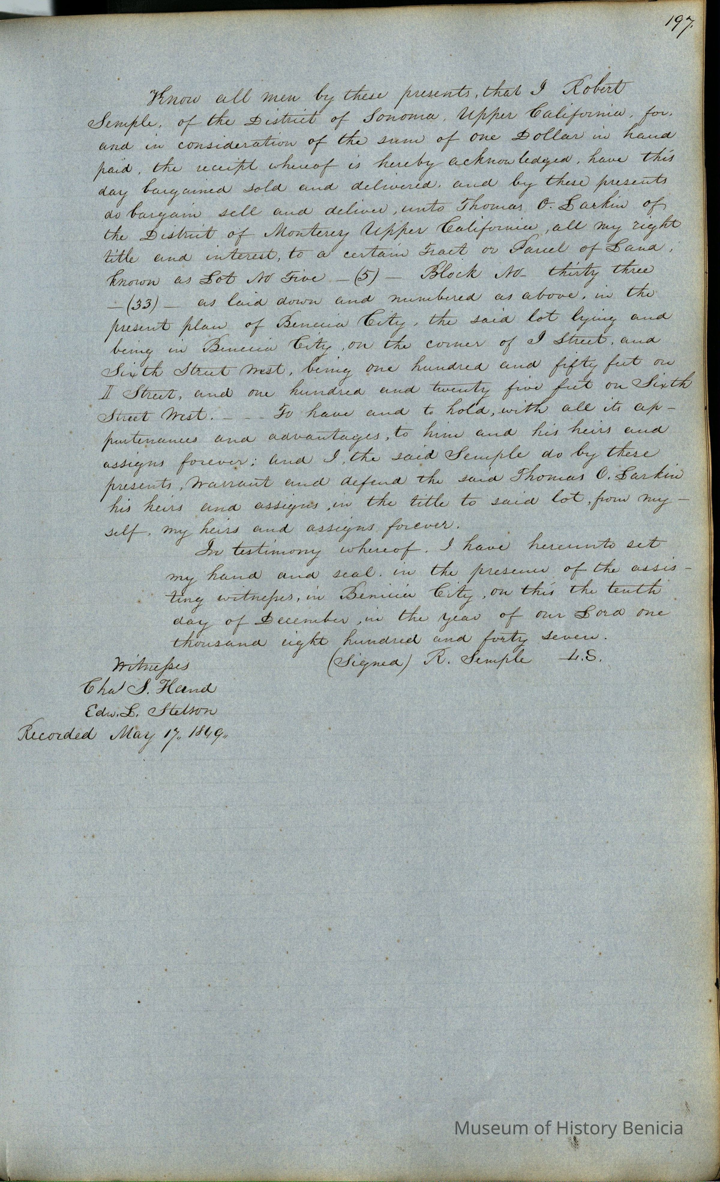 This journal/ledger contains the beginnings of Benicia including: lists and descriptions of first 12 houses in Benicia, a translation of the deed to General Vallejo by Manual Micheltorena, Governor of Calif. (1844); deed to Semple and Larkin by Vallejo (1847); deeds of properties sold by Semple and Larkin from 1847 - 1849