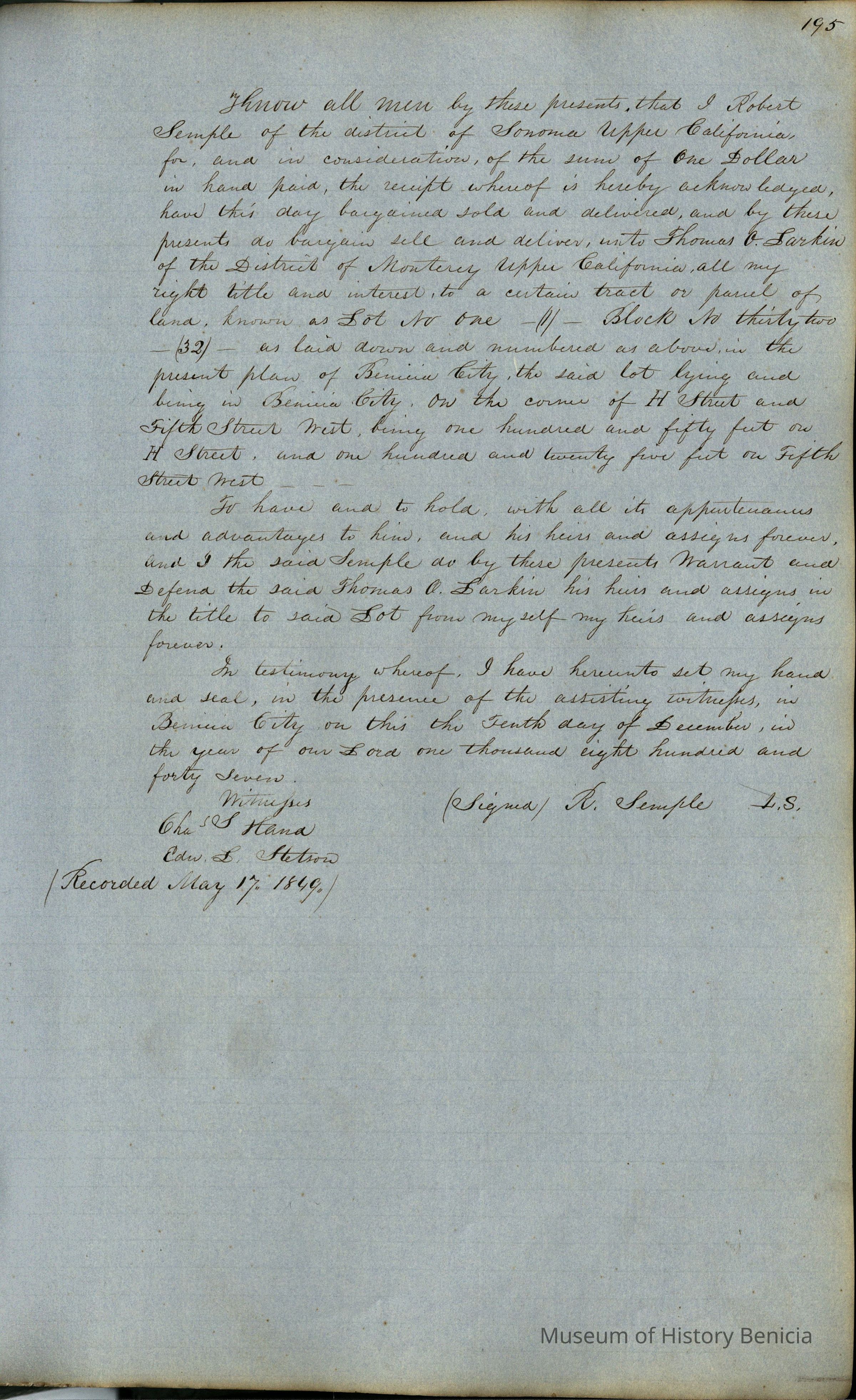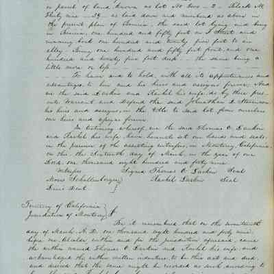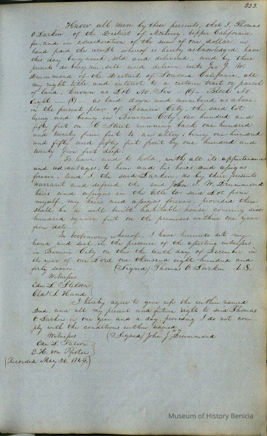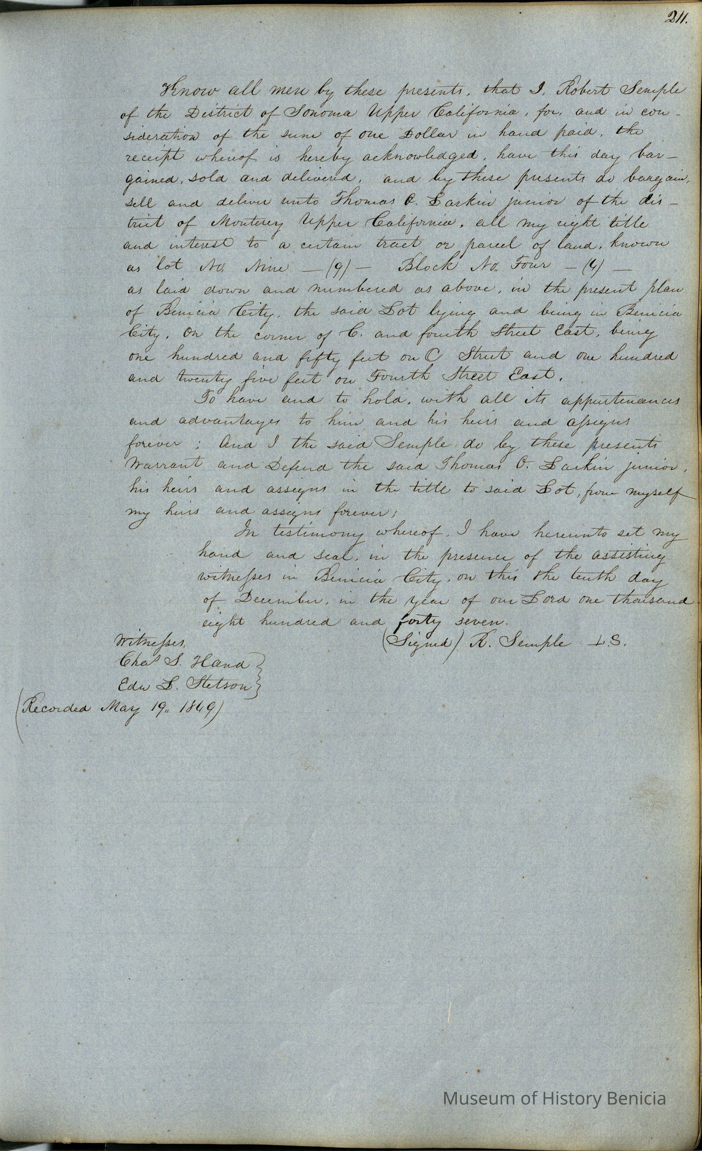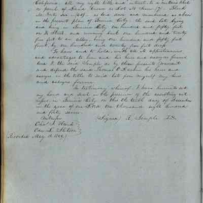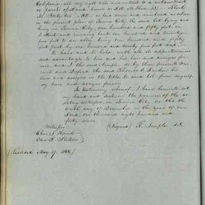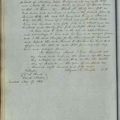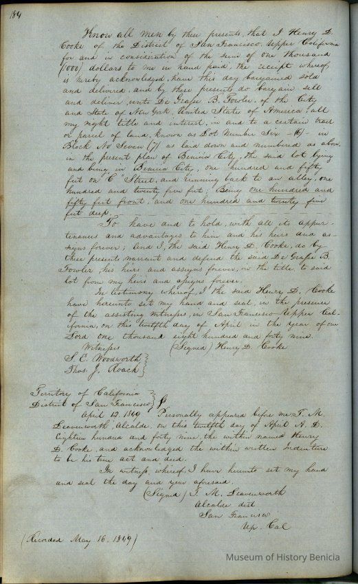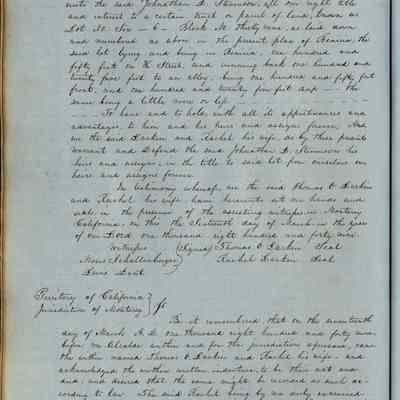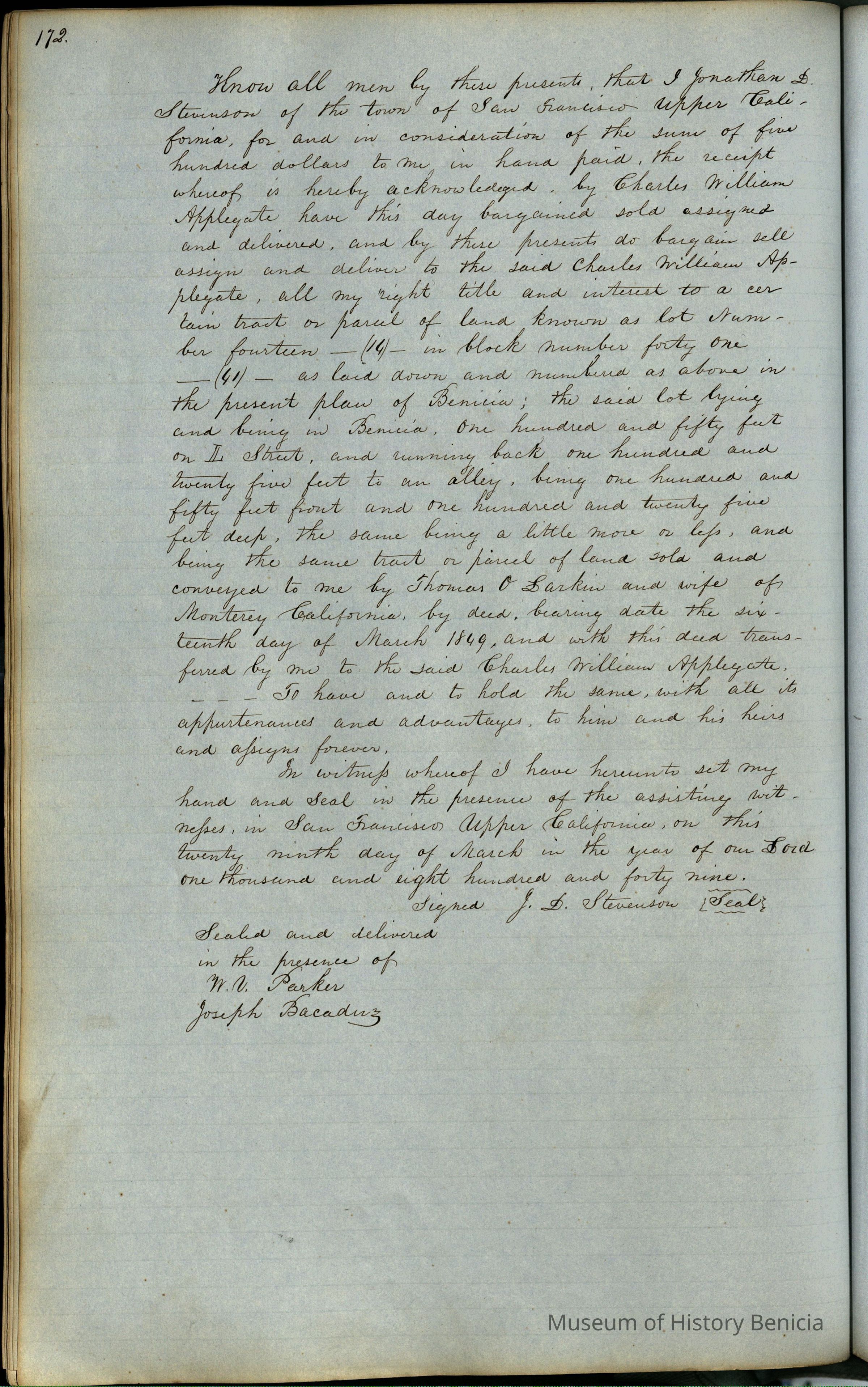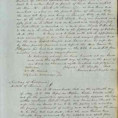 This journal/ledger contains the beginnings of Benicia including: lists and descriptions of first 12 houses in Benicia, a translation of the deed to General Vallejo by Manual Micheltorena, Governor of Calif. (1844); deed to Semple and Larkin by Vallejo (1847); deeds of properties sold by Semple and Larkin from 1847 - 1849