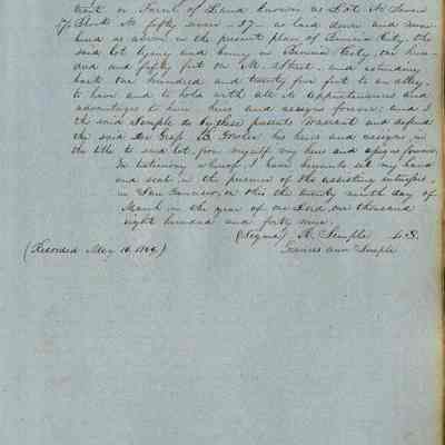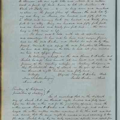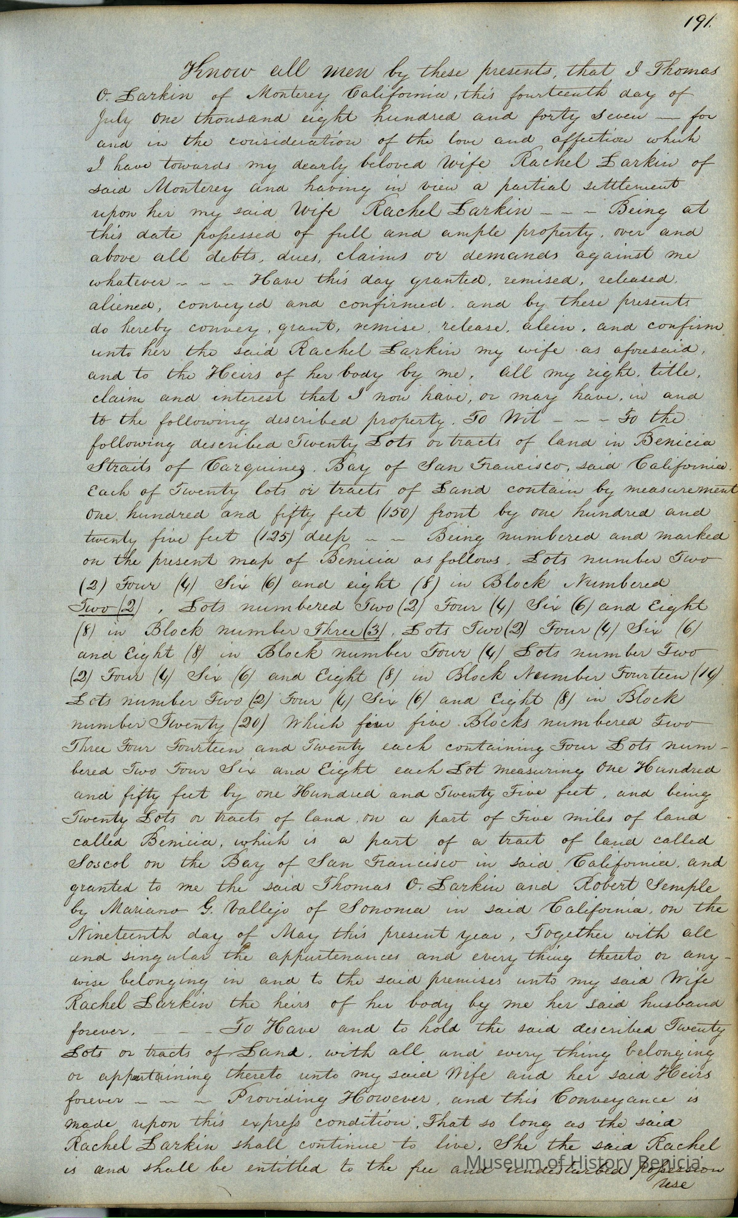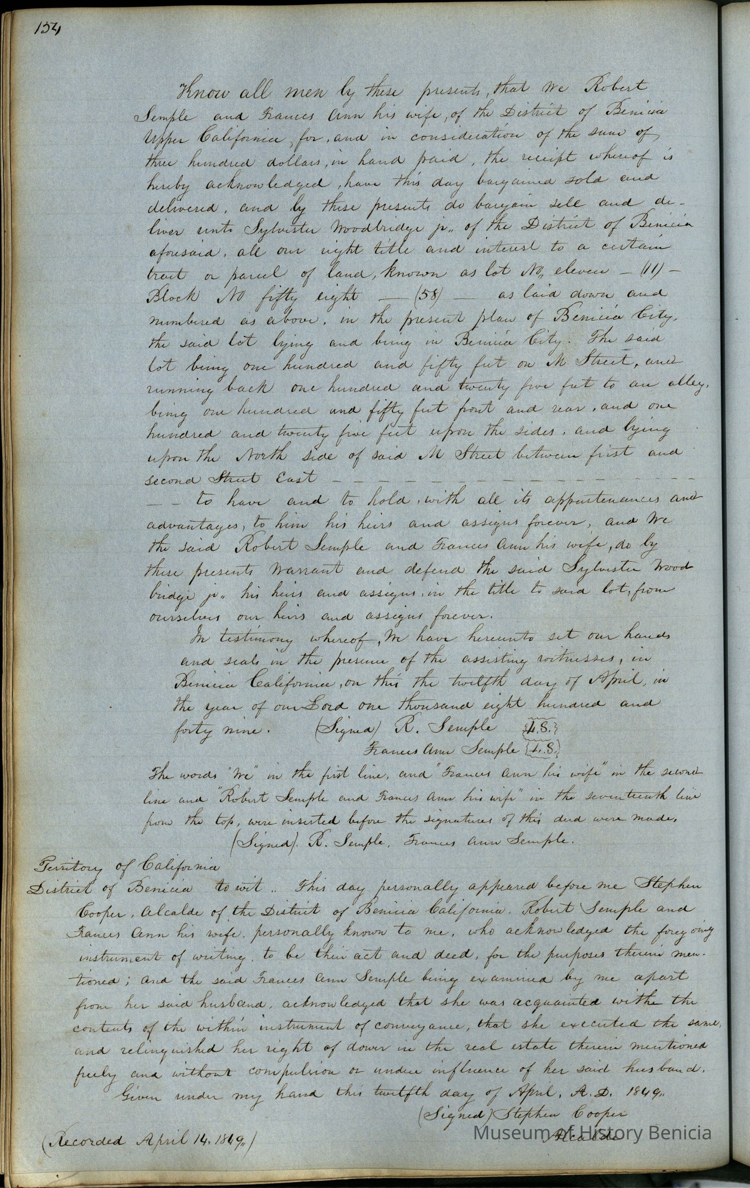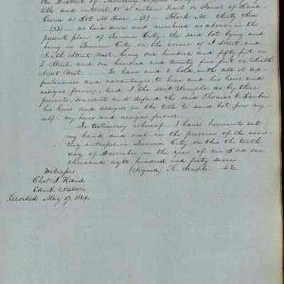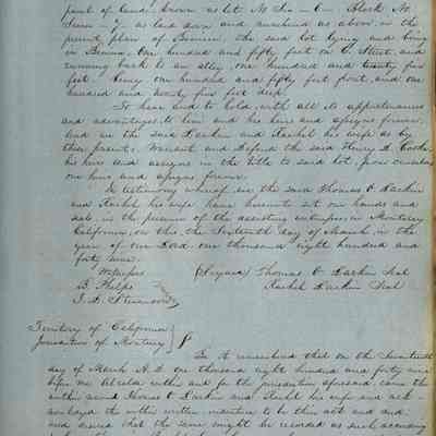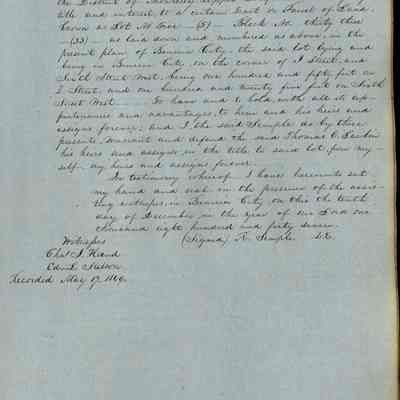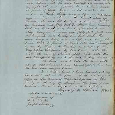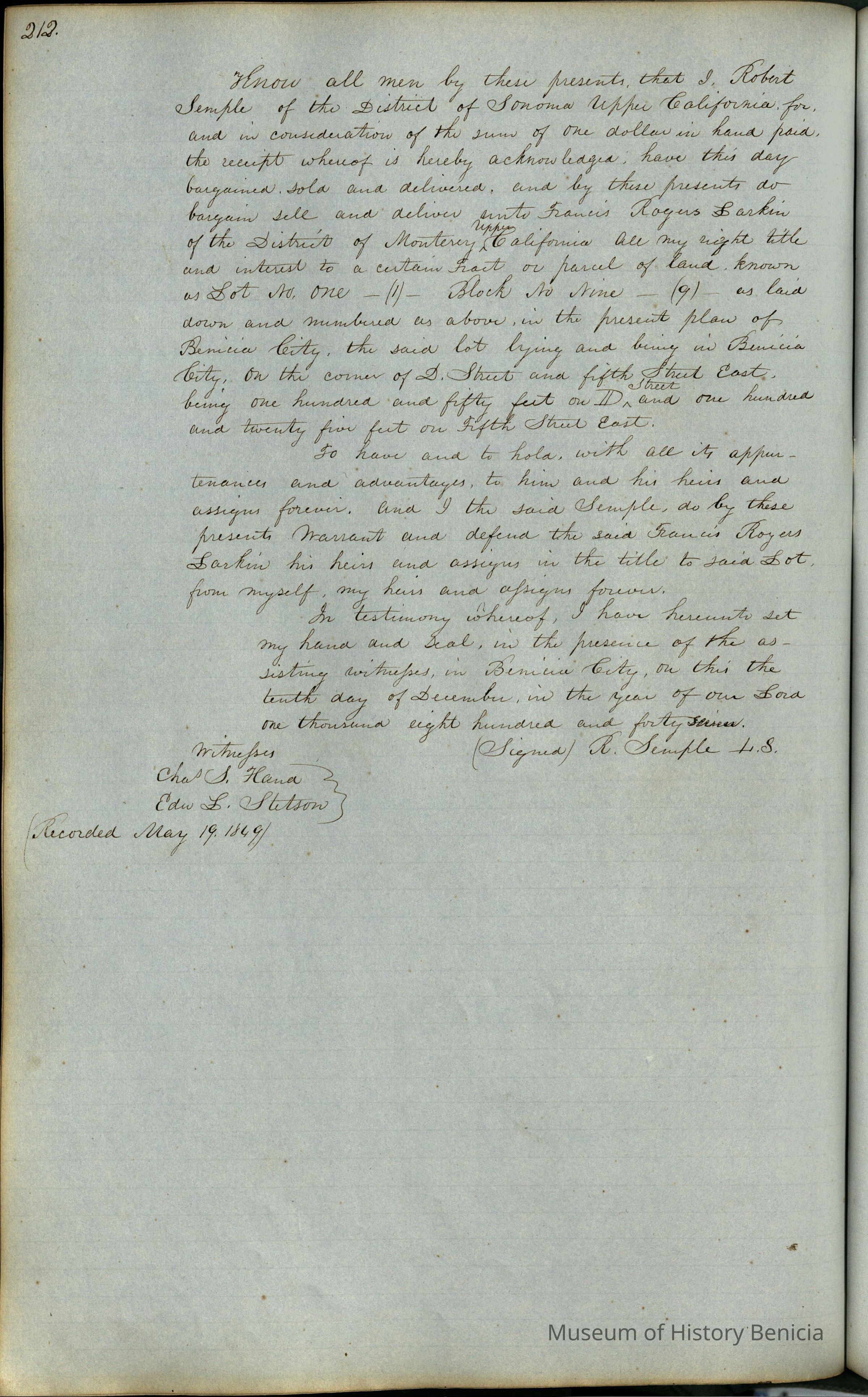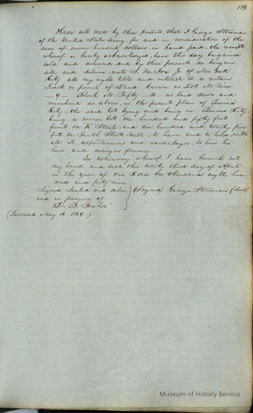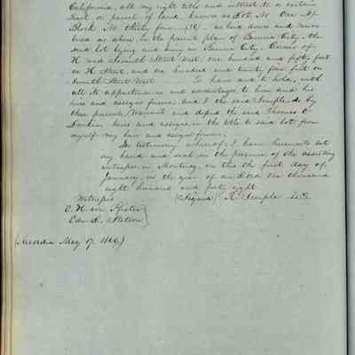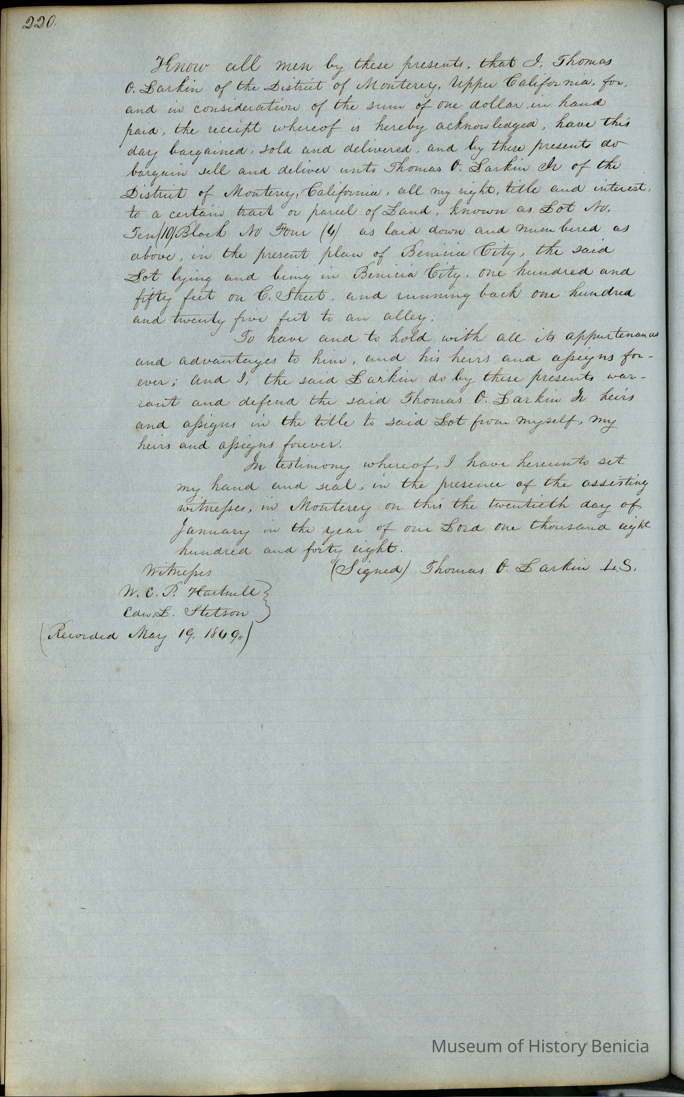 This journal/ledger contains the beginnings of Benicia including: lists and descriptions of first 12 houses in Benicia, a translation of the deed to General Vallejo by Manual Micheltorena, Governor of Calif. (1844); deed to Semple and Larkin by Vallejo (1847); deeds of properties sold by Semple and Larkin from 1847 - 1849
