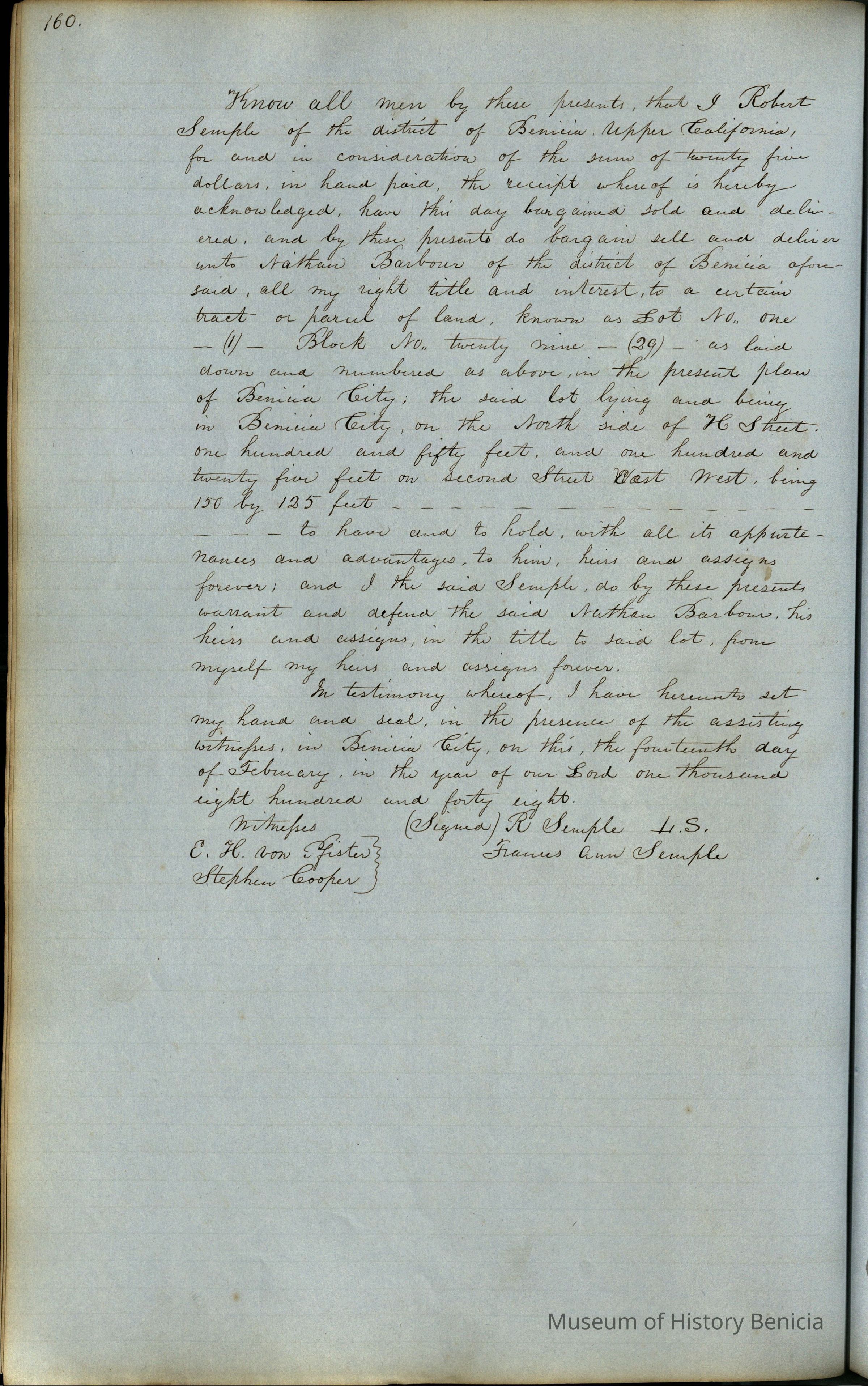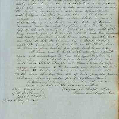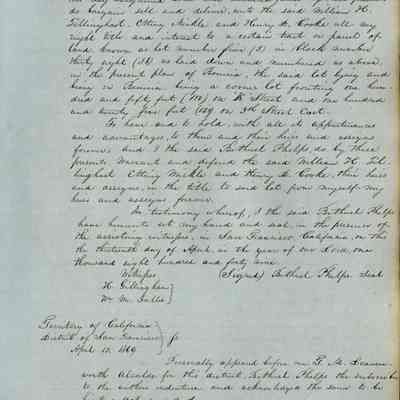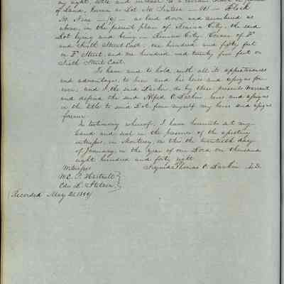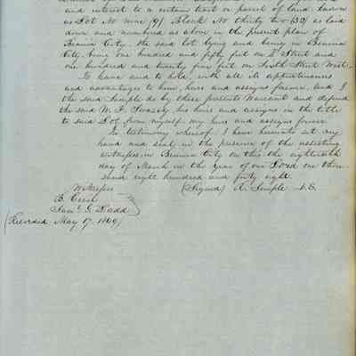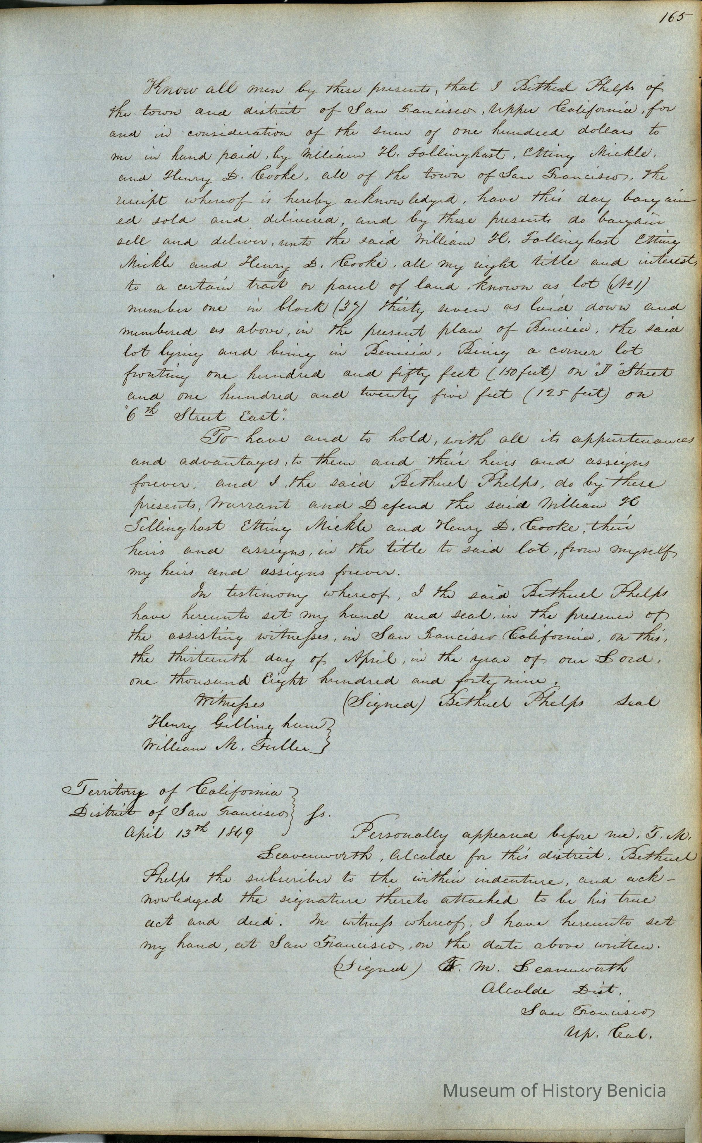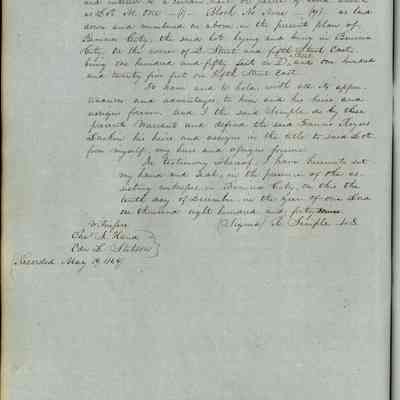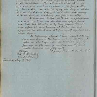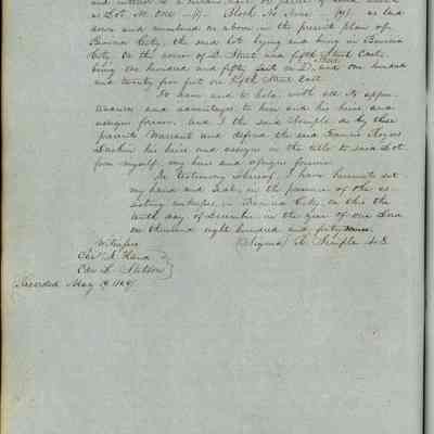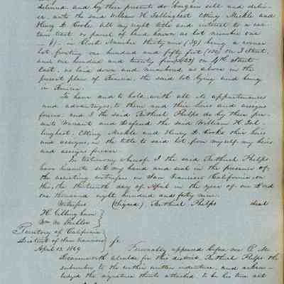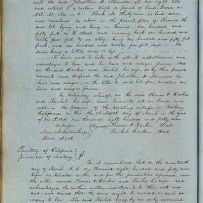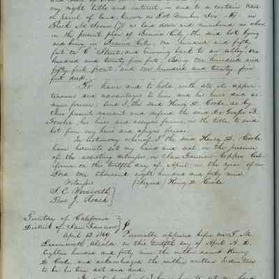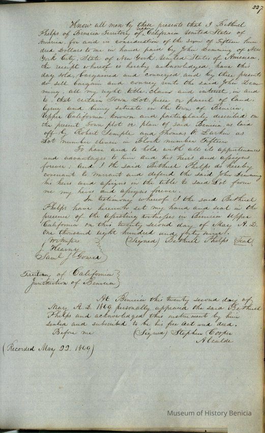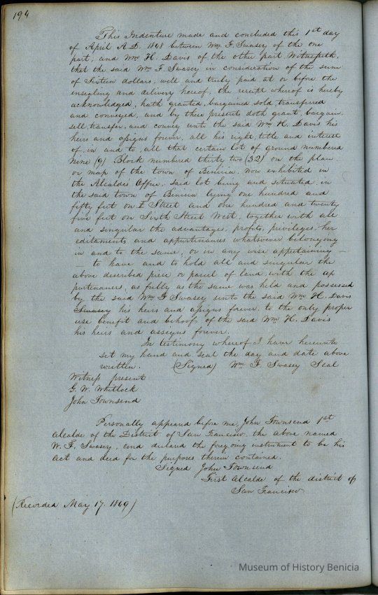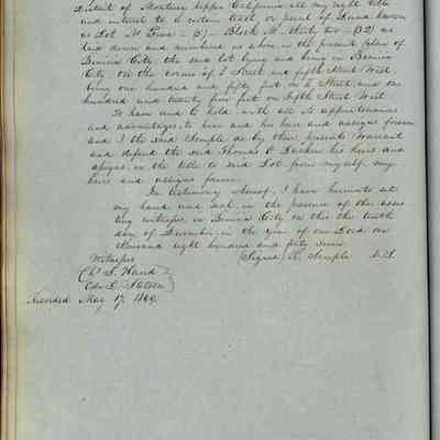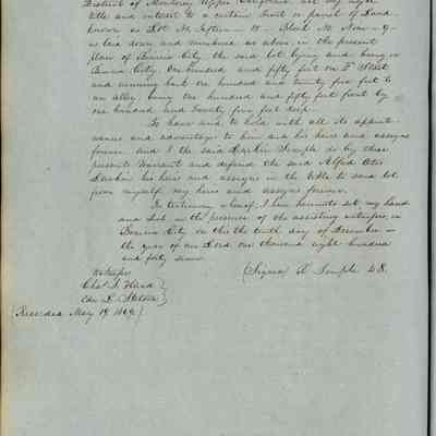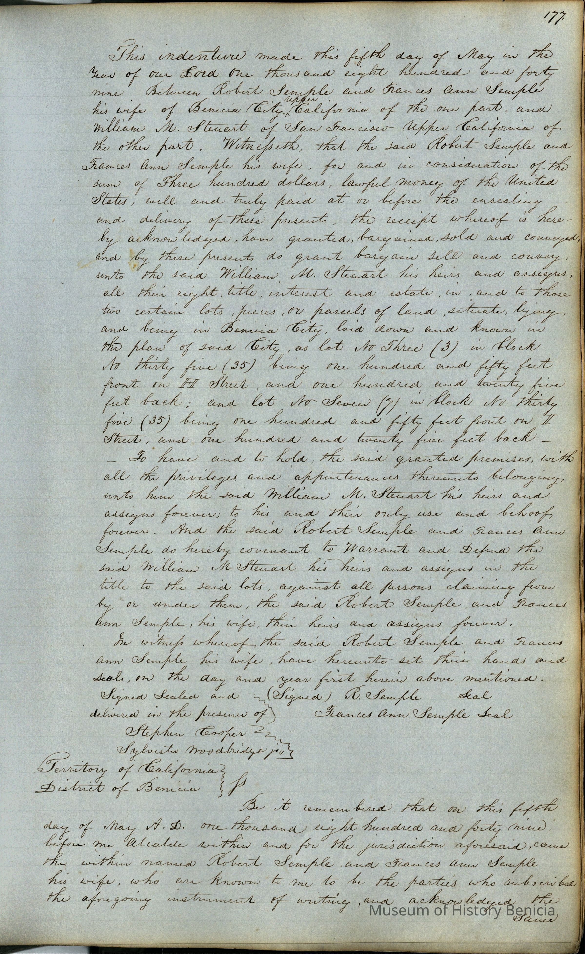 This journal/ledger contains the beginnings of Benicia including: lists and descriptions of first 12 houses in Benicia, a translation of the deed to General Vallejo by Manual Micheltorena, Governor of Calif. (1844); deed to Semple and Larkin by Vallejo (1847); deeds of properties sold by Semple and Larkin from 1847 - 1849