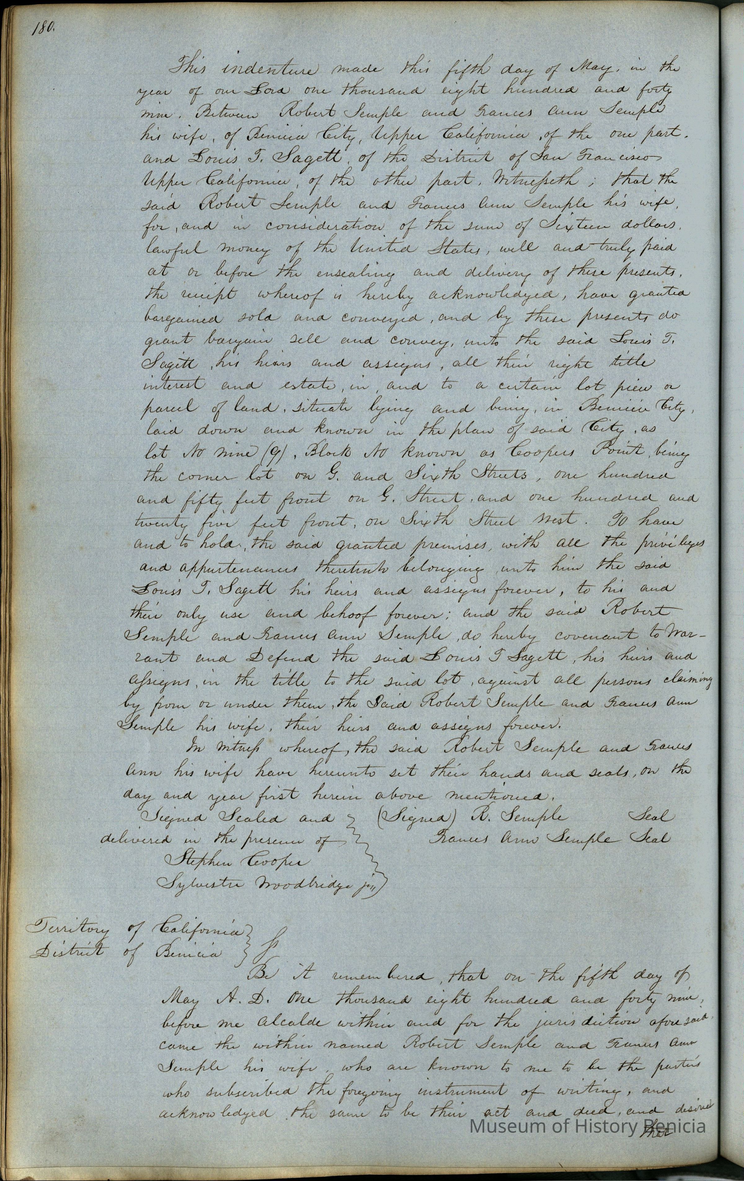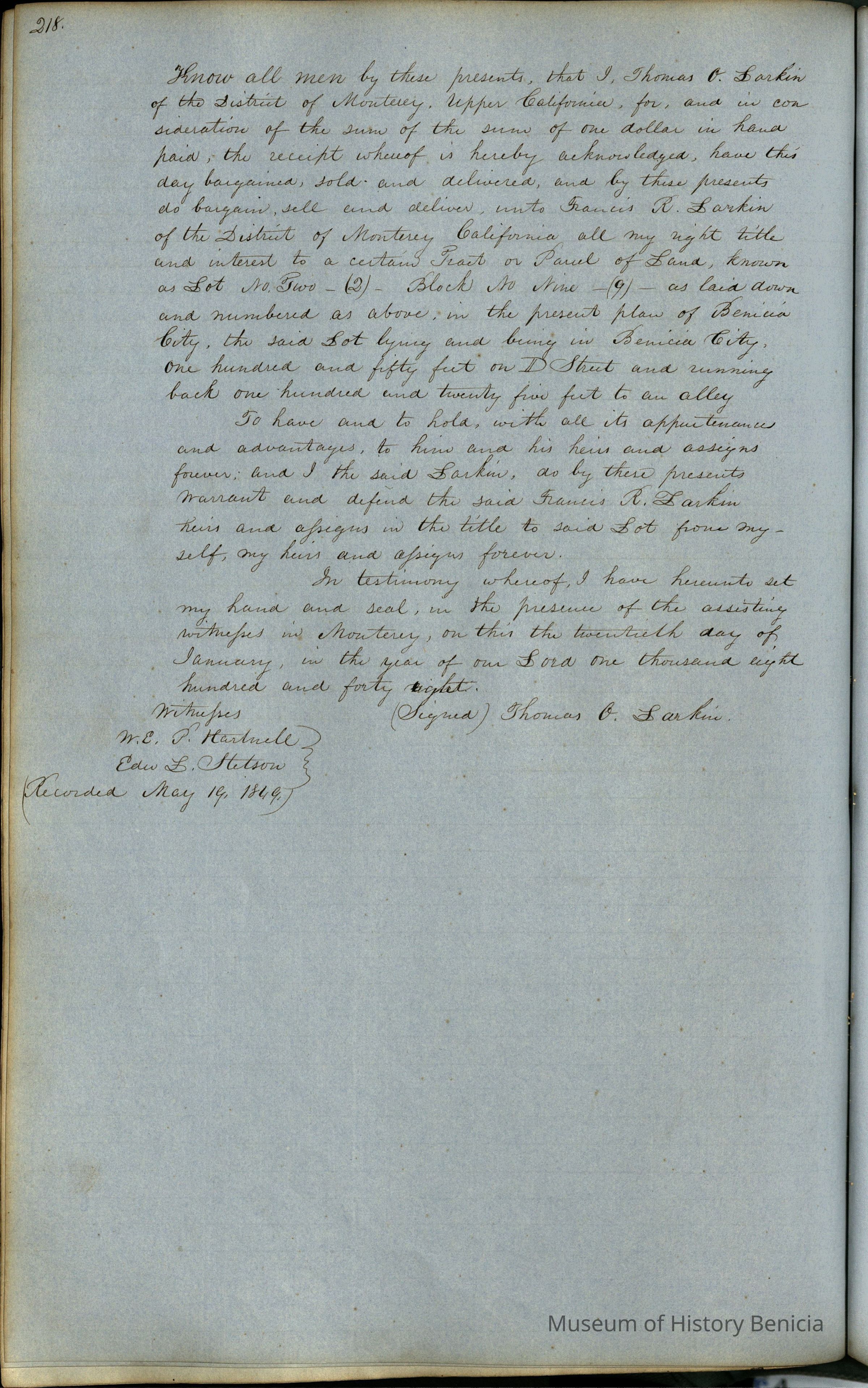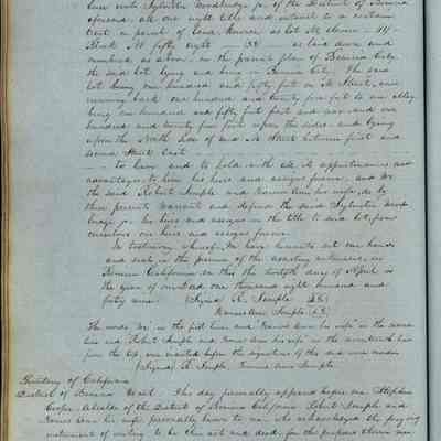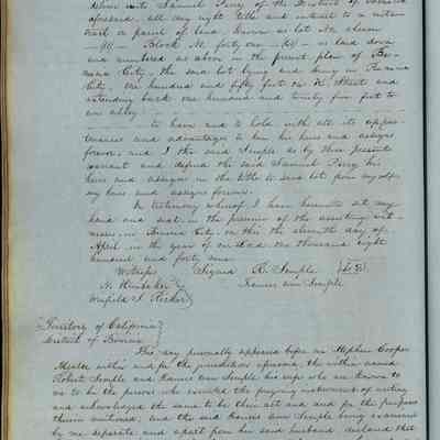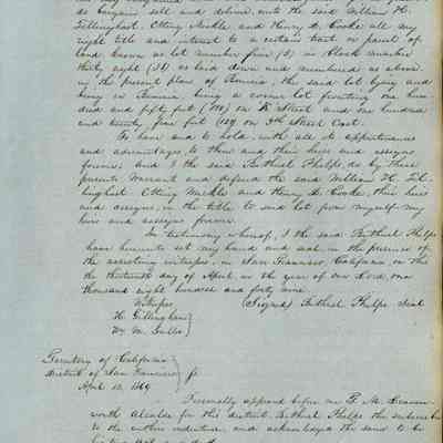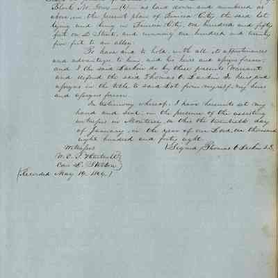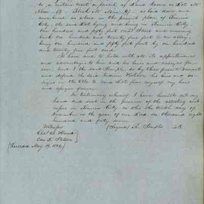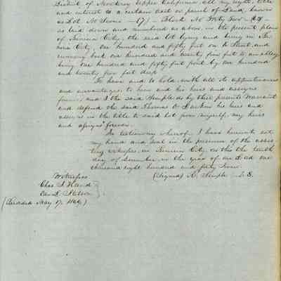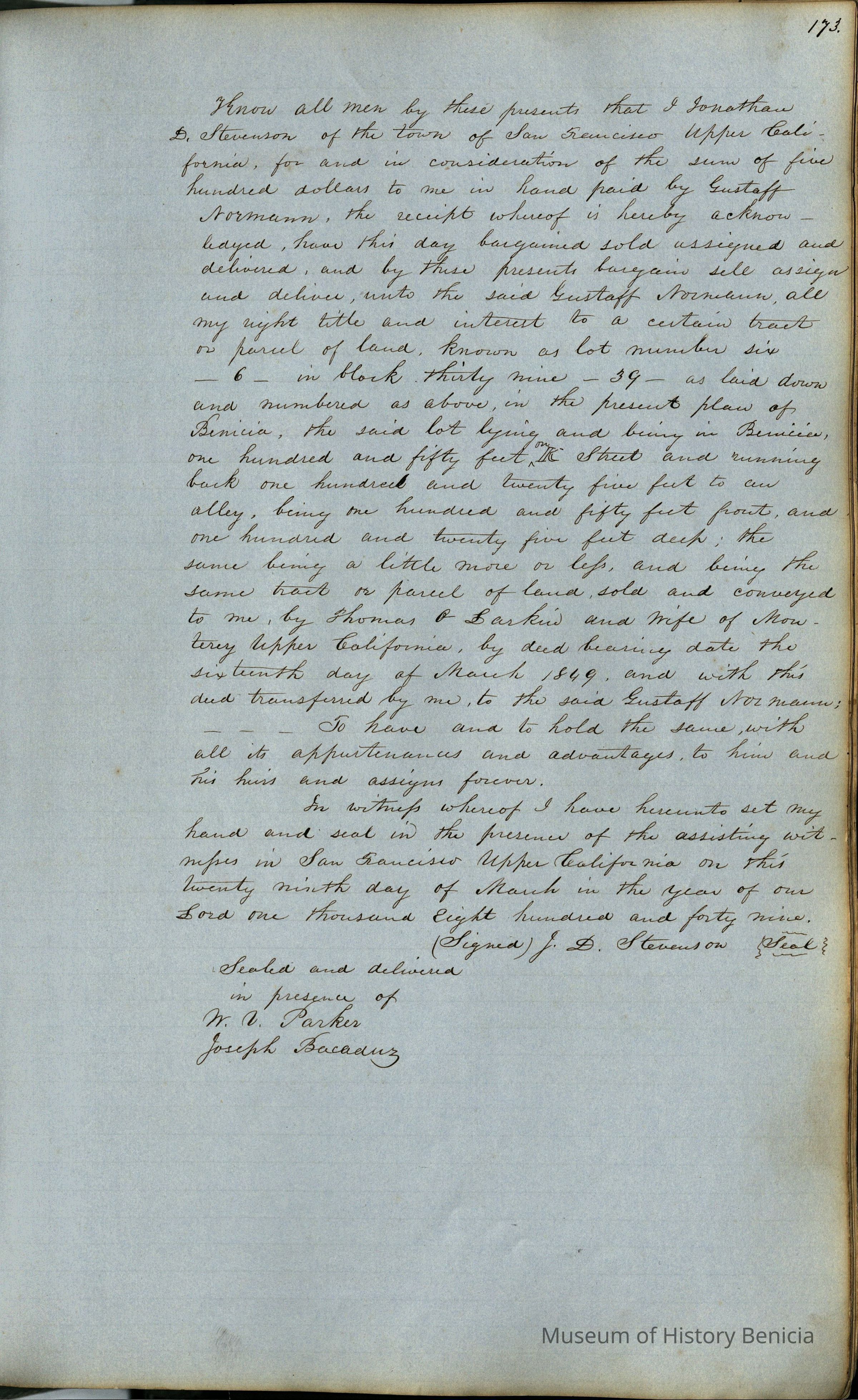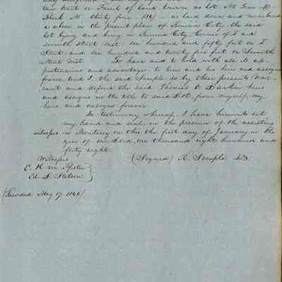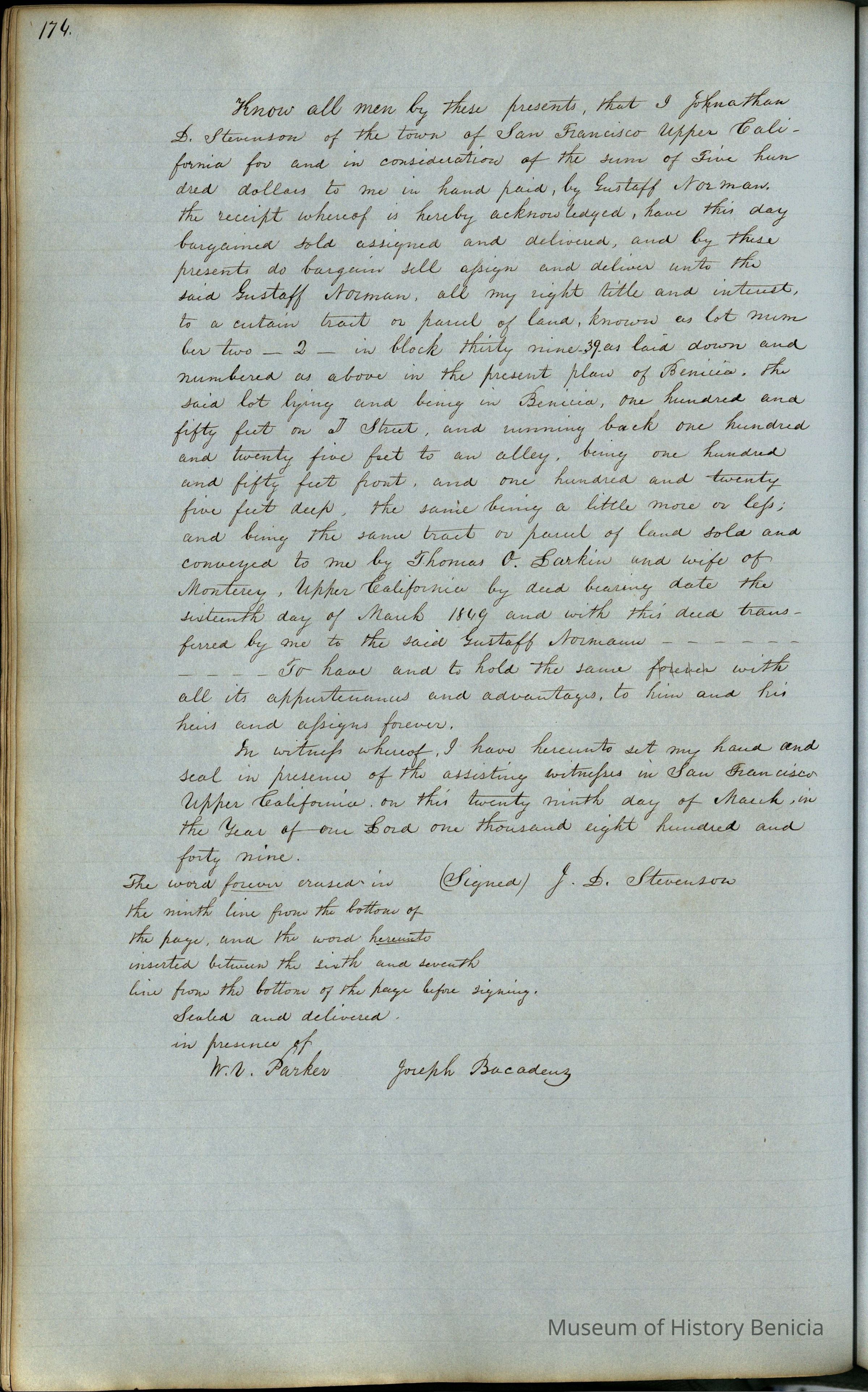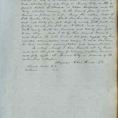 This journal/ledger contains the beginnings of Benicia including: lists and descriptions of first 12 houses in Benicia, a translation of the deed to General Vallejo by Manual Micheltorena, Governor of Calif. (1844); deed to Semple and Larkin by Vallejo (1847); deeds of properties sold by Semple and Larkin from 1847 - 1849