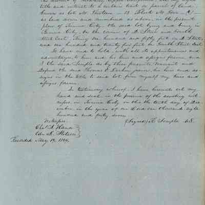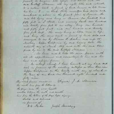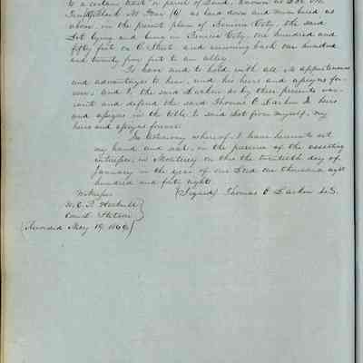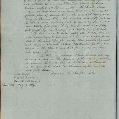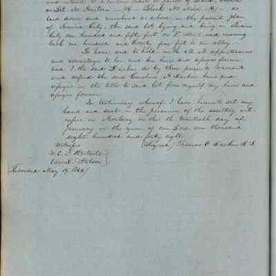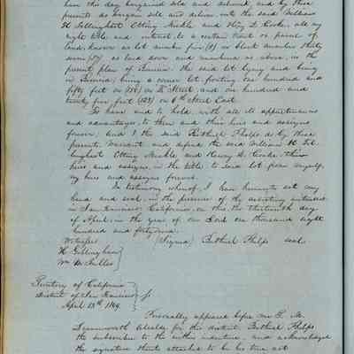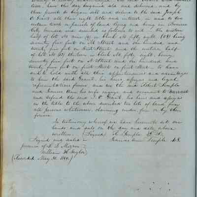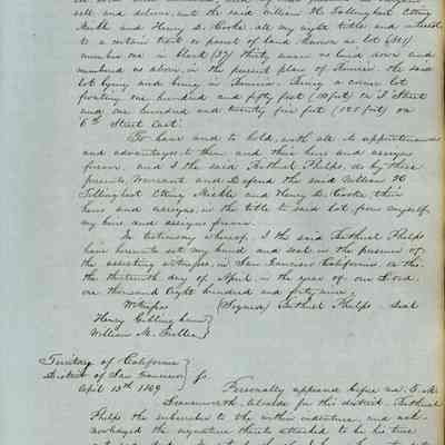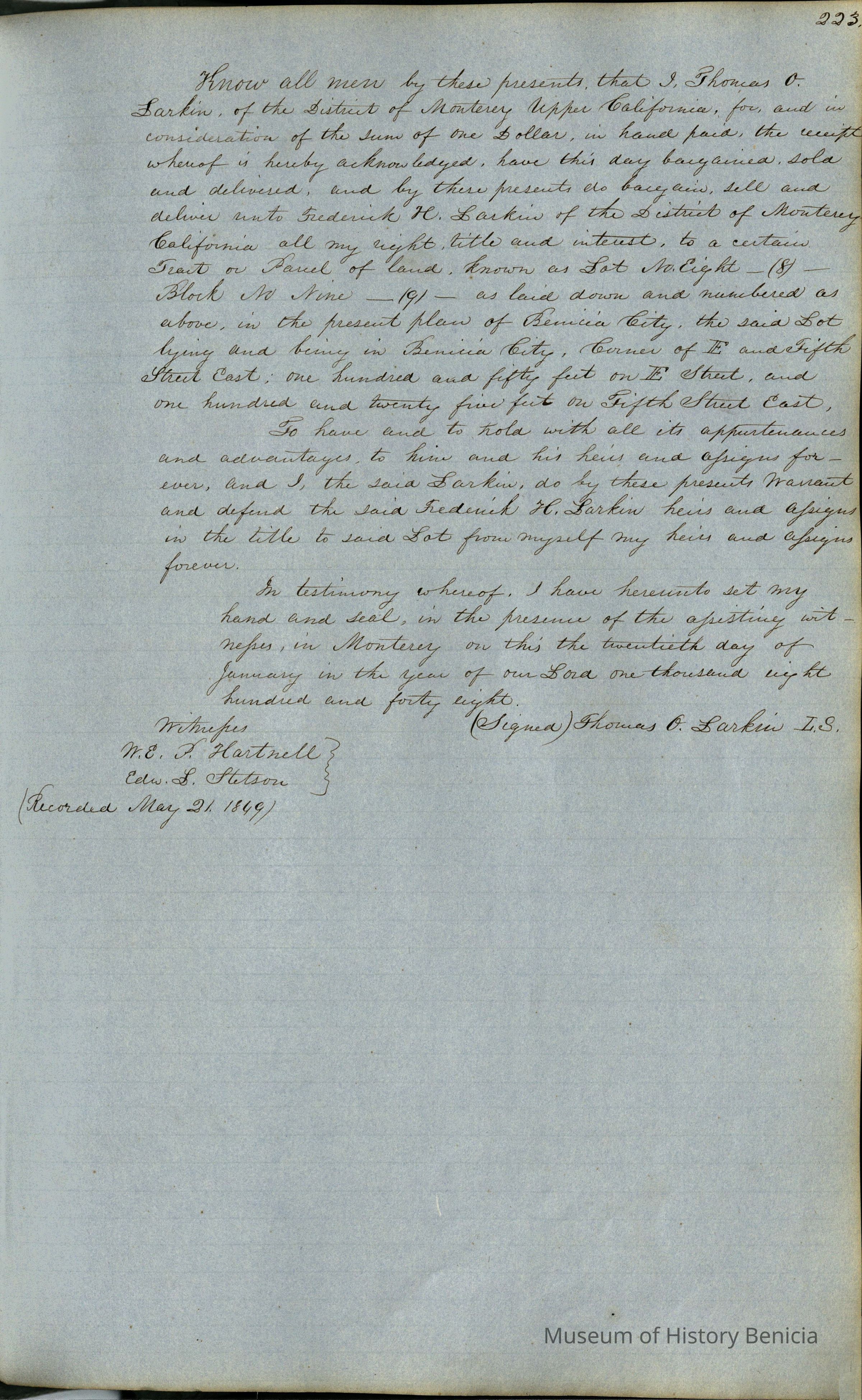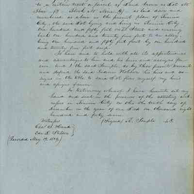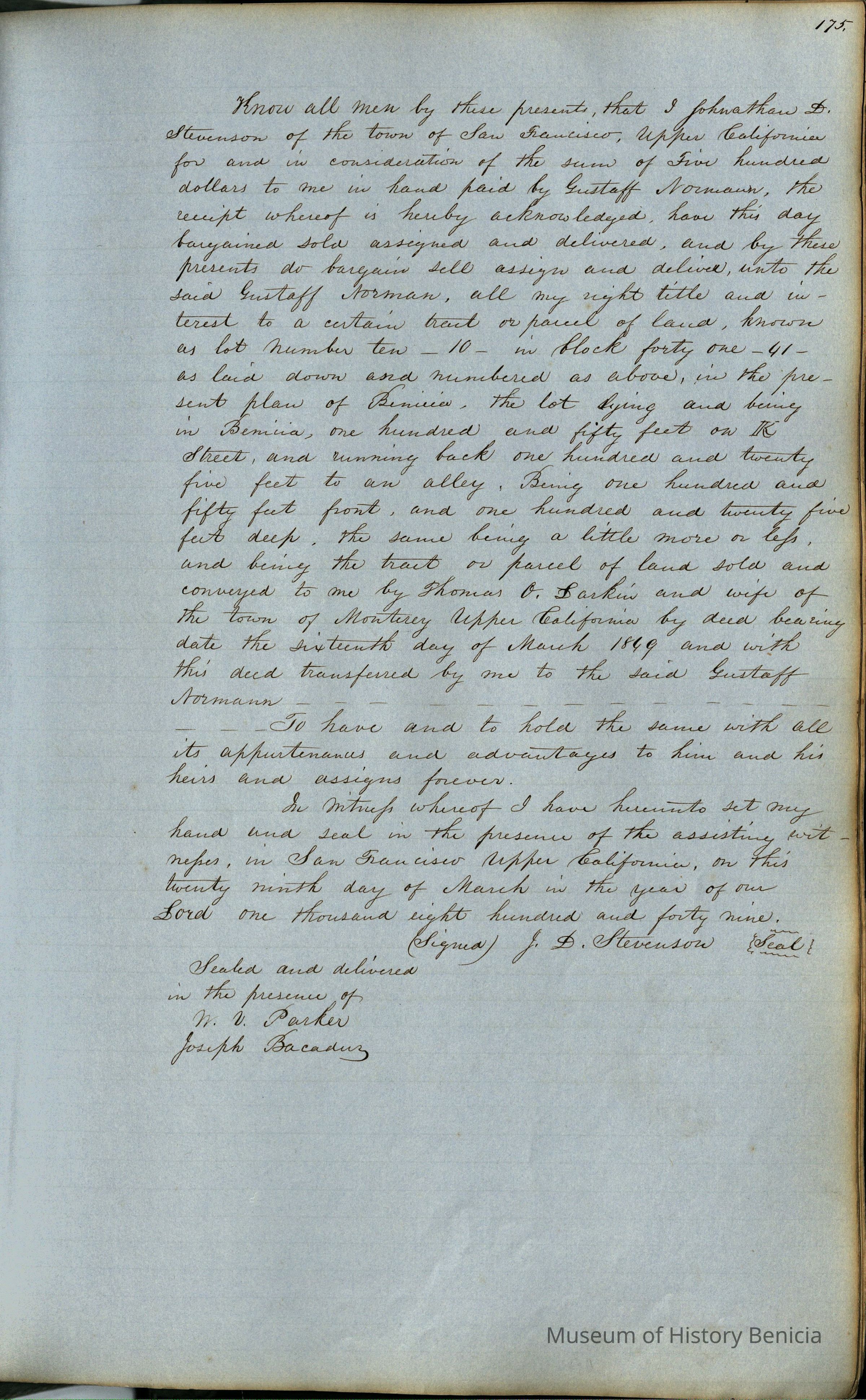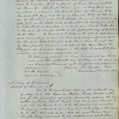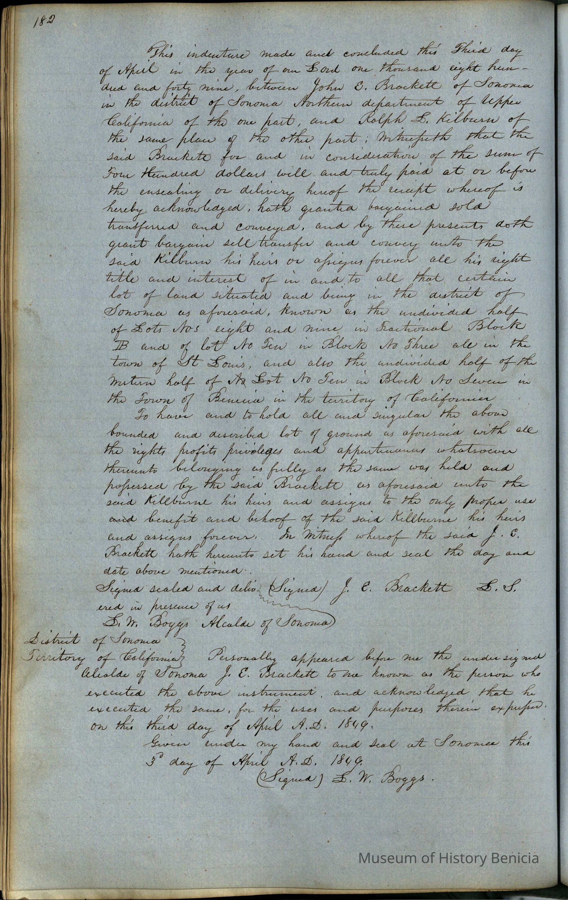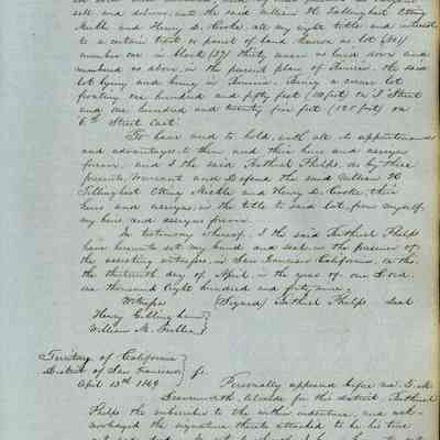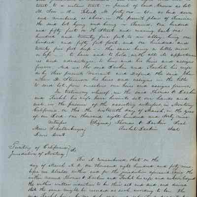 This journal/ledger contains the beginnings of Benicia including: lists and descriptions of first 12 houses in Benicia, a translation of the deed to General Vallejo by Manual Micheltorena, Governor of Calif. (1844); deed to Semple and Larkin by Vallejo (1847); deeds of properties sold by Semple and Larkin from 1847 - 1849