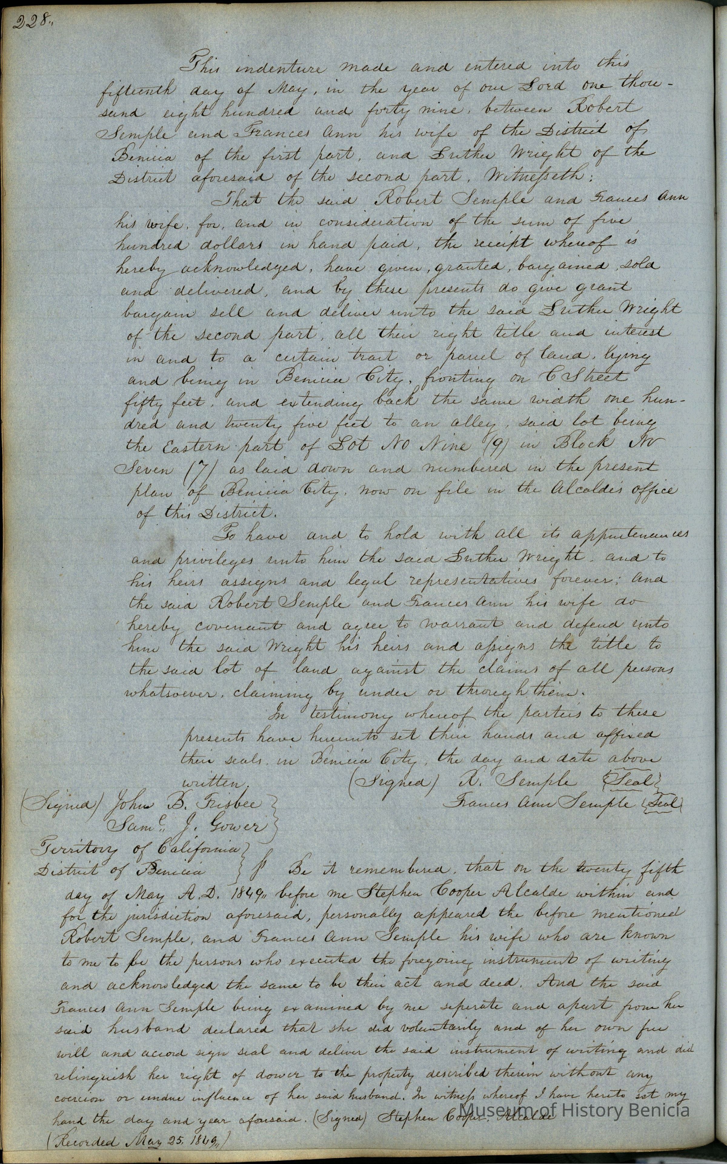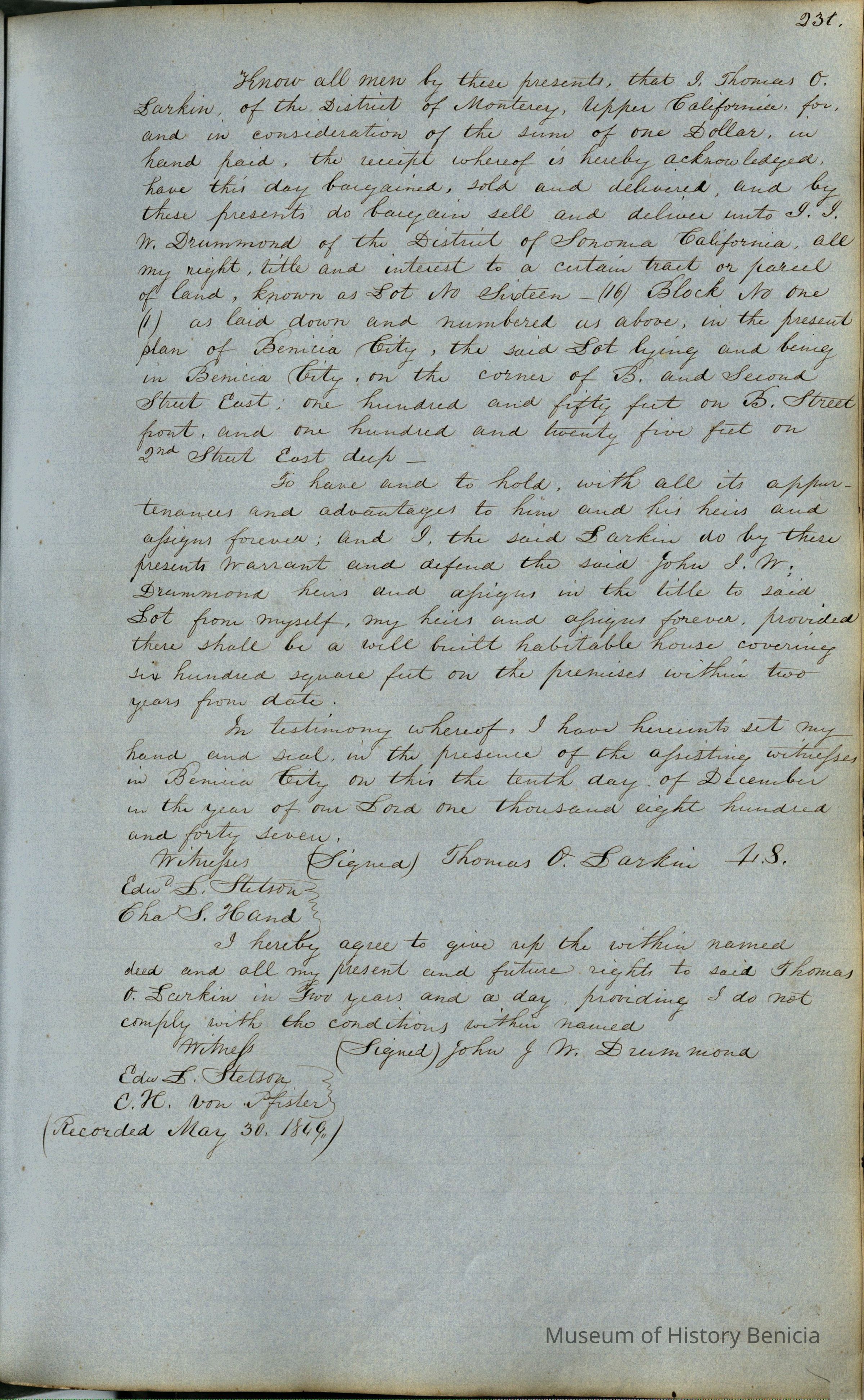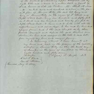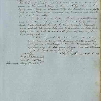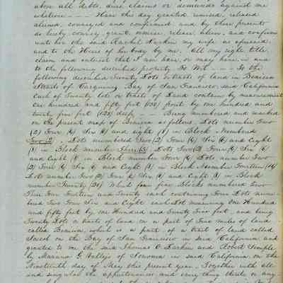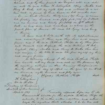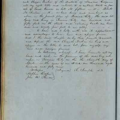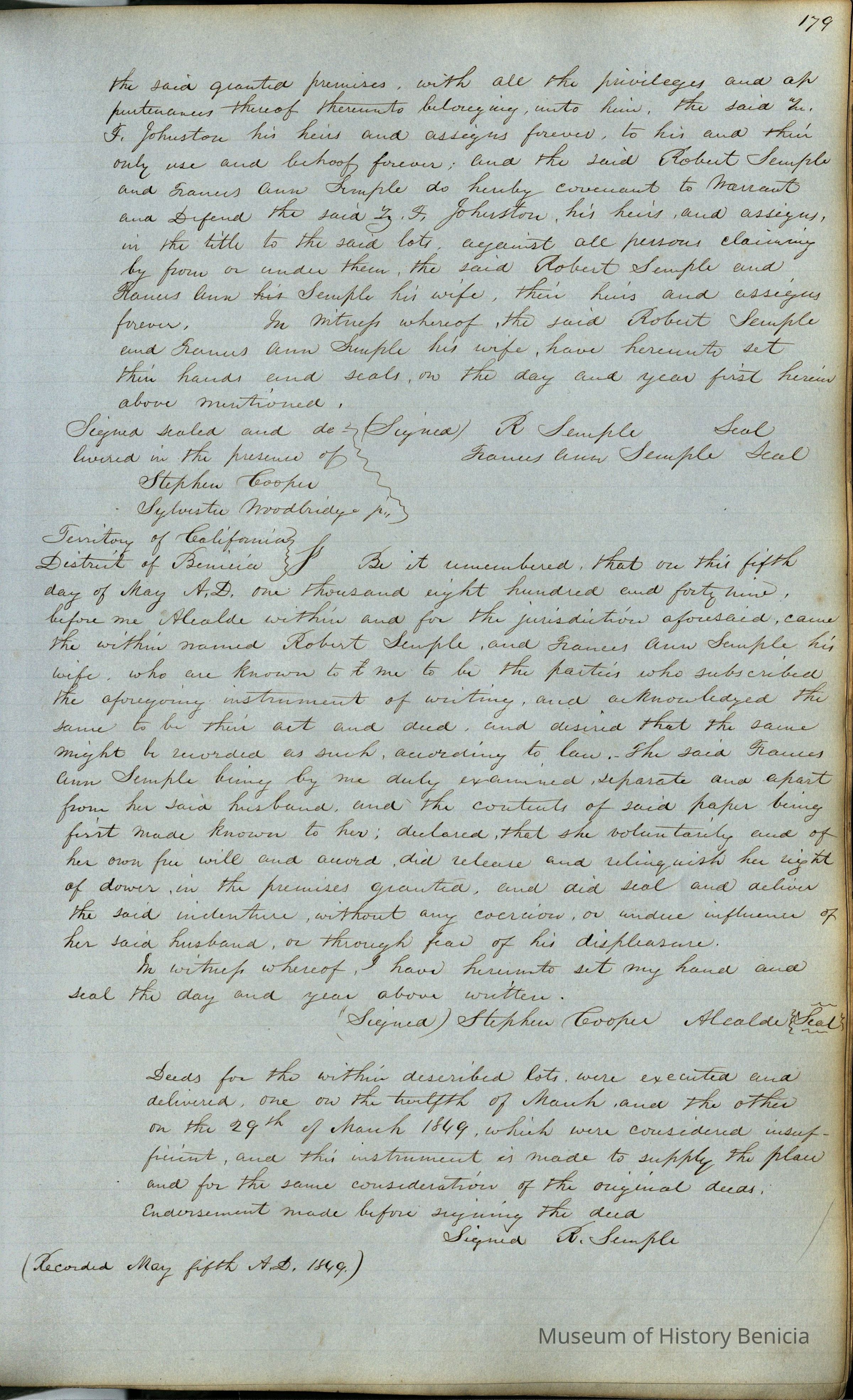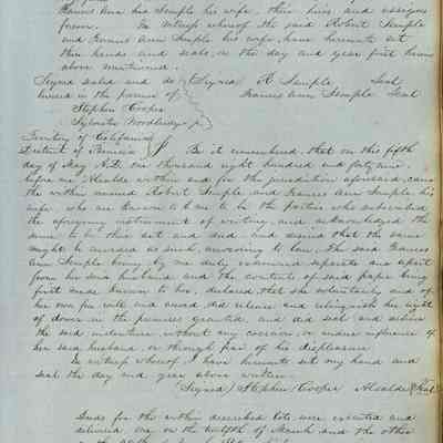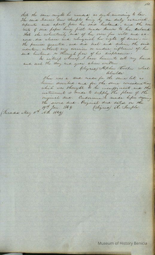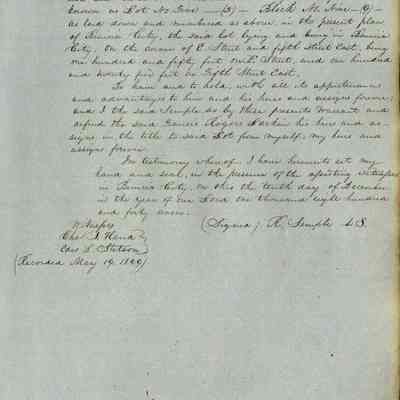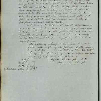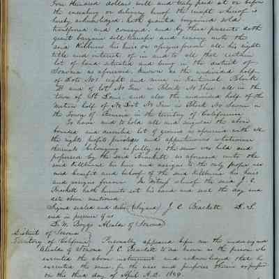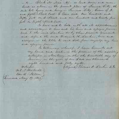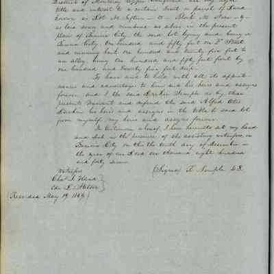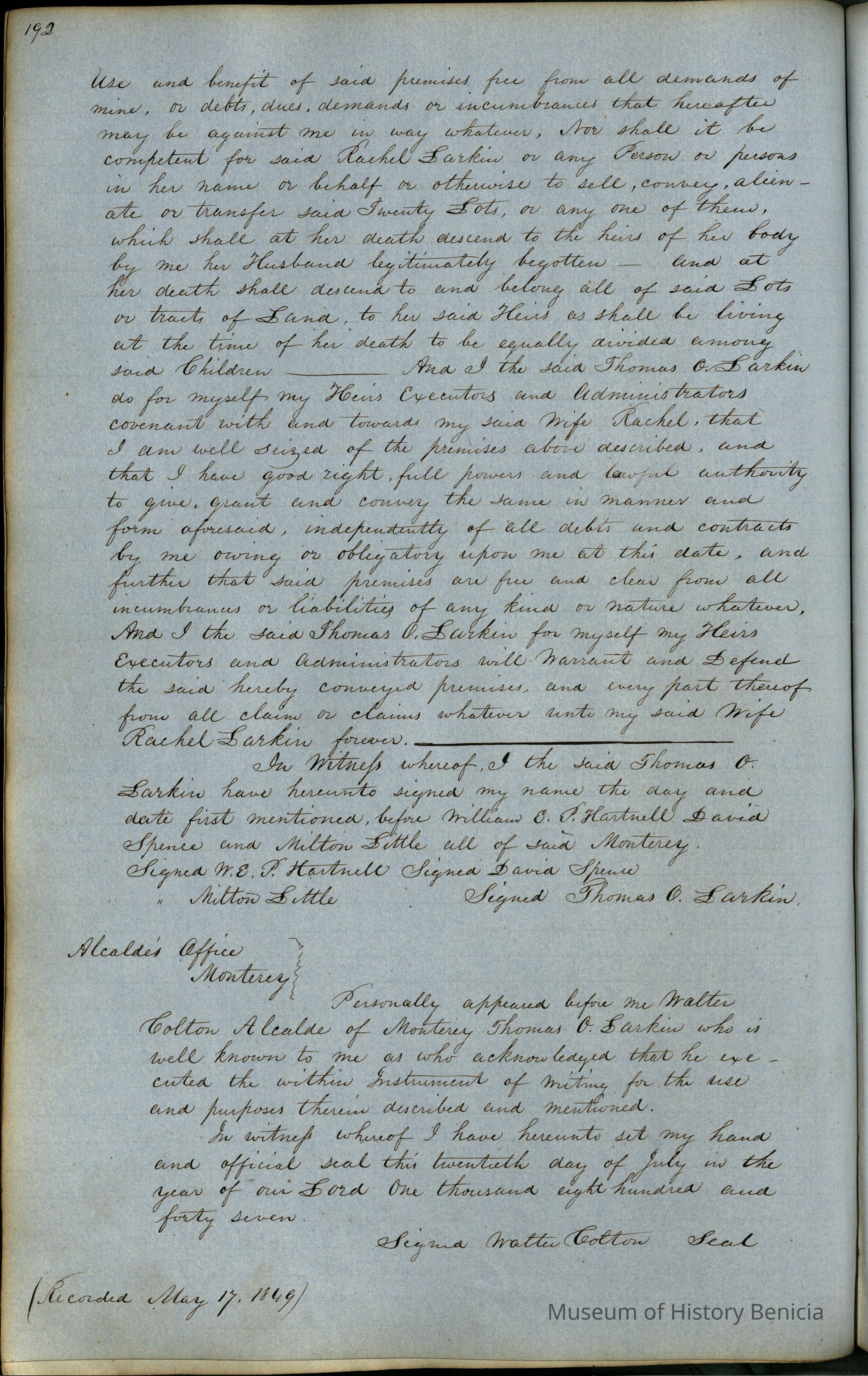 This journal/ledger contains the beginnings of Benicia including: lists and descriptions of first 12 houses in Benicia, a translation of the deed to General Vallejo by Manual Micheltorena, Governor of Calif. (1844); deed to Semple and Larkin by Vallejo (1847); deeds of properties sold by Semple and Larkin from 1847 - 1849