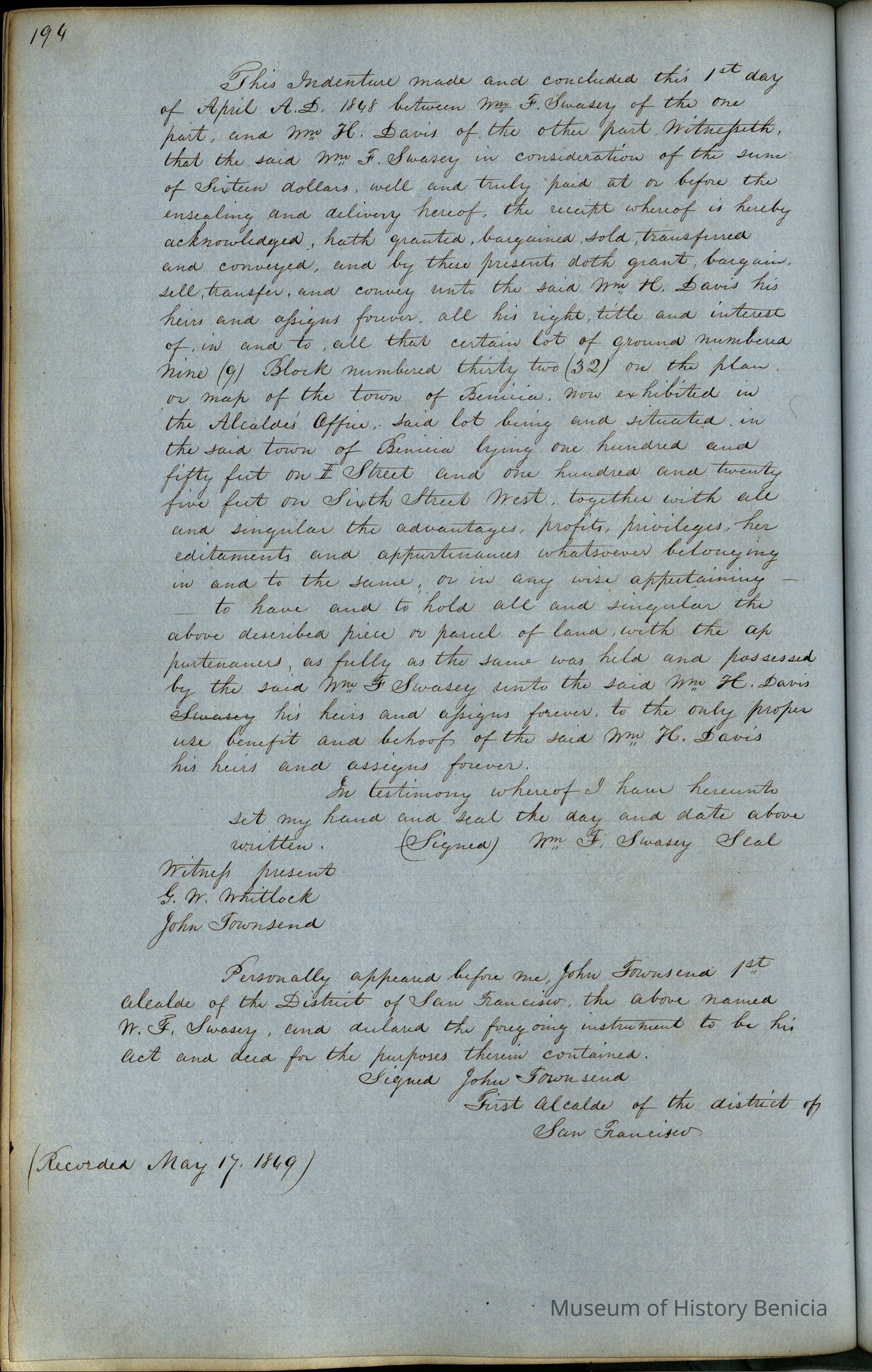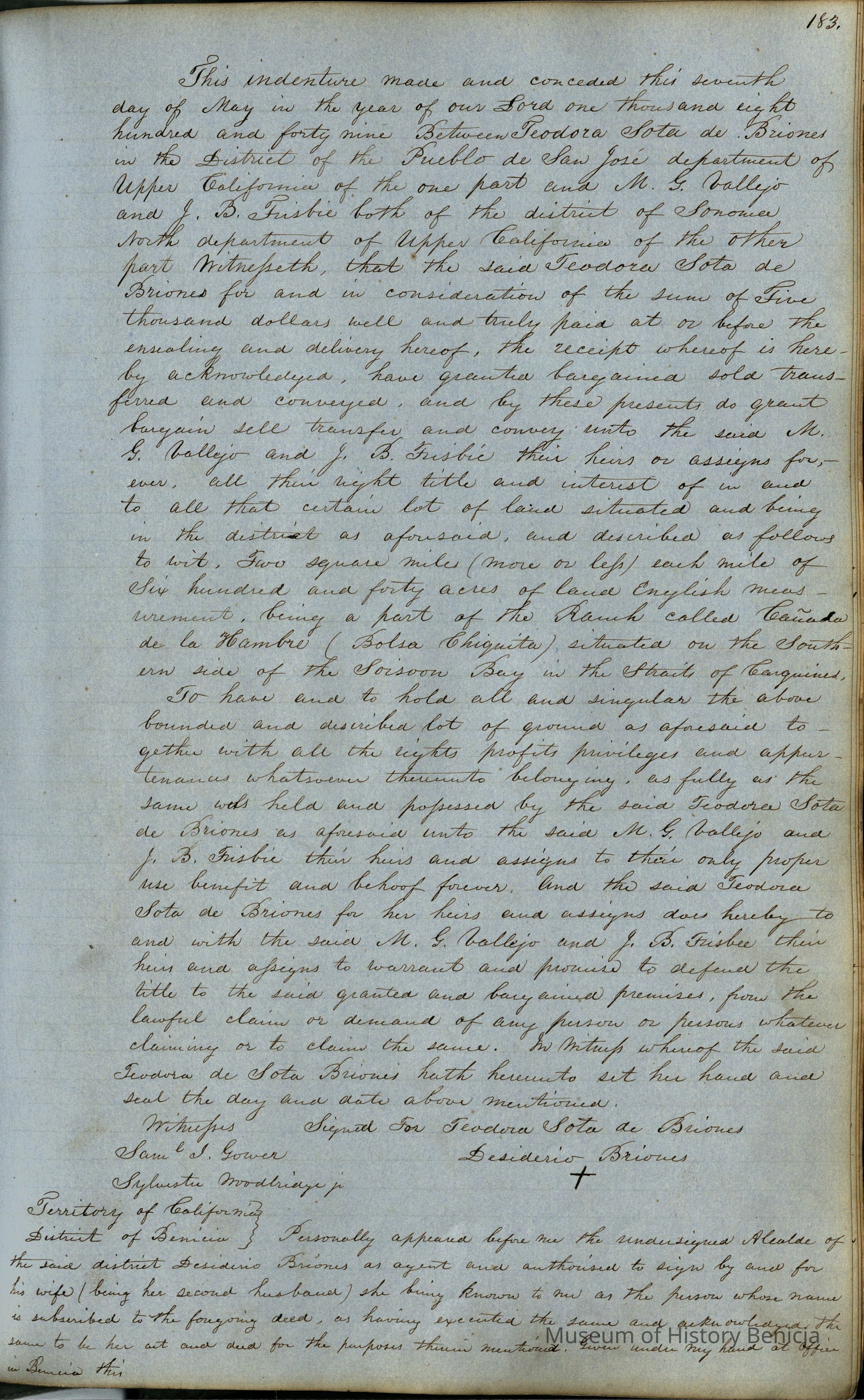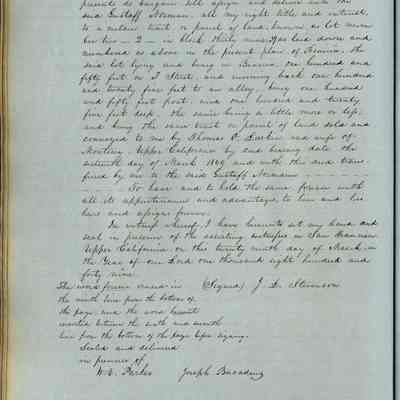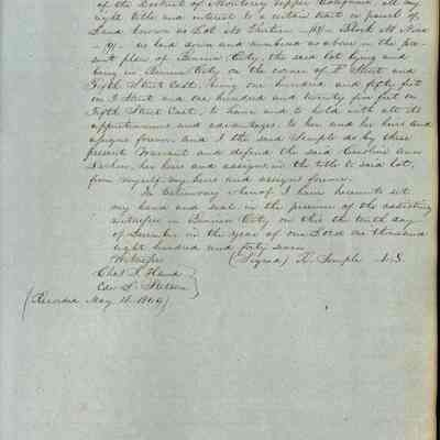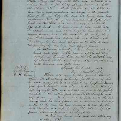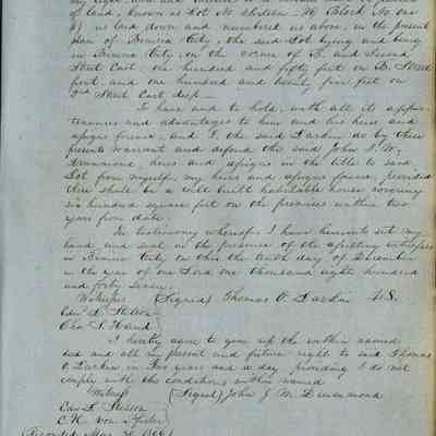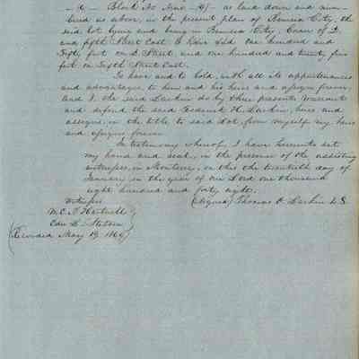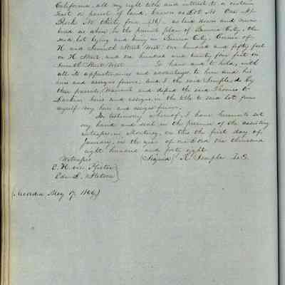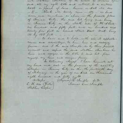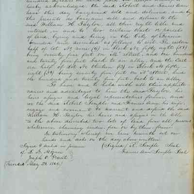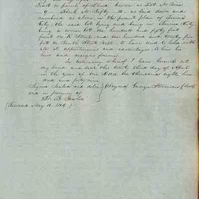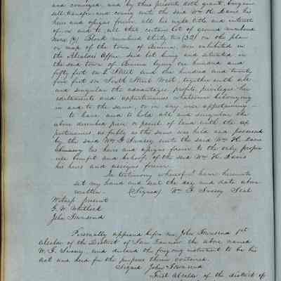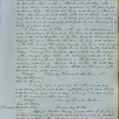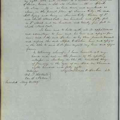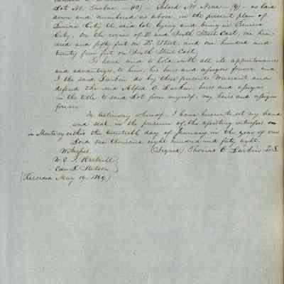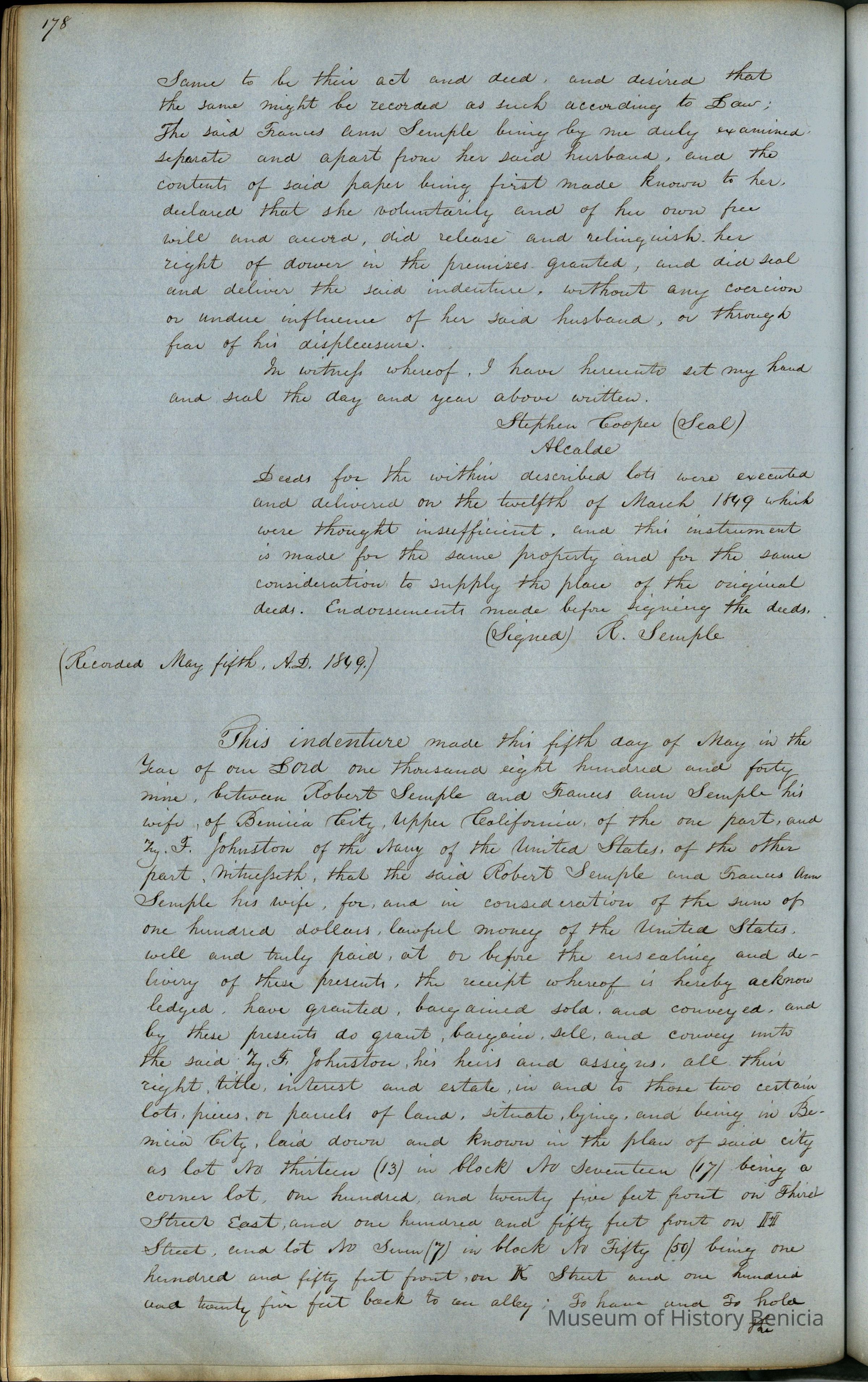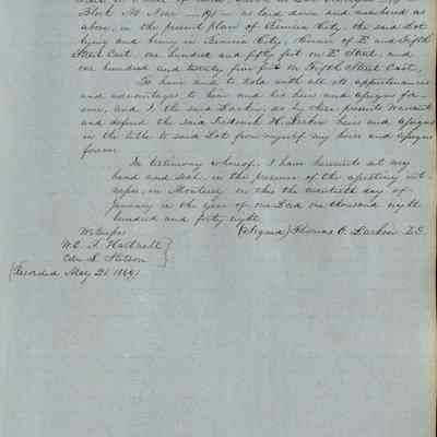 This journal/ledger contains the beginnings of Benicia including: lists and descriptions of first 12 houses in Benicia, a translation of the deed to General Vallejo by Manual Micheltorena, Governor of Calif. (1844); deed to Semple and Larkin by Vallejo (1847); deeds of properties sold by Semple and Larkin from 1847 - 1849