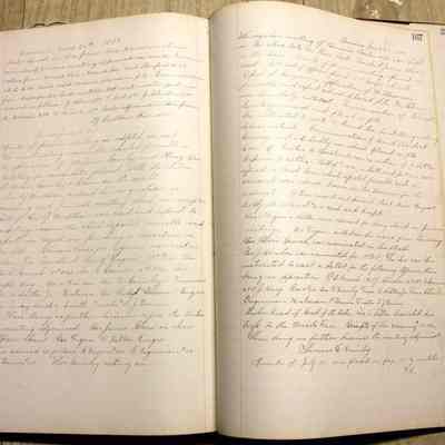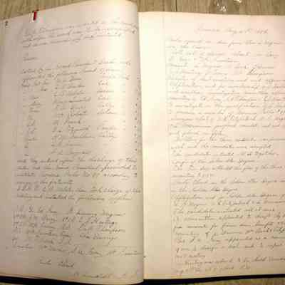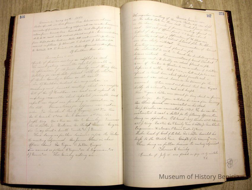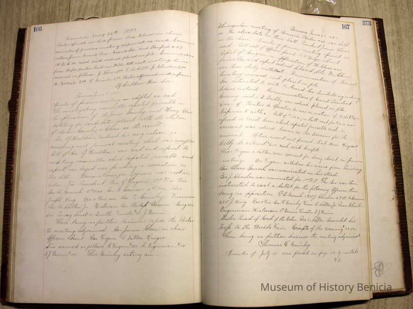 IOOF Benicia Parlor #89 - Initial Meeting minutes and subsequent minues. Subsequently used as scrapbook - newspaper clippings pasted over many pages of minutes. Some clippings later torn out. Clippings largely advice columns - including Dorothea Dix "Agony Columns"