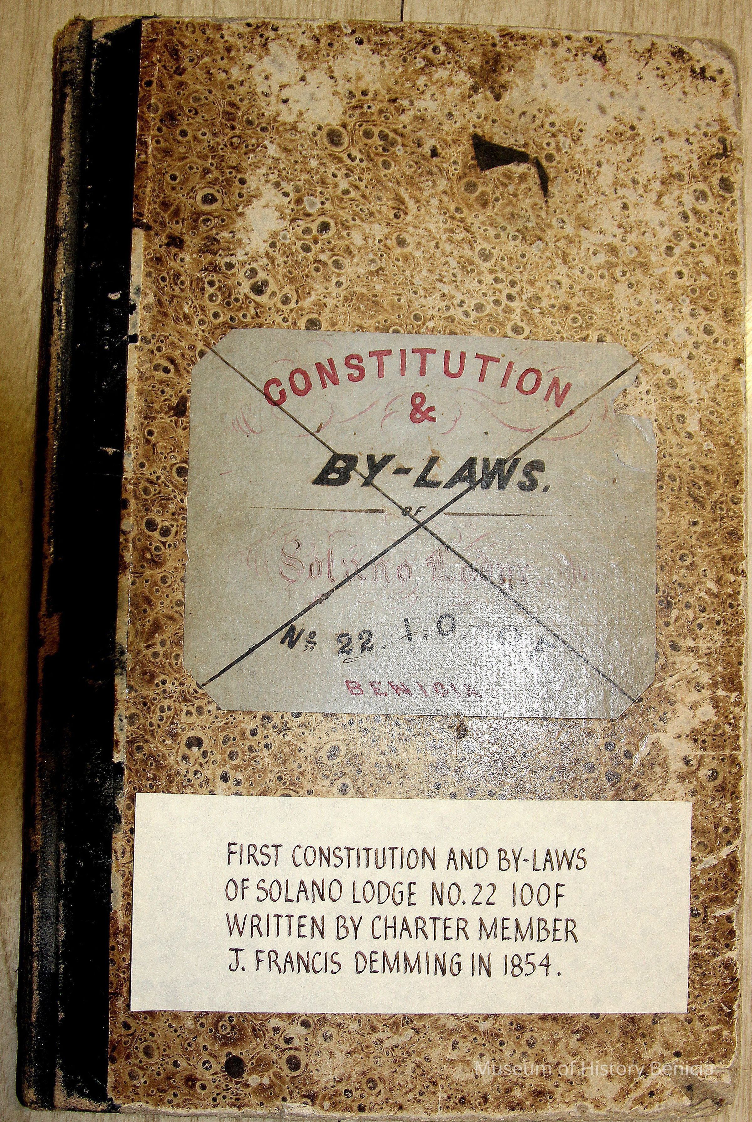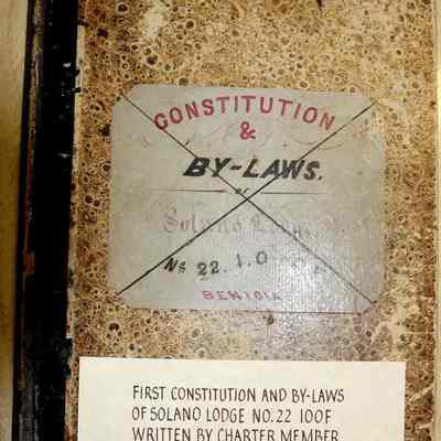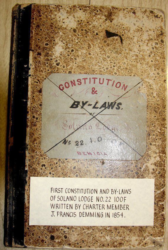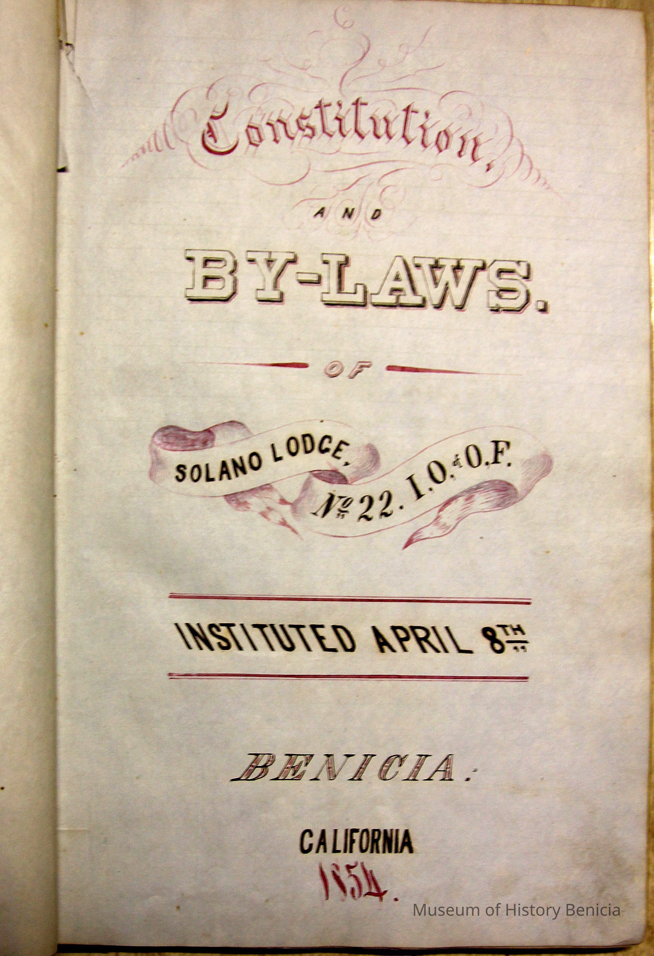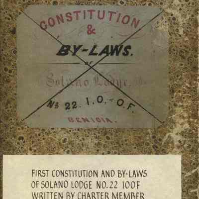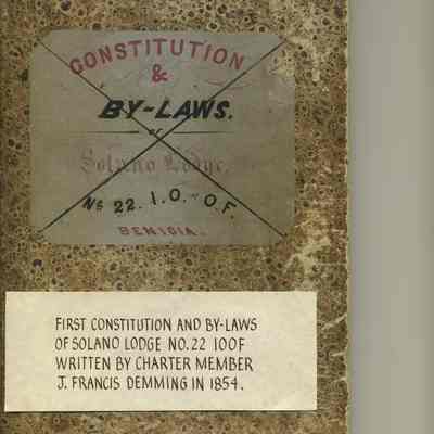 Ledger with cover label: "Constitution and By-Laws of Solano Lodge No.22 I.O. of O.F. Benicia"