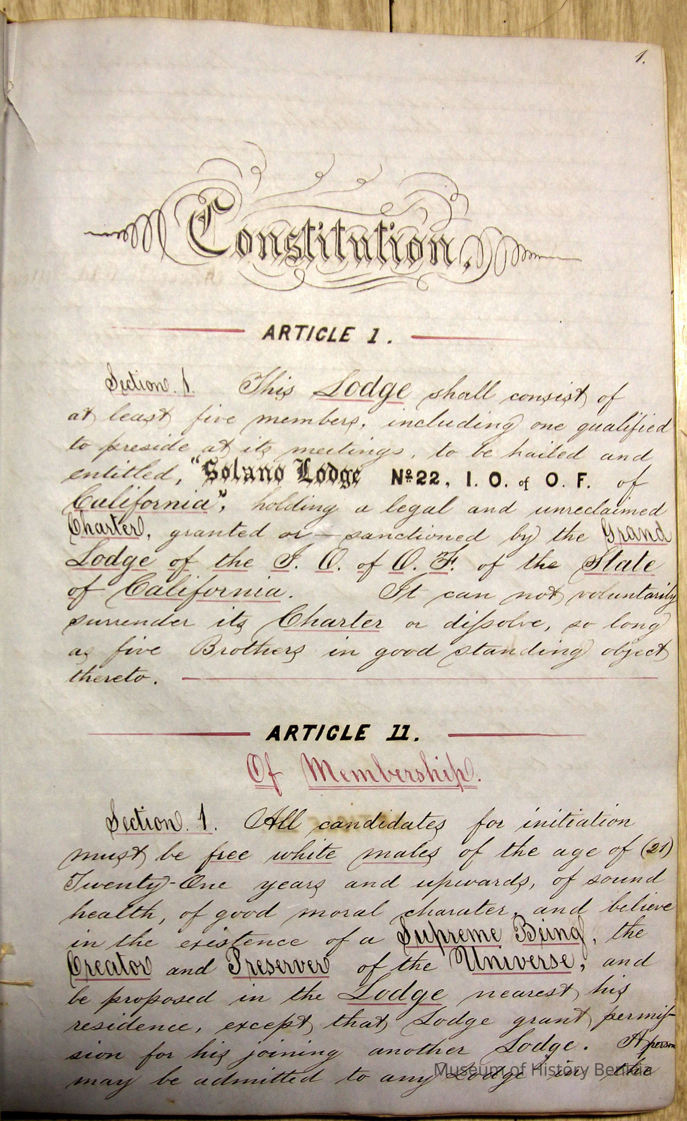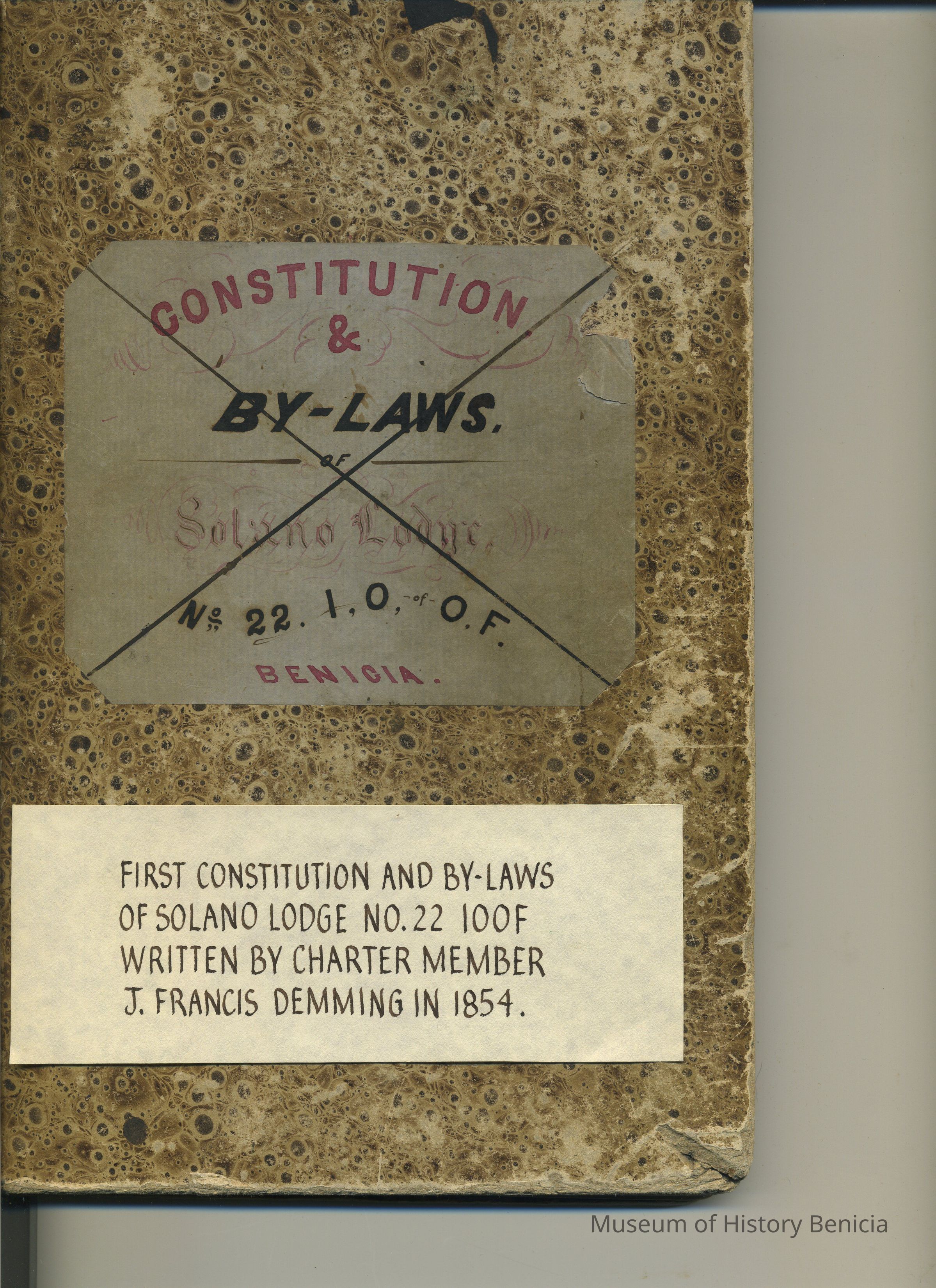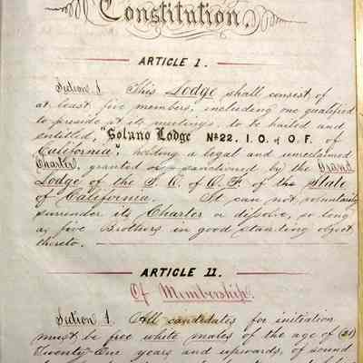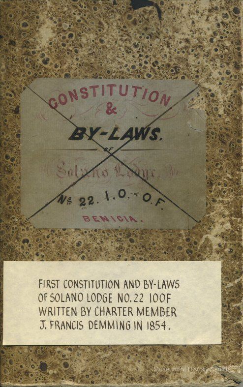 Ledger with cover label: "Constitution and By-Laws of Solano Lodge No.22 I.O. of O.F. Benicia"