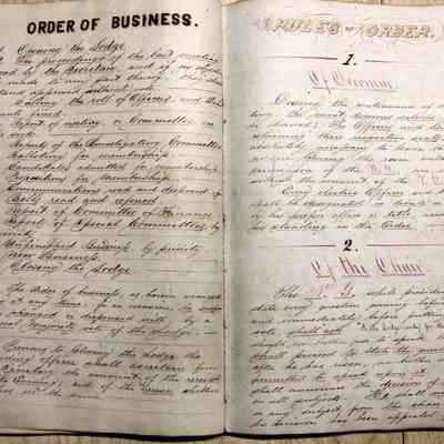 There is a secondary label (possibly added by the Museum for a past exhibit) that states the Constitution and By-Laws were written by J. Francis Demming in 1854. It was instituted April 8, 1854.