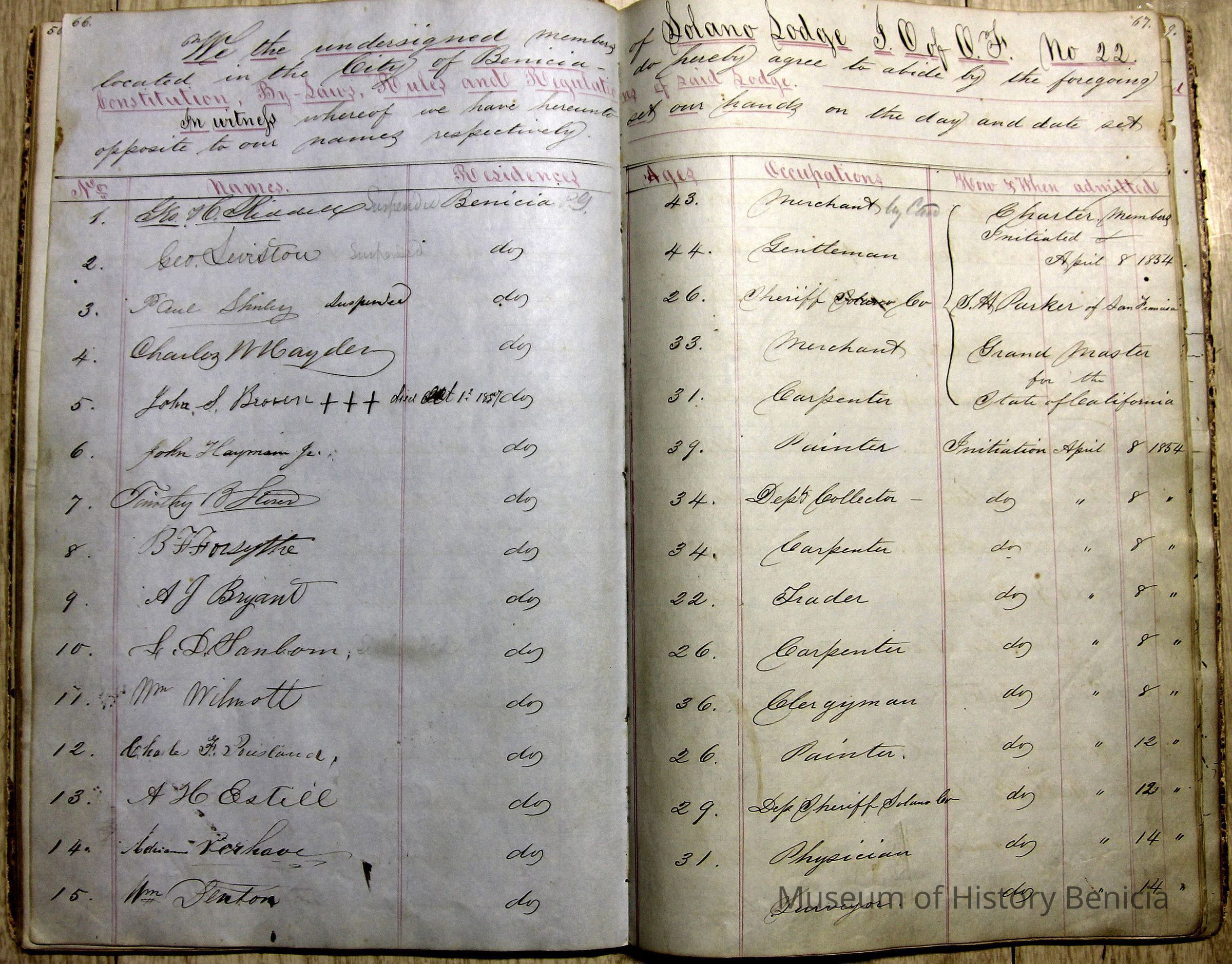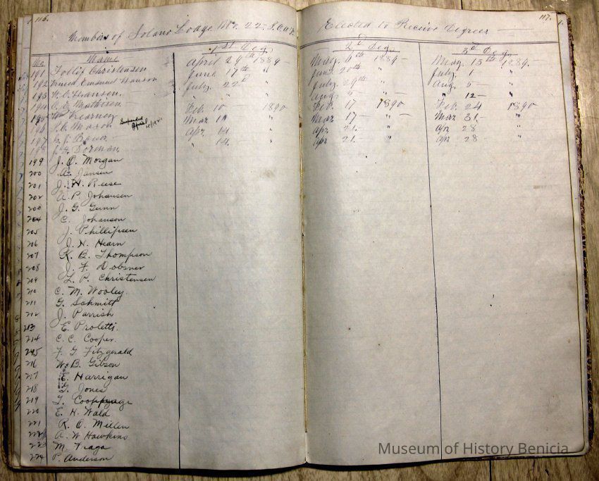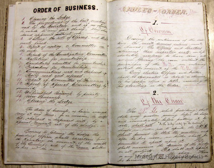 The ledger is hand written. Besides the Constitution and By-Laws it contains "Order of Business", "Rules of Order" and signatures of the members including information on their residence (mostly Benicia but names from other cities appear later), their age at the time, occupation and when they were admitted to the group.