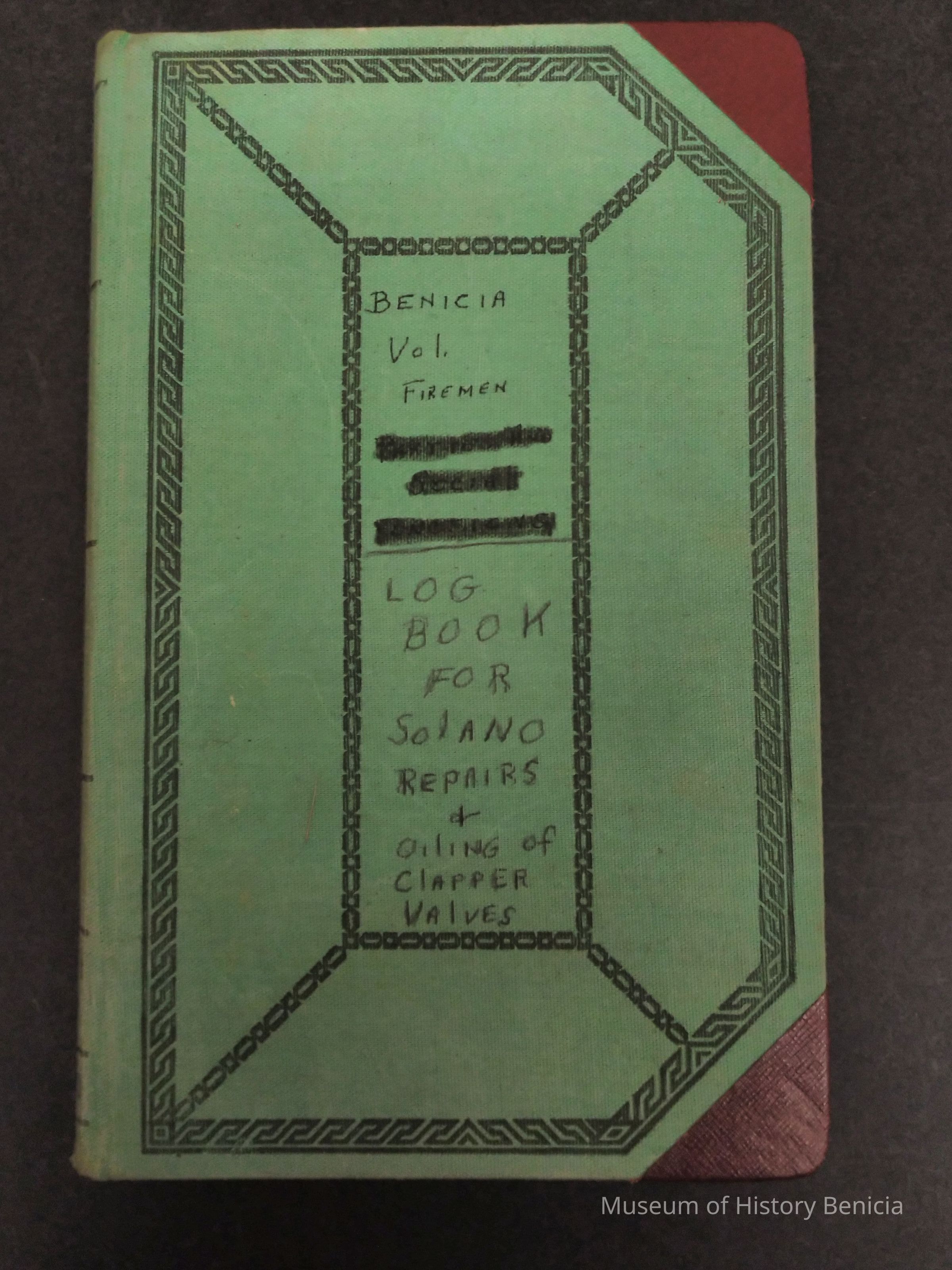 Green and Red Log Book - Benicia Vol. Firemen - Log Book for Solano Repairs and Oiling of Clapper Valves