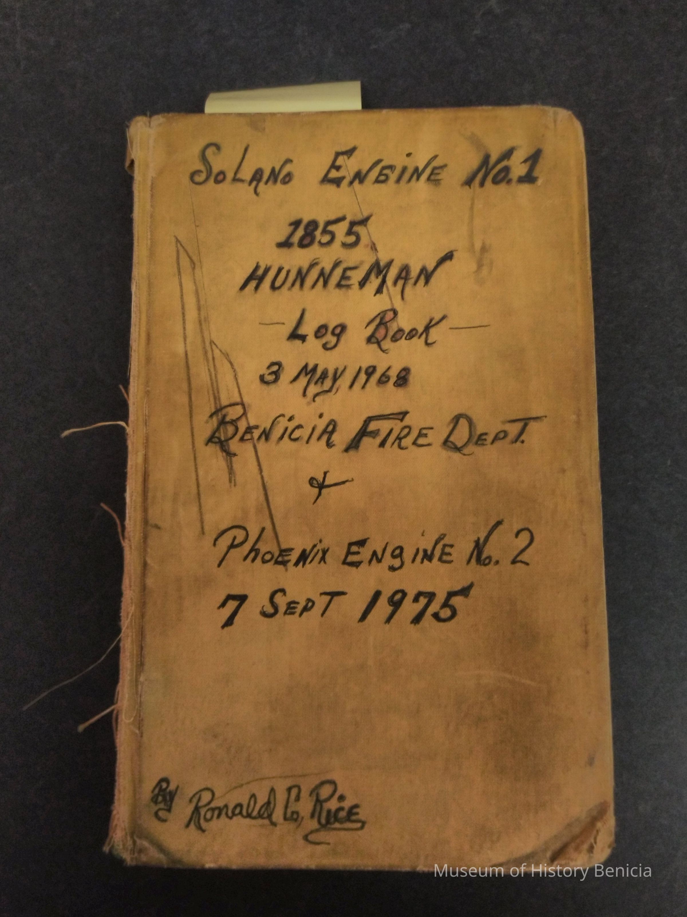 Cloth bound notebook for thedocumentaion of the use of the Solano Engine No. 1, 1855 Hunneman, Log Book 3 May 1968 Benicia Fire Dept + Phoenix Engine No. 2 7 Sept 1975 By Ron RiceCollection