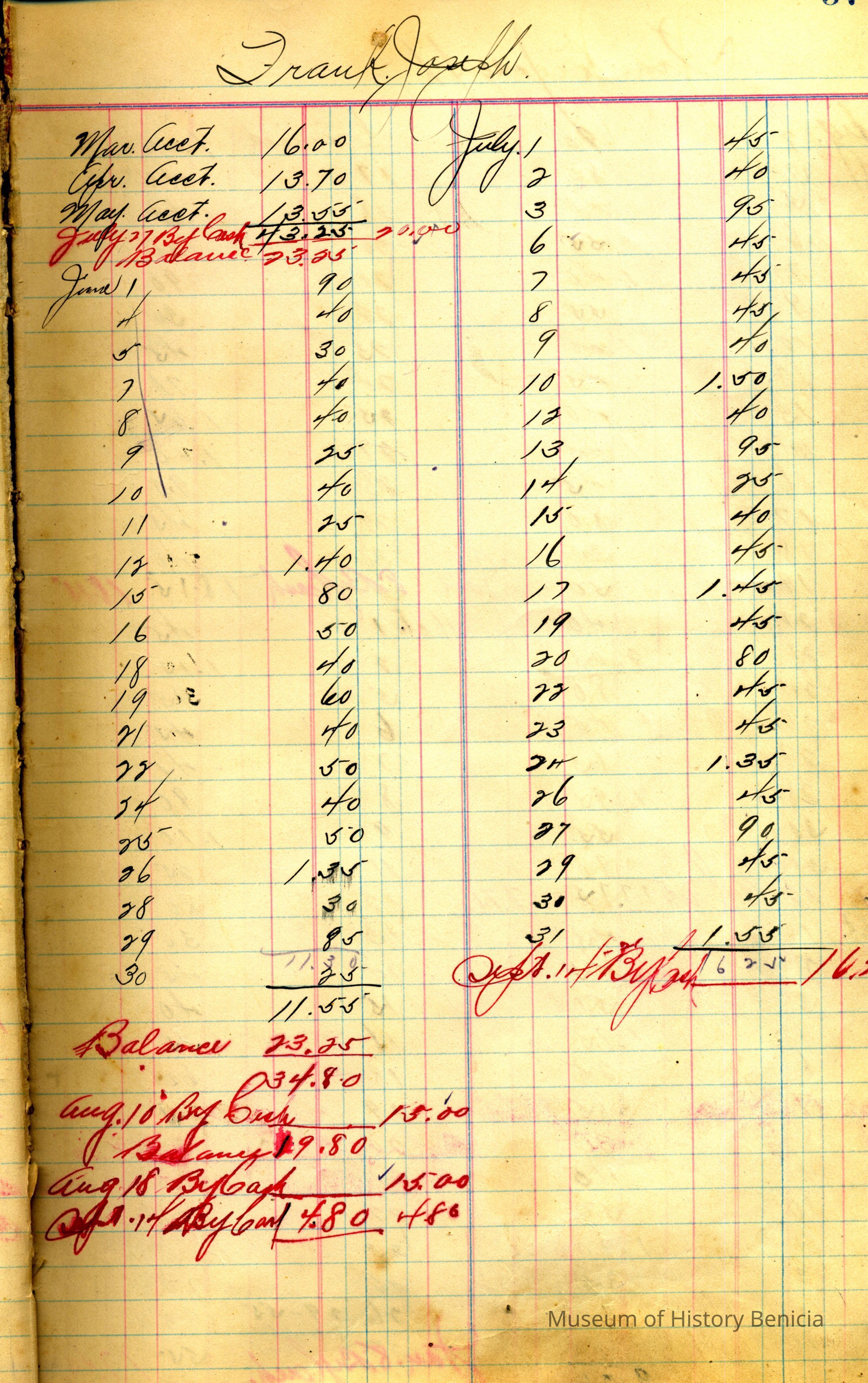 This is an account book from Benicia Market (meat market) owned by Walter G. Wassmann. The book contains purchases and amounts with a page for each customer. Customers include Mayor Crooks, C.J. Rahill, Mrs. Vaughn, Enos, Palace Hotel, Joseph Malone, Union Hotel. Lamb, Anderson House, Ed Higgins, Freitas, Benicia Restaurant, just to name a few. Most entries don't show the year just month and day. The couple of places where year is mentioned show 1910/1911/1920. This book must have been used for many years.Collection