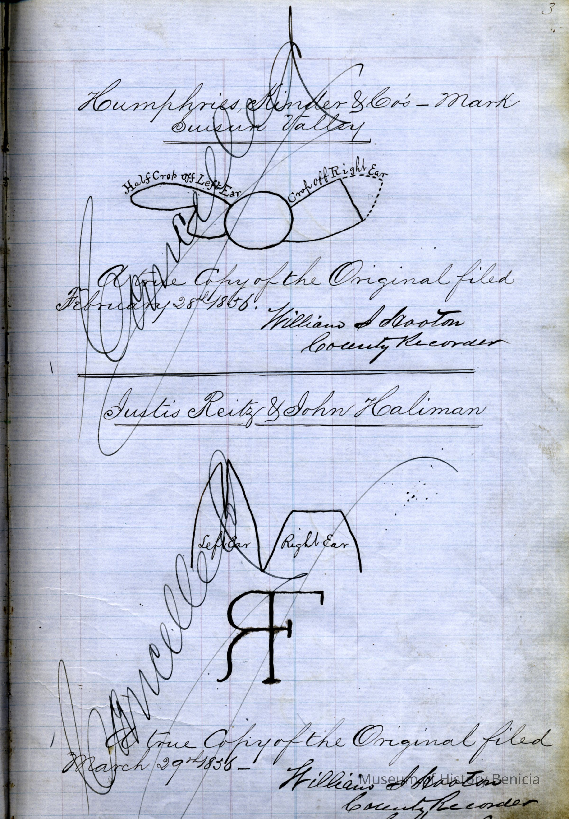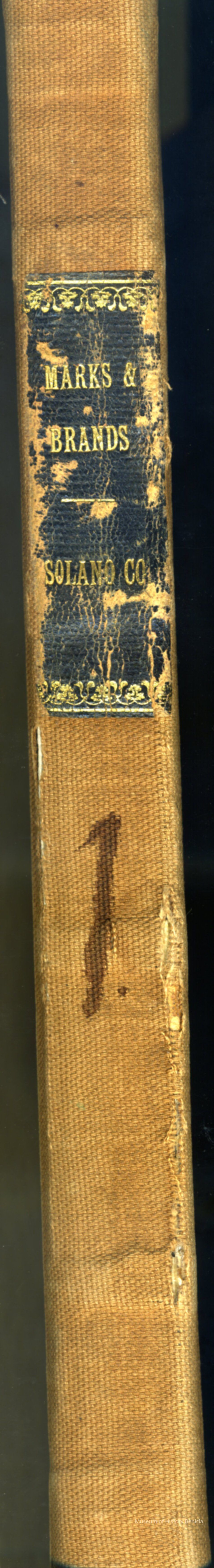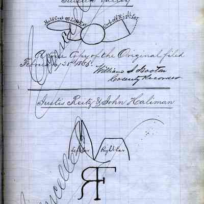 Ledger #1 of Marks & Brands - Solano County. 139 pages of handwritten/drawn and 7 pages of "typed" recordings of animal brands and earmarkings for Solano County ranchers. Most of the sample brands BHM86.10.1 - 260 appear in this ledger.