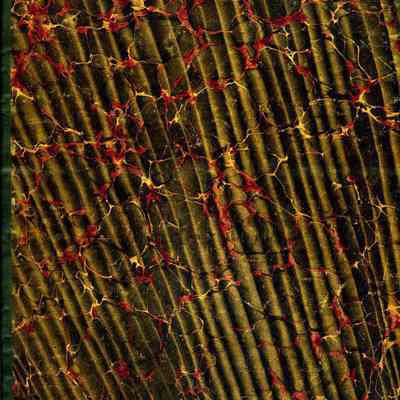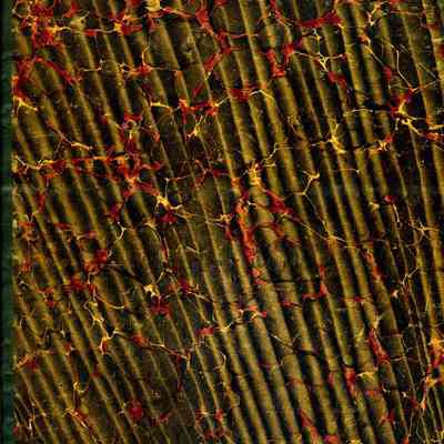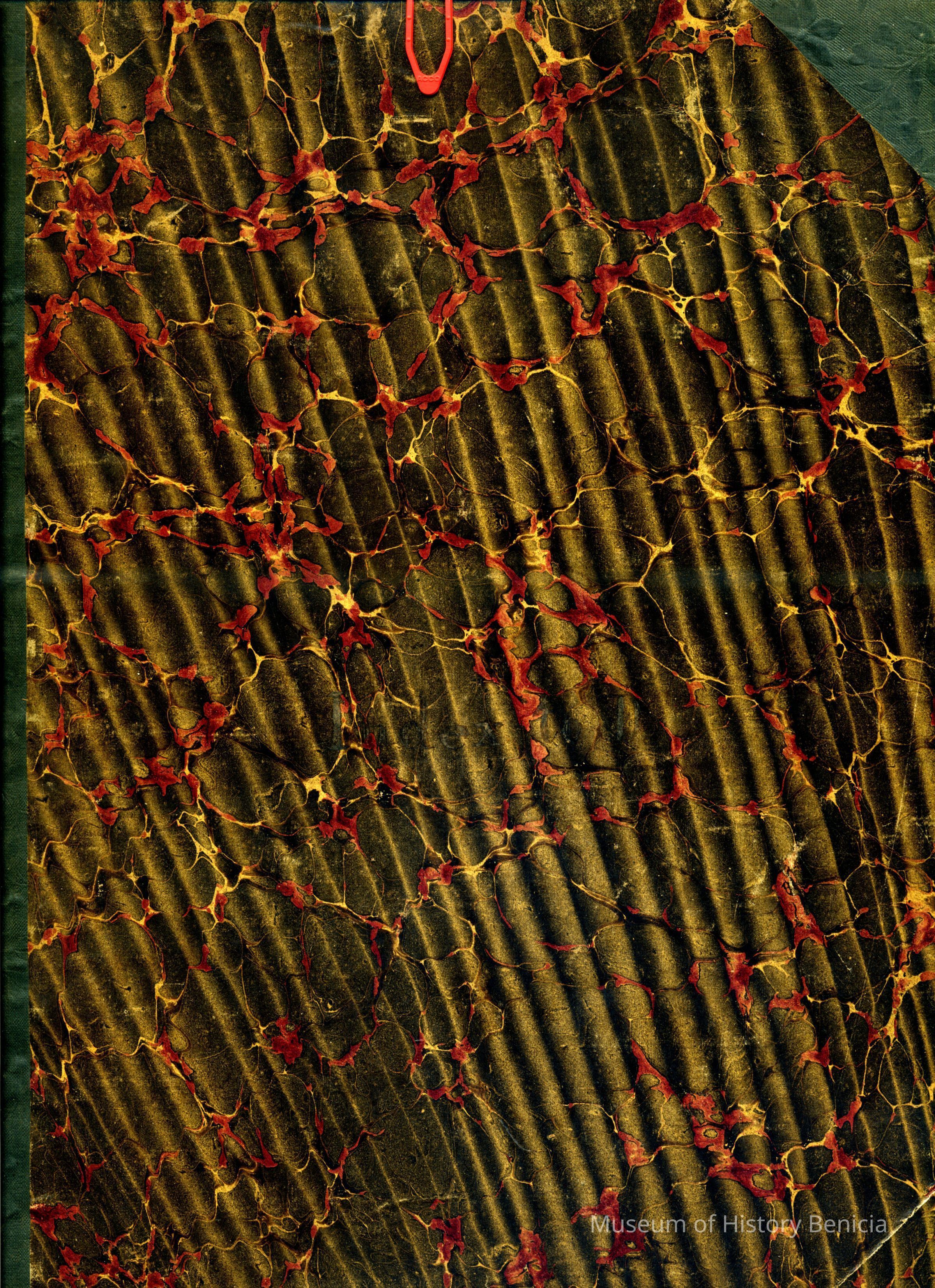 A separate index to Book D (1986.010.272). The index is 9-1/2"W x 14-1/2"H. The cover is a mottled patter of browns and red with dark tape on the spine and corners.