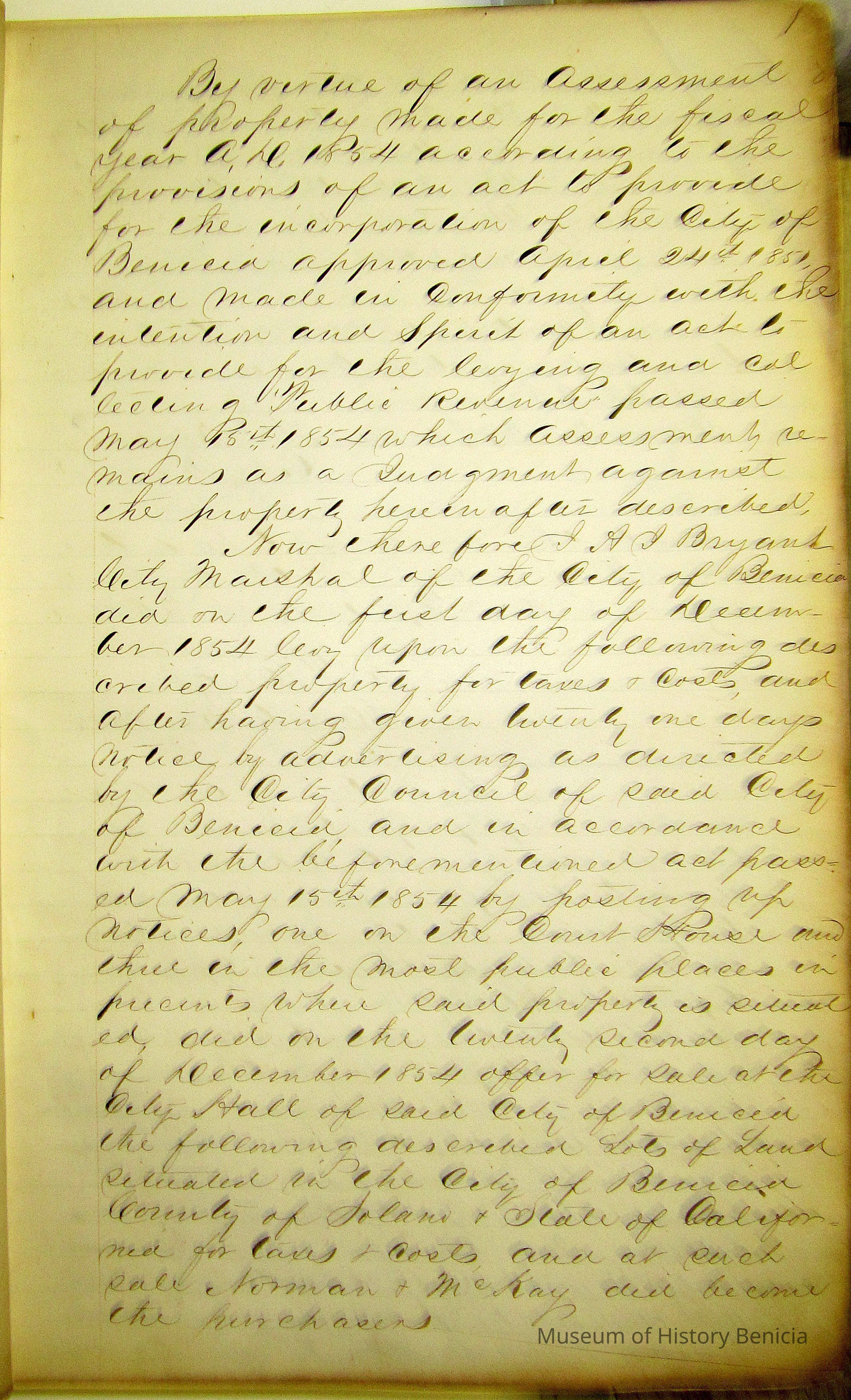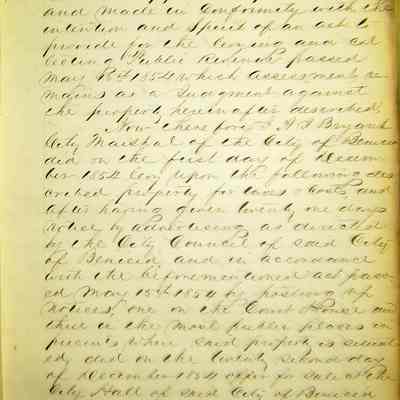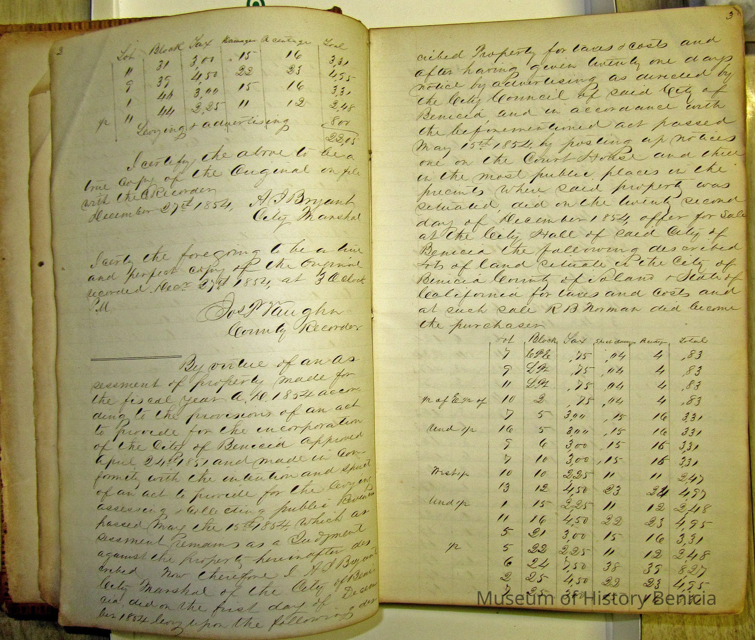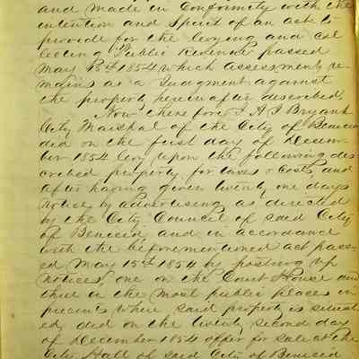 This ledger contains a record of property seized and put up for sale for non-payment of taxes. It begins with an entry by A Bryant, City Marshall and ends with an entry by B Osborn, the tax collector